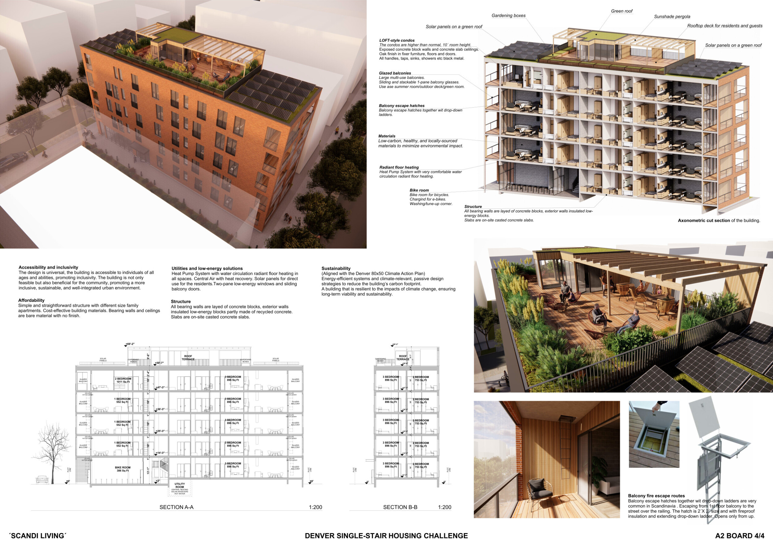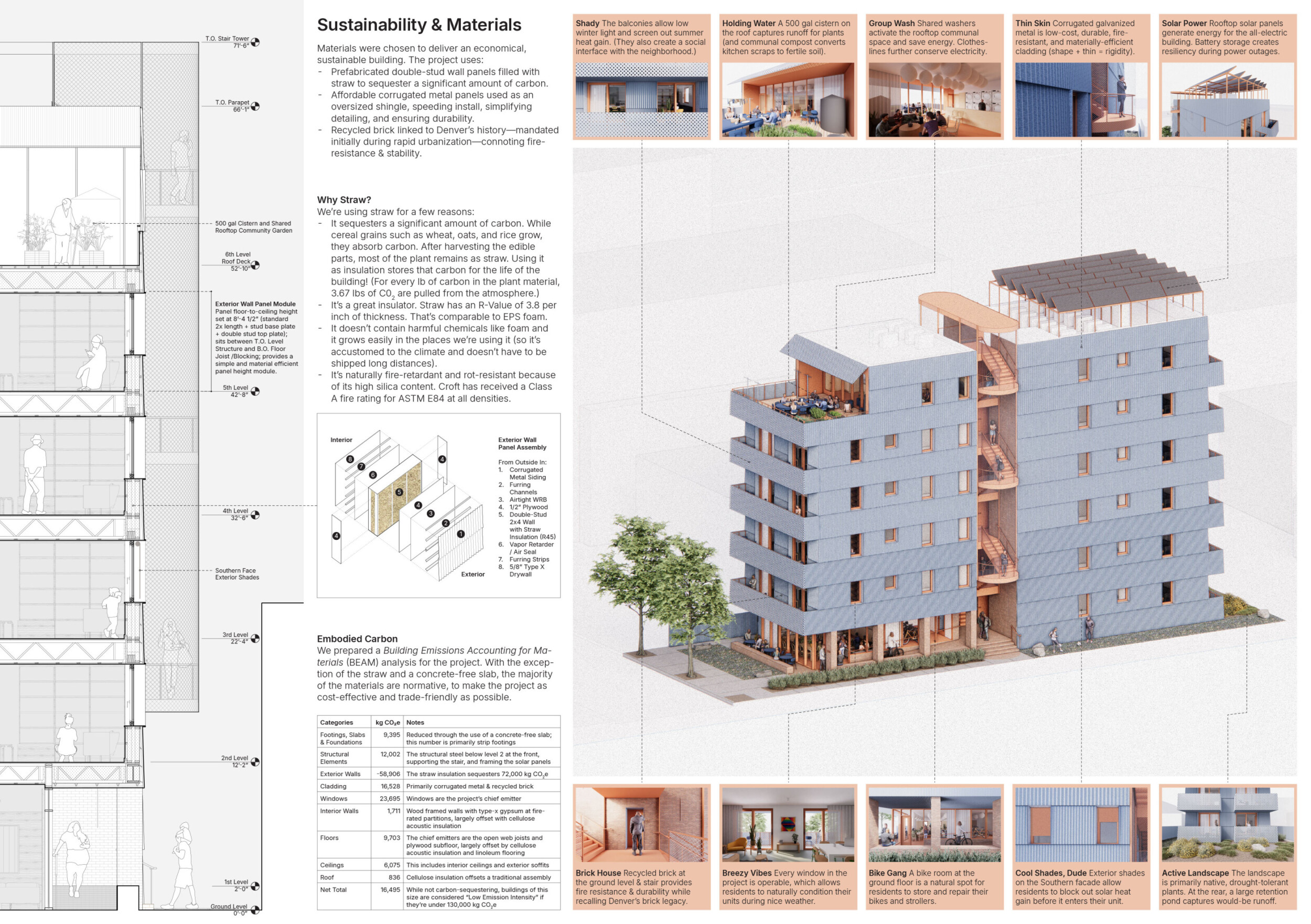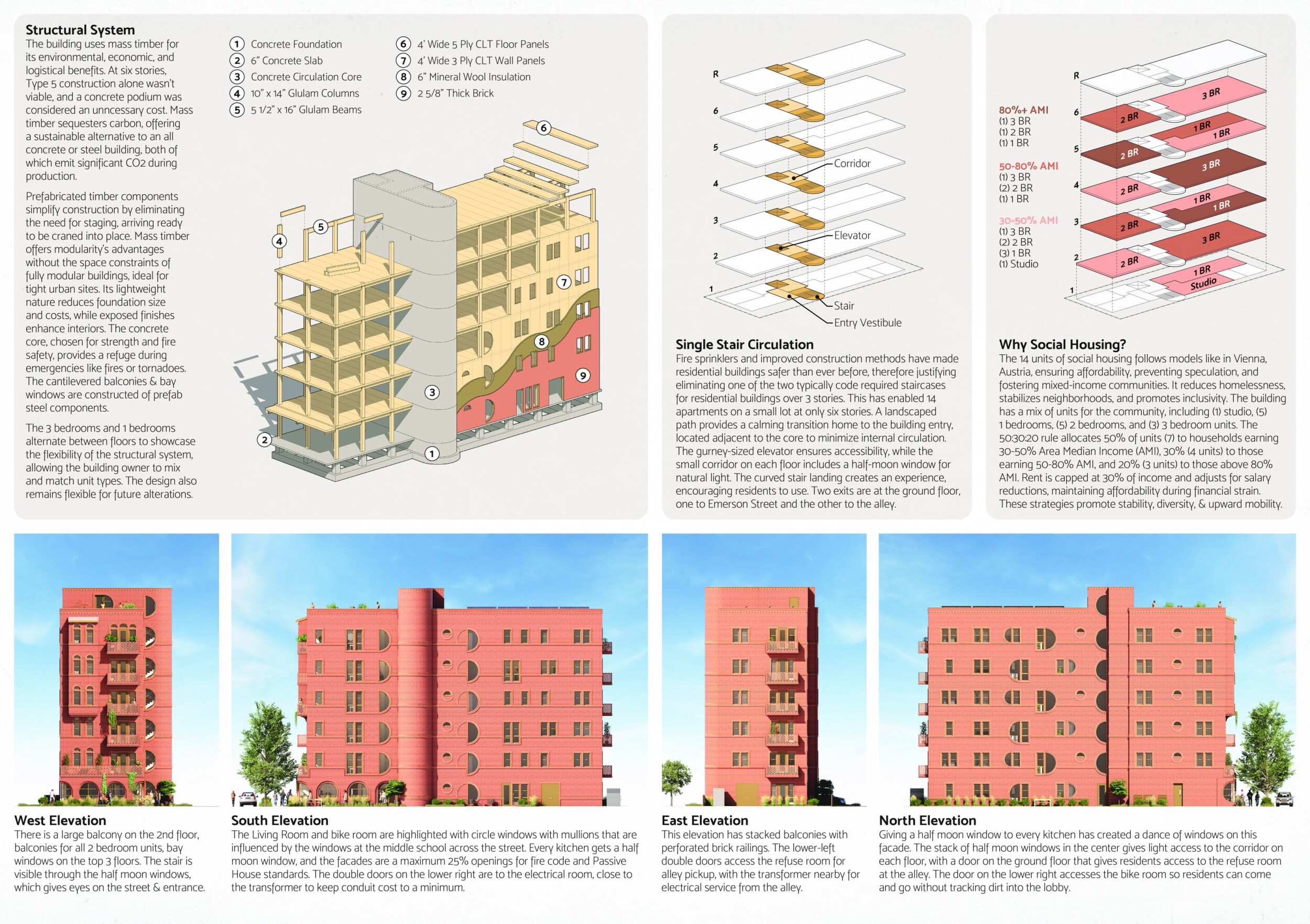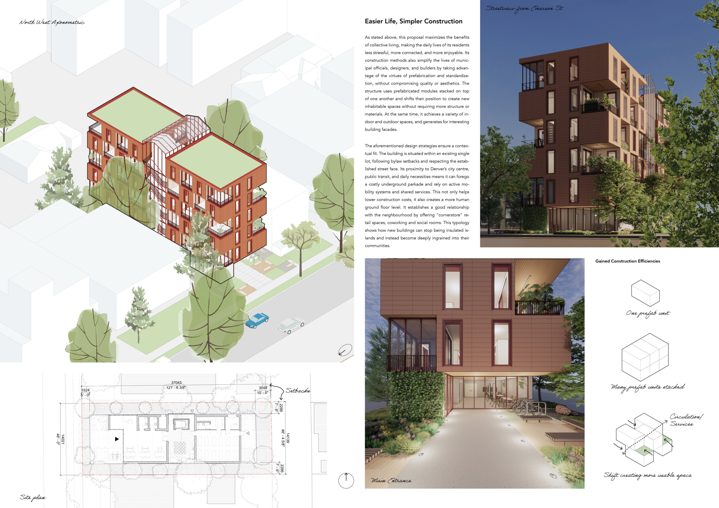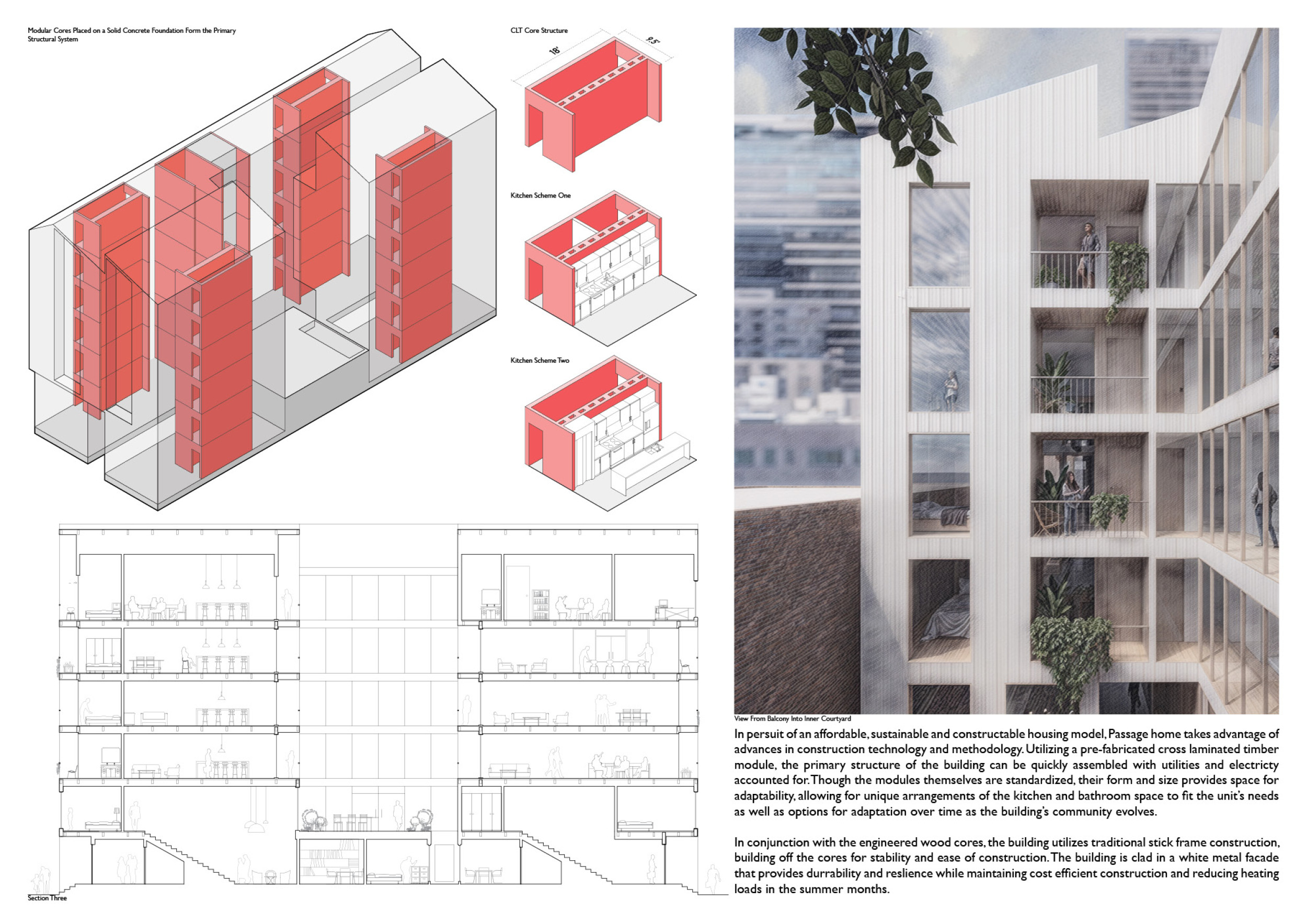 Red Rocks Rising is a modular, multifamily housing project integrating Passive House principles for energy efficiency and occupant comfort. The design utilizes prefabricated units to minimize waste and optimize construction time. A central atrium and external stairways enhance natural ventilation and daylight access, reducing reliance on mechanical systems. High-performance glazing, thermal bridge elimination, and airtight enclosures improve insulation and indoor climate control.