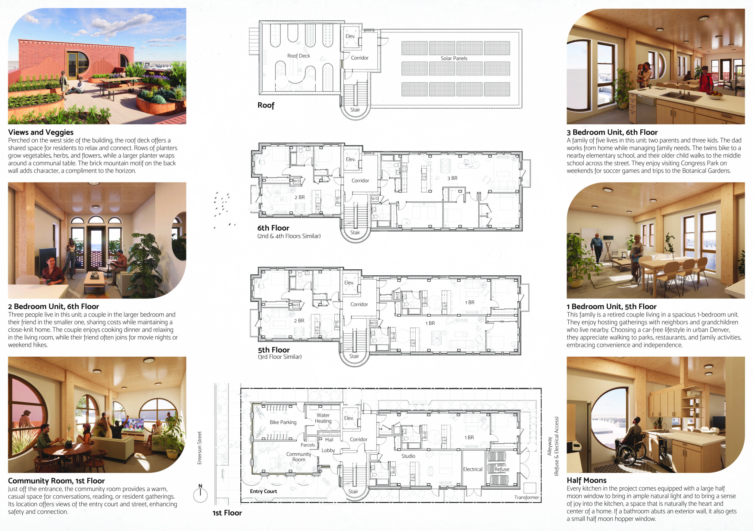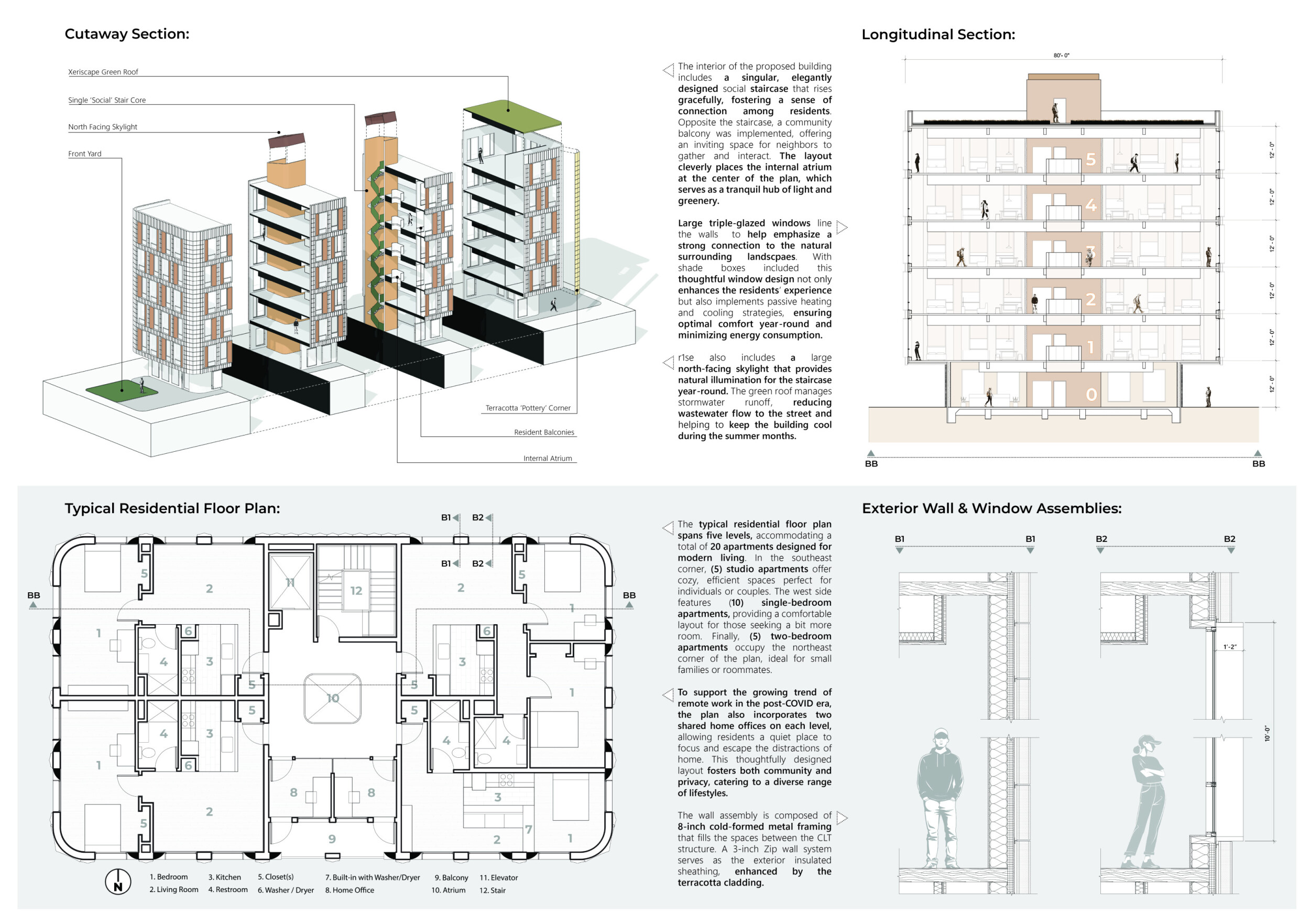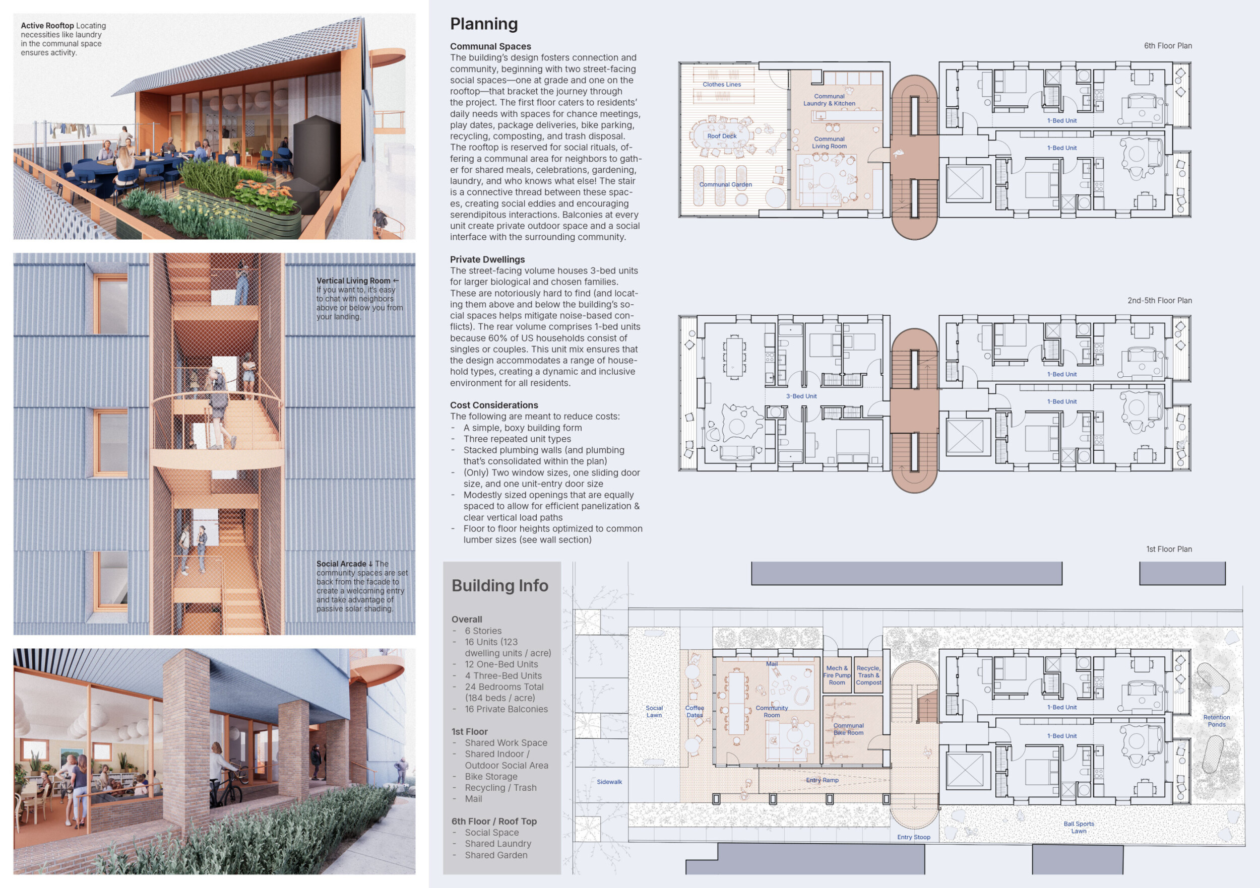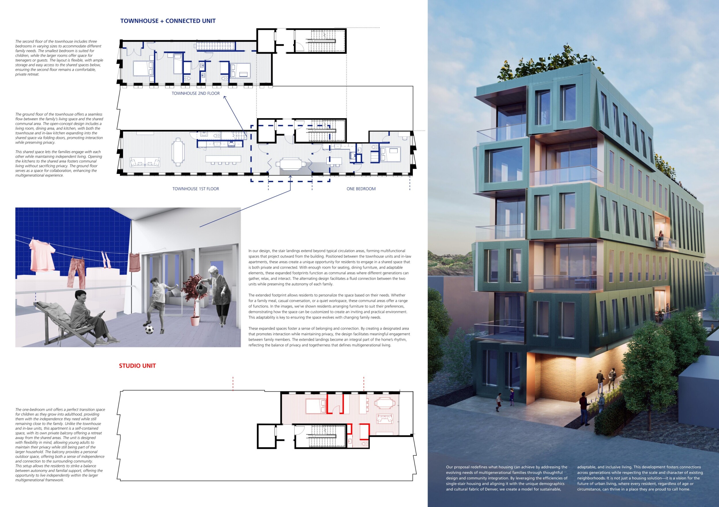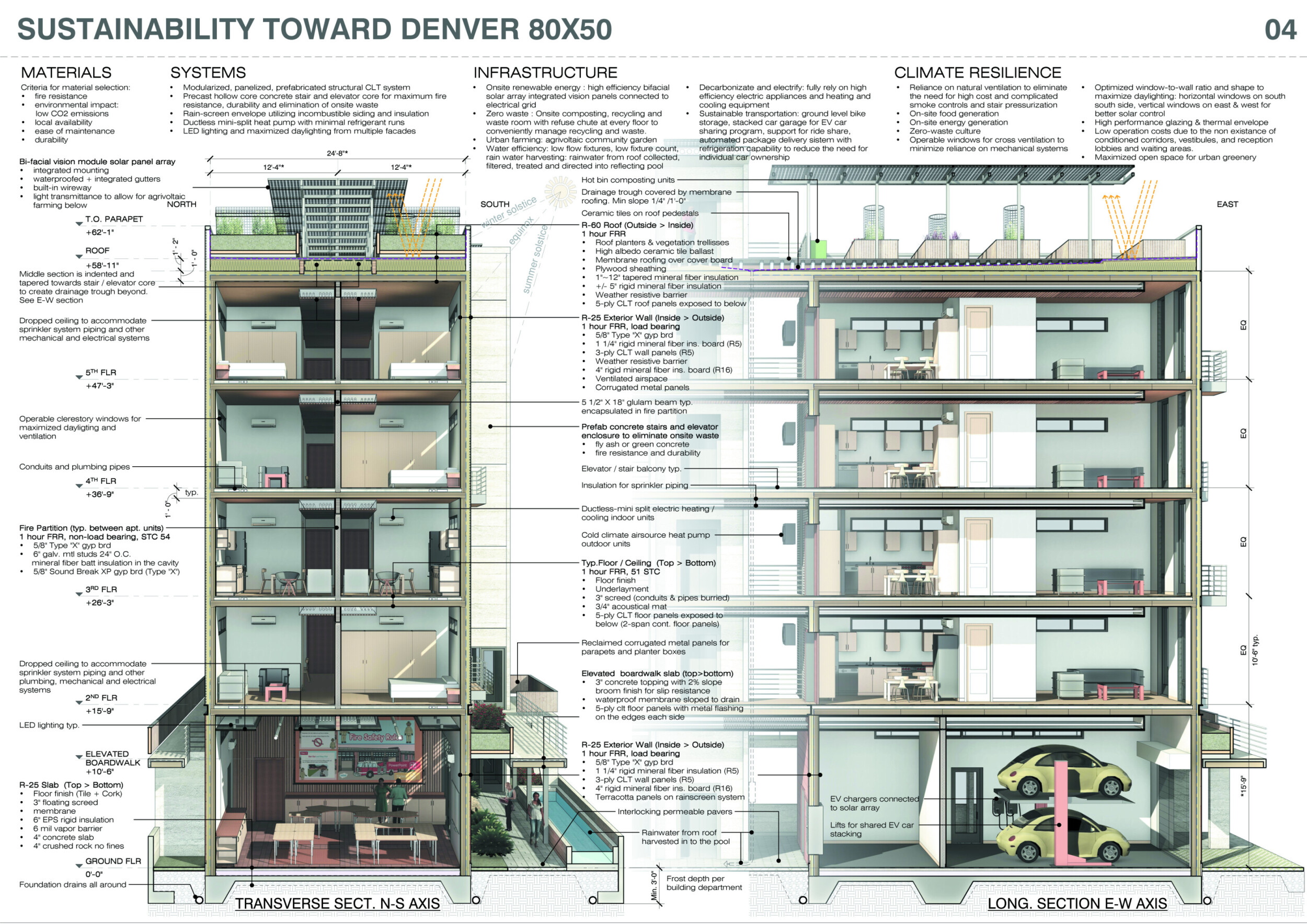 Red Rocks Rising is a modular, multifamily housing project integrating Passive House principles for energy efficiency and occupant comfort. The design utilizes prefabricated units to minimize waste and optimize construction time. A central atrium and external stairways enhance natural ventilation and daylight access, reducing reliance on mechanical systems. High-performance glazing, thermal bridge elimination, and airtight enclosures improve insulation and indoor climate control.