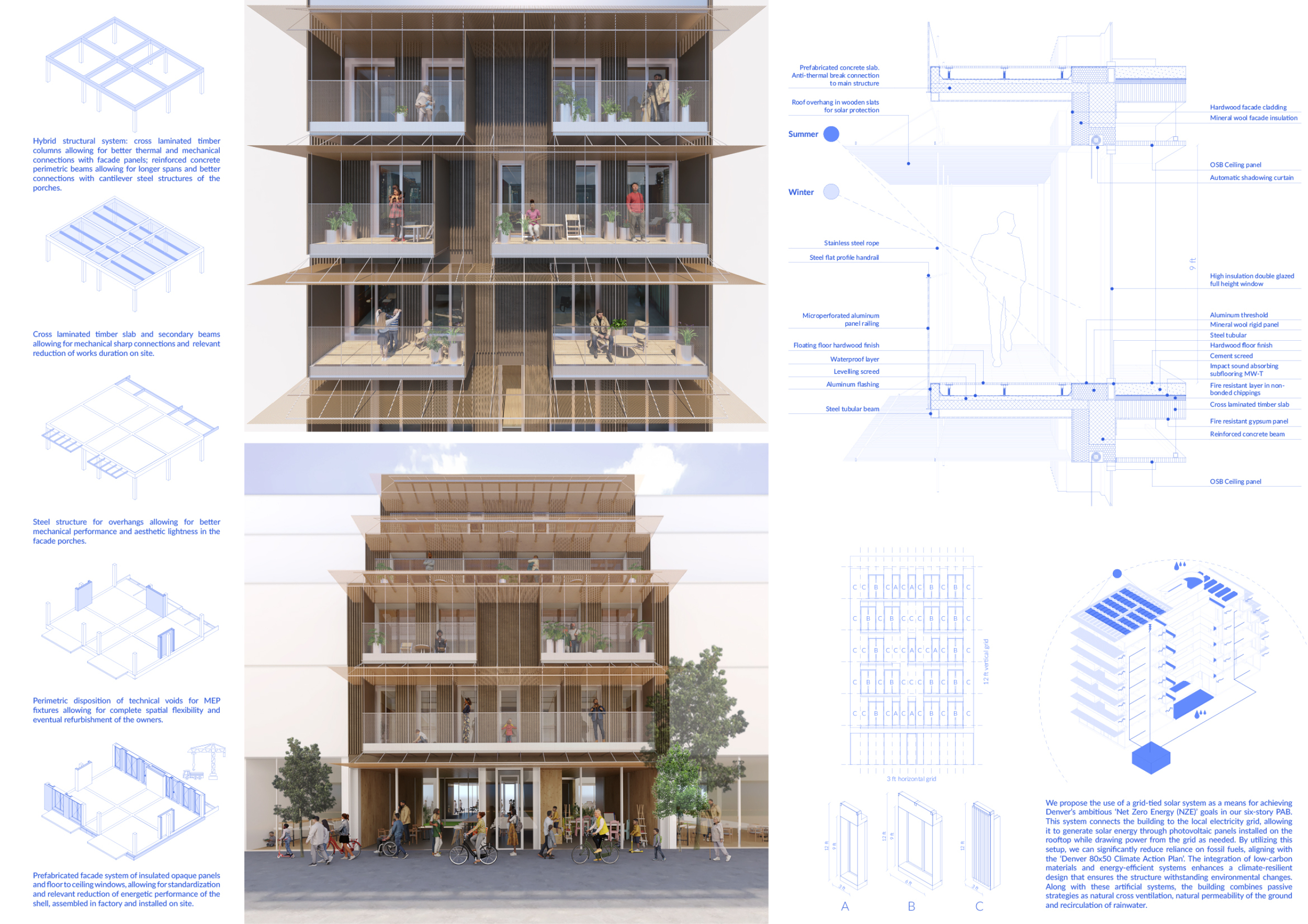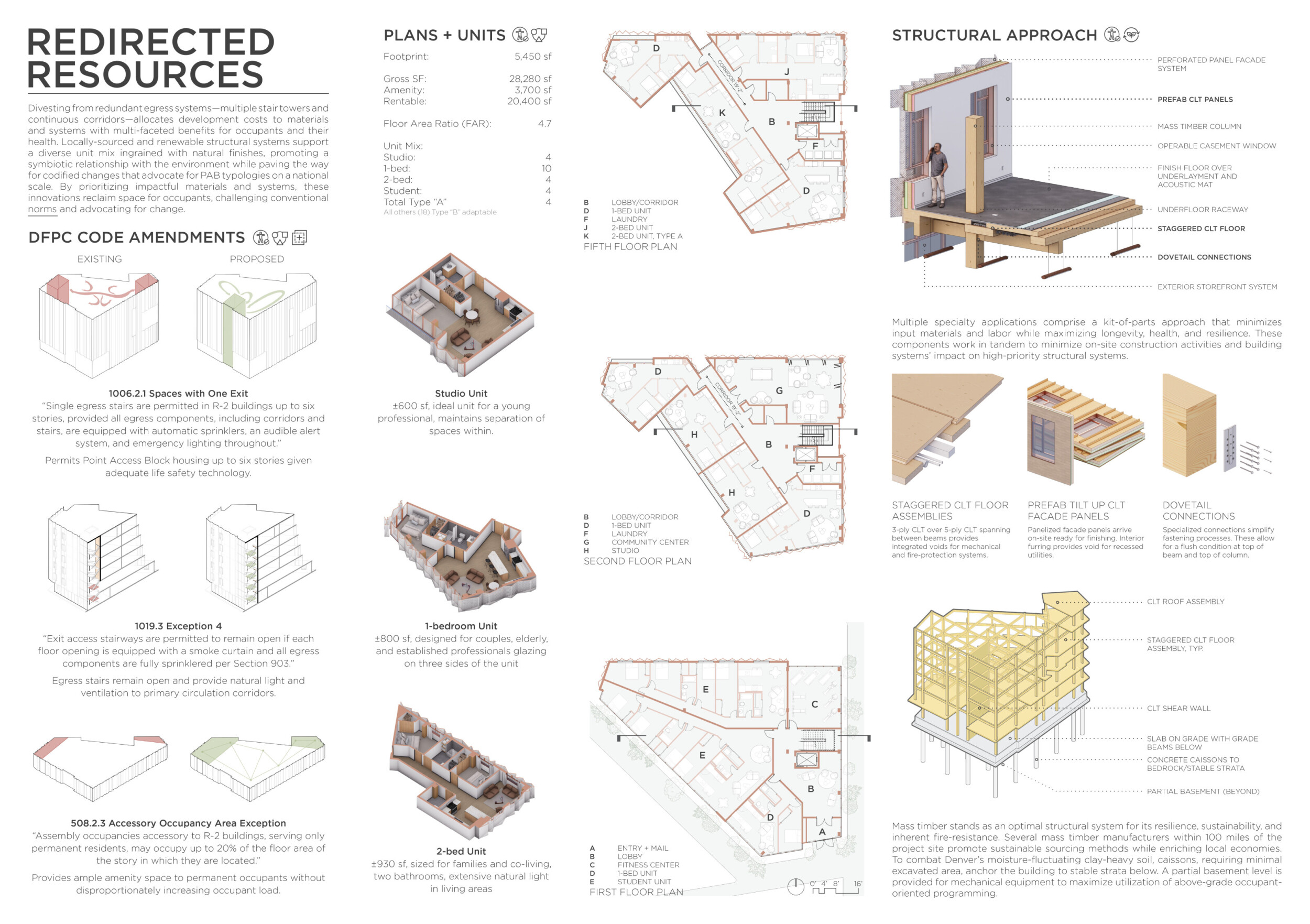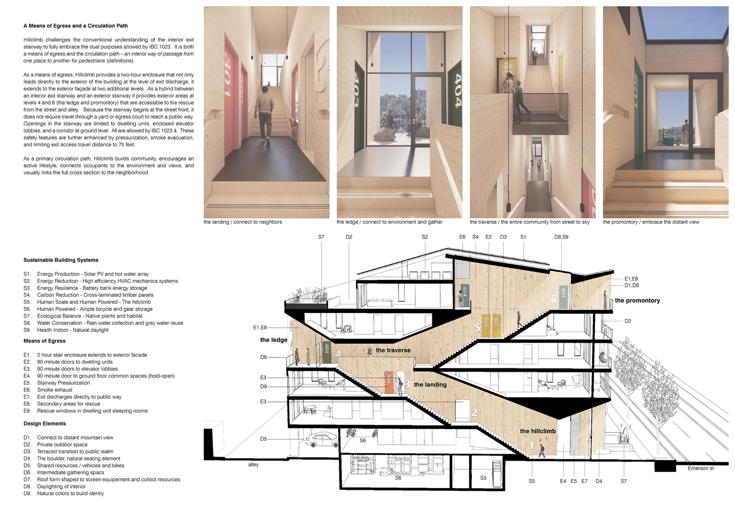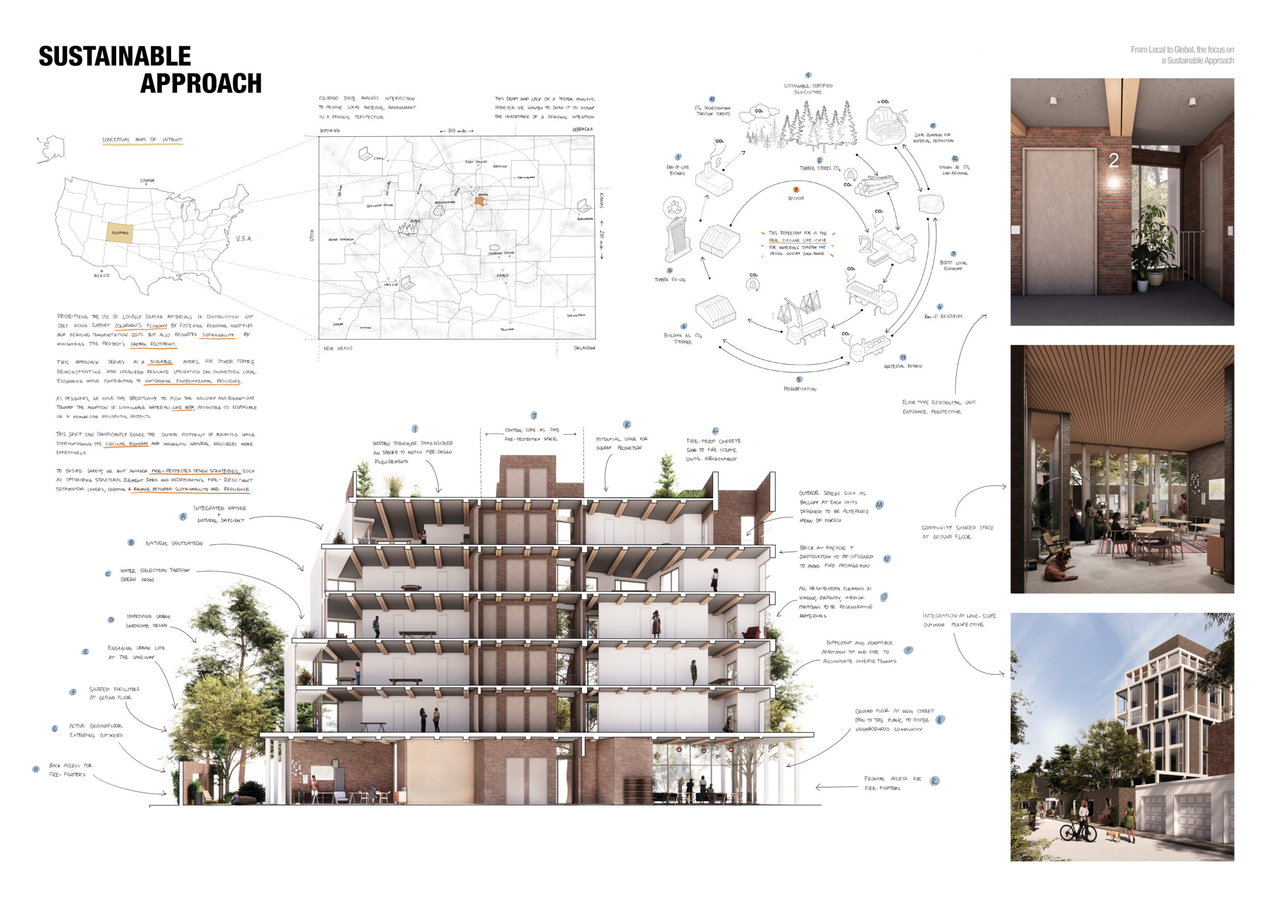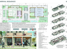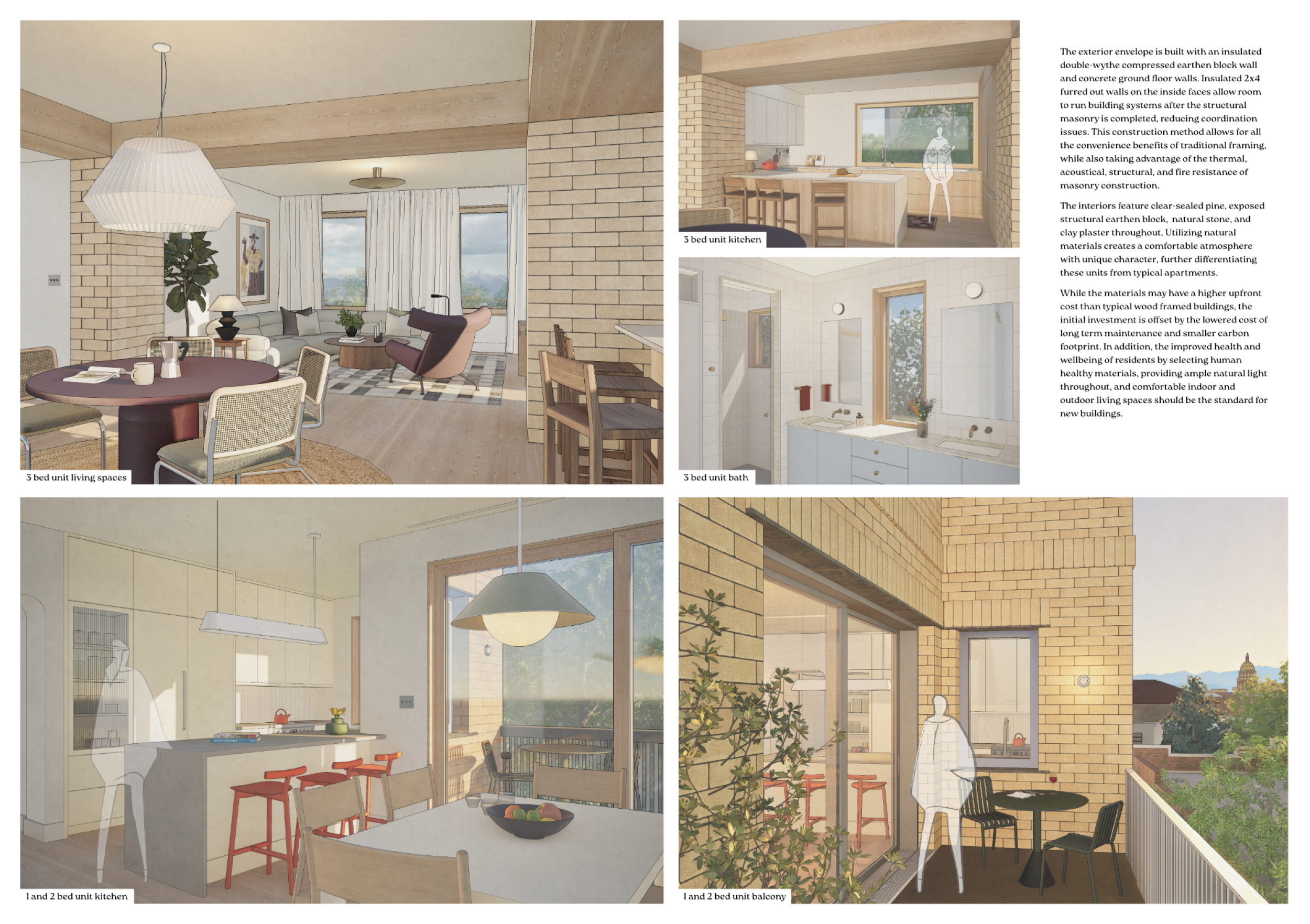 Red Rocks Rising is a modular, multifamily housing project integrating Passive House principles for energy efficiency and occupant comfort. The design utilizes prefabricated units to minimize waste and optimize construction time. A central atrium and external stairways enhance natural ventilation and daylight access, reducing reliance on mechanical systems. High-performance glazing, thermal bridge elimination, and airtight enclosures improve insulation and indoor climate control.