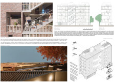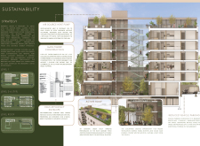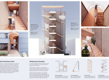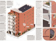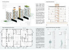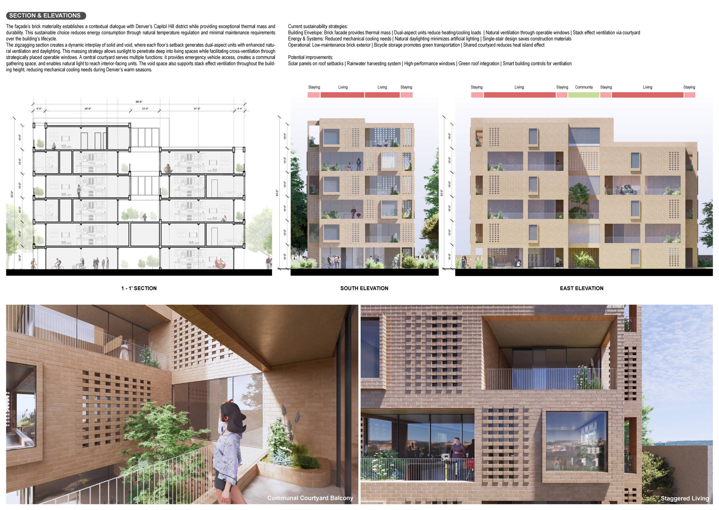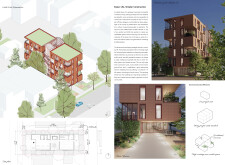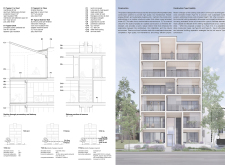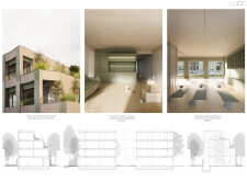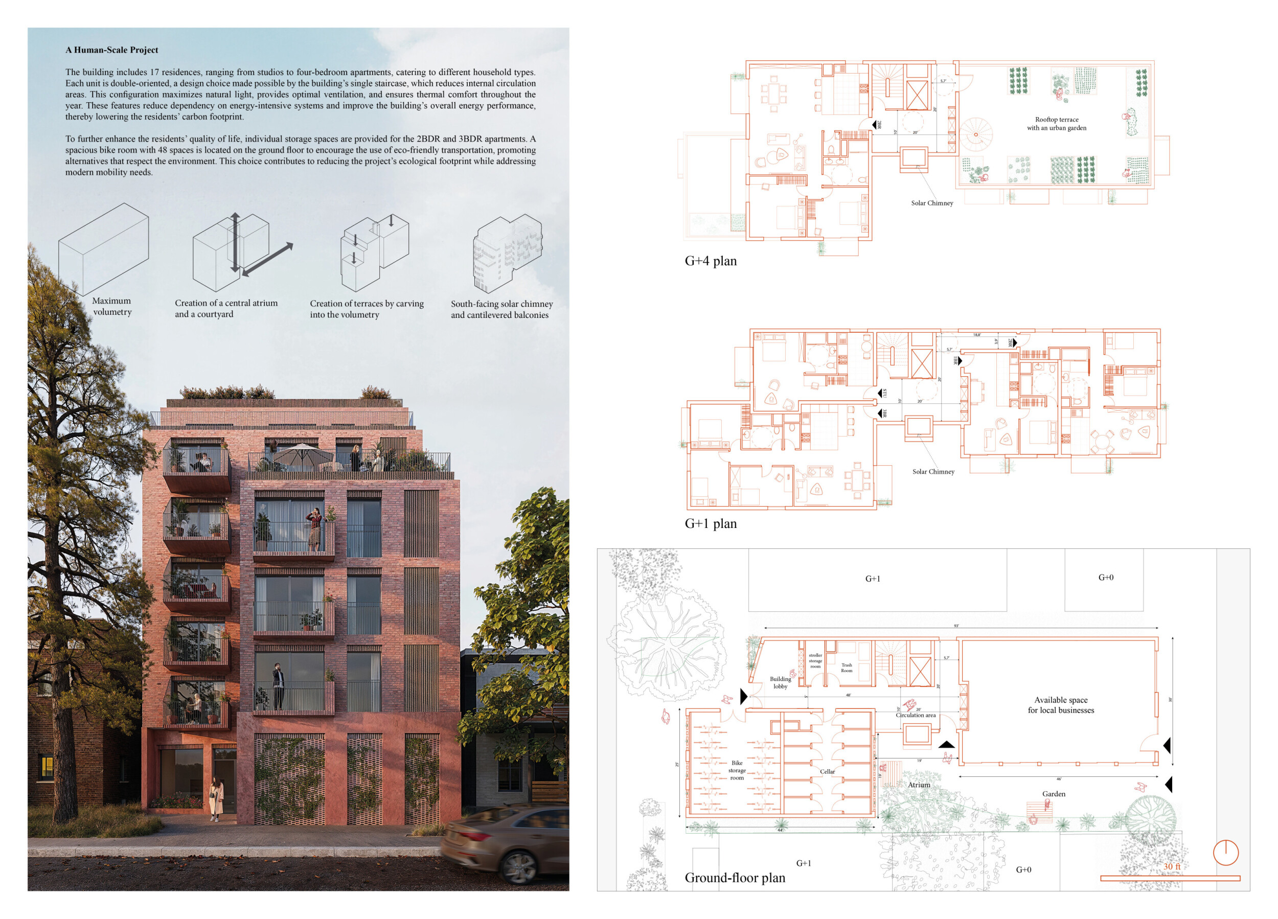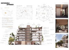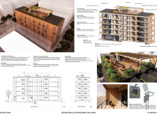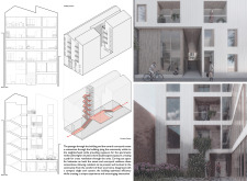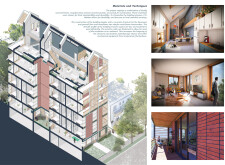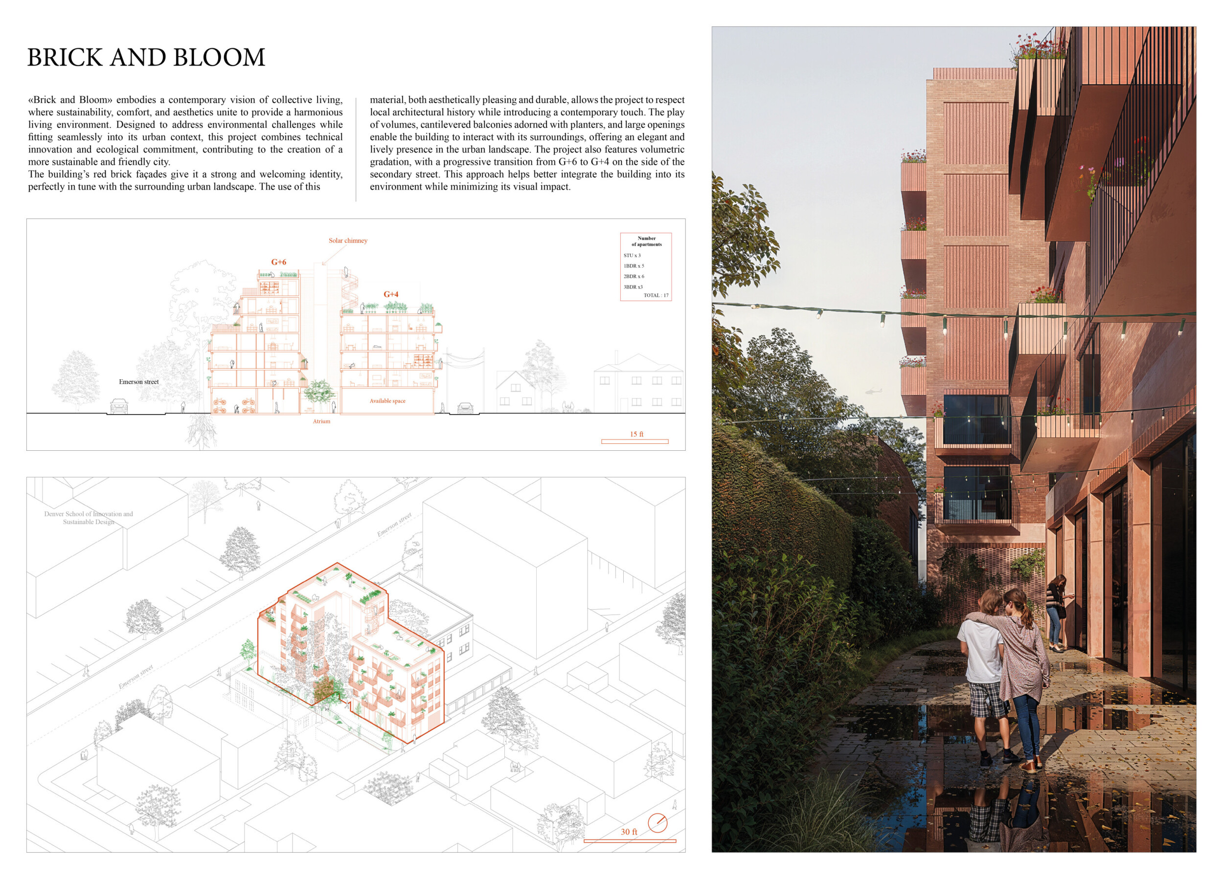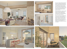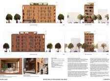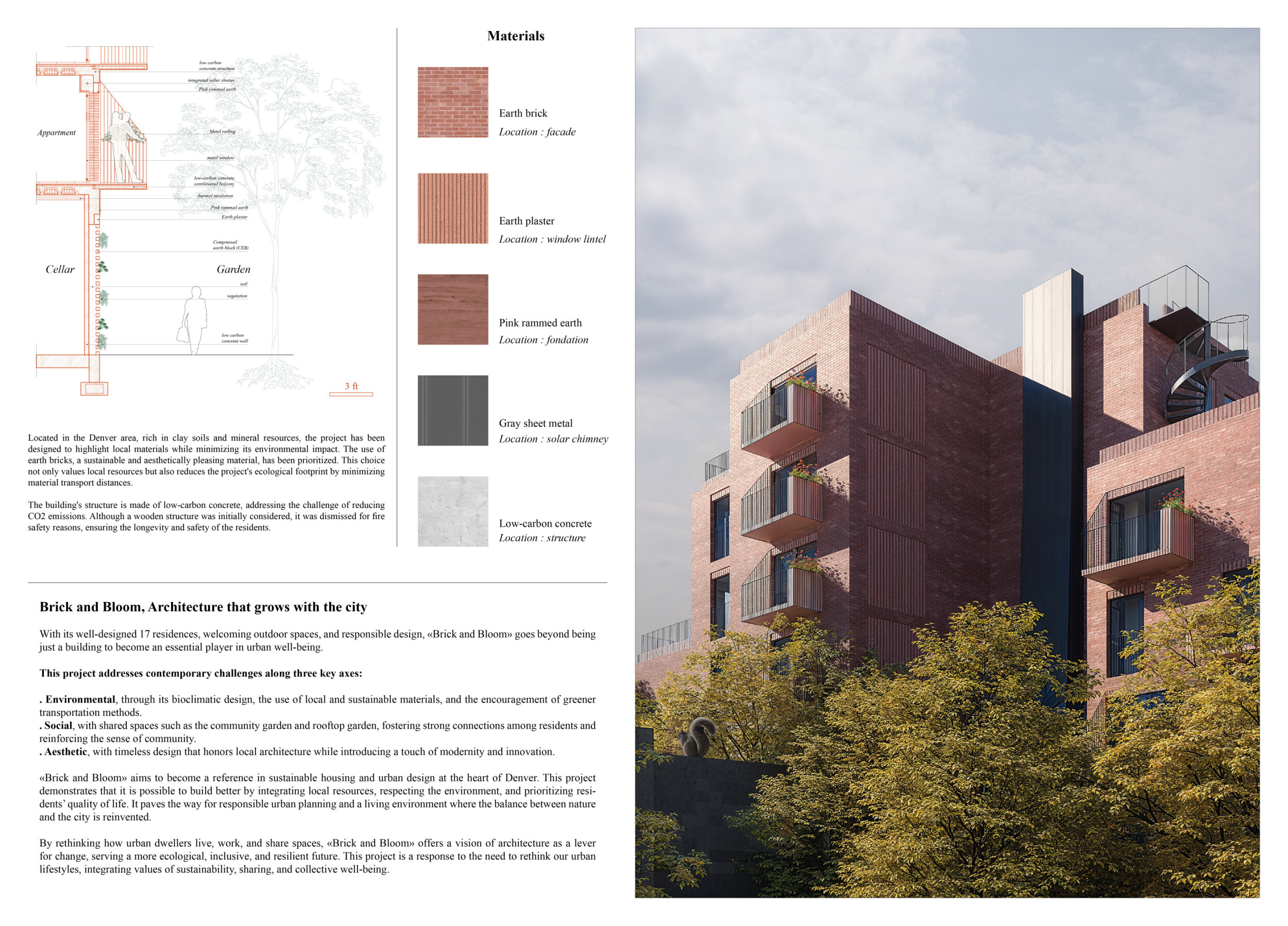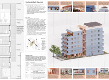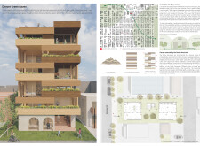 Brick and Bloom utilizes earth bricks, low-carbon concrete, and bioclimatic strategies to reduce environmental impact. Natural ventilation, solar chimneys, and dual-orientation units optimize thermal comfort and energy efficiency. Residences feature private green spaces and cantilevered balconies, enhancing urban biodiversity. Shared outdoor areas, including a rooftop garden and central courtyard, foster community interaction.