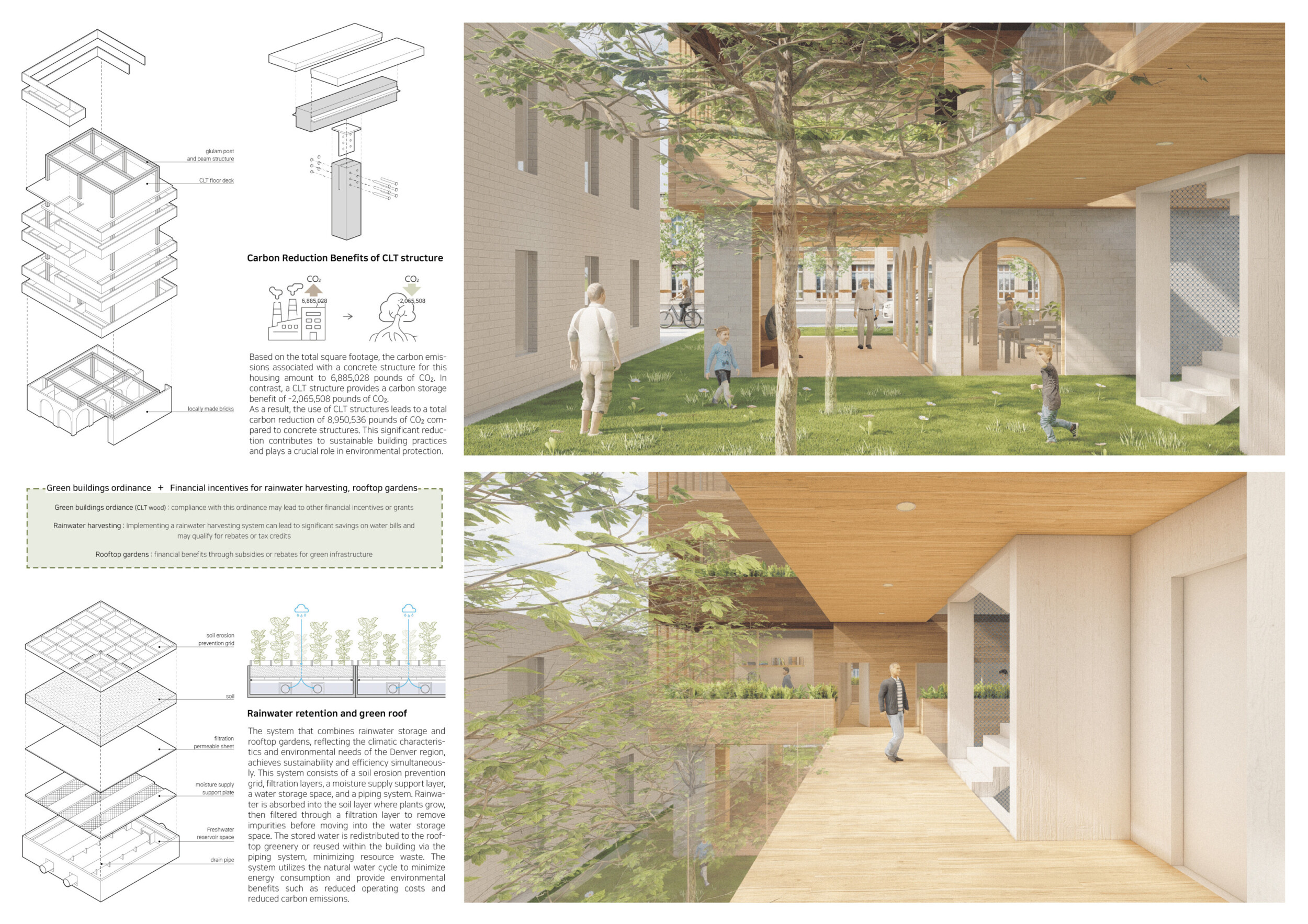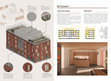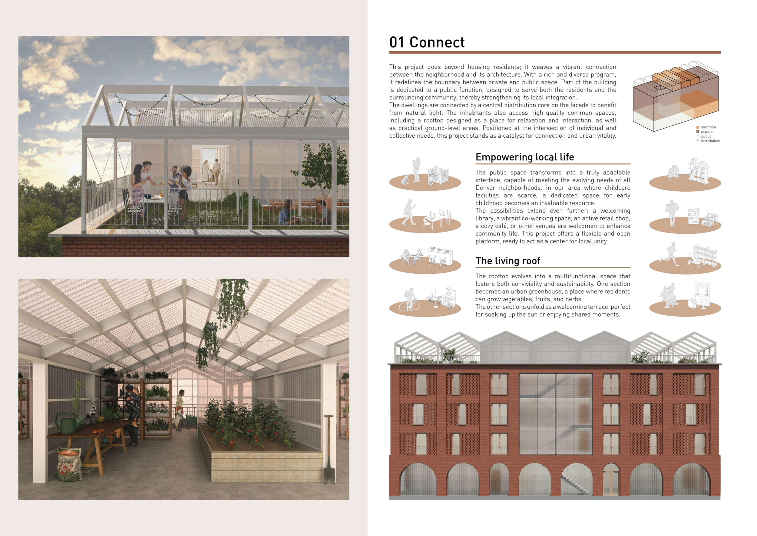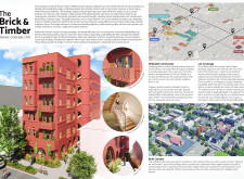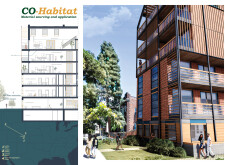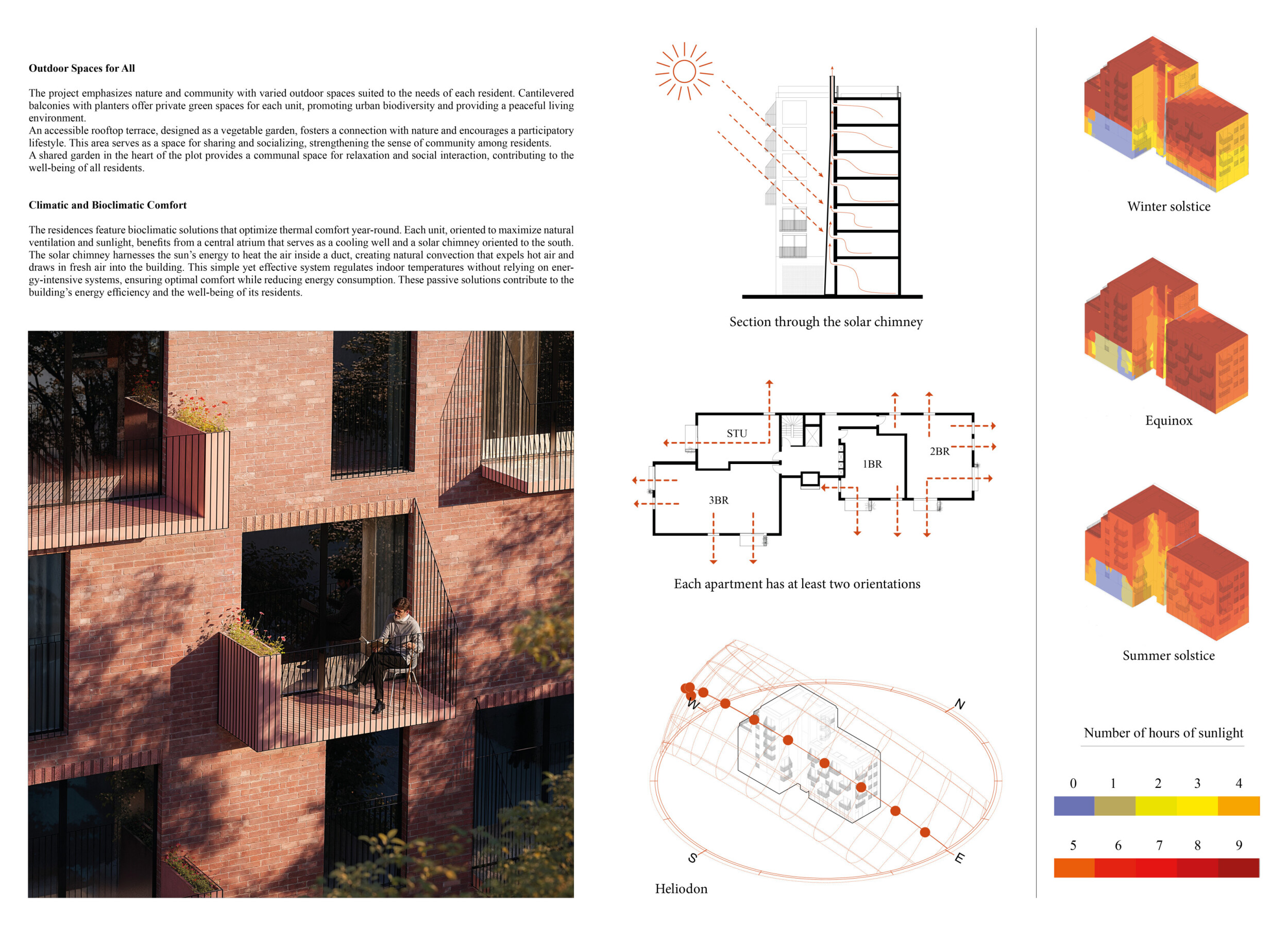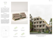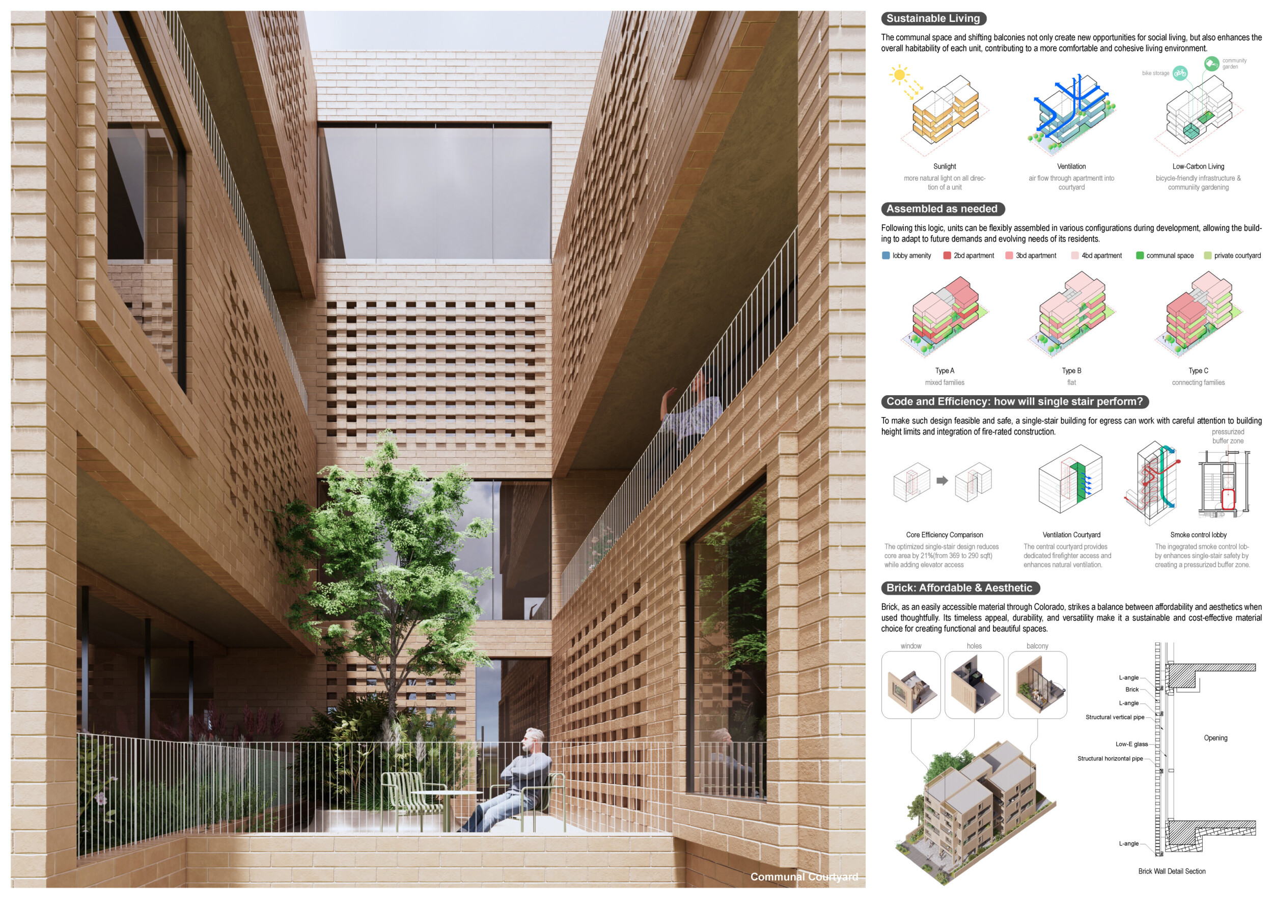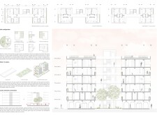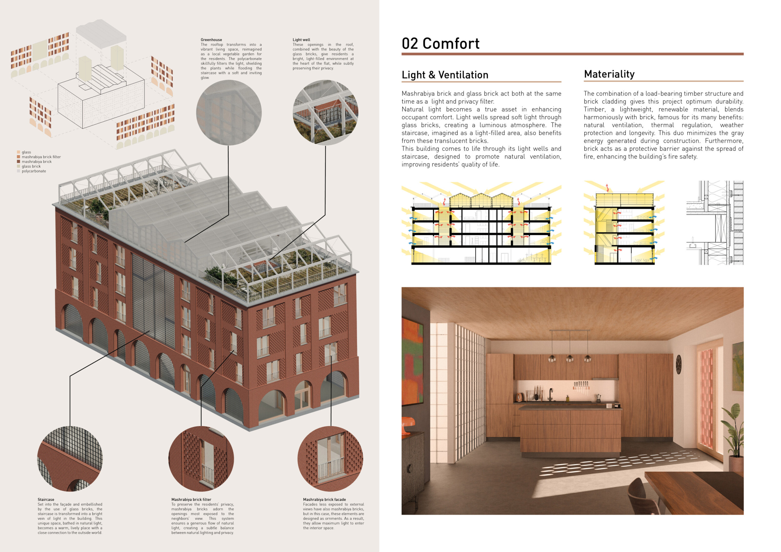 Brick and Bloom utilizes earth bricks, low-carbon concrete, and bioclimatic strategies to reduce environmental impact. Natural ventilation, solar chimneys, and dual-orientation units optimize thermal comfort and energy efficiency. Residences feature private green spaces and cantilevered balconies, enhancing urban biodiversity. Shared outdoor areas, including a rooftop garden and central courtyard, foster community interaction.