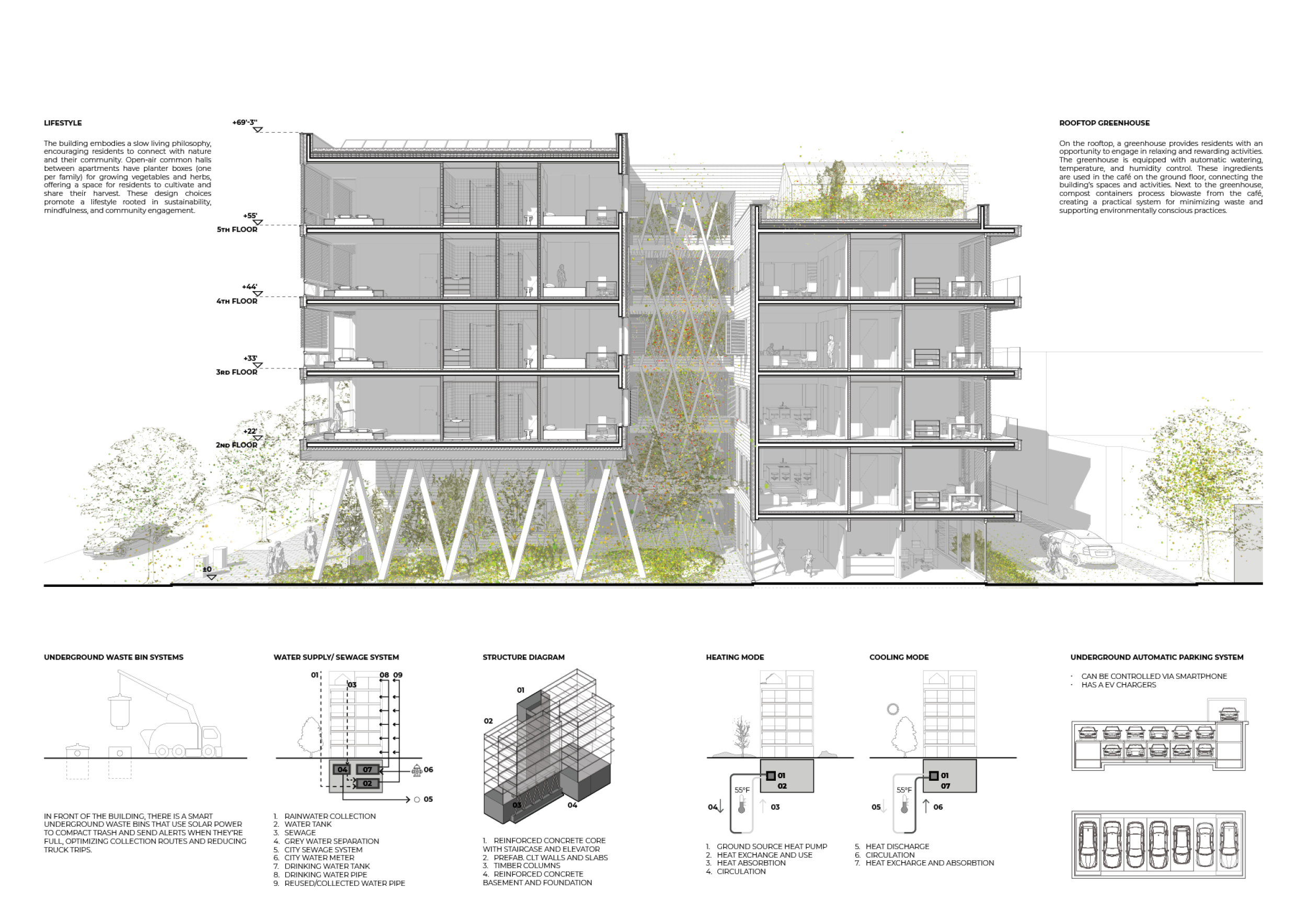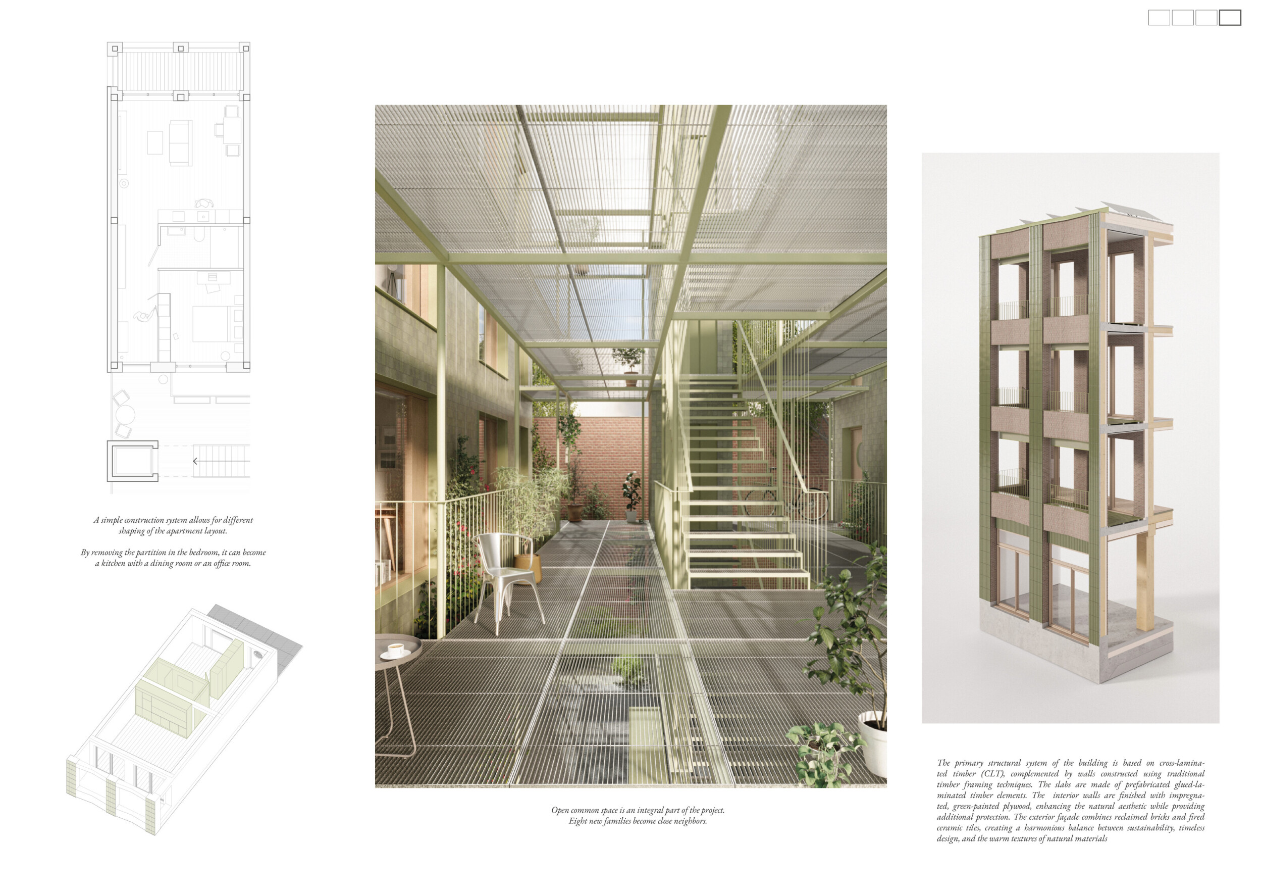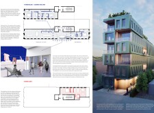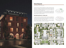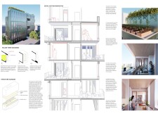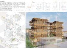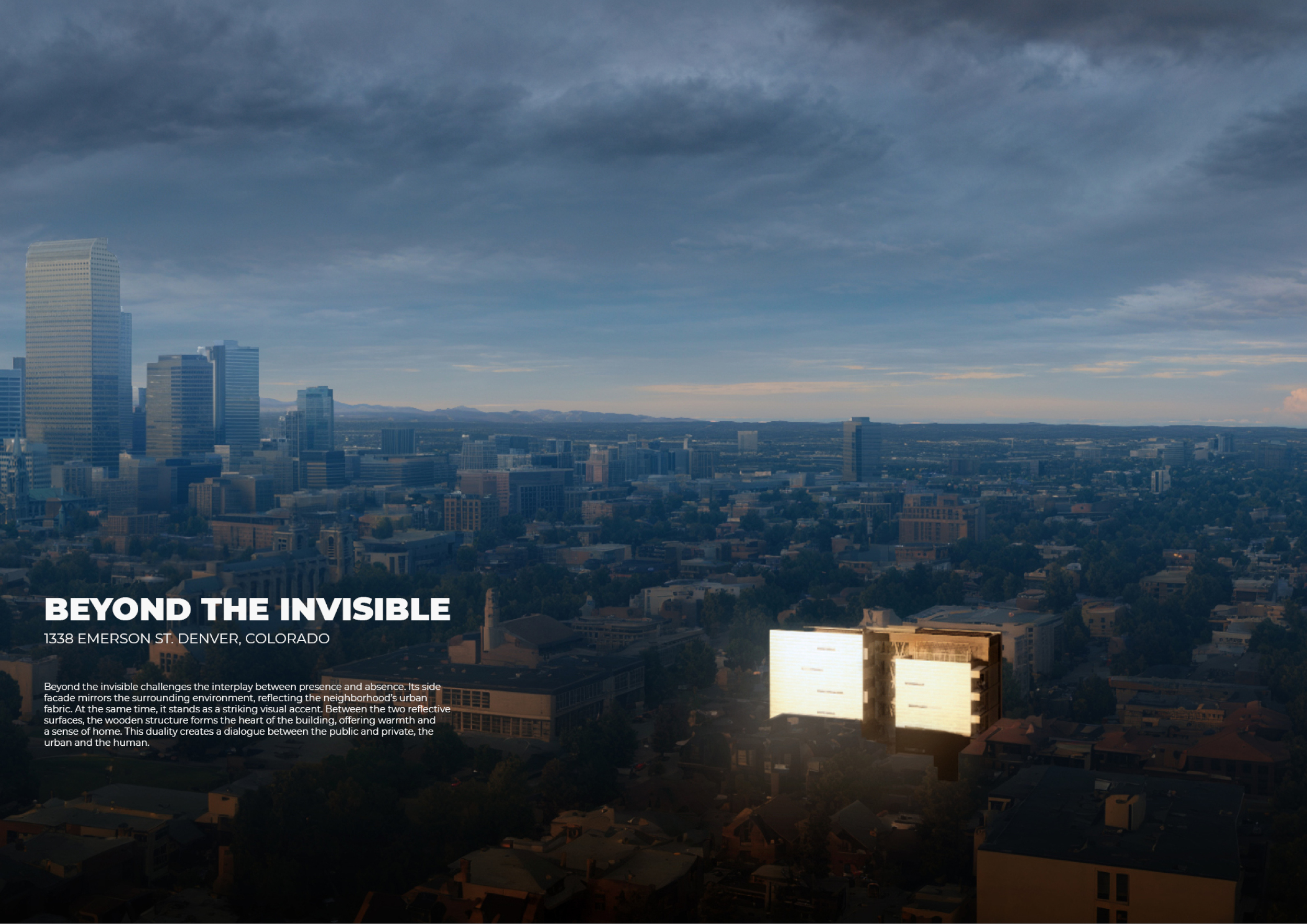 Beyond the Invisible is designed to balance urban integration, sustainability, and community engagement. The building’s mirrored façades reflect the surrounding environment, blending into the cityscape while maintaining a distinct visual presence. The structure is composed of prefabricated timber, optimizing efficiency and reducing environmental impact. Shared spaces, including a rooftop greenhouse and communal terraces, encourage social interaction and urban farming.
