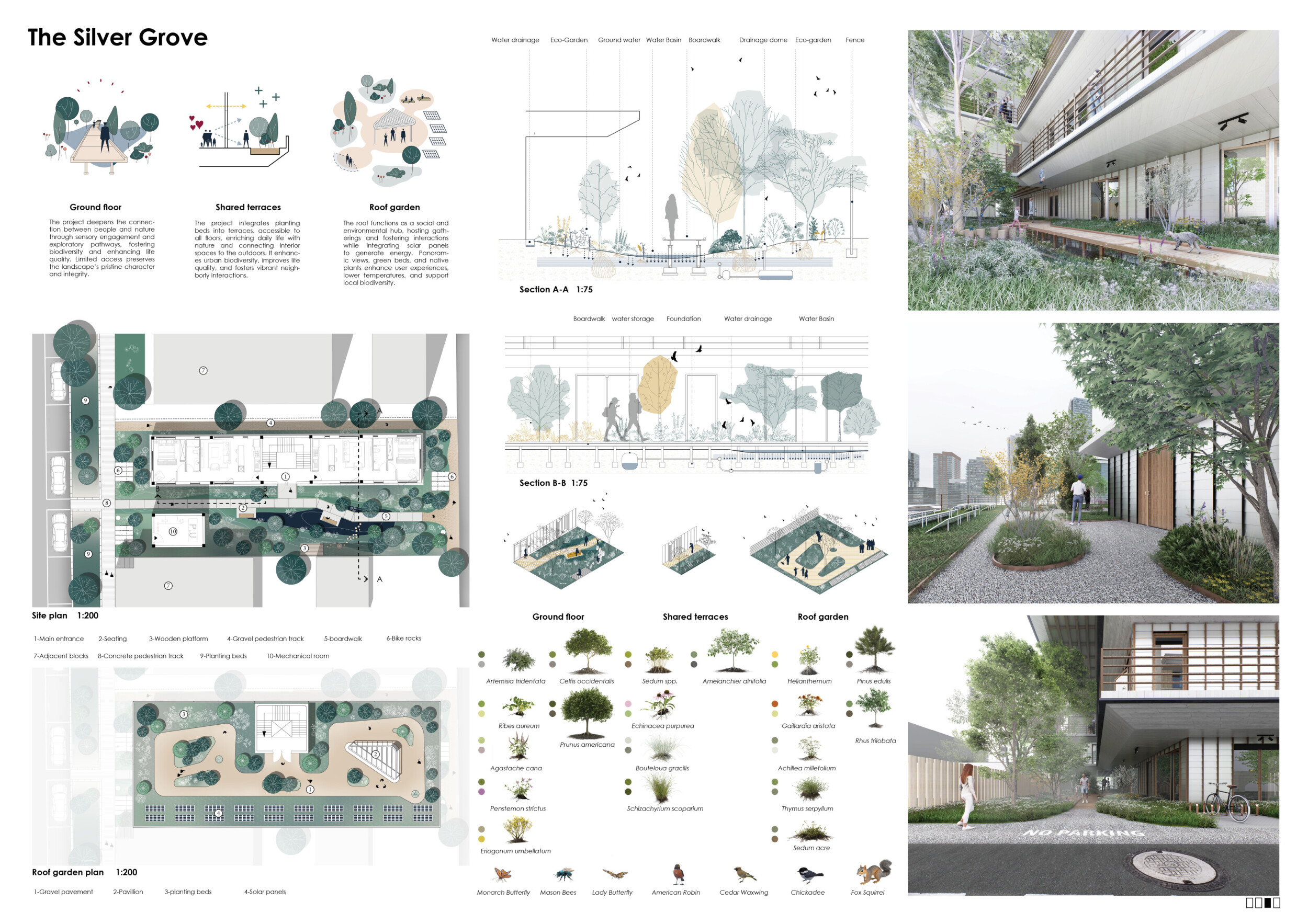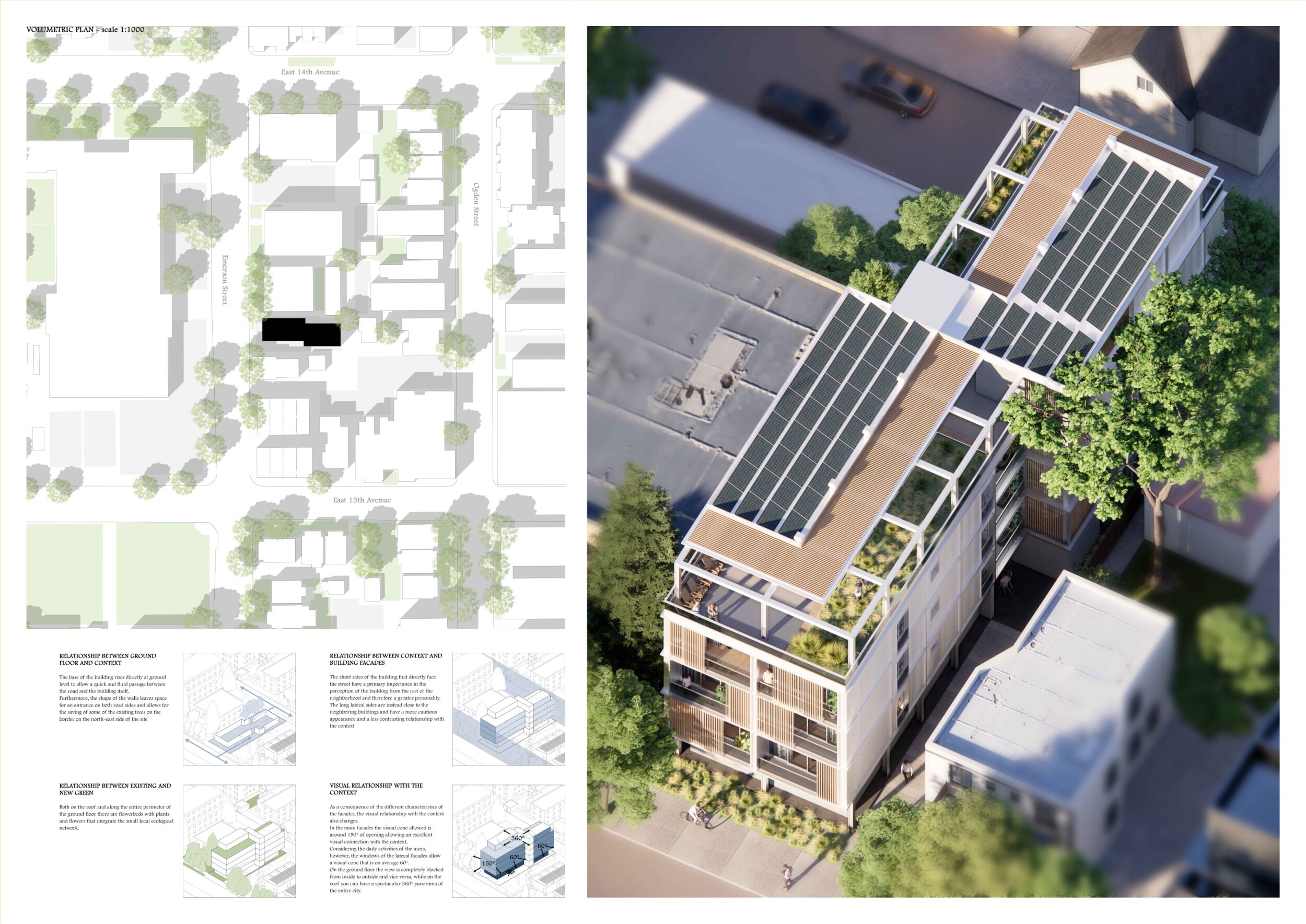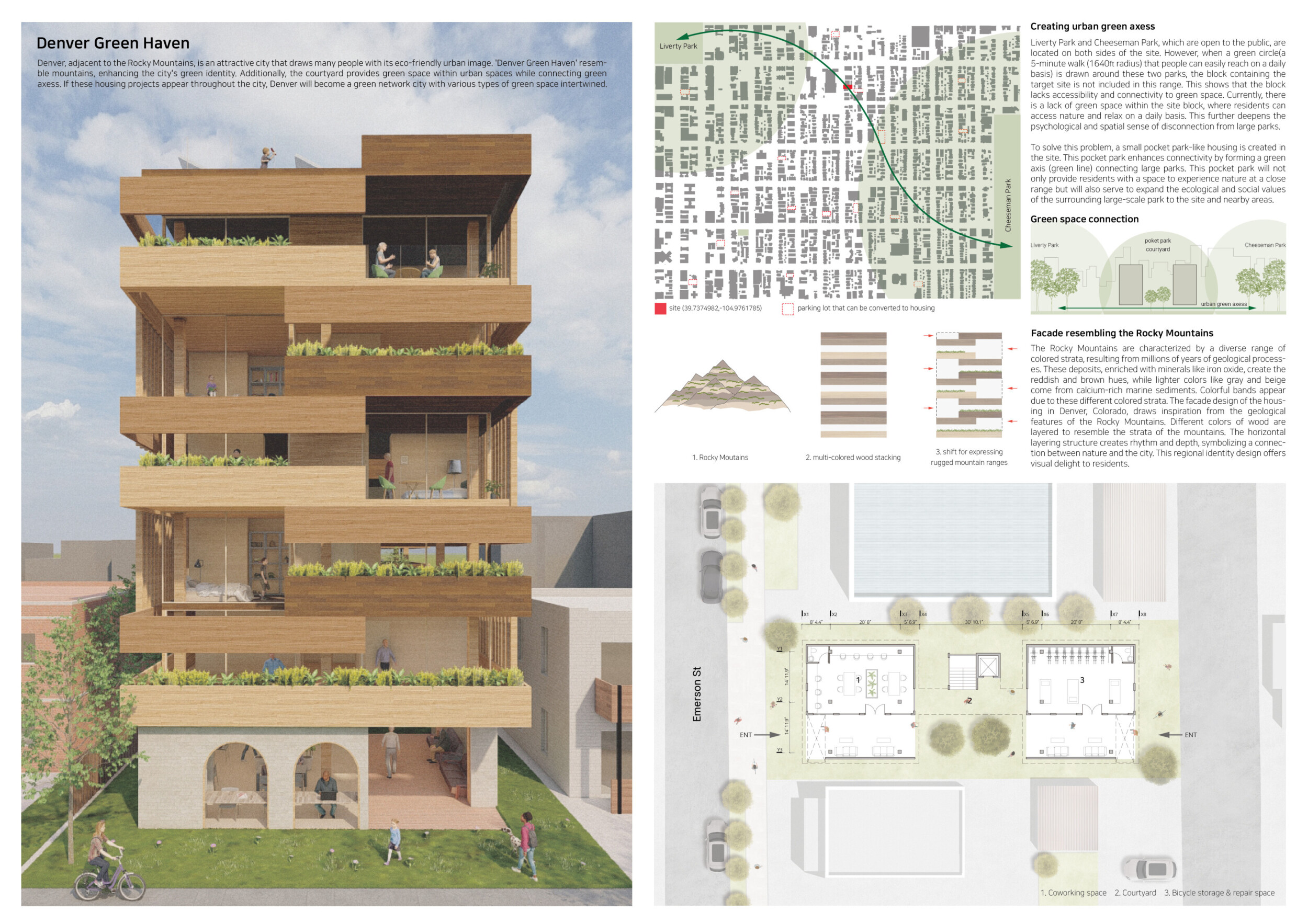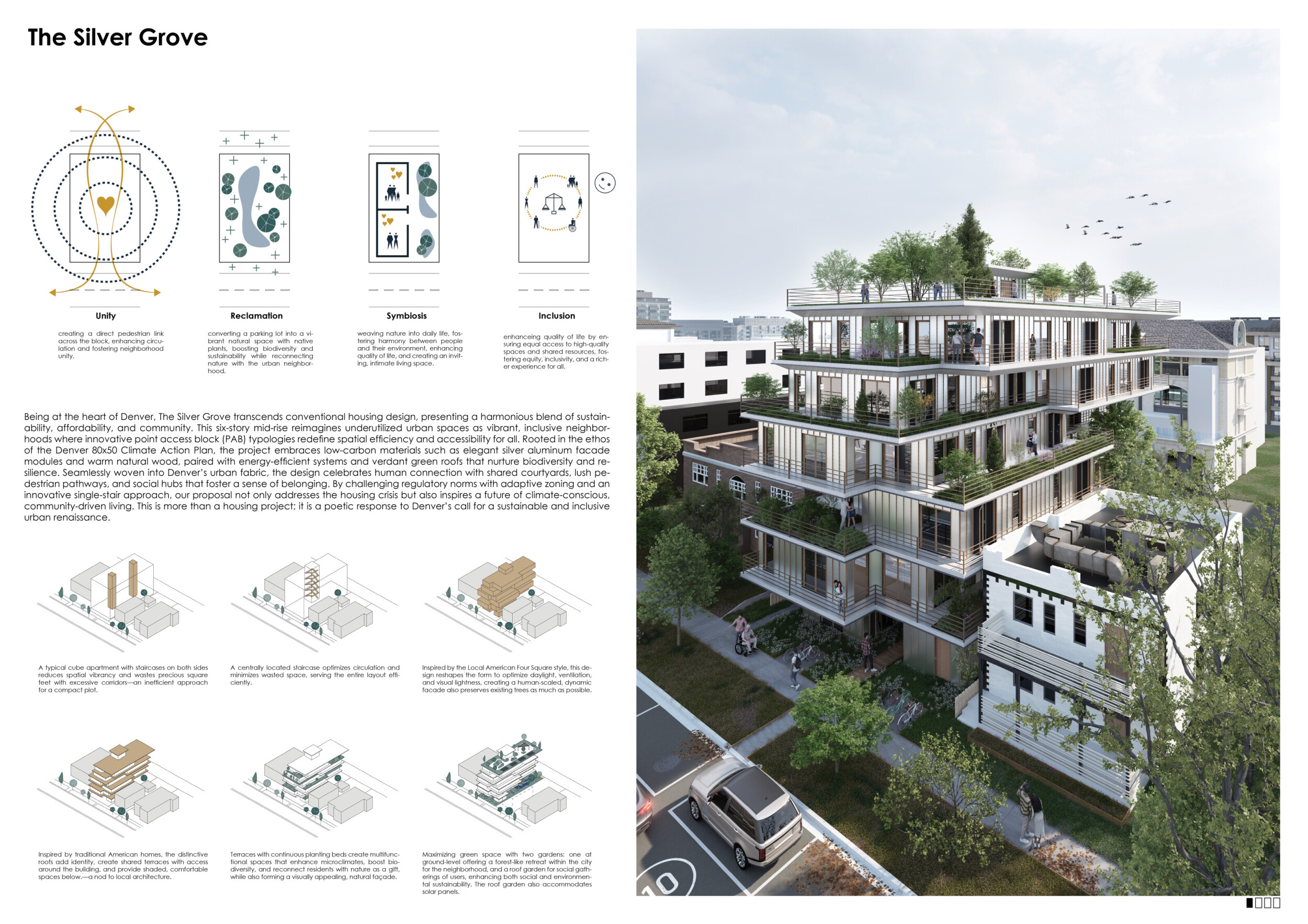 Beyond the Invisible is designed to balance urban integration, sustainability, and community engagement. The building’s mirrored façades reflect the surrounding environment, blending into the cityscape while maintaining a distinct visual presence. The structure is composed of prefabricated timber, optimizing efficiency and reducing environmental impact. Shared spaces, including a rooftop greenhouse and communal terraces, encourage social interaction and urban farming.