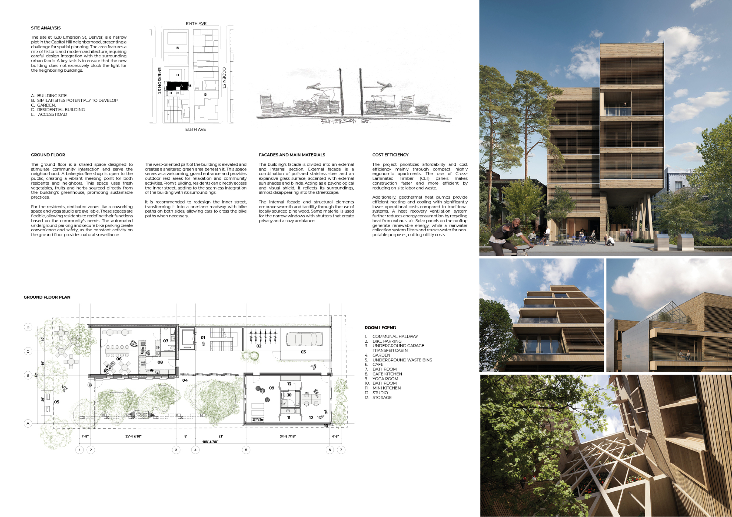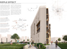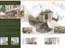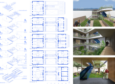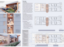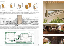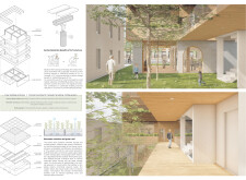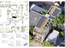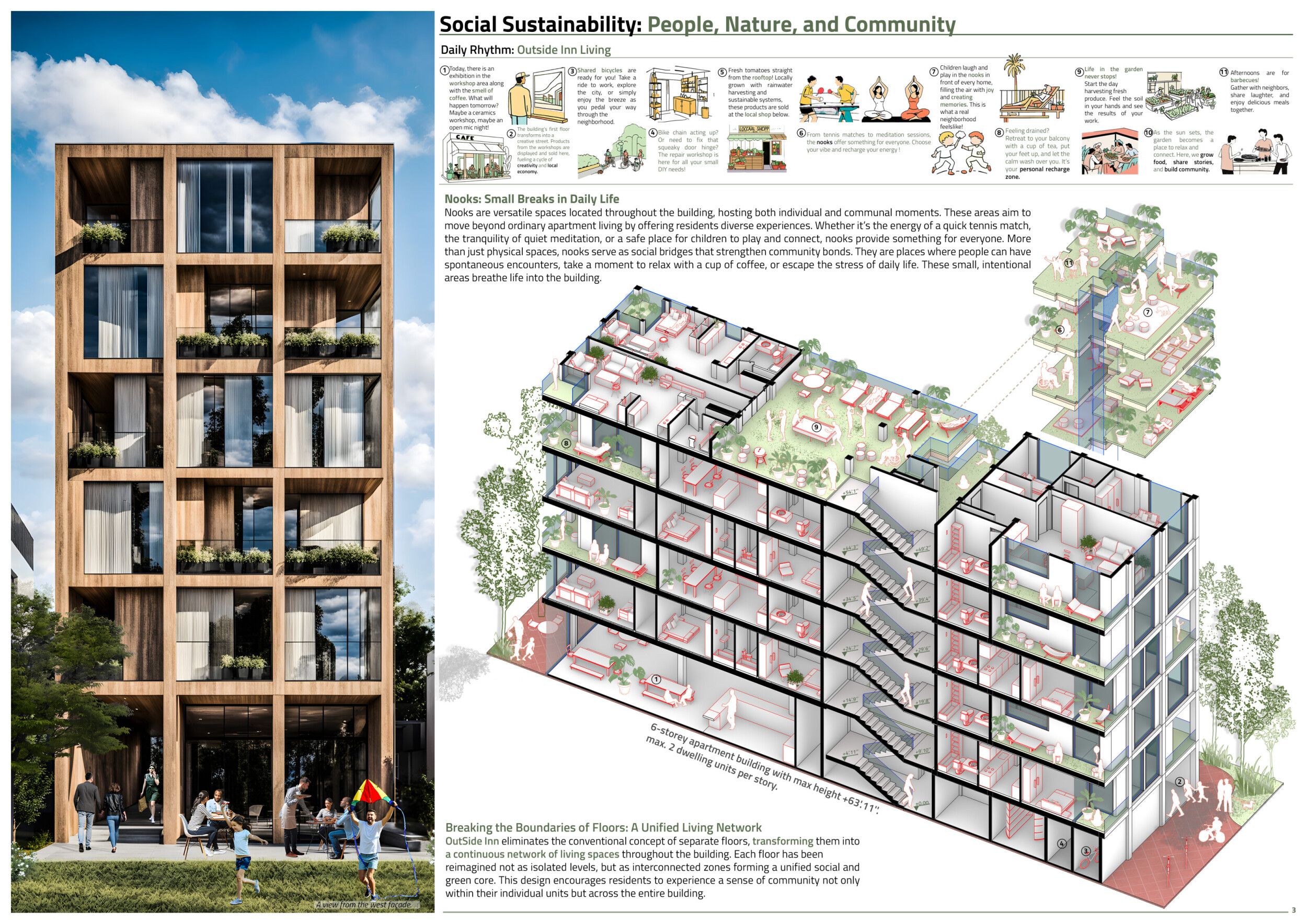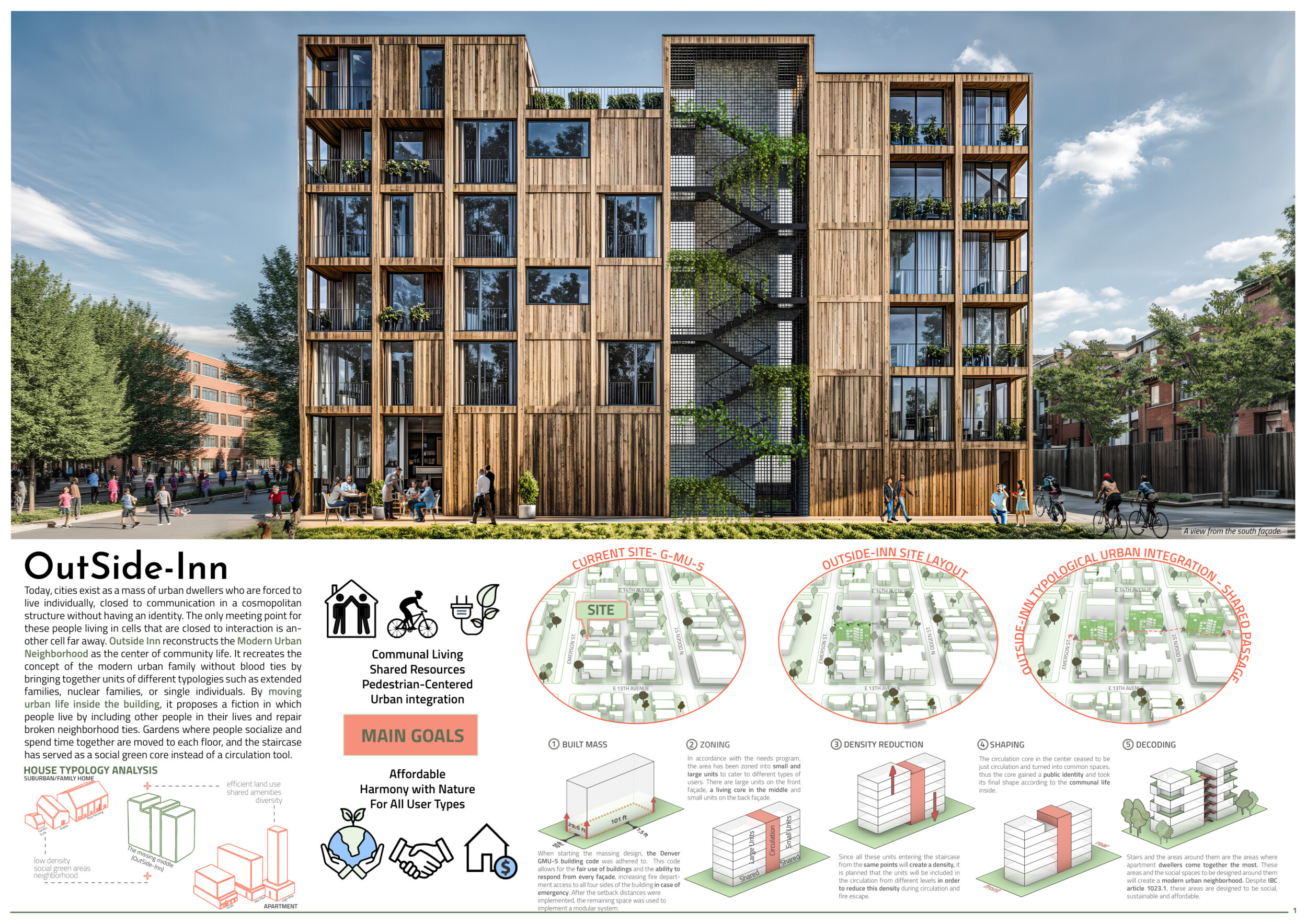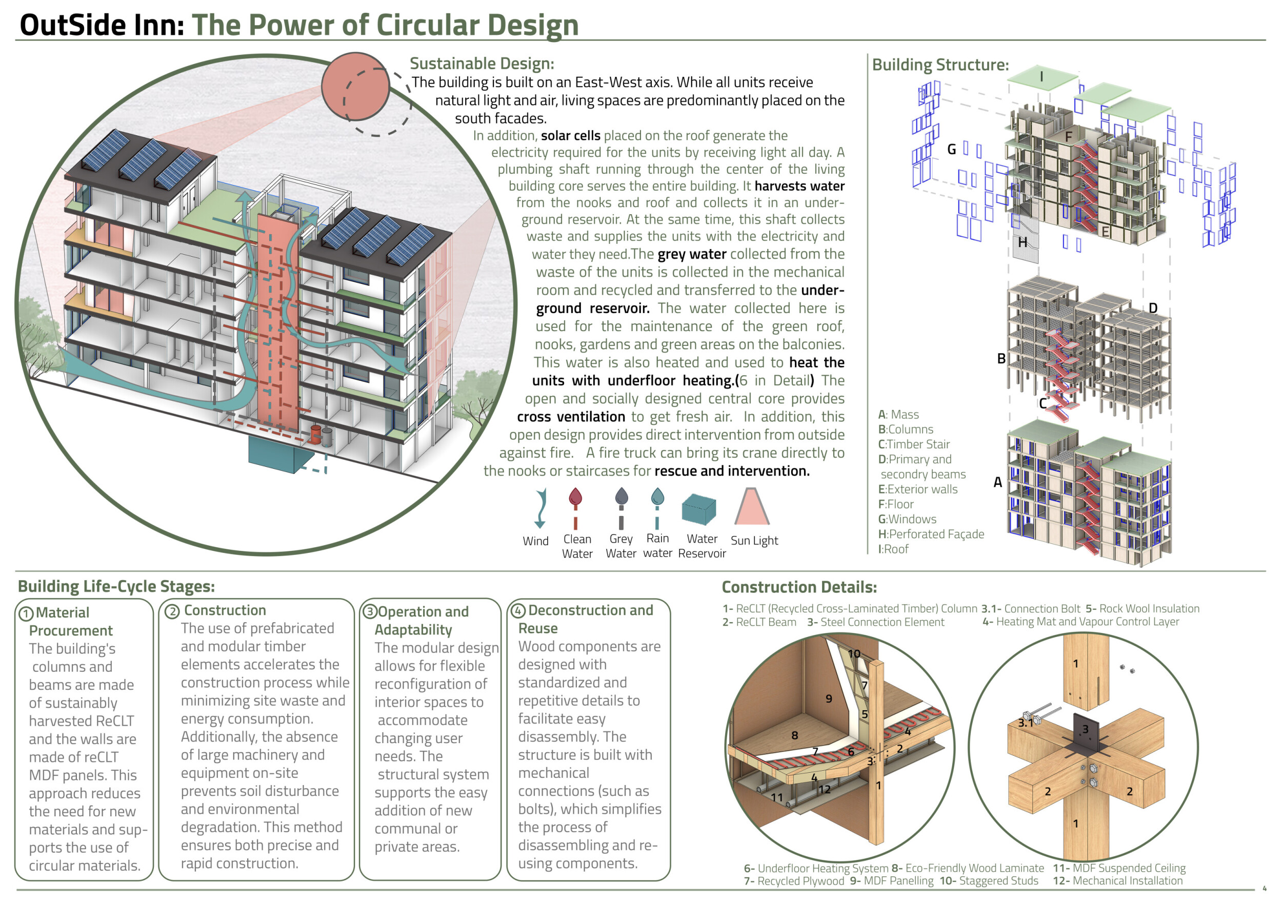 OutSide-Inn is a modular project prioritizing circular design, sustainability, and community living. Constructed from prefabricated timber and recycled materials, the building reduces environmental impact while enabling adaptability. Solar panels generate electricity, and a central shaft system harvests and recycles water for irrigation and underfloor heating. The design promotes cross-ventilation and passive cooling, minimizing energy consumption.
