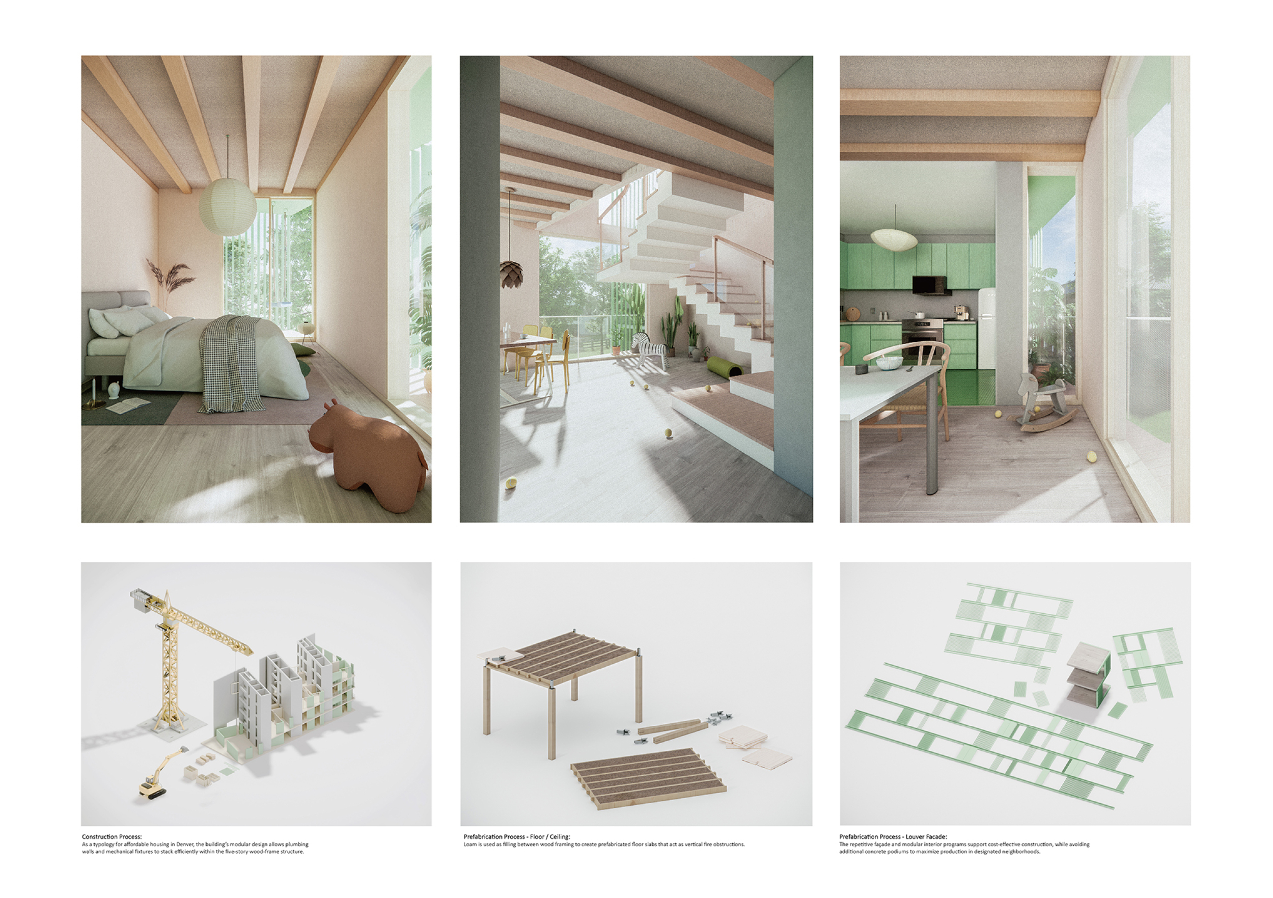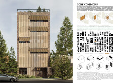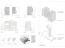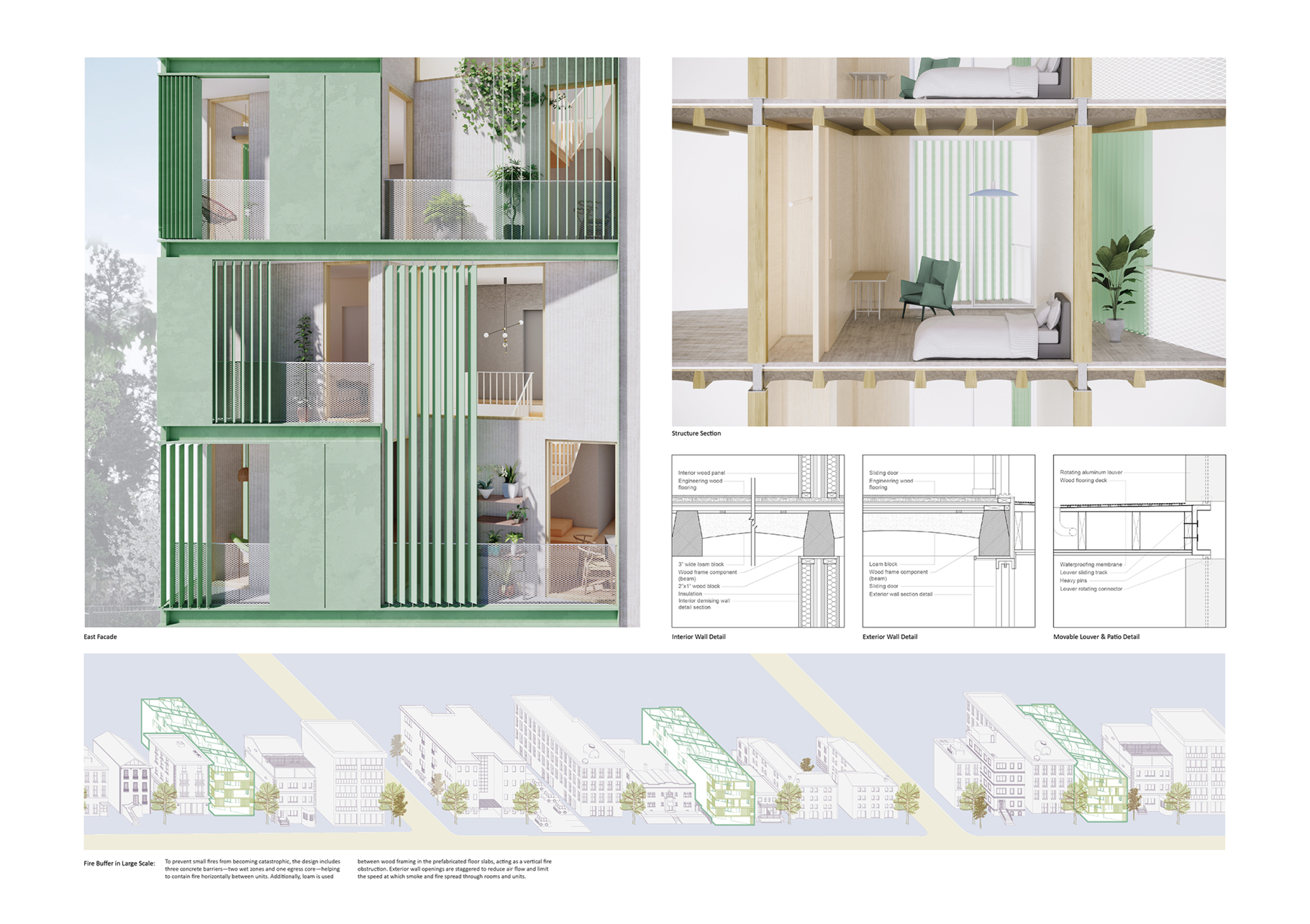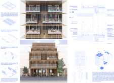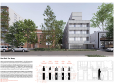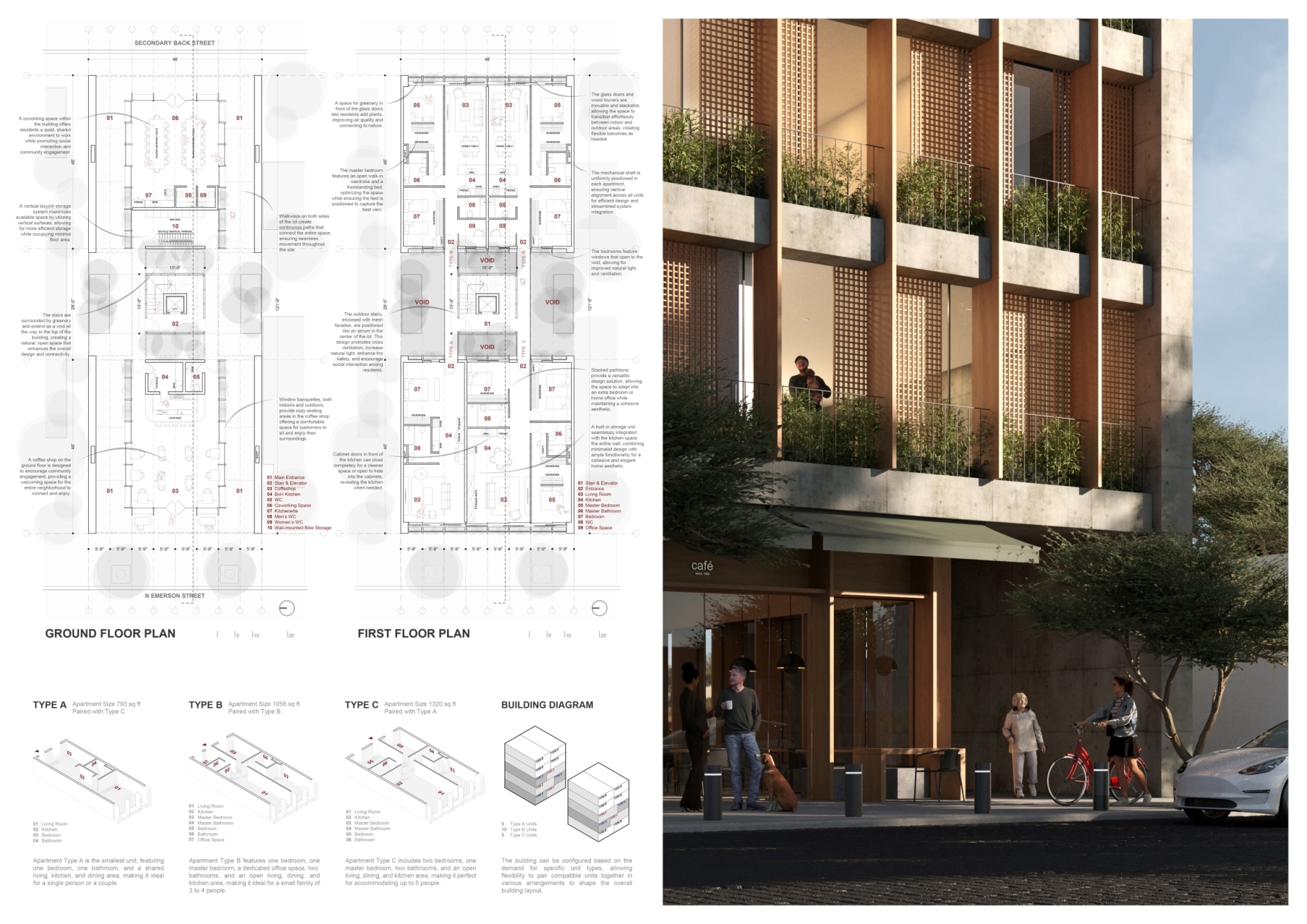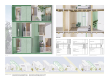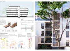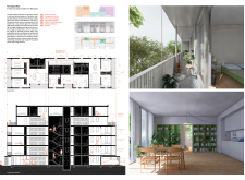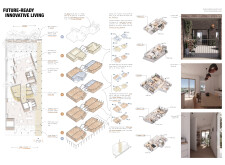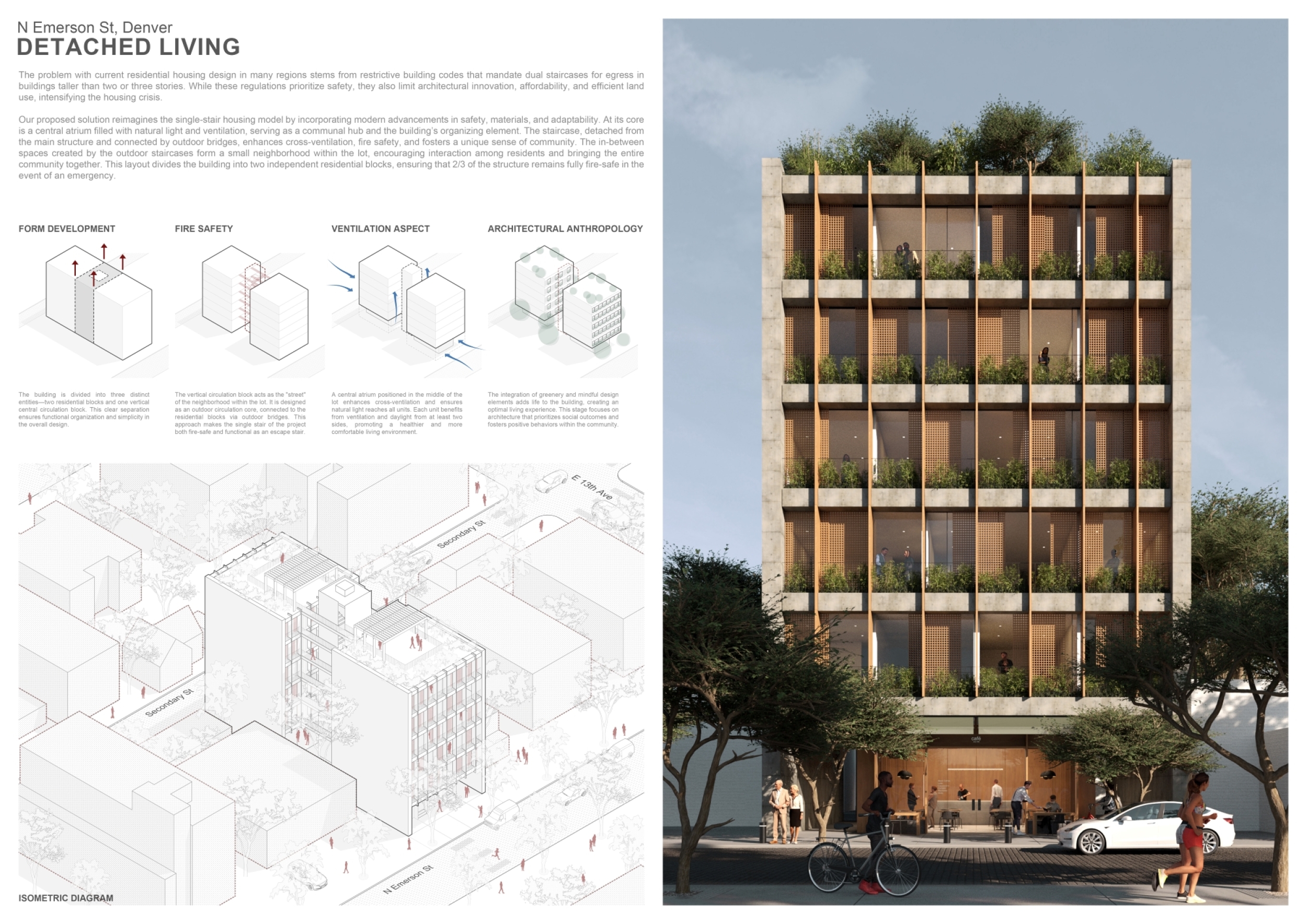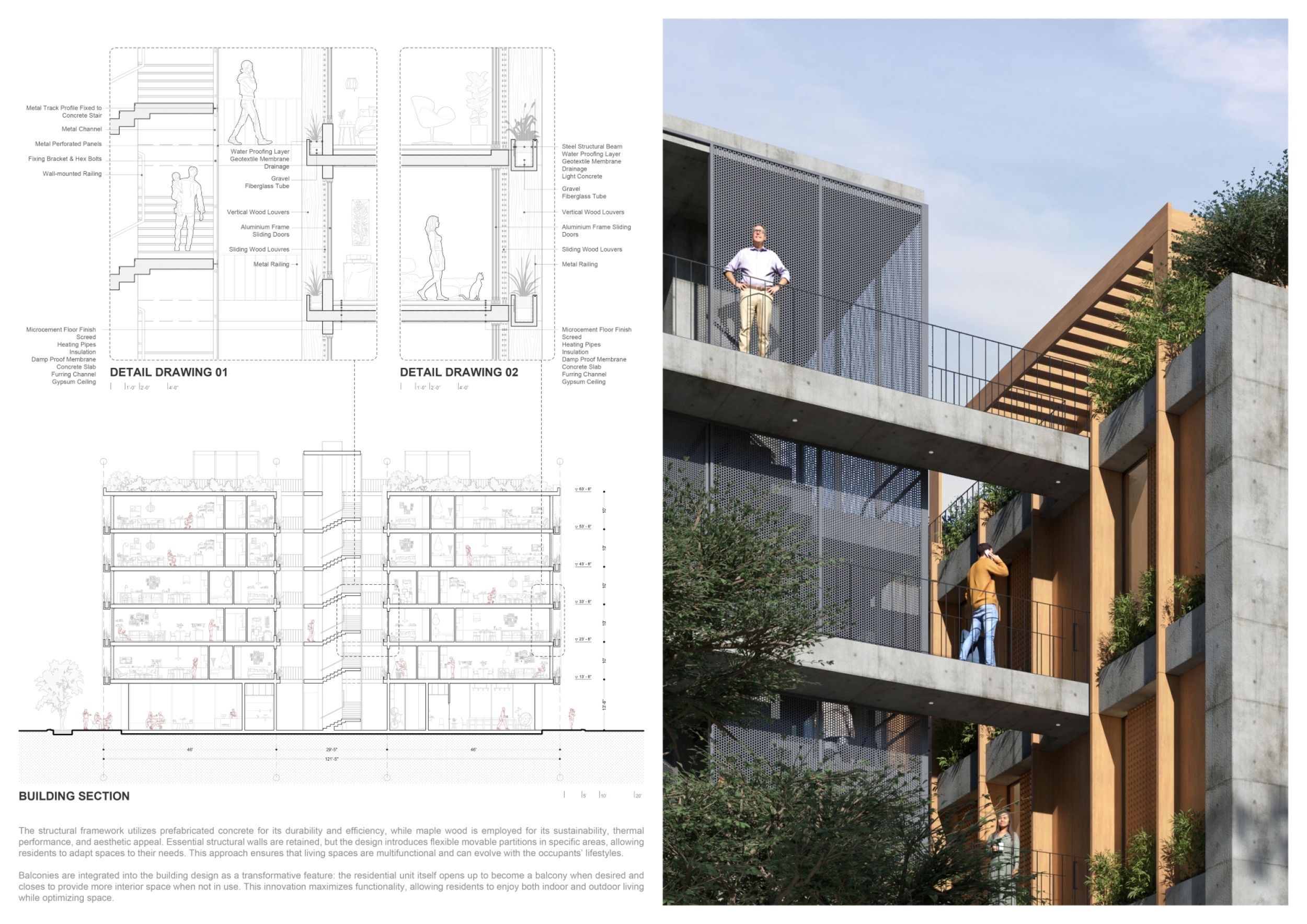 Detached Living is designed to enhance adaptability, sustainability, and urban integration. The building features a modular unit layout, organized around a central atrium that facilitates natural ventilation. The facade consists of movable louvers and sliding glass doors, allowing residents to regulate shading, airflow, and privacy. Prefabricated concrete and maple wood are employed for durability, thermal efficiency, and sustainability.