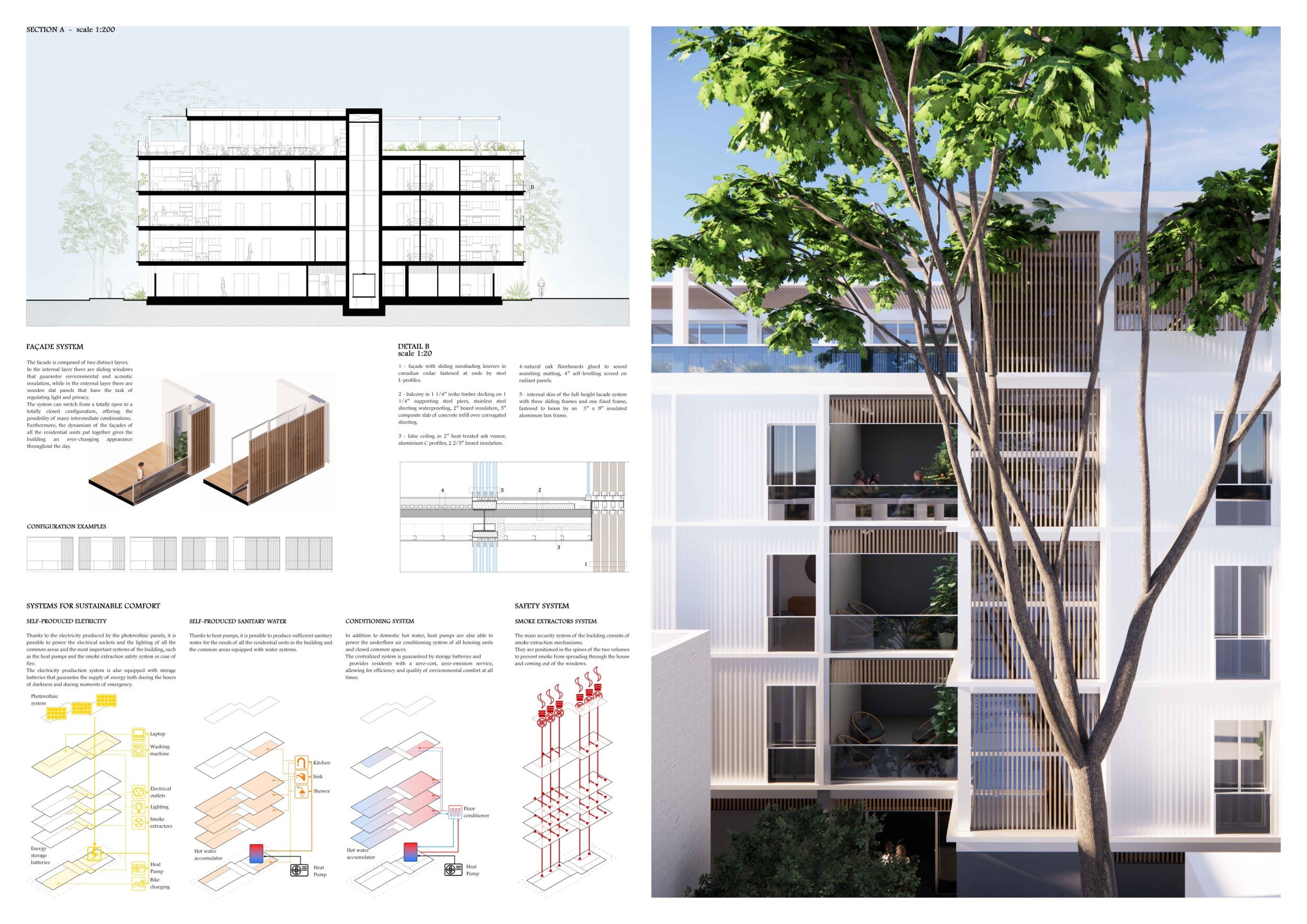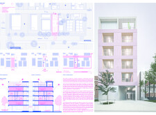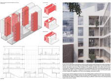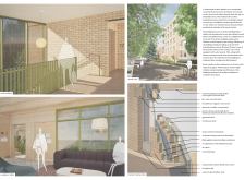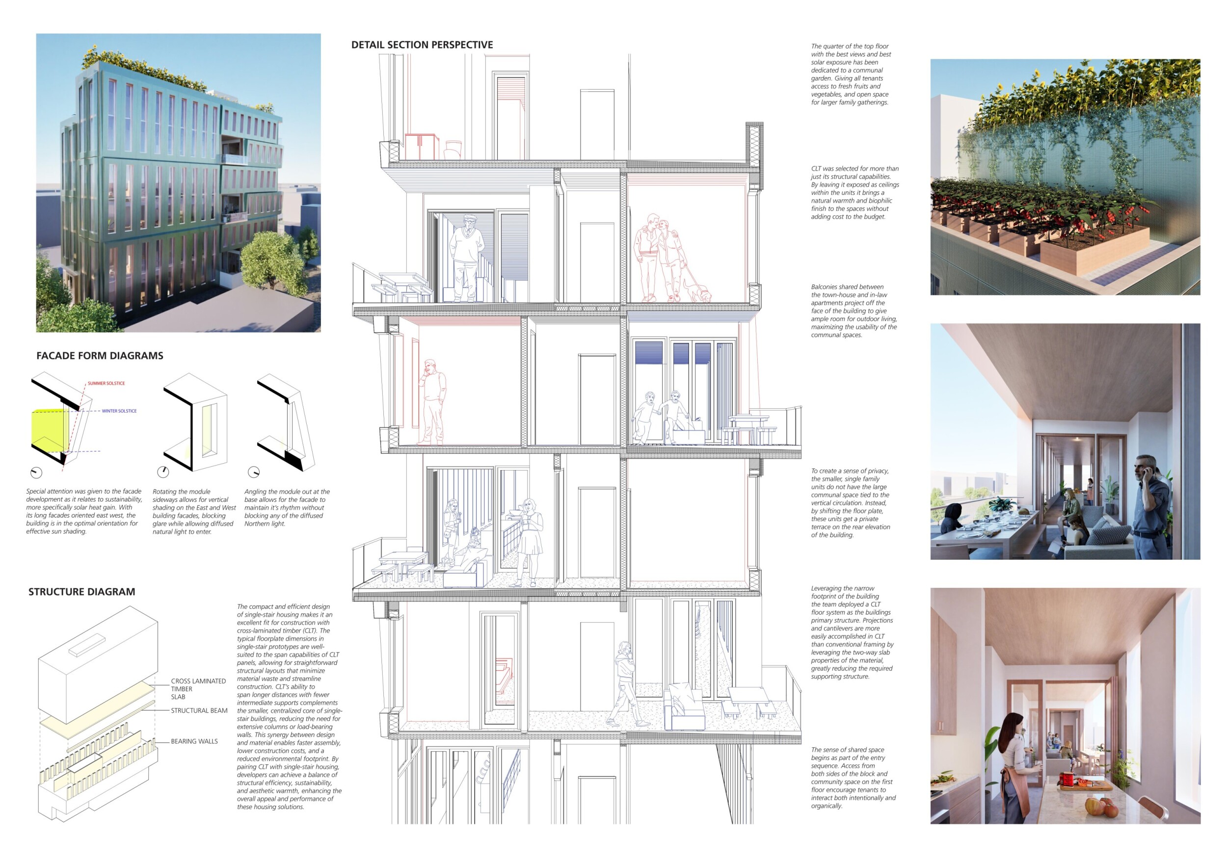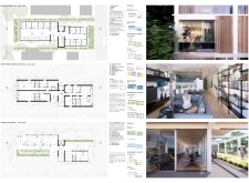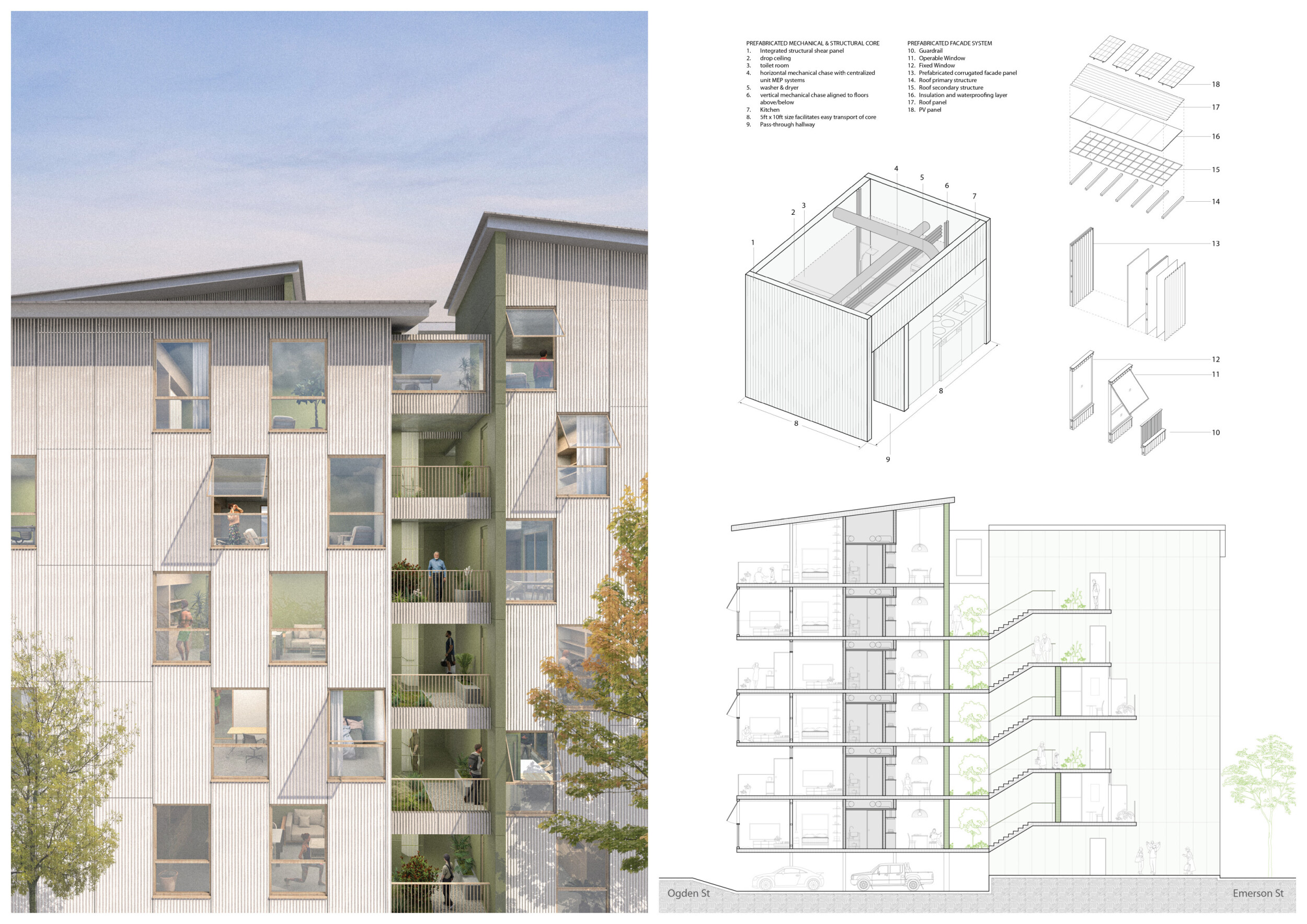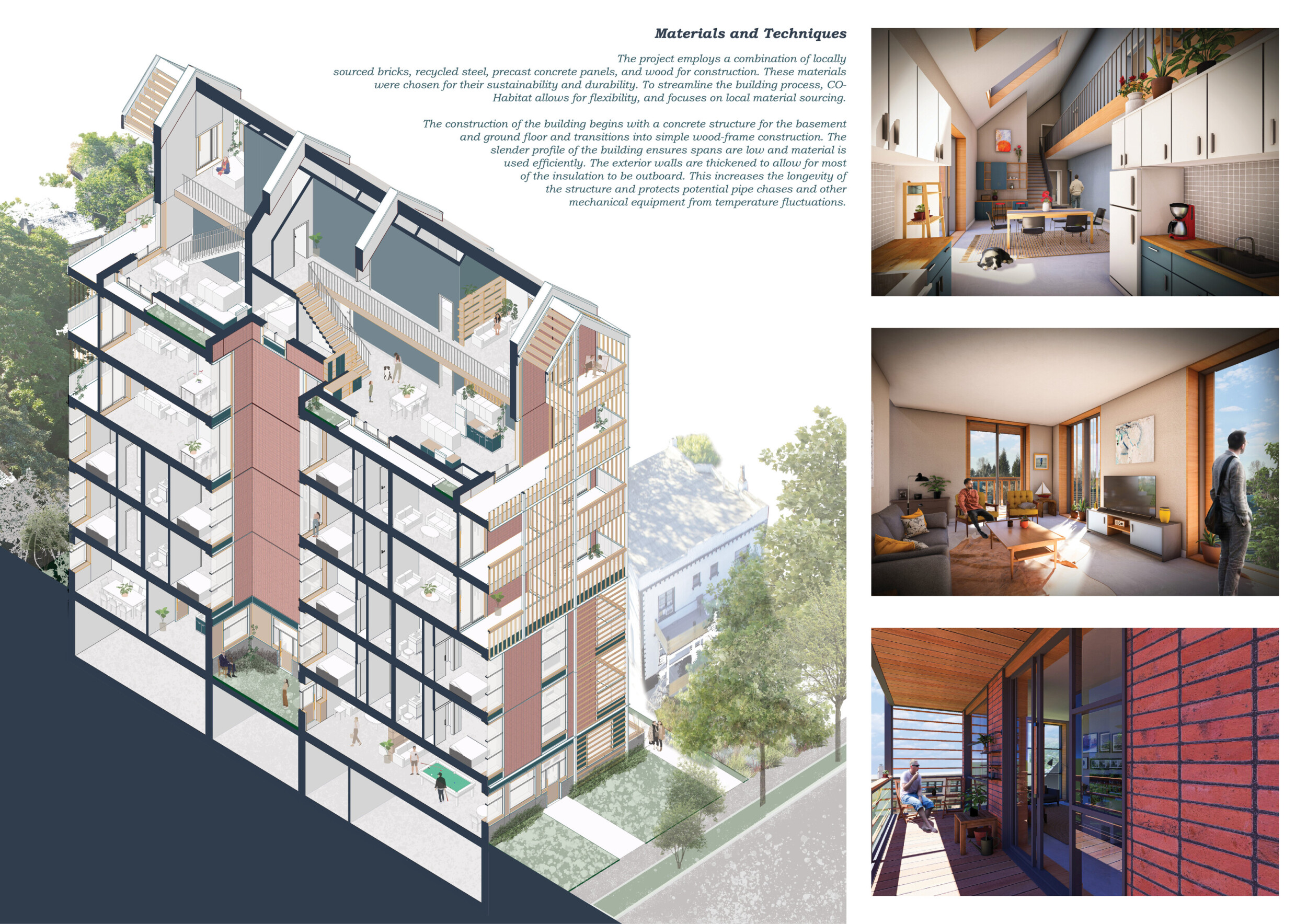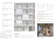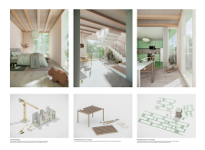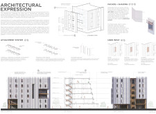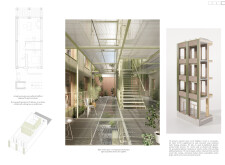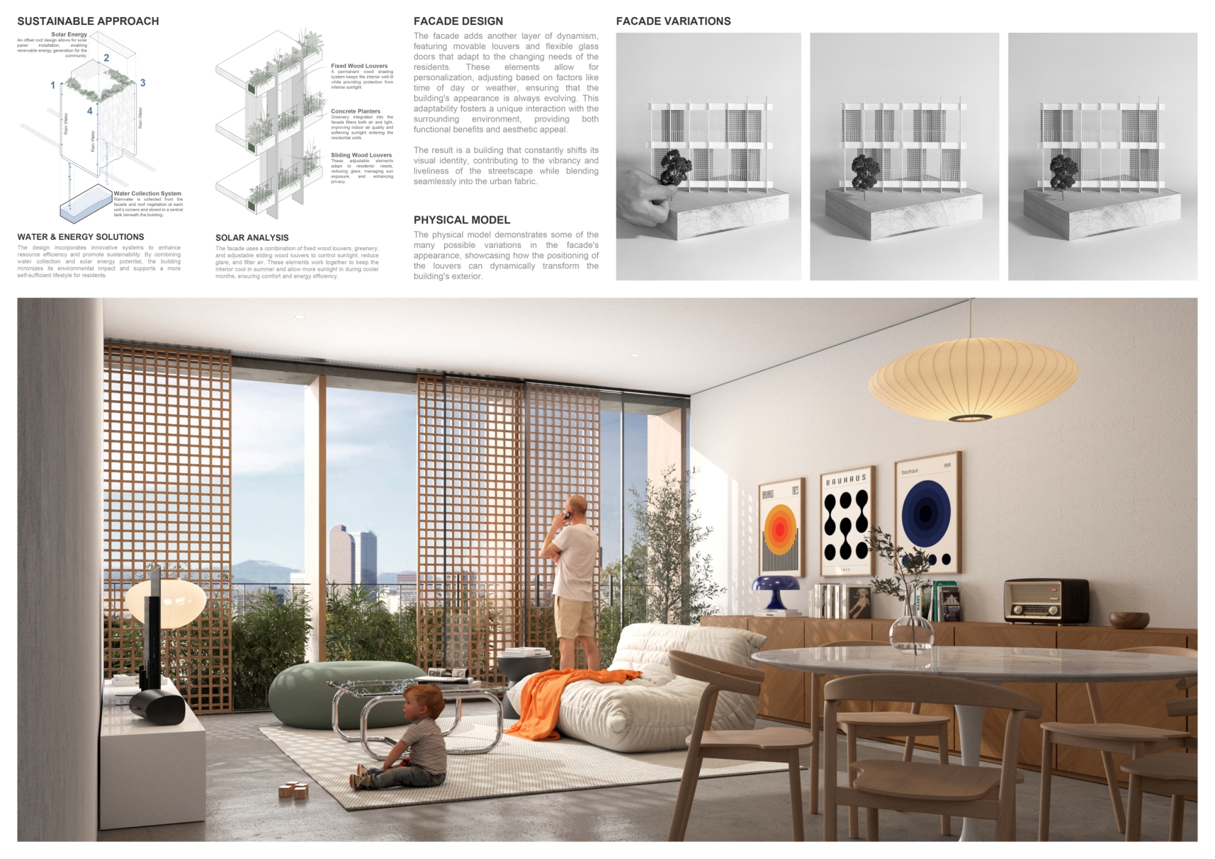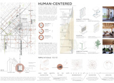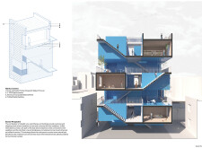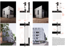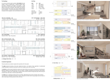 Detached Living is designed to enhance adaptability, sustainability, and urban integration. The building features a modular unit layout, organized around a central atrium that facilitates natural ventilation. The facade consists of movable louvers and sliding glass doors, allowing residents to regulate shading, airflow, and privacy. Prefabricated concrete and maple wood are employed for durability, thermal efficiency, and sustainability.