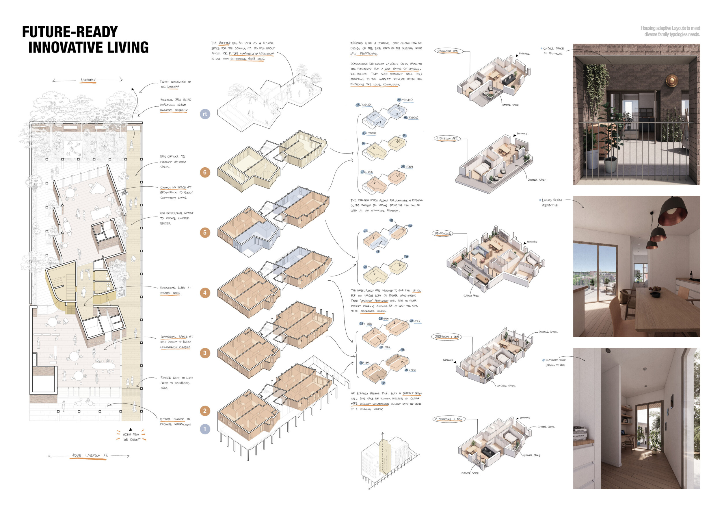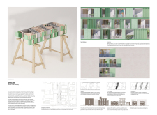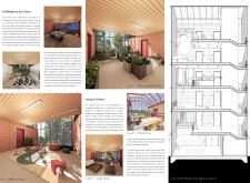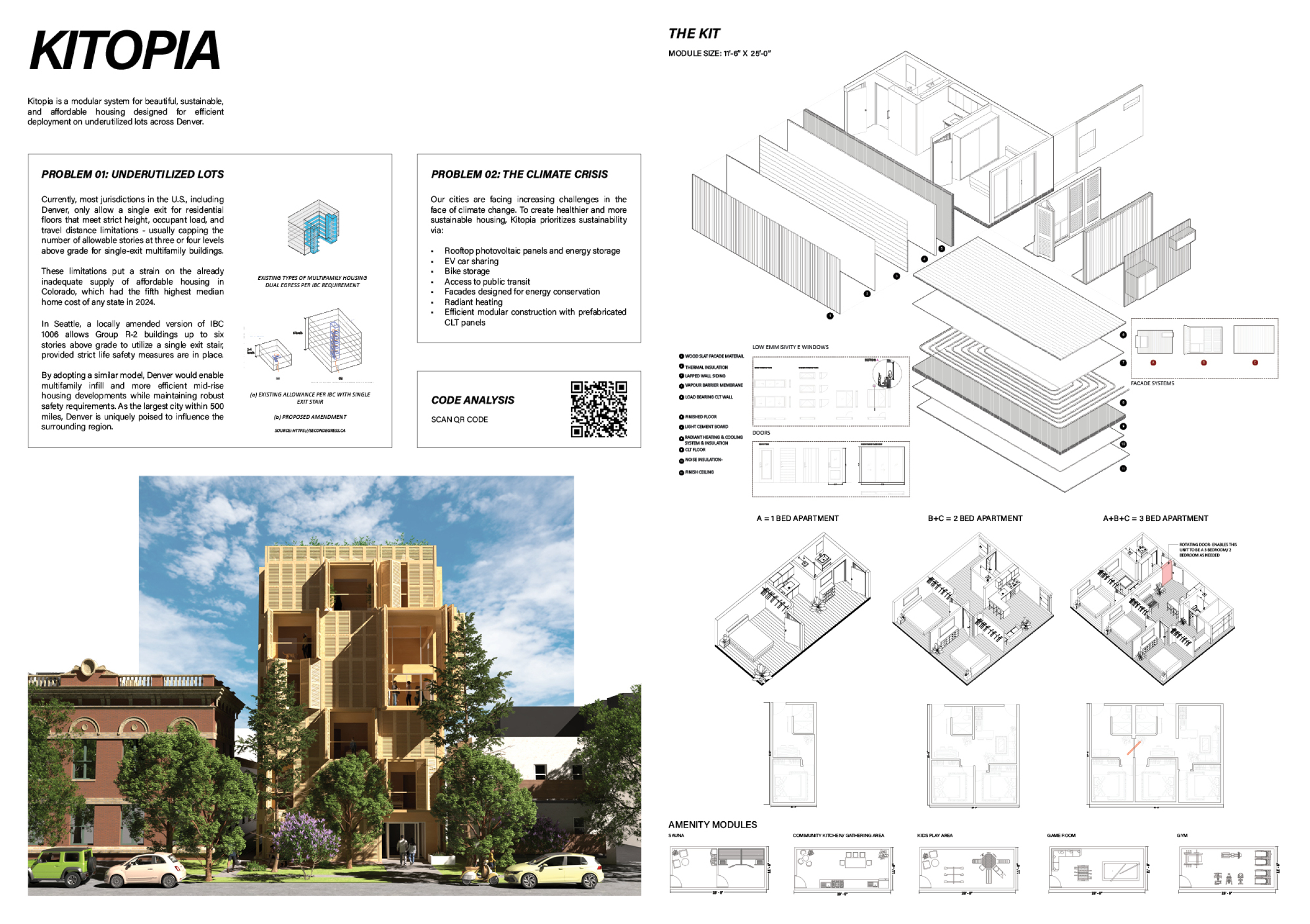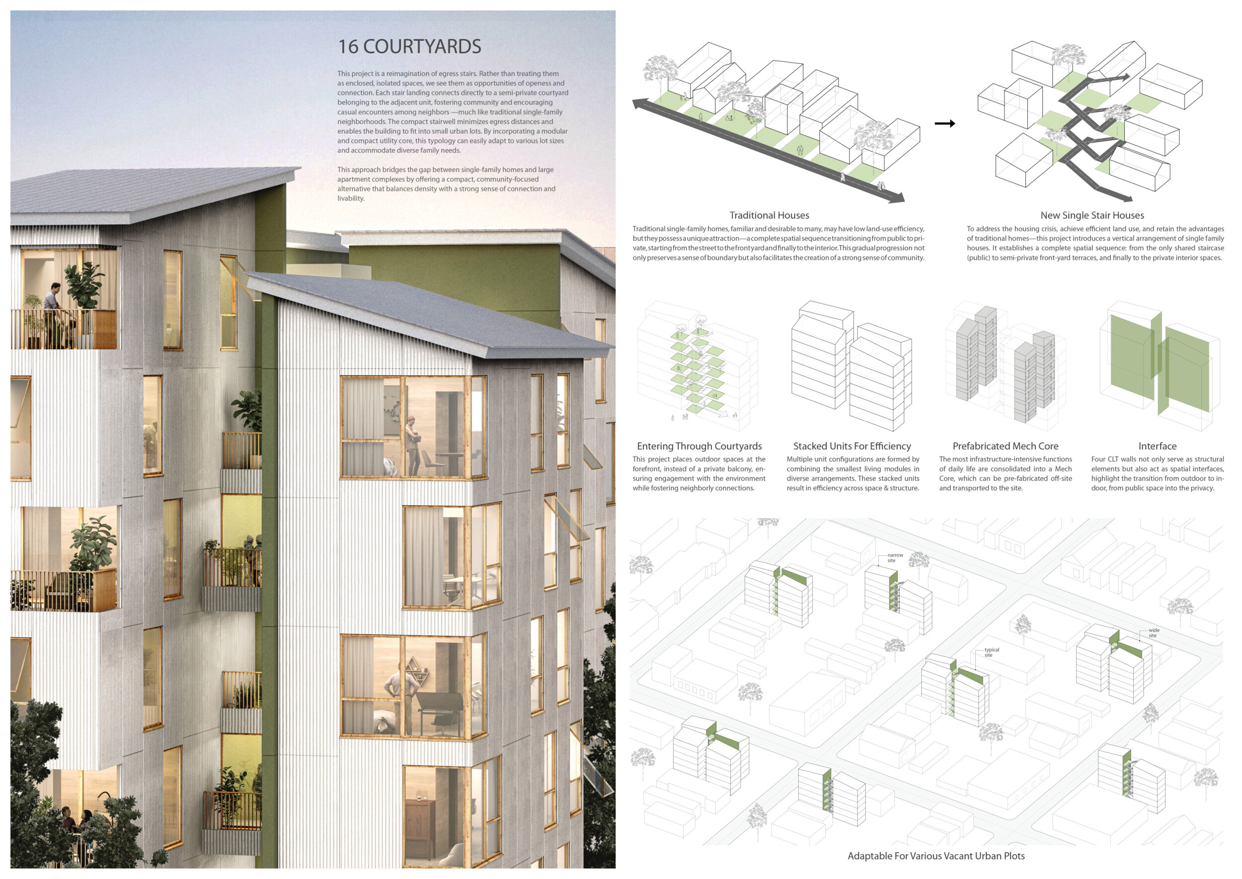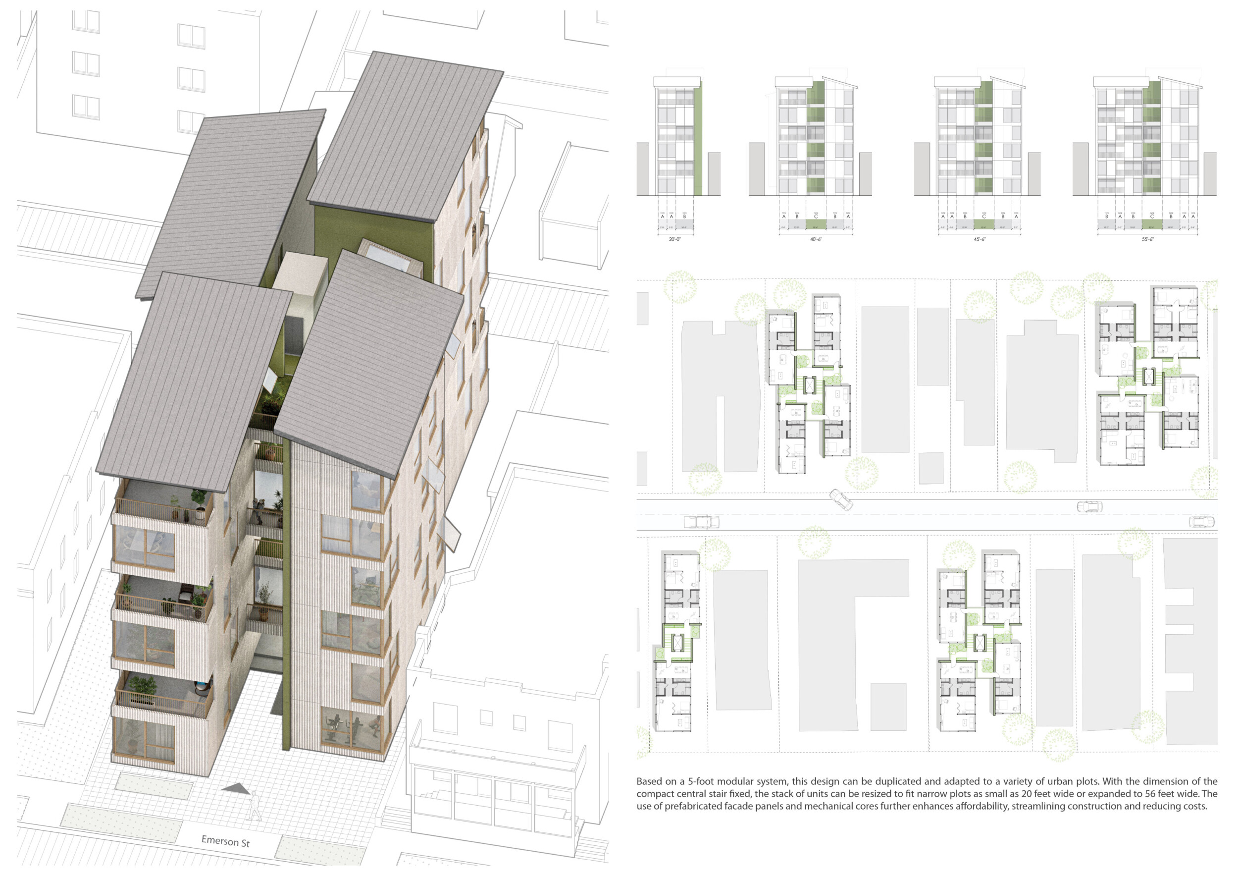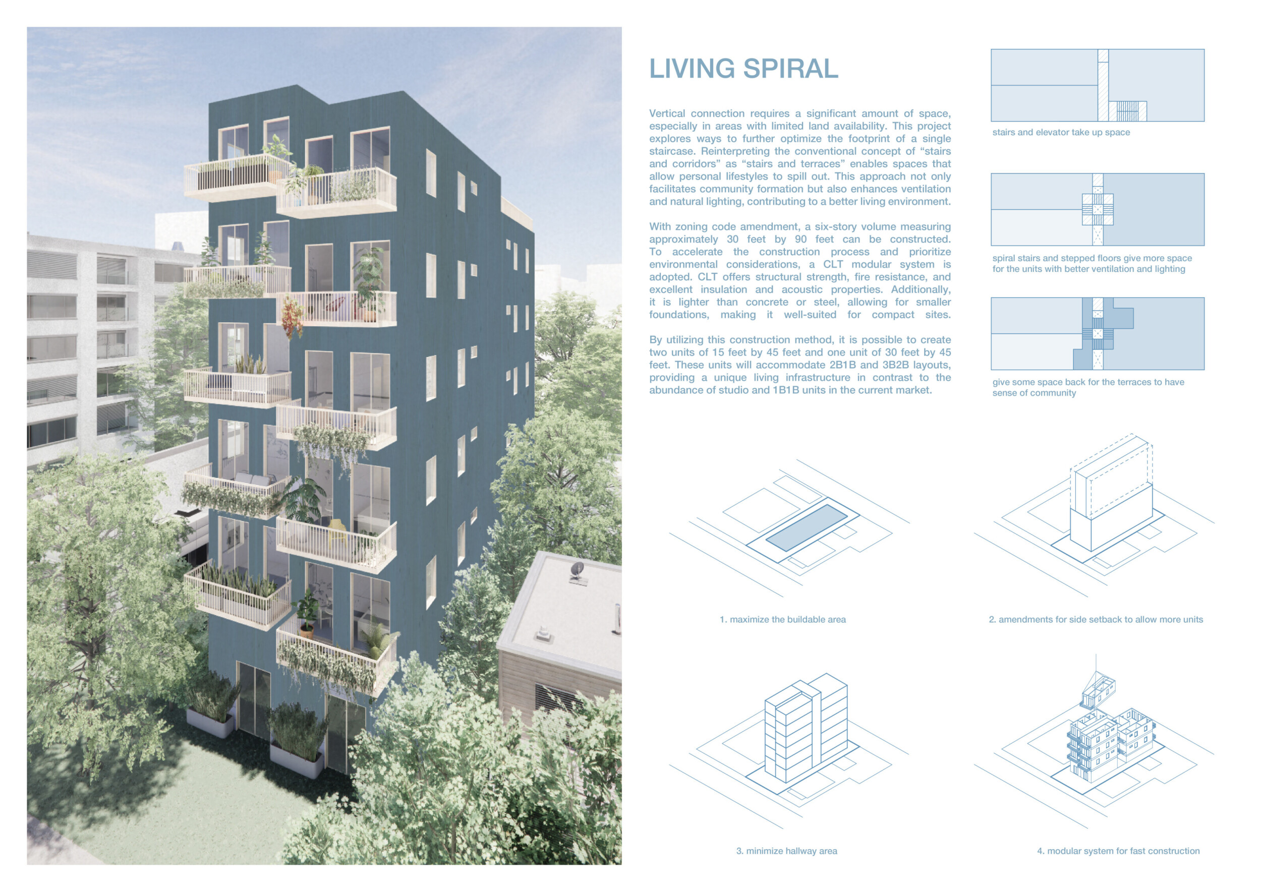 Detached Living is designed to enhance adaptability, sustainability, and urban integration. The building features a modular unit layout, organized around a central atrium that facilitates natural ventilation. The facade consists of movable louvers and sliding glass doors, allowing residents to regulate shading, airflow, and privacy. Prefabricated concrete and maple wood are employed for durability, thermal efficiency, and sustainability.