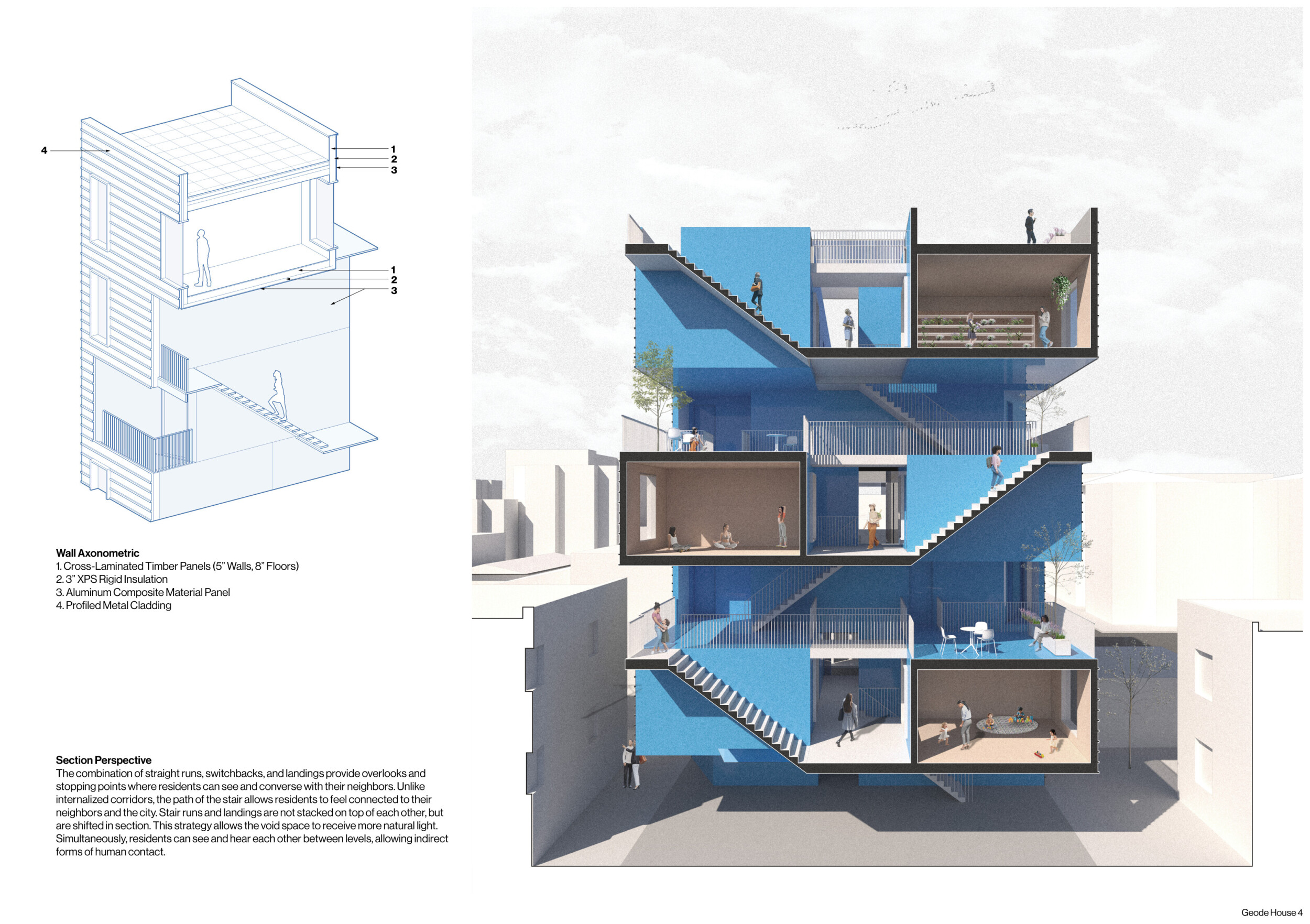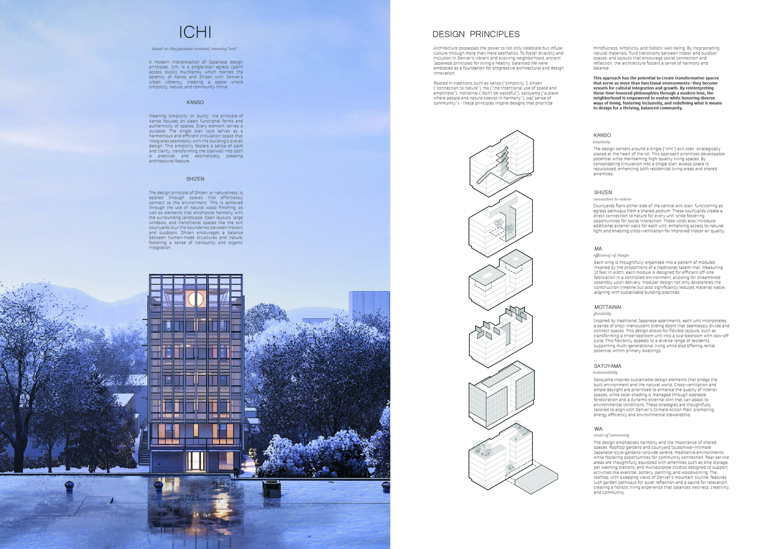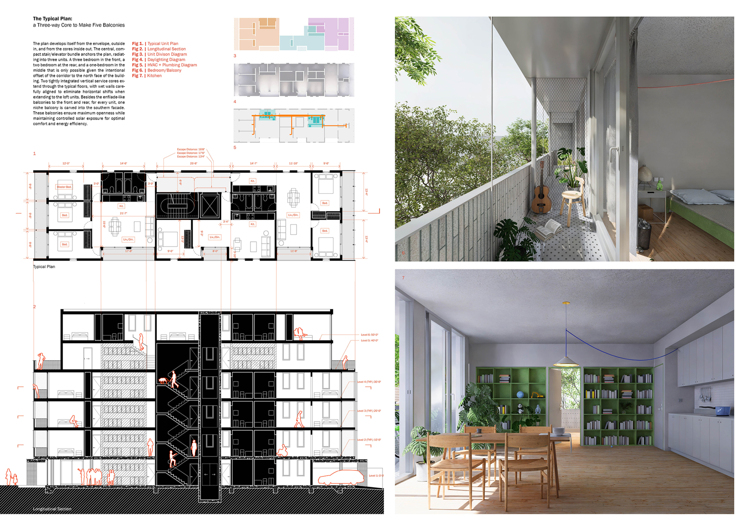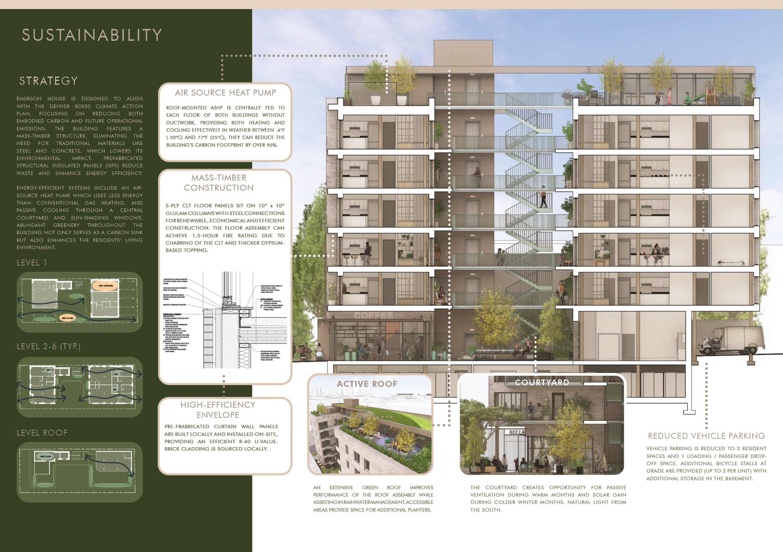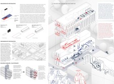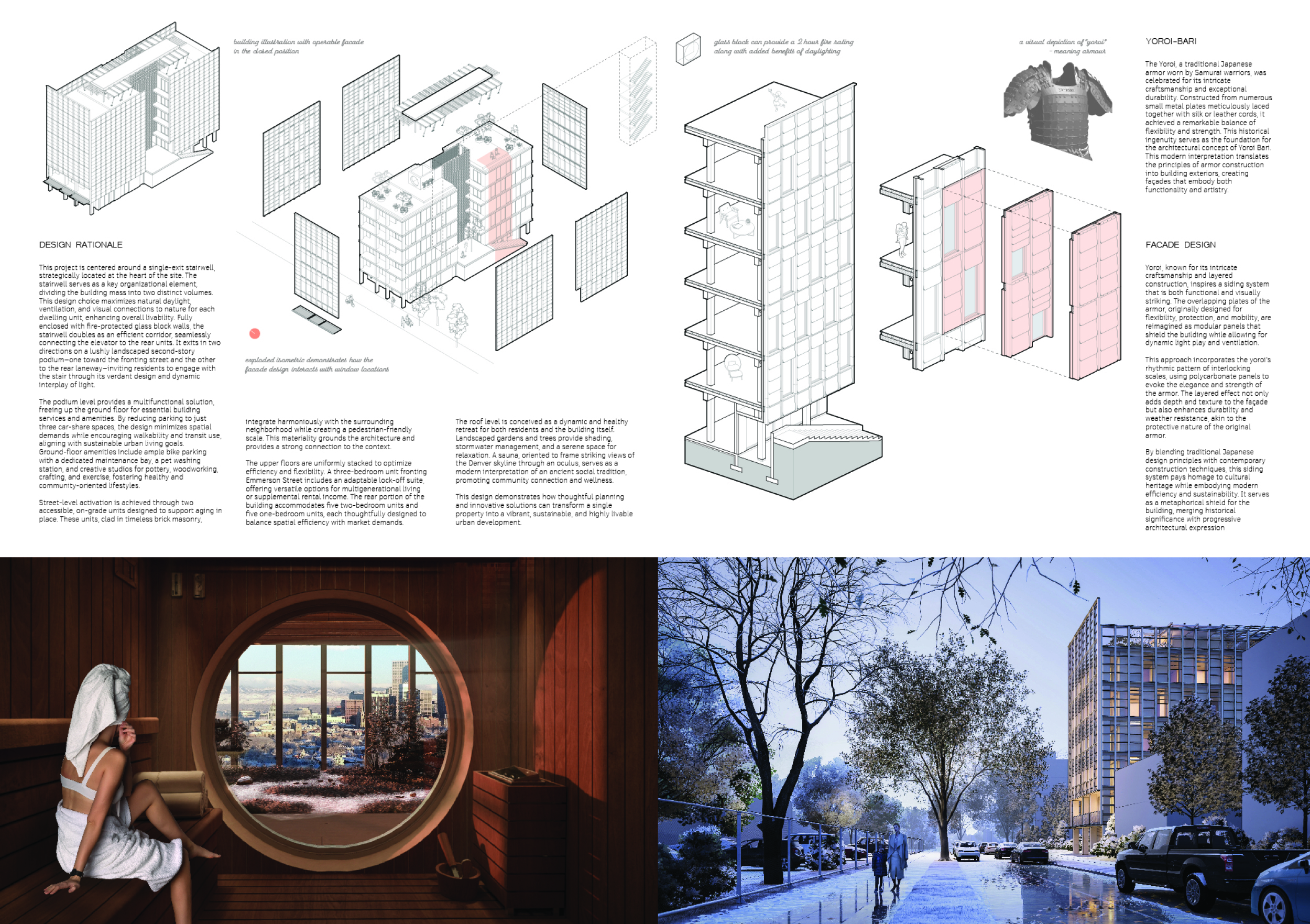 Detached Living is designed to enhance adaptability, sustainability, and urban integration. The building features a modular unit layout, organized around a central atrium that facilitates natural ventilation. The facade consists of movable louvers and sliding glass doors, allowing residents to regulate shading, airflow, and privacy. Prefabricated concrete and maple wood are employed for durability, thermal efficiency, and sustainability.