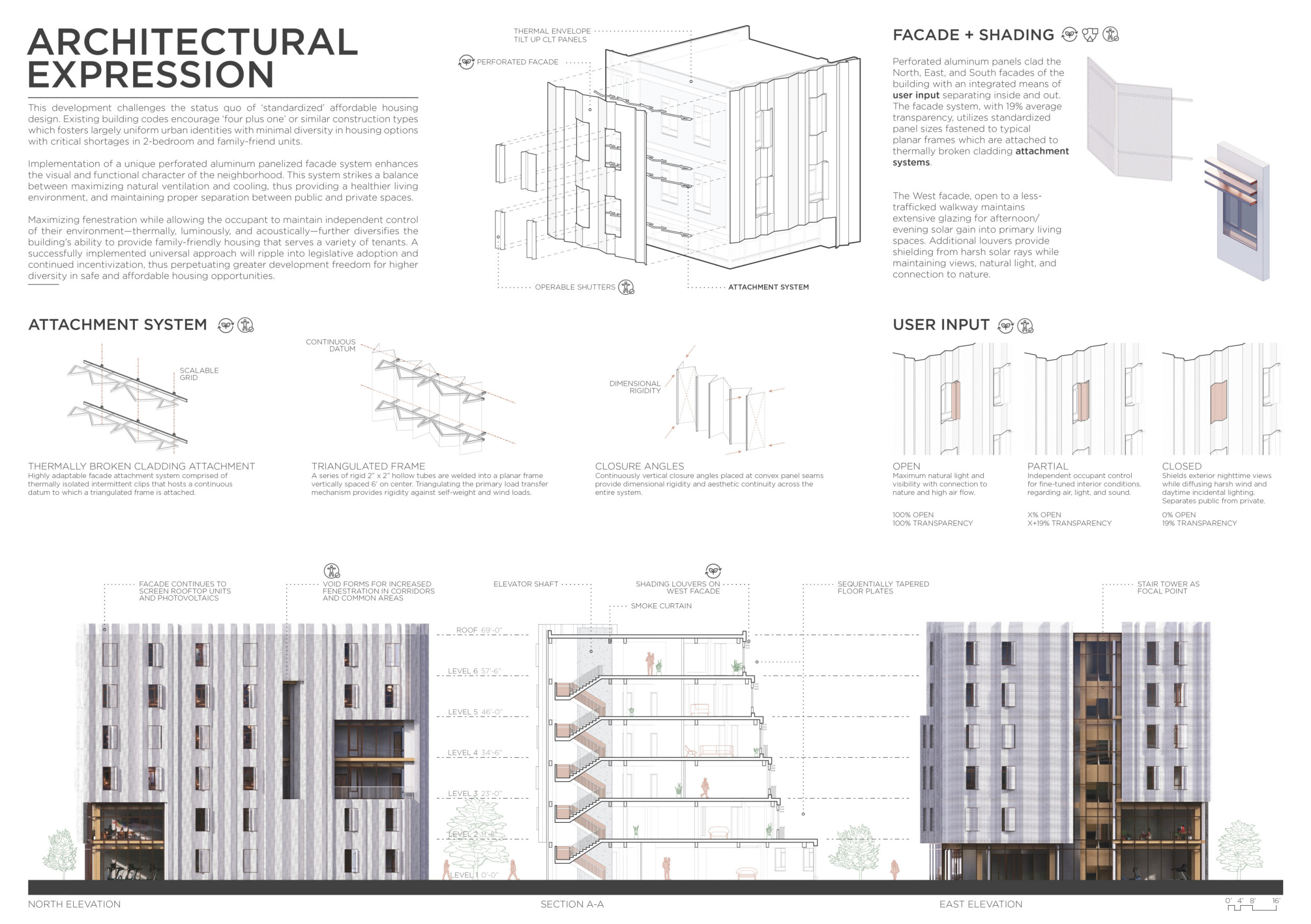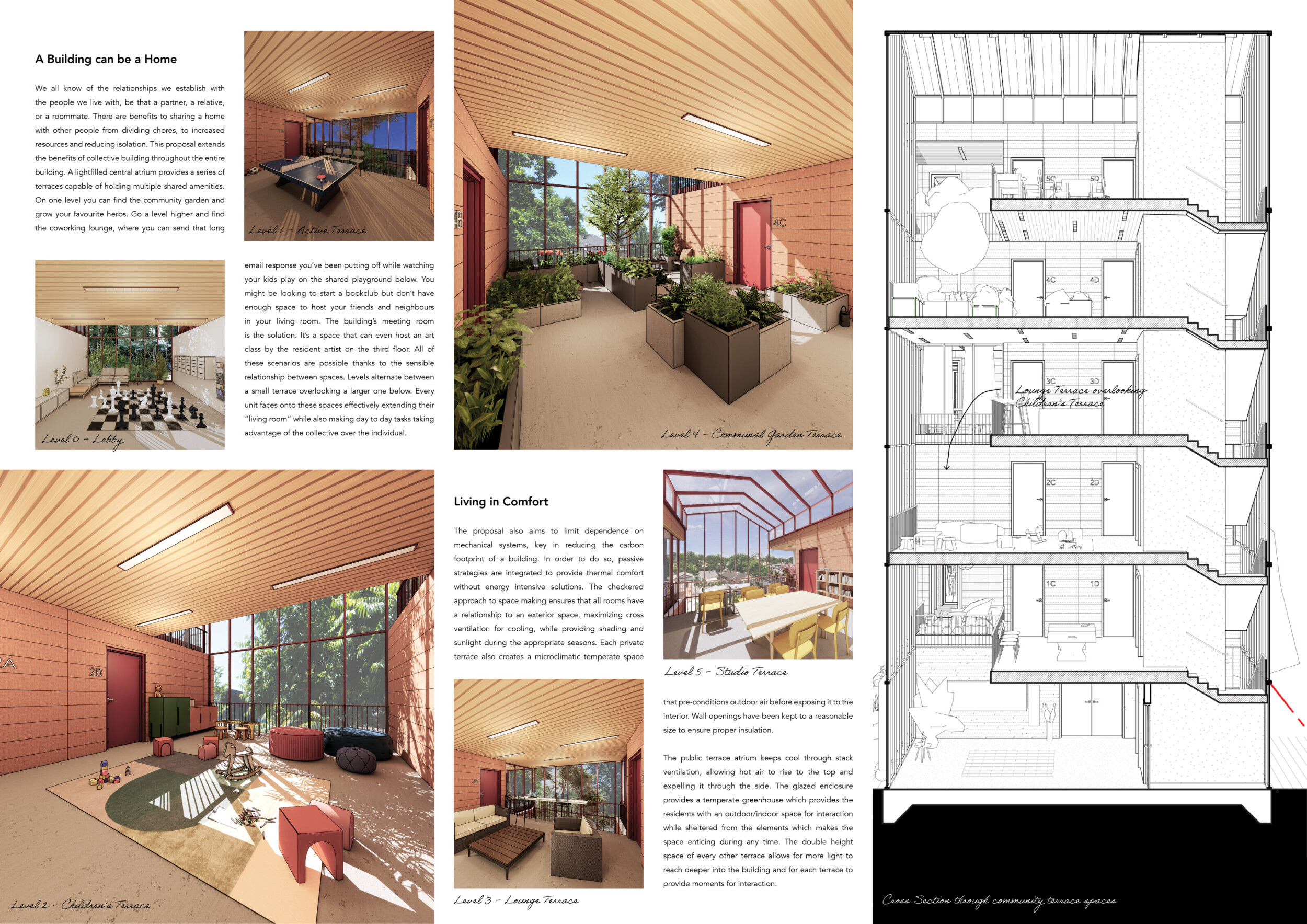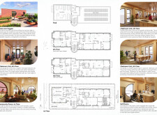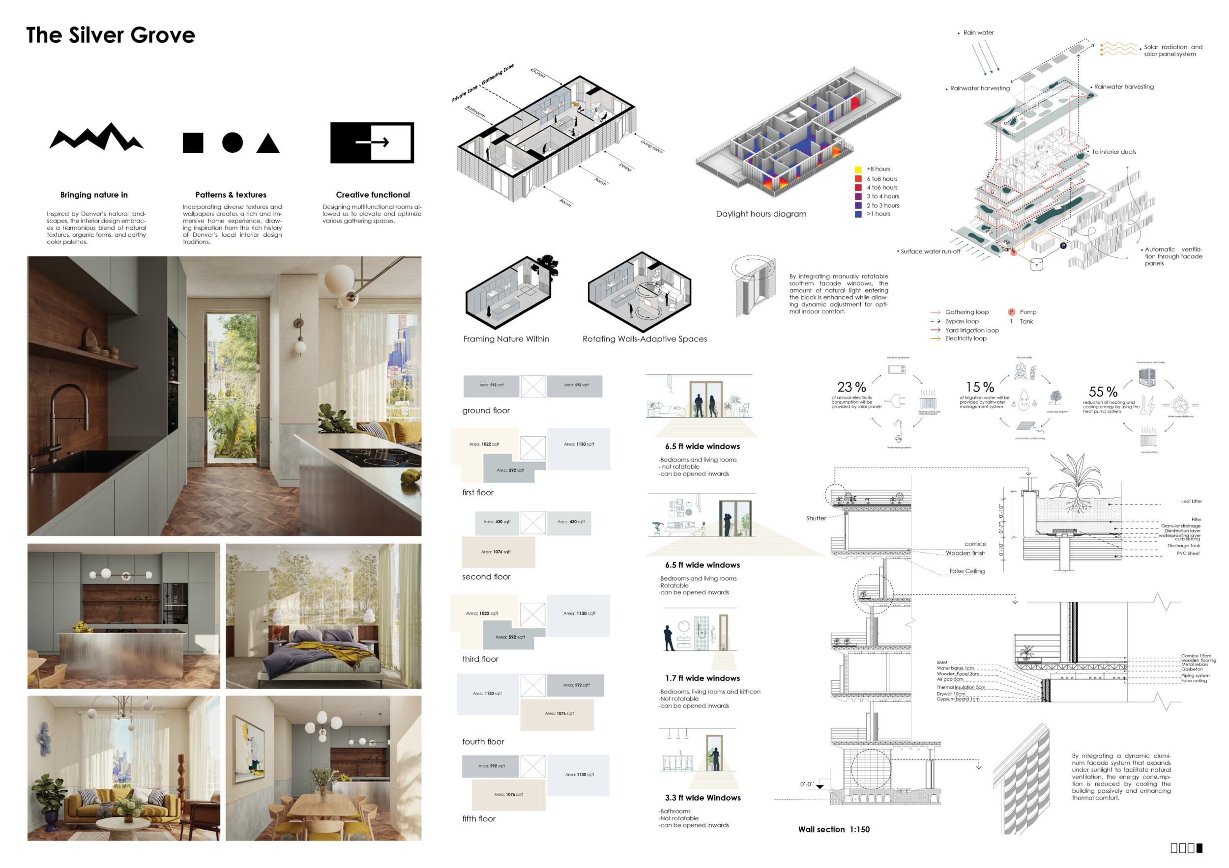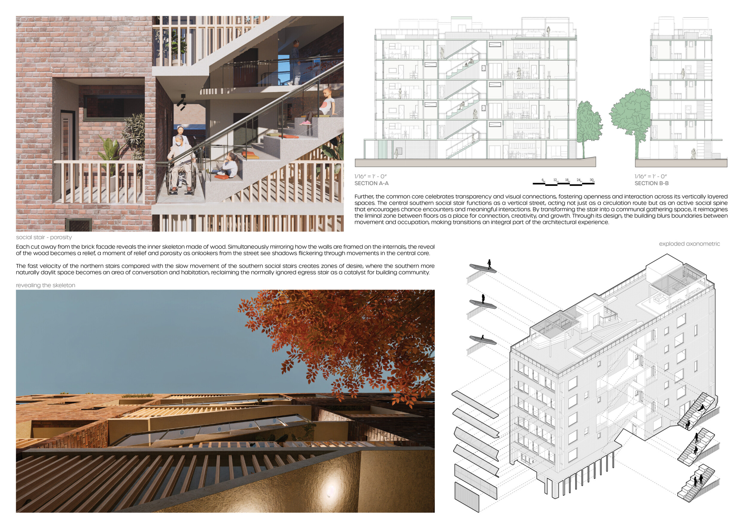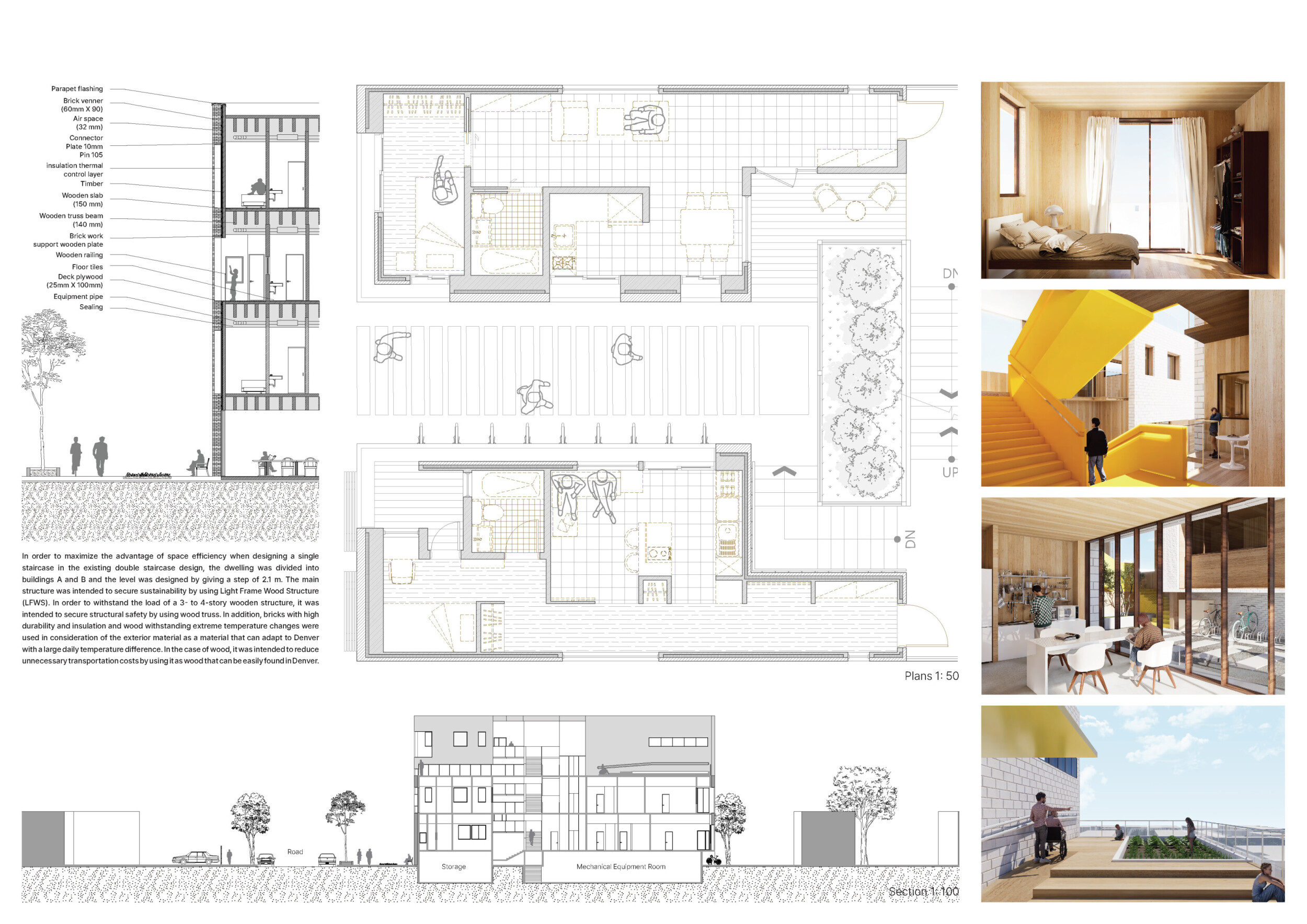 Detached Living is designed to enhance adaptability, sustainability, and urban integration. The building features a modular unit layout, organized around a central atrium that facilitates natural ventilation. The facade consists of movable louvers and sliding glass doors, allowing residents to regulate shading, airflow, and privacy. Prefabricated concrete and maple wood are employed for durability, thermal efficiency, and sustainability.