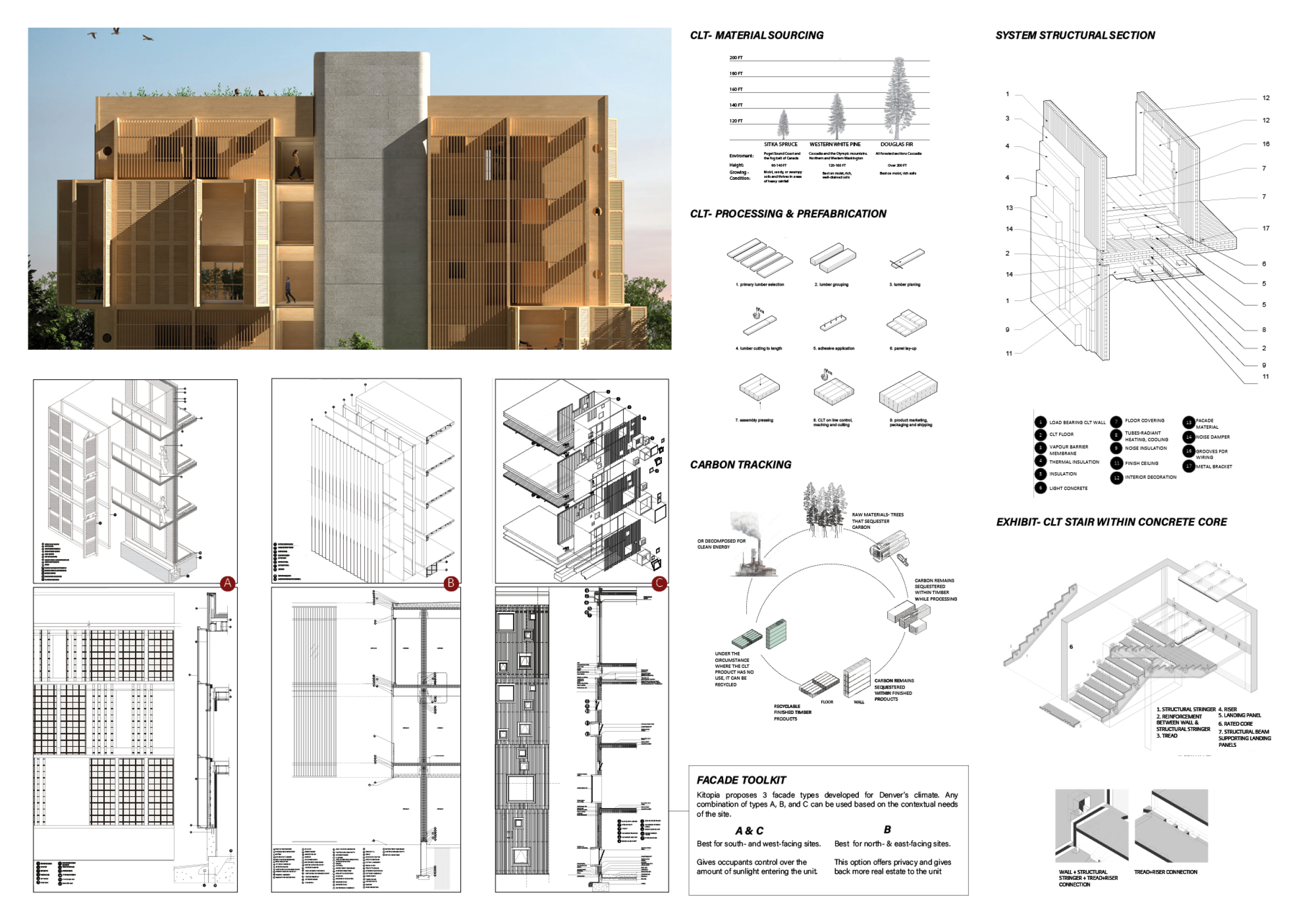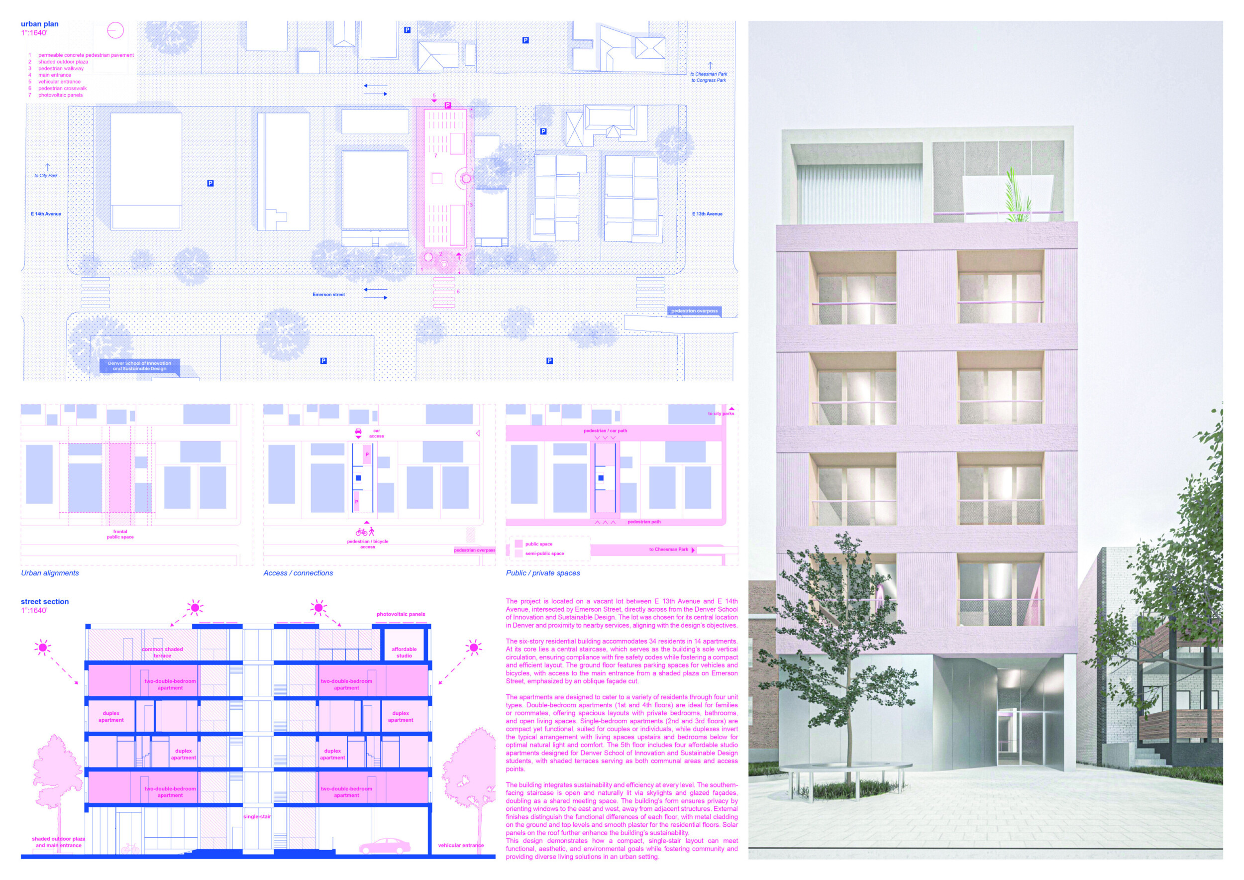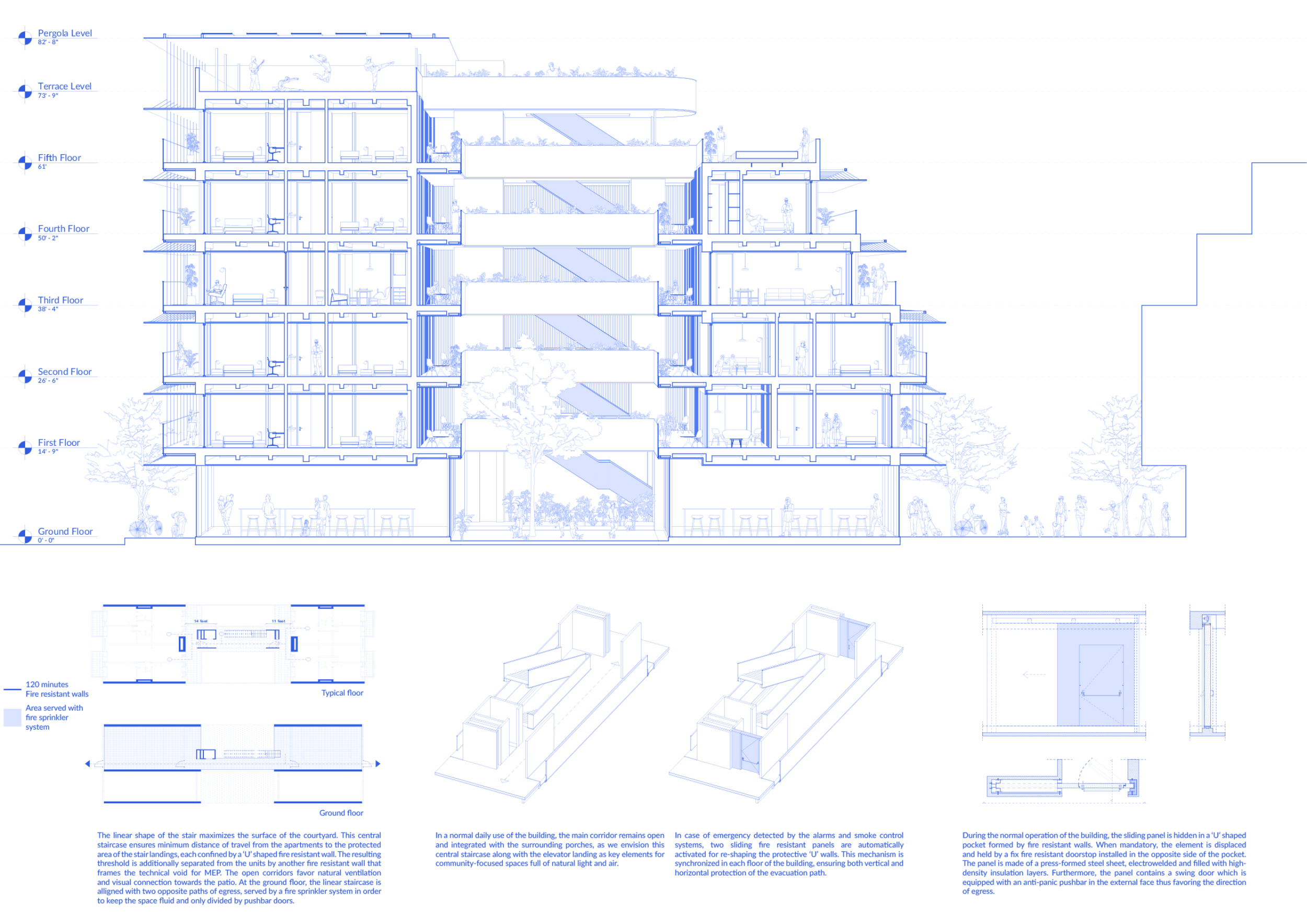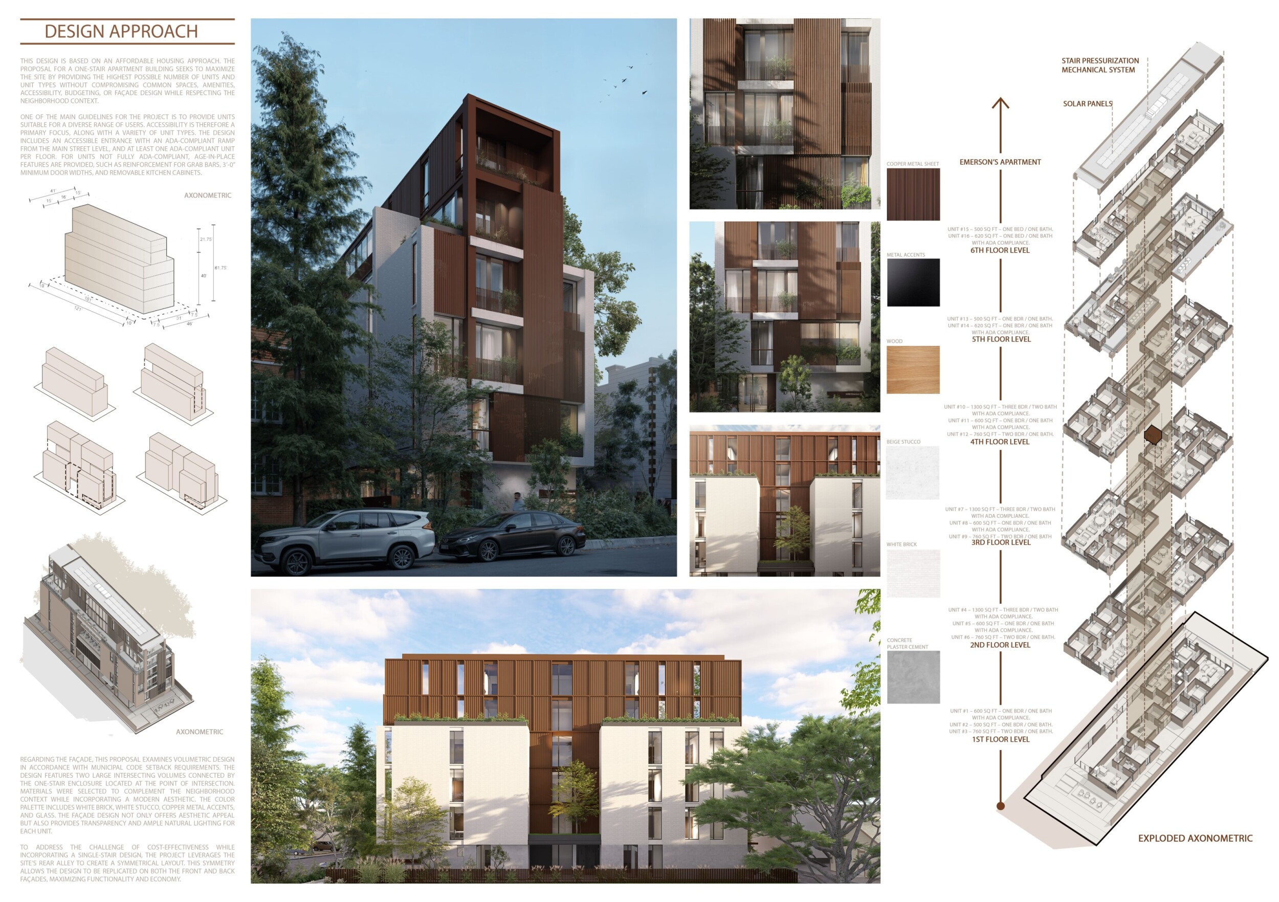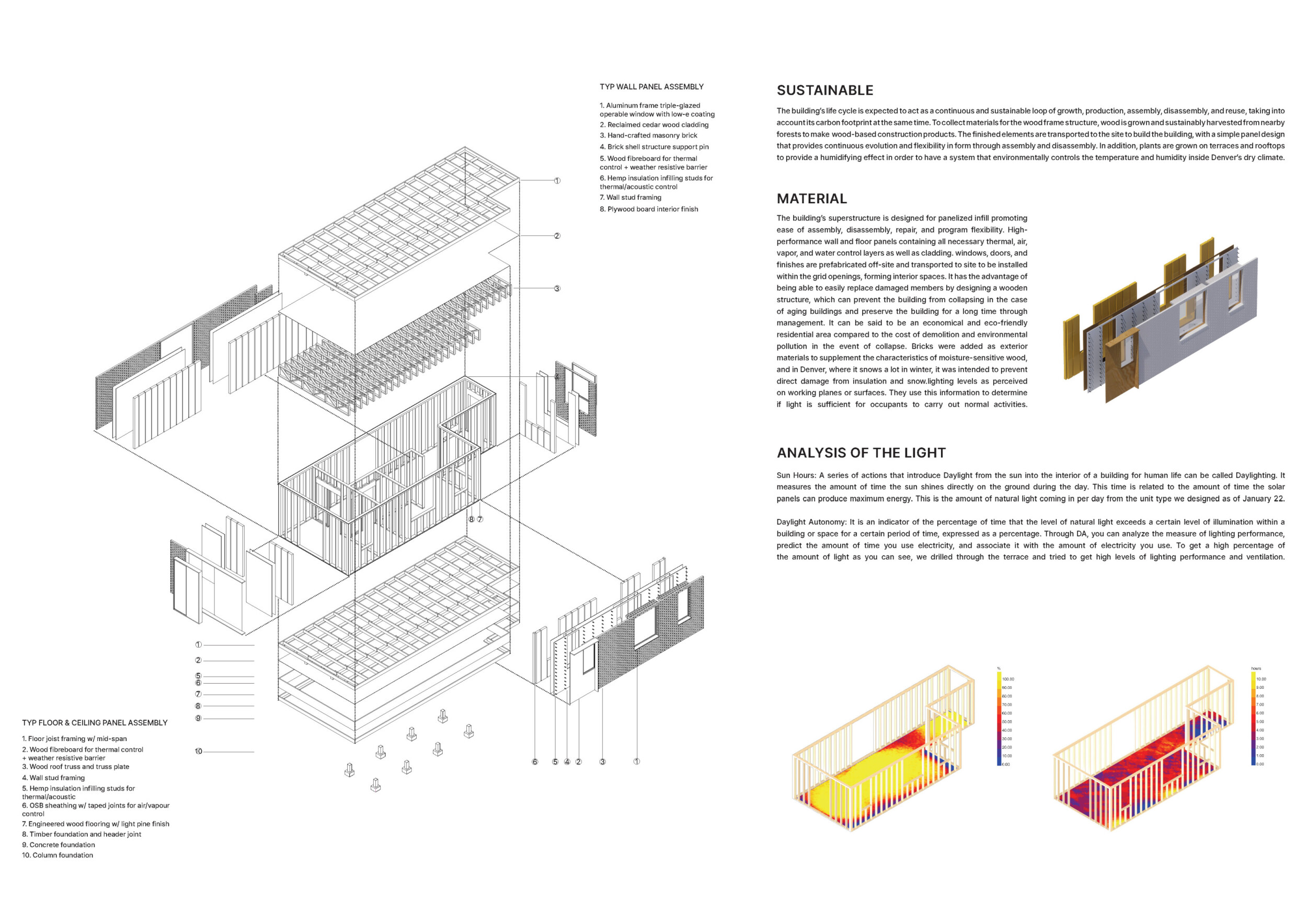 Detached Living is designed to enhance adaptability, sustainability, and urban integration. The building features a modular unit layout, organized around a central atrium that facilitates natural ventilation. The facade consists of movable louvers and sliding glass doors, allowing residents to regulate shading, airflow, and privacy. Prefabricated concrete and maple wood are employed for durability, thermal efficiency, and sustainability.