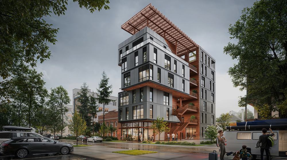 The competition highlighted the potential of Point Access Block (PAB) housing, a widely used urban housing typology that remains underutilized in North America due to regulatory barriers. Participants were challenged to propose mid-rise housing solutions that enhance community interaction, optimize spatial efficiency, and address contemporary housing challenges through climate-conscious design.