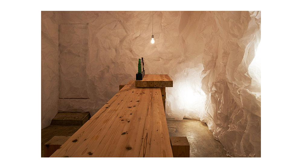 Conceived as part of a summer programme at Abenoma, the gallery occupied a row of converted houses in the city. The designer used rumpled tracing paper to create the crinkly surfaces, forming a textured, rock-like appearance across the angular walls and ceiling.