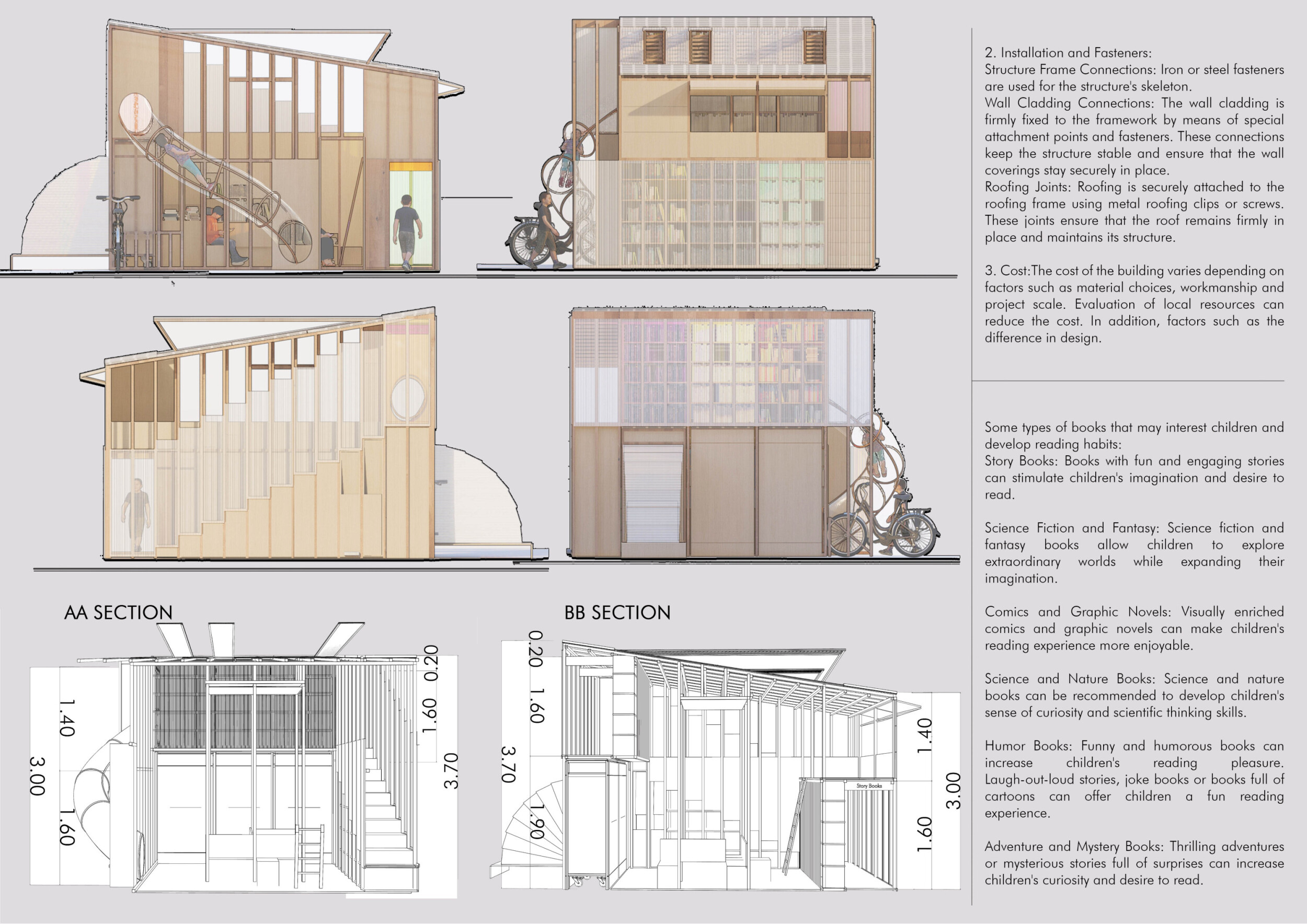 The project is simple in its design and layout. While its mix of sophisticated, colorful drawings and sketches is to be commended, the presentation would benefit from a more consistent layout that clearly guides a reader through each sheet. It would also benefit from a reduction of its long-winded text which jurors may only read after having decided the project is interesting enough to examine in detail.
