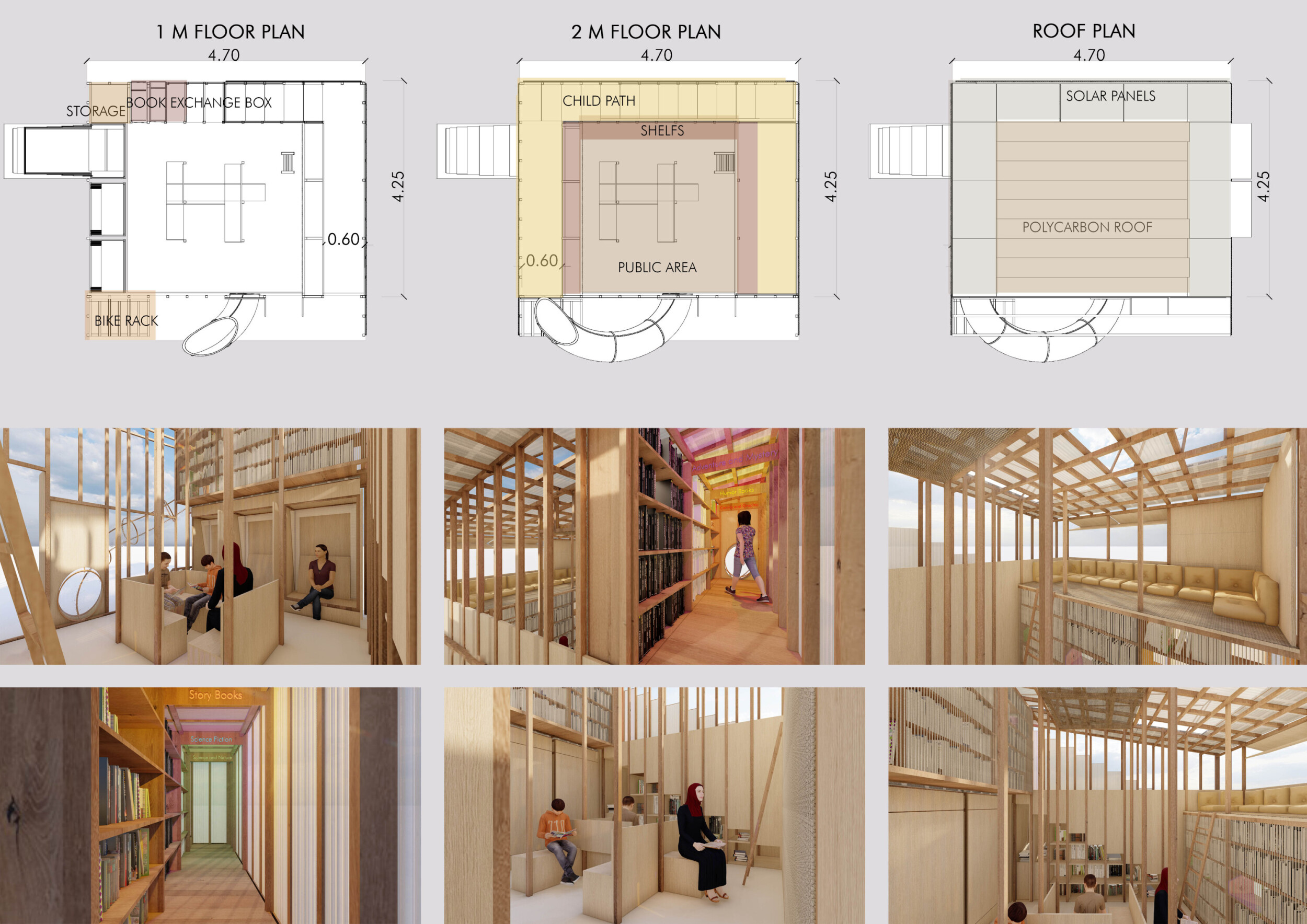 Attract, Explore, Read is a proposition for a structure that guides a visitor across scales that are both private and public in nature. A large roof acts as a social canopy and casts a net to define a public space. It is designed in a way that allows it to take the shape of its site. At its center, an integrated bookshelf system and bike storage zone offers a more intimate space enclosed by a screen for visual connectivity.