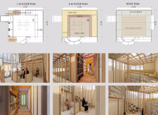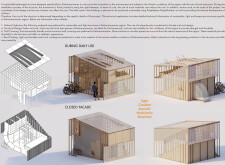 The presentation makes excellent use of limited materiality - in this case, wood - which stands out against the otherwise white field of the sheets. The visuals are outstanding and successfully capture a reader's attention for their uniqueness. They also successfully explain the project’s capacity to take the form of many sites and urban situations. But the layout is underdeveloped and so varied that it appears as if it may have been completed by several different authors.