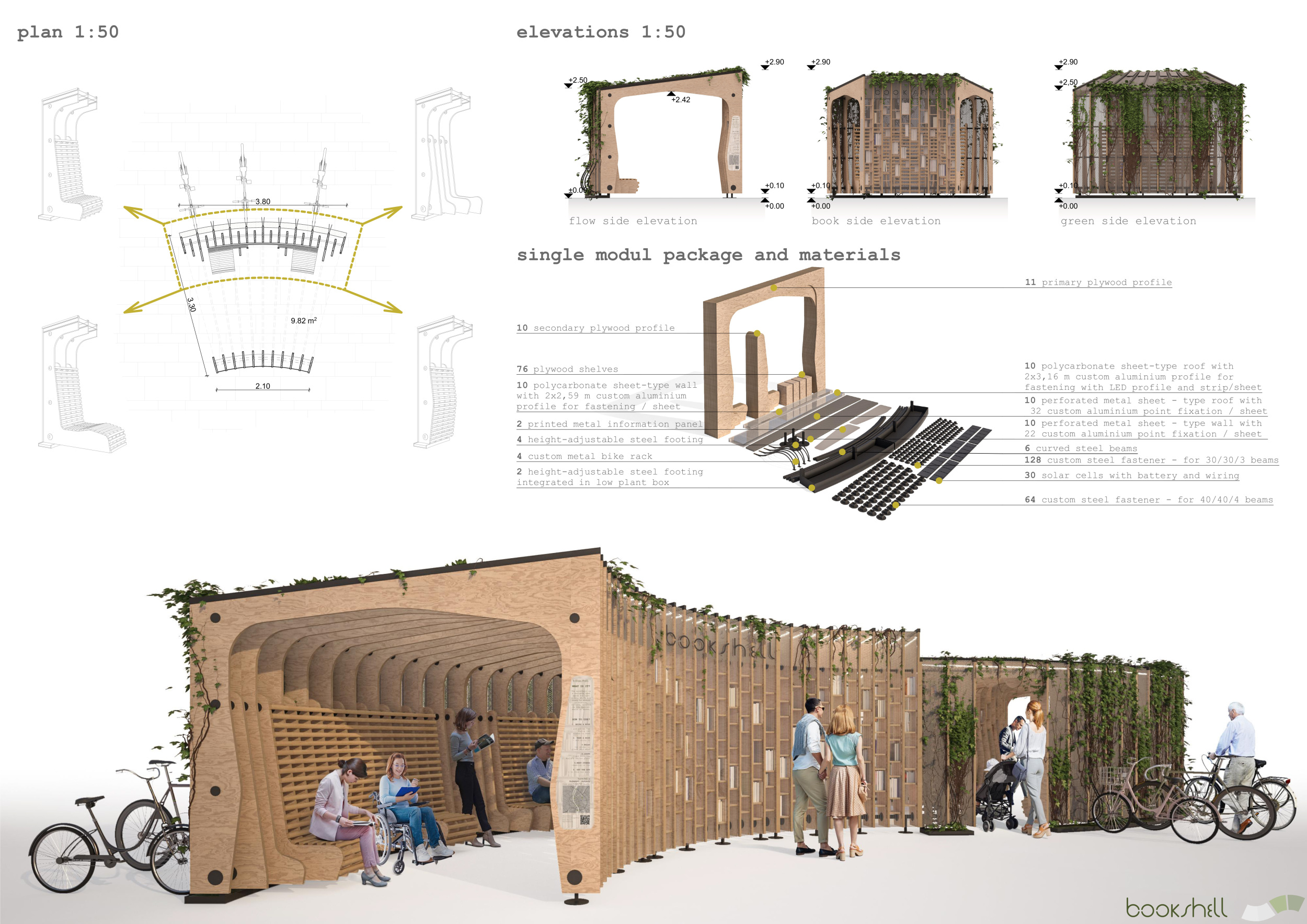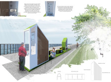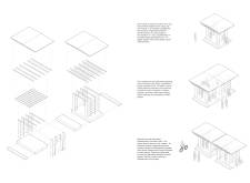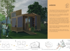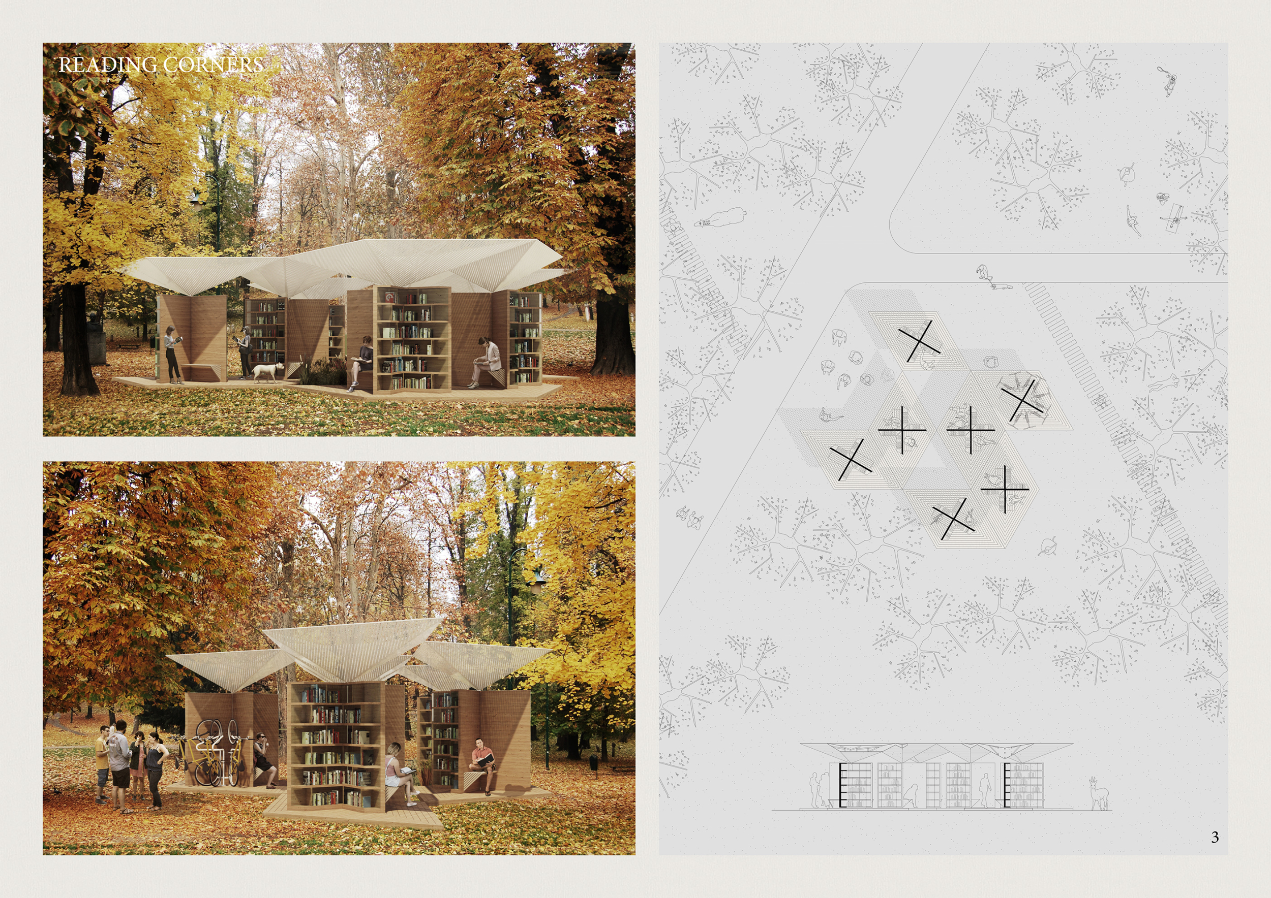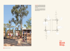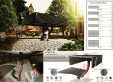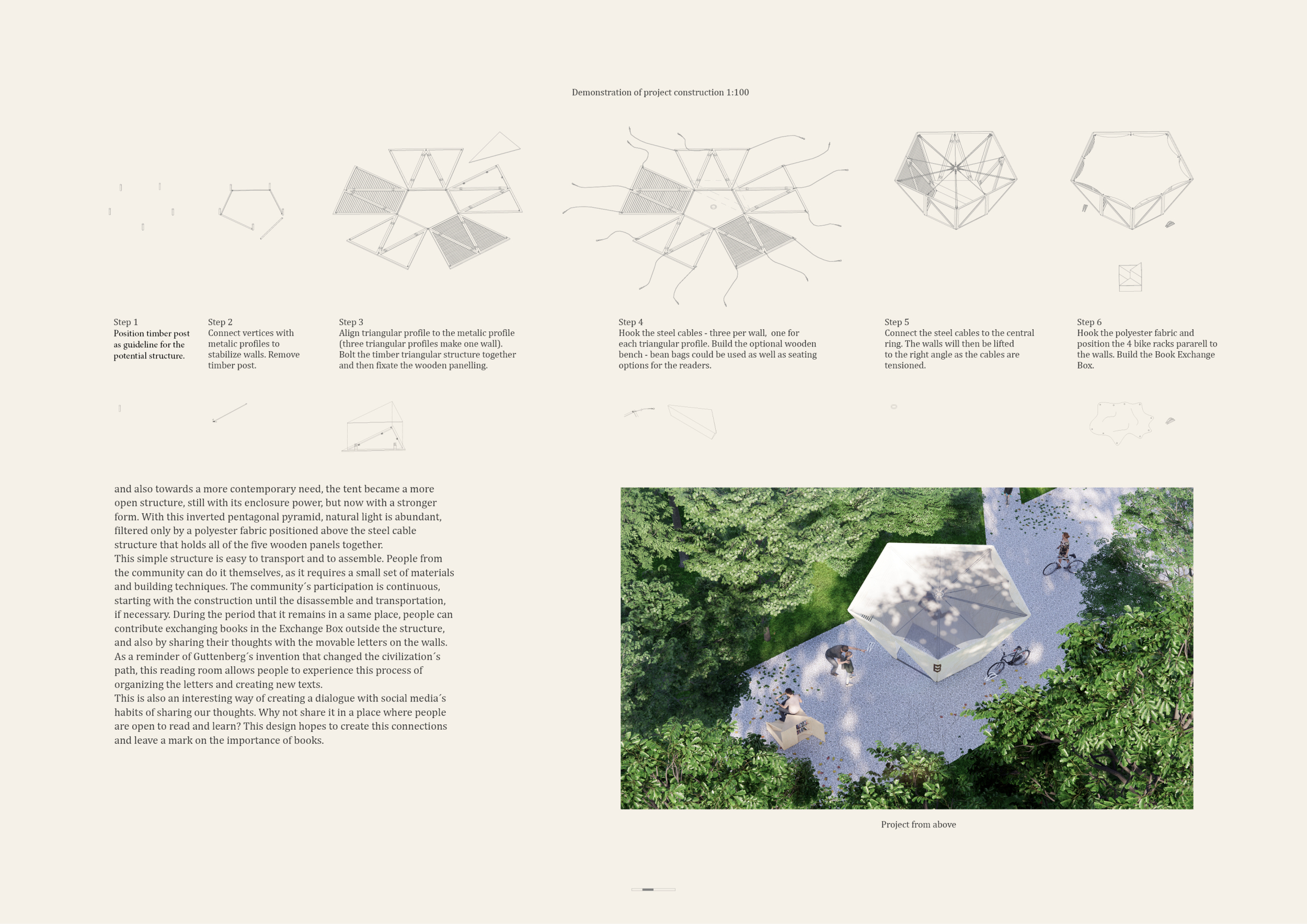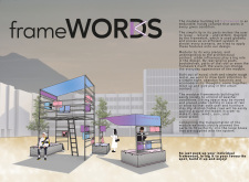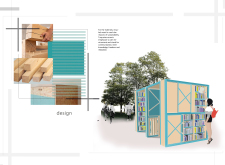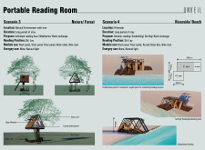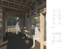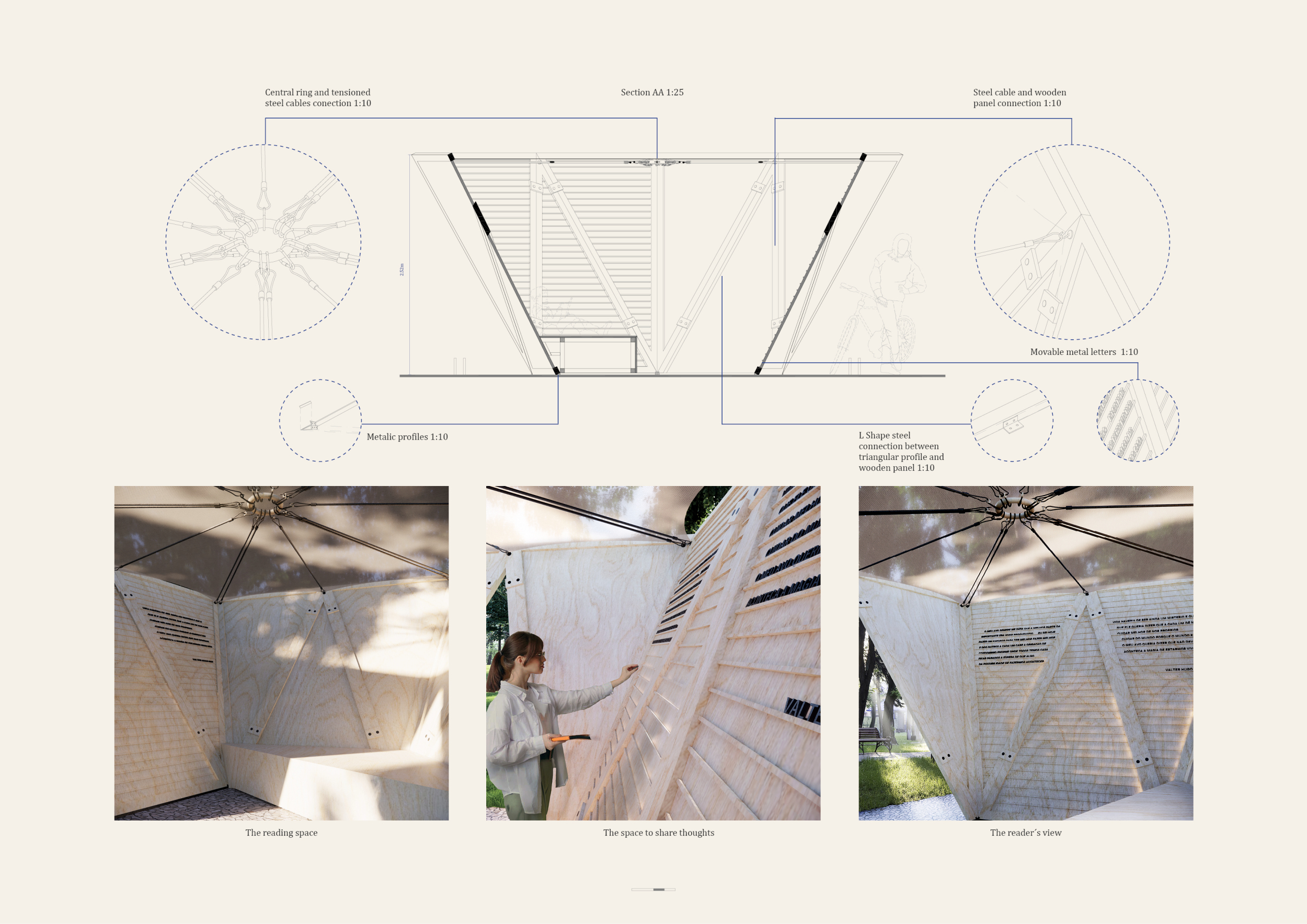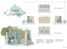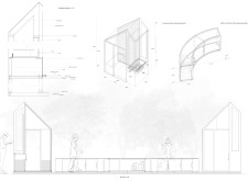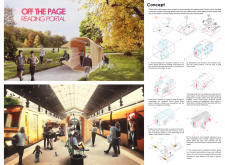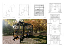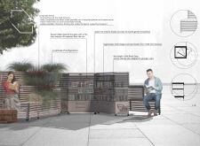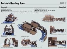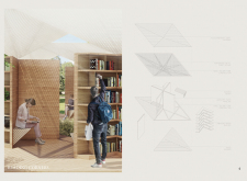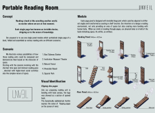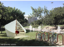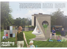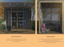 'The Reading Corner' is a modular tent-like structure comprised of 5 wooden panels threaded and held together with a series of light steel tension cables, and topped by a translucent fabric for protection from the elements. The construction offers an intimate reading space. It is also a place to quietly share thoughts or quotations - mobile block letters on tiny shelves can be rearranged by users on a wall embedded with small shelves that hold the text. Read more The jury questions the form and displacement of the book-sharing station from the main structure. However, the project seems easy to fabricate with simple materials, and one can easily imagine this as a popular destination within a park or city plaza.