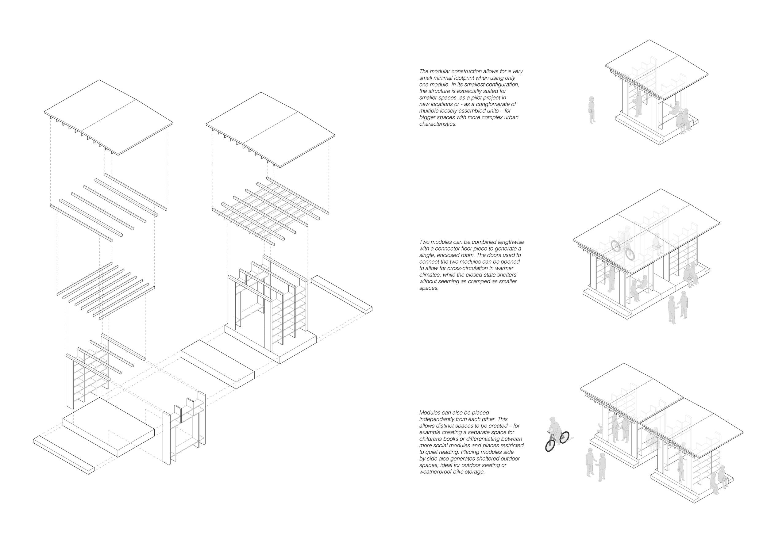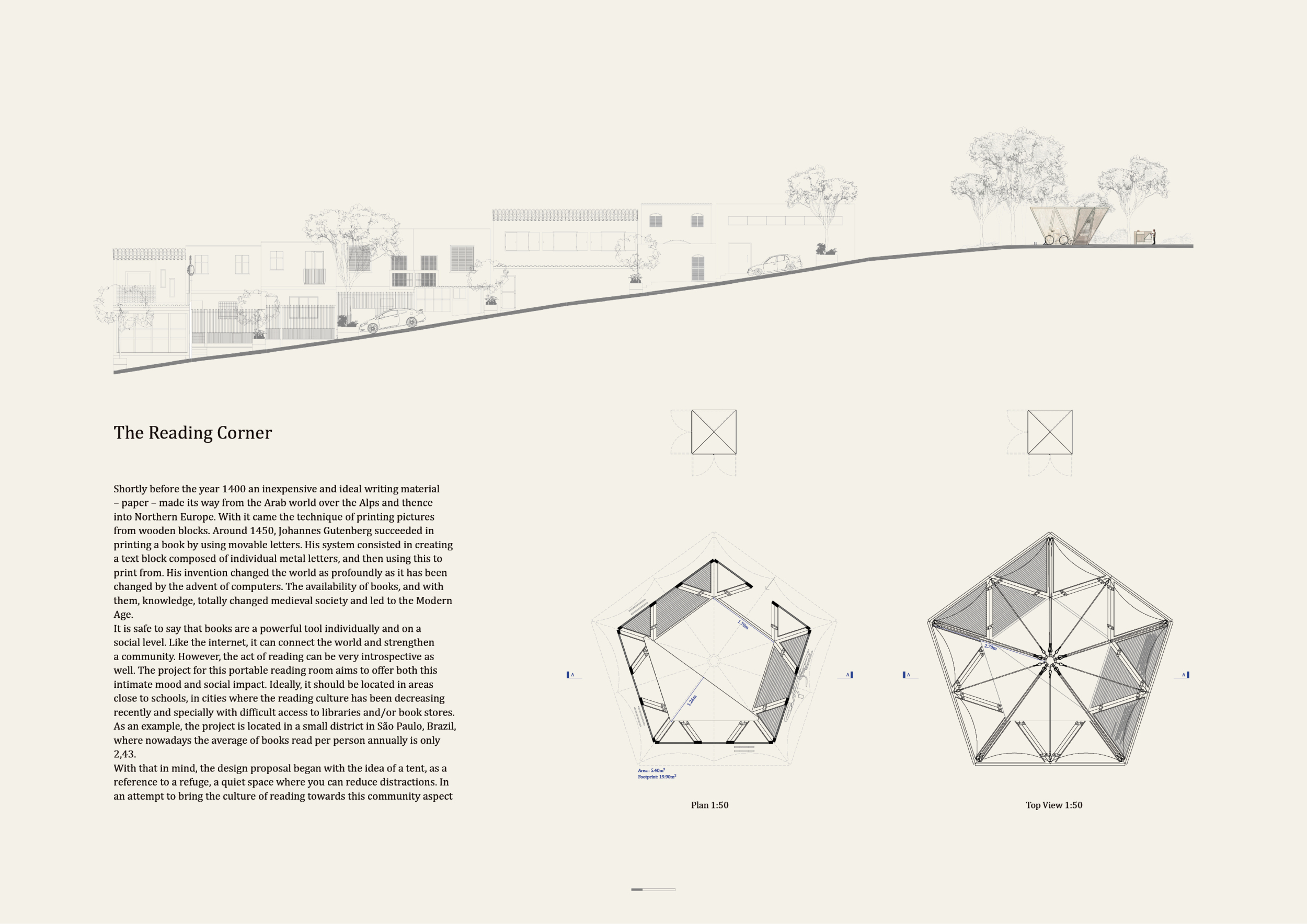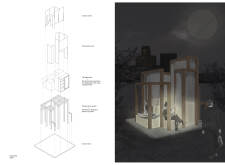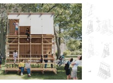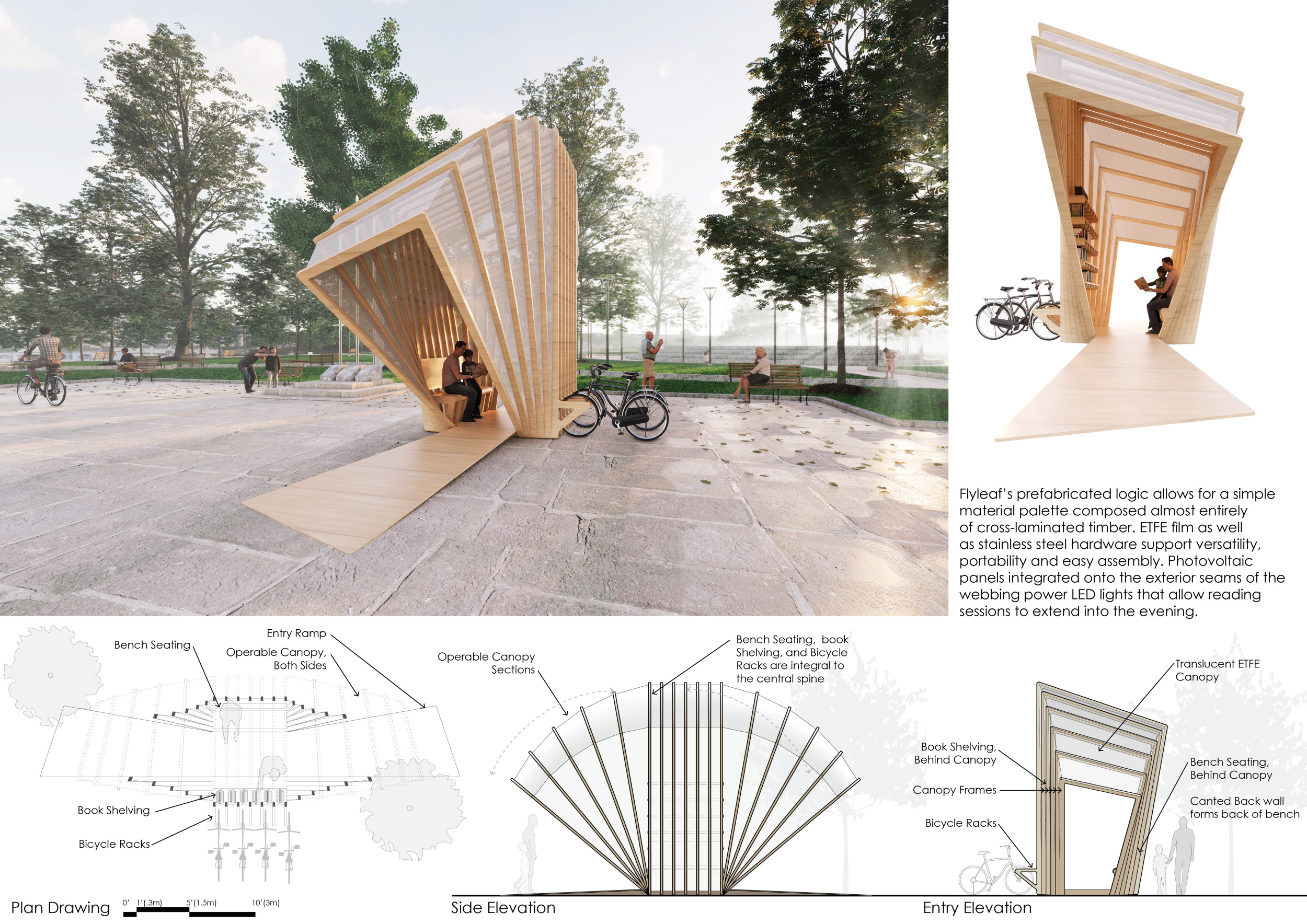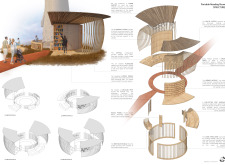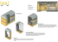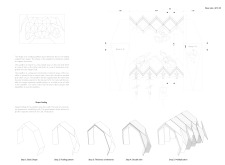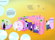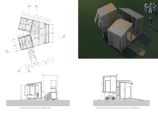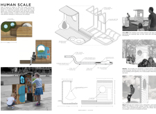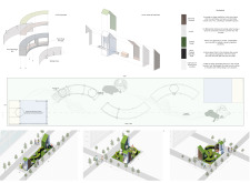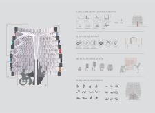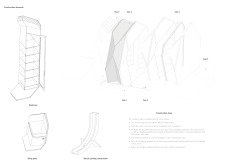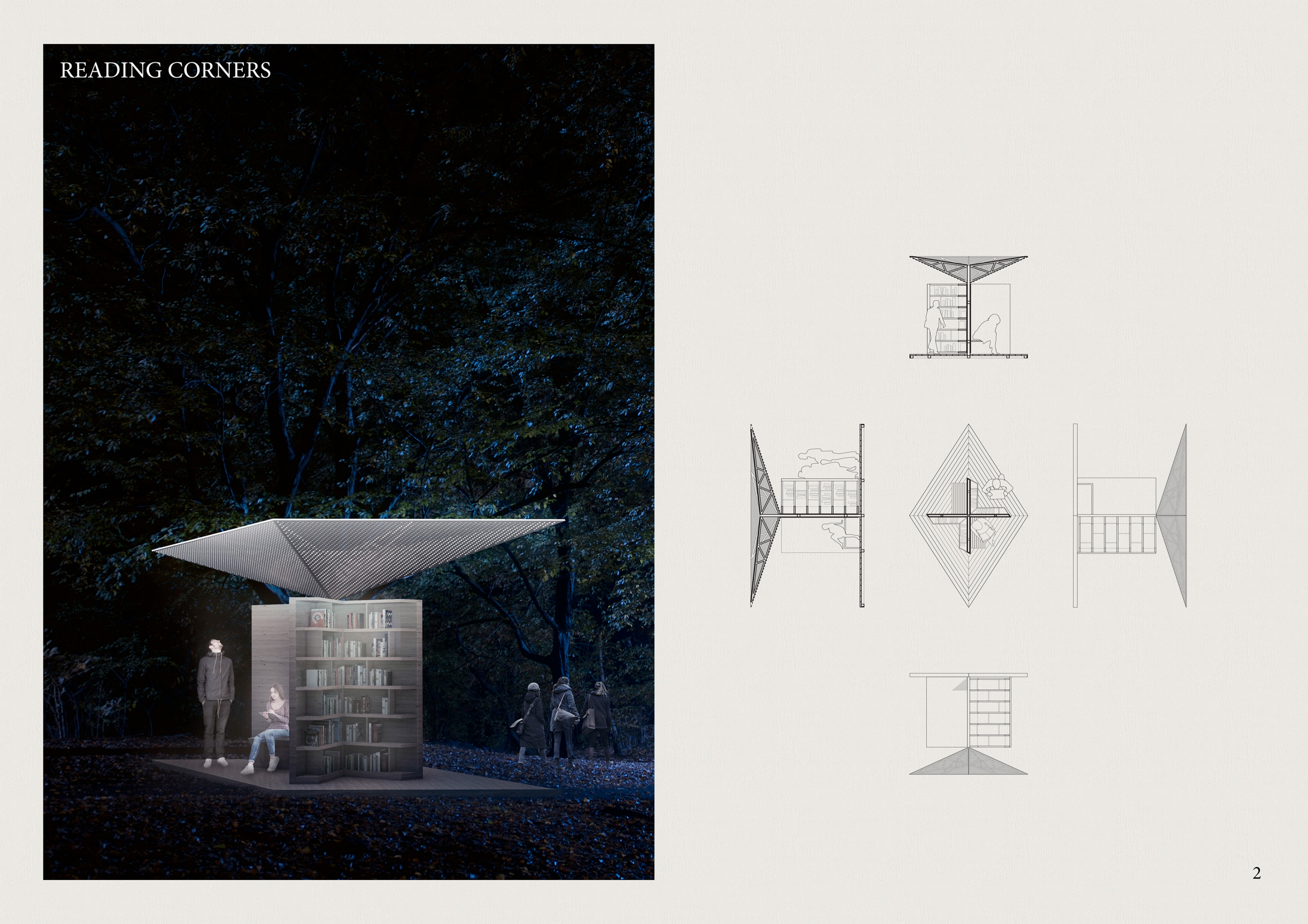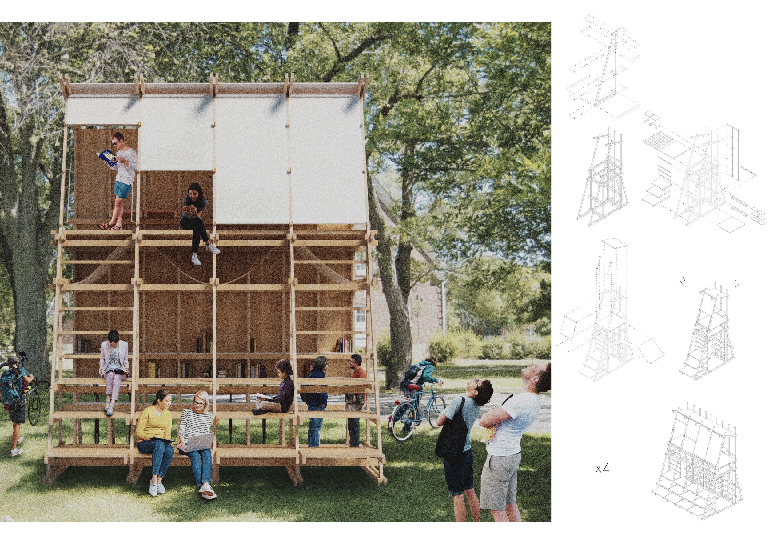'The Reading Corner' is a modular tent-like structure comprised of 5 wooden panels threaded and held together with a series of light steel tension cables, and topped by a translucent fabric for protection from the elements. The construction offers an intimate reading space. It is also a place to quietly share thoughts or quotations - mobile block letters on tiny shelves can be rearranged by users on a wall embedded with small shelves that hold the text. Read more The jury questions the form and displacement of the book-sharing station from the main structure. However, the project seems easy to fabricate with simple materials, and one can easily imagine this as a popular destination within a park or city plaza.