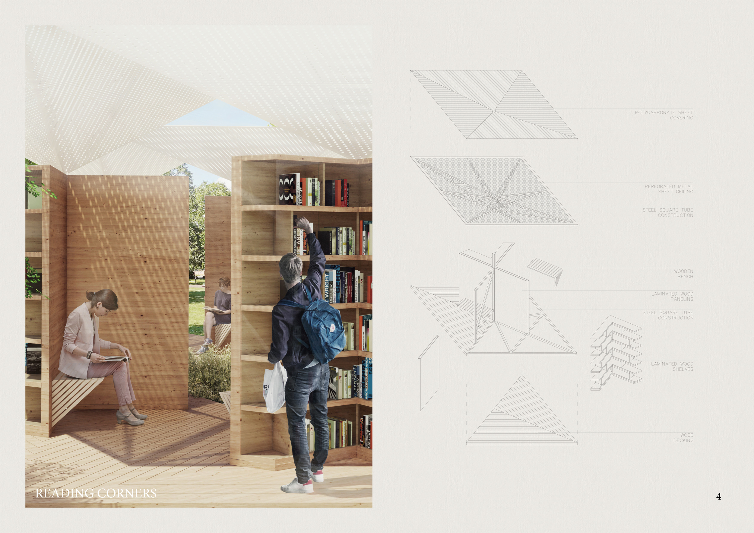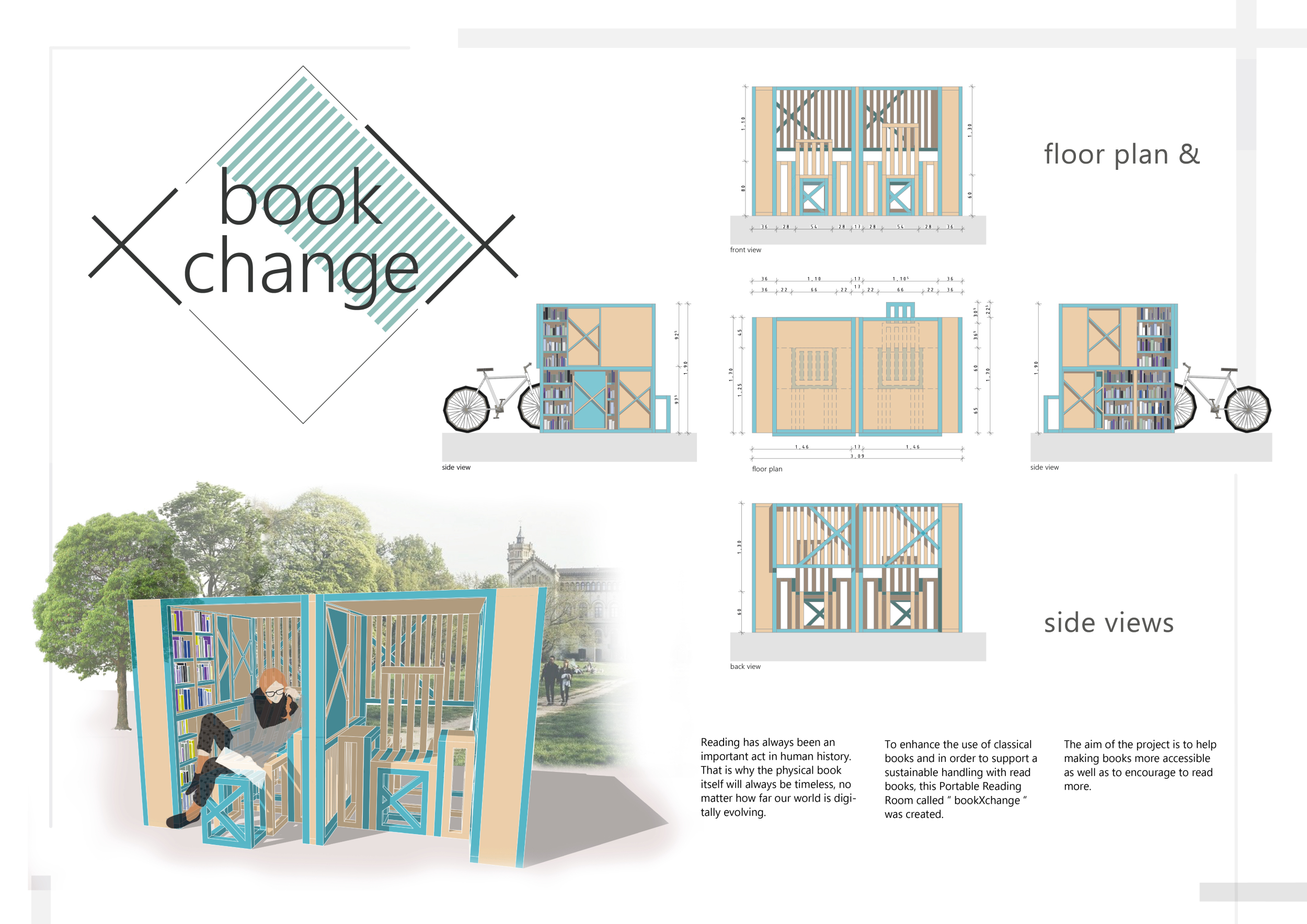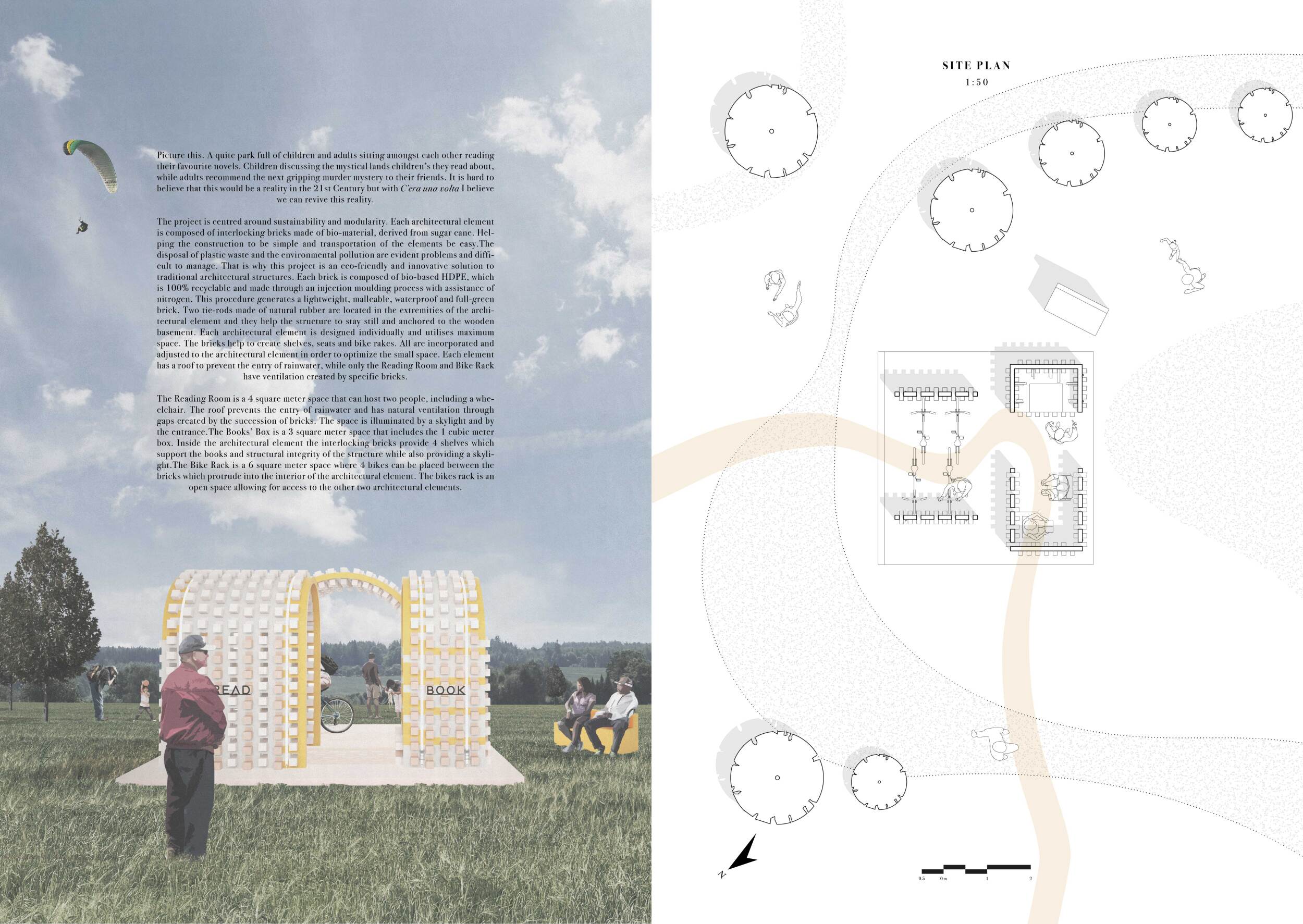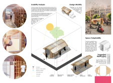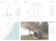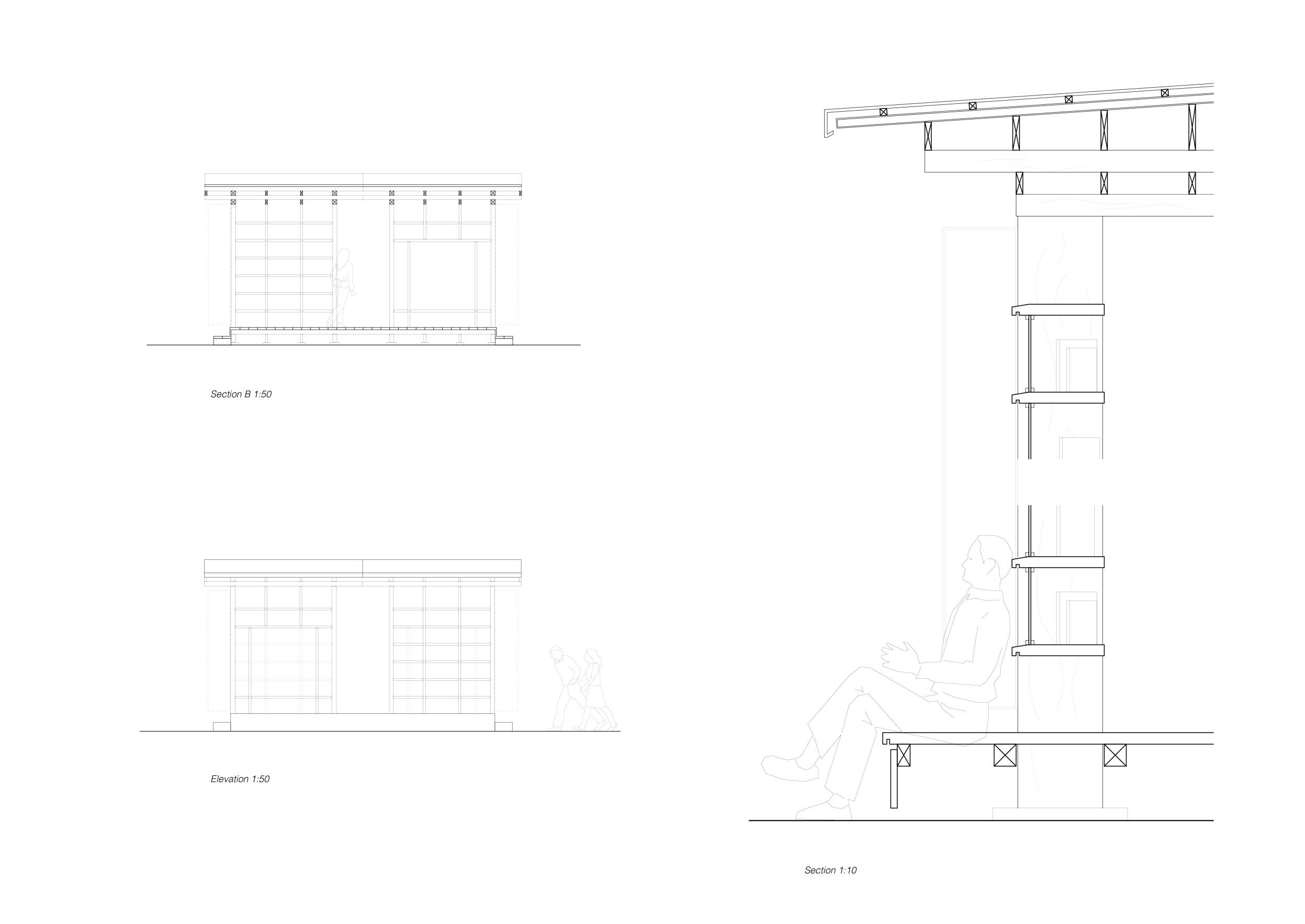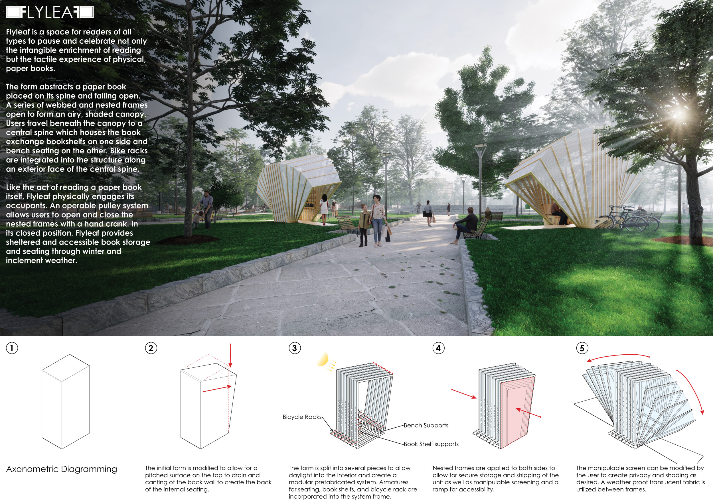 'The Reading Corner' is a modular tent-like structure comprised of 5 wooden panels threaded and held together with a series of light steel tension cables, and topped by a translucent fabric for protection from the elements. The construction offers an intimate reading space. It is also a place to quietly share thoughts or quotations - mobile block letters on tiny shelves can be rearranged by users on a wall embedded with small shelves that hold the text. Read more The jury questions the form and displacement of the book-sharing station from the main structure. However, the project seems easy to fabricate with simple materials, and one can easily imagine this as a popular destination within a park or city plaza.
