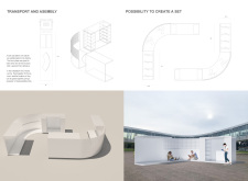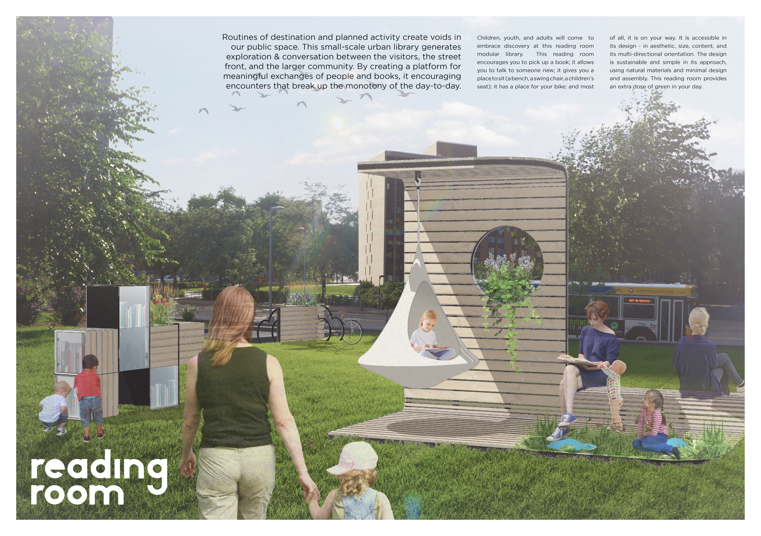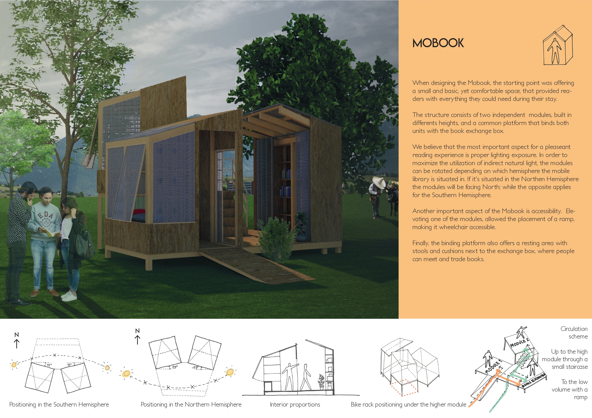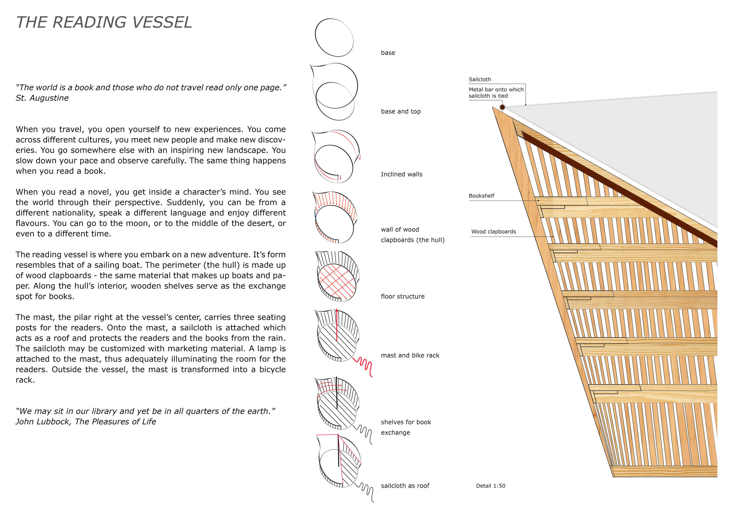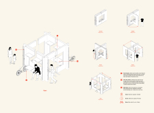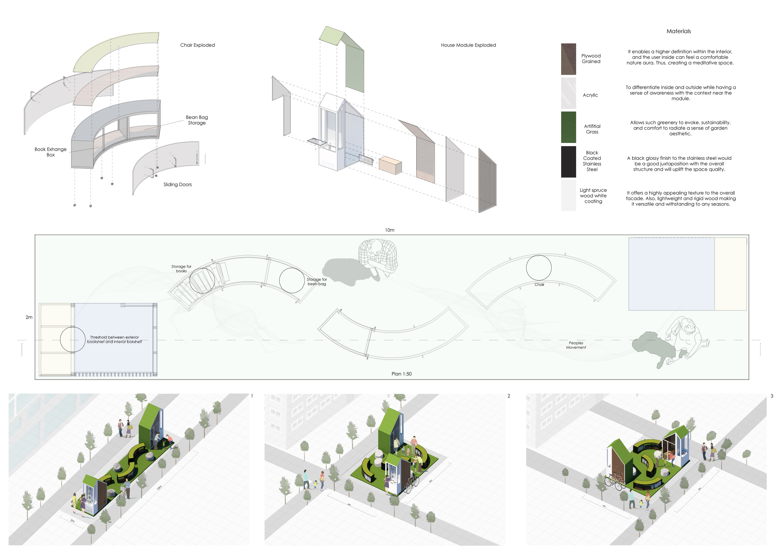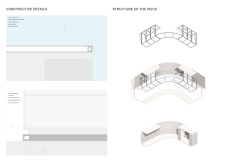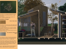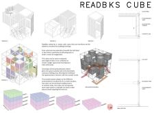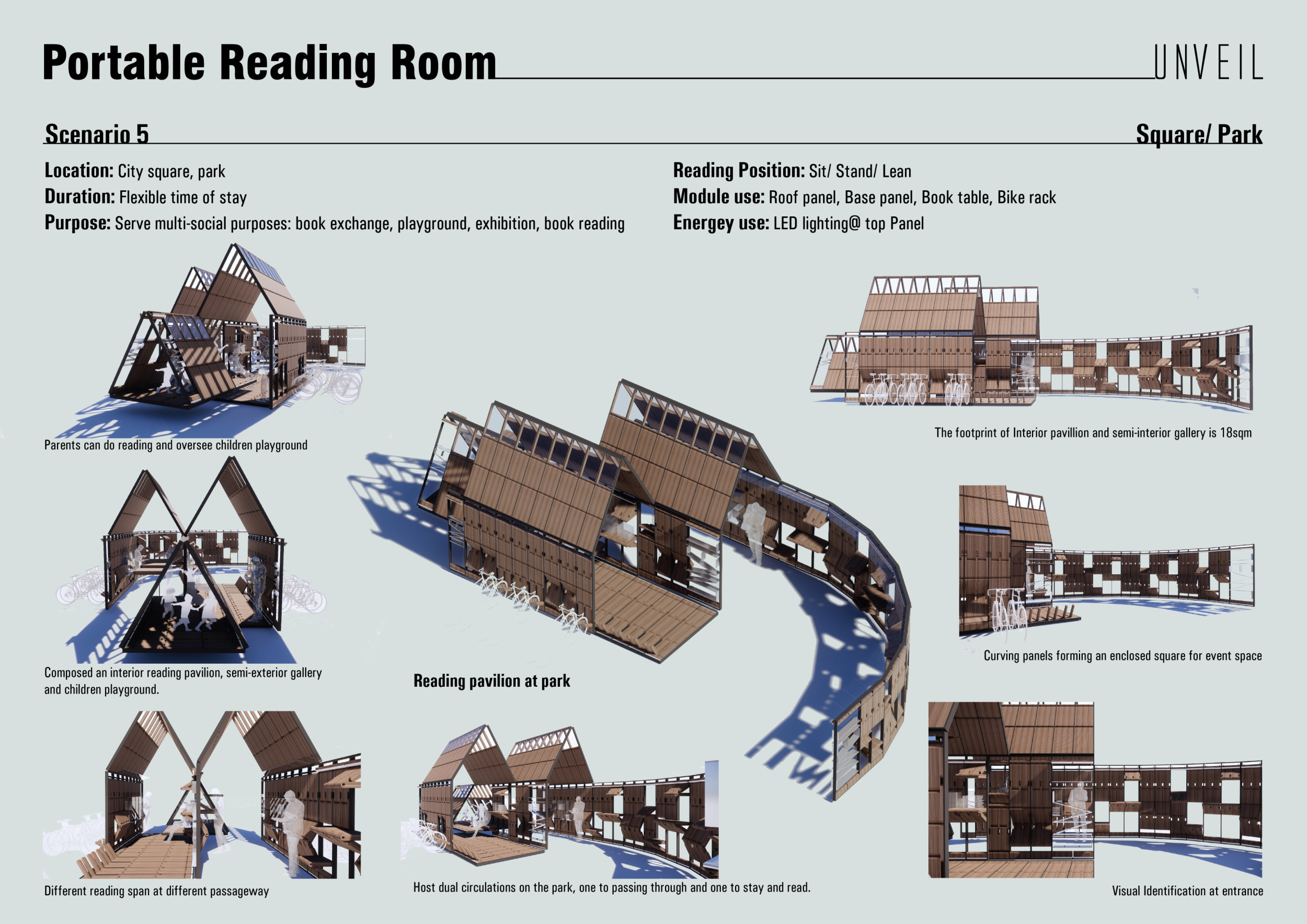 'The Reading Corner' is a modular tent-like structure comprised of 5 wooden panels threaded and held together with a series of light steel tension cables, and topped by a translucent fabric for protection from the elements. The construction offers an intimate reading space. It is also a place to quietly share thoughts or quotations - mobile block letters on tiny shelves can be rearranged by users on a wall embedded with small shelves that hold the text. Read more The jury questions the form and displacement of the book-sharing station from the main structure. However, the project seems easy to fabricate with simple materials, and one can easily imagine this as a popular destination within a park or city plaza.