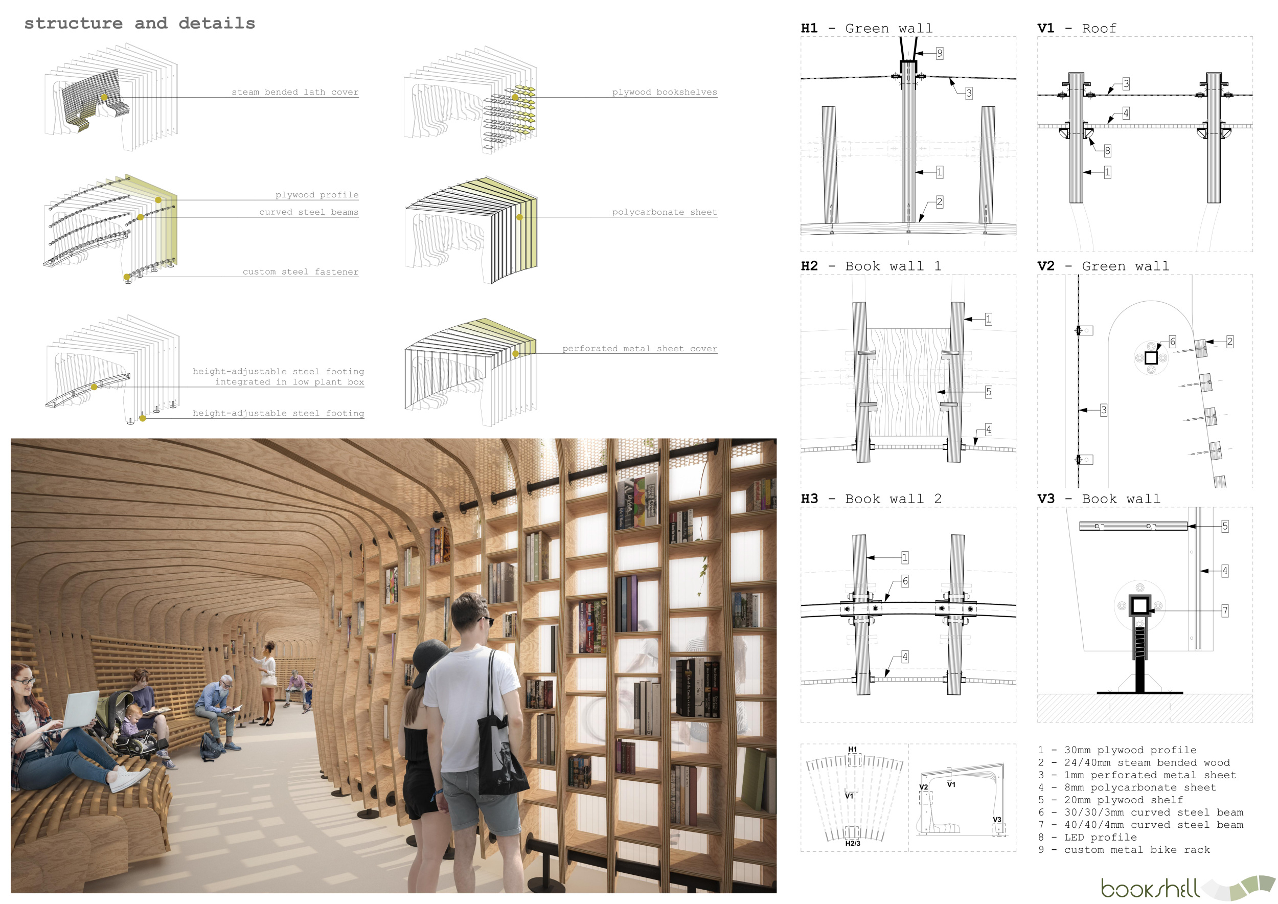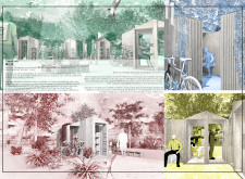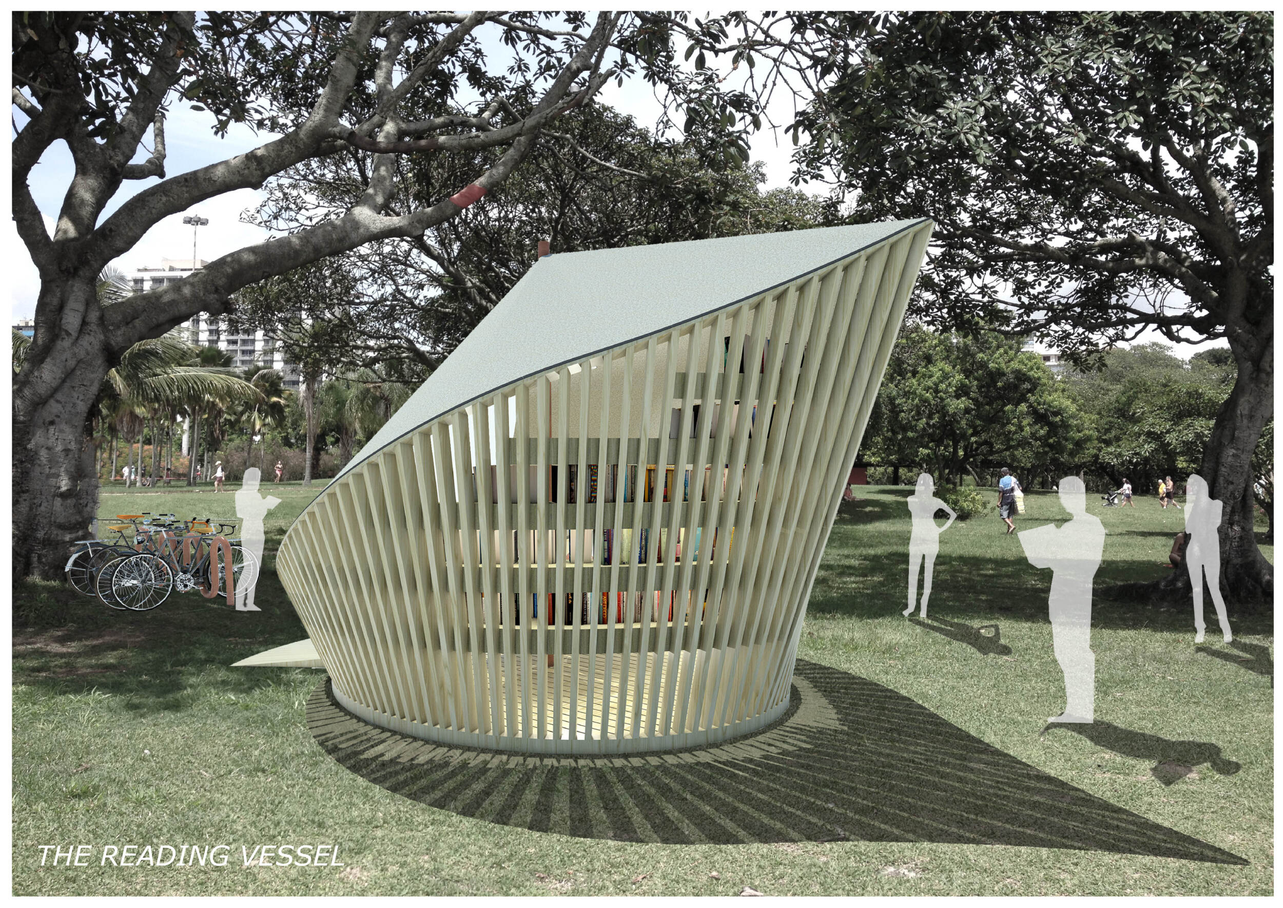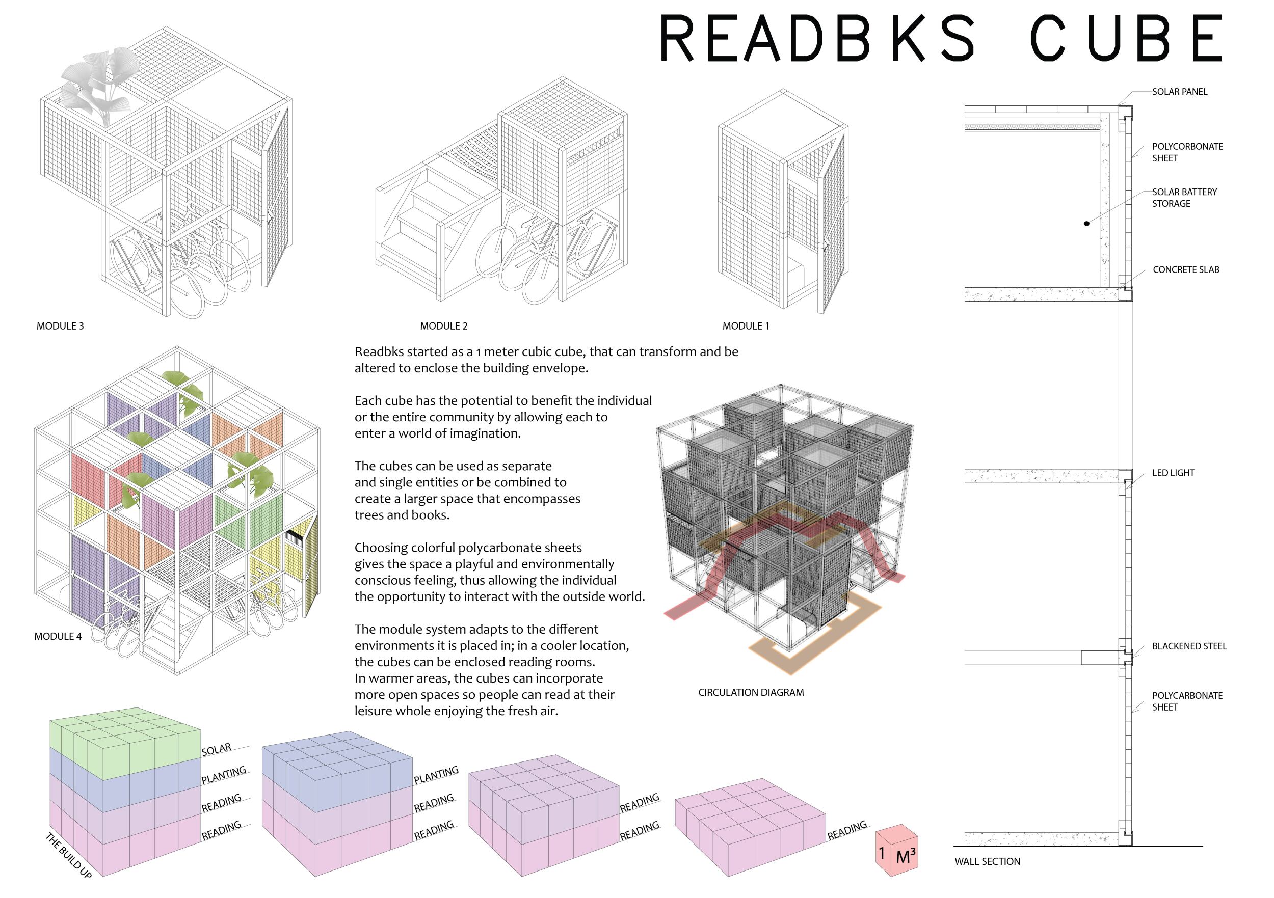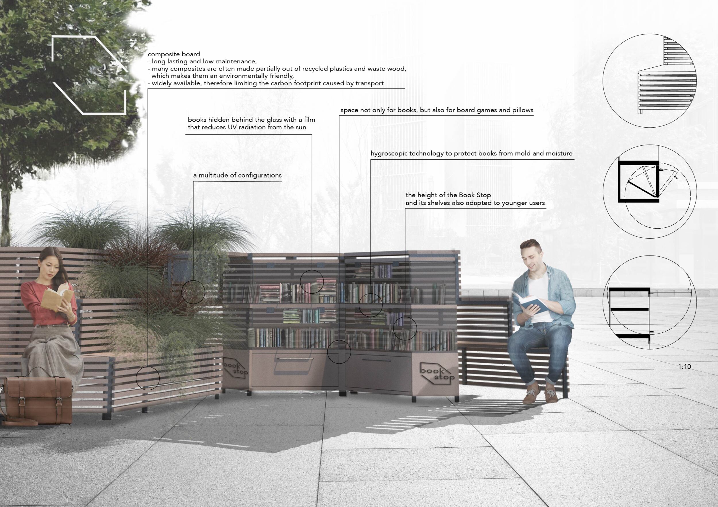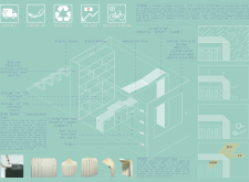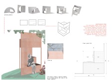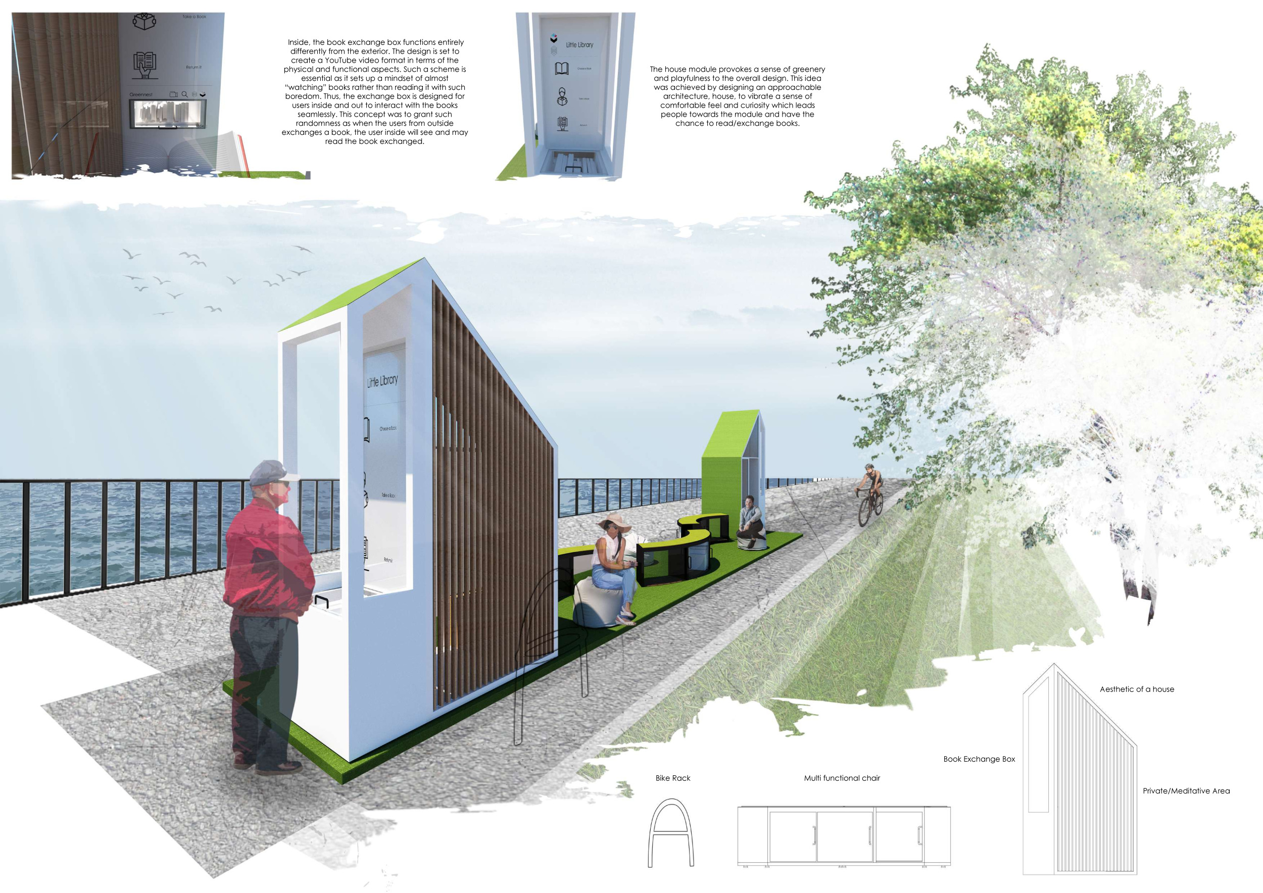 'The Reading Corner' is a modular tent-like structure comprised of 5 wooden panels threaded and held together with a series of light steel tension cables, and topped by a translucent fabric for protection from the elements. The construction offers an intimate reading space. It is also a place to quietly share thoughts or quotations - mobile block letters on tiny shelves can be rearranged by users on a wall embedded with small shelves that hold the text. Read more The jury questions the form and displacement of the book-sharing station from the main structure. However, the project seems easy to fabricate with simple materials, and one can easily imagine this as a popular destination within a park or city plaza.