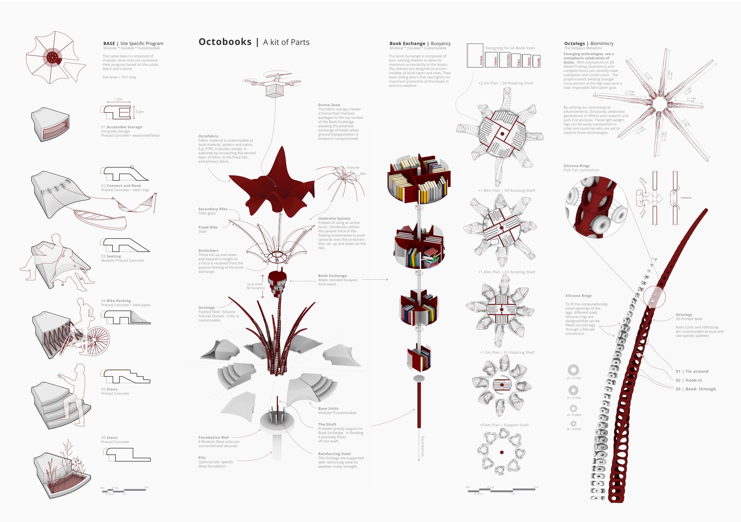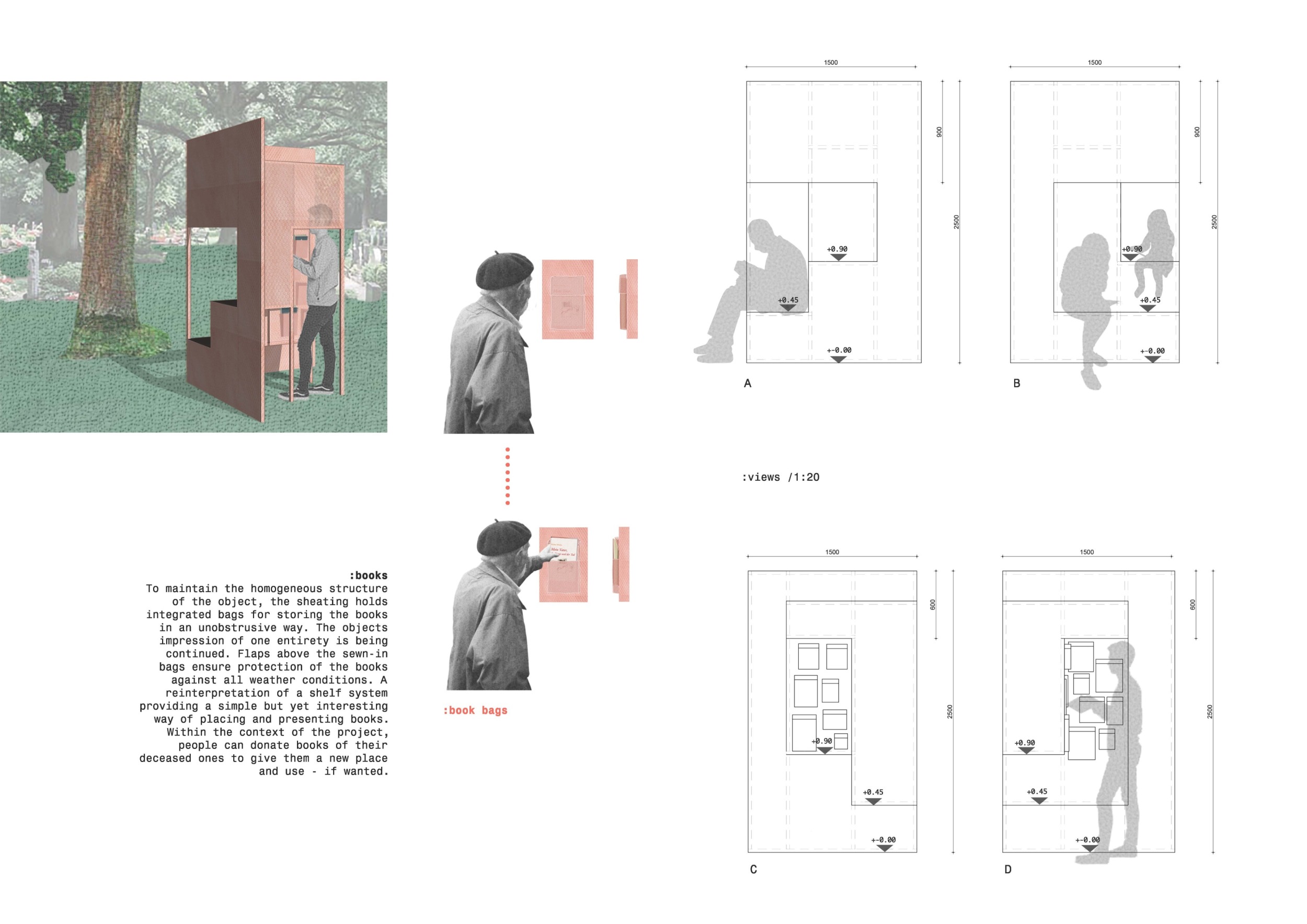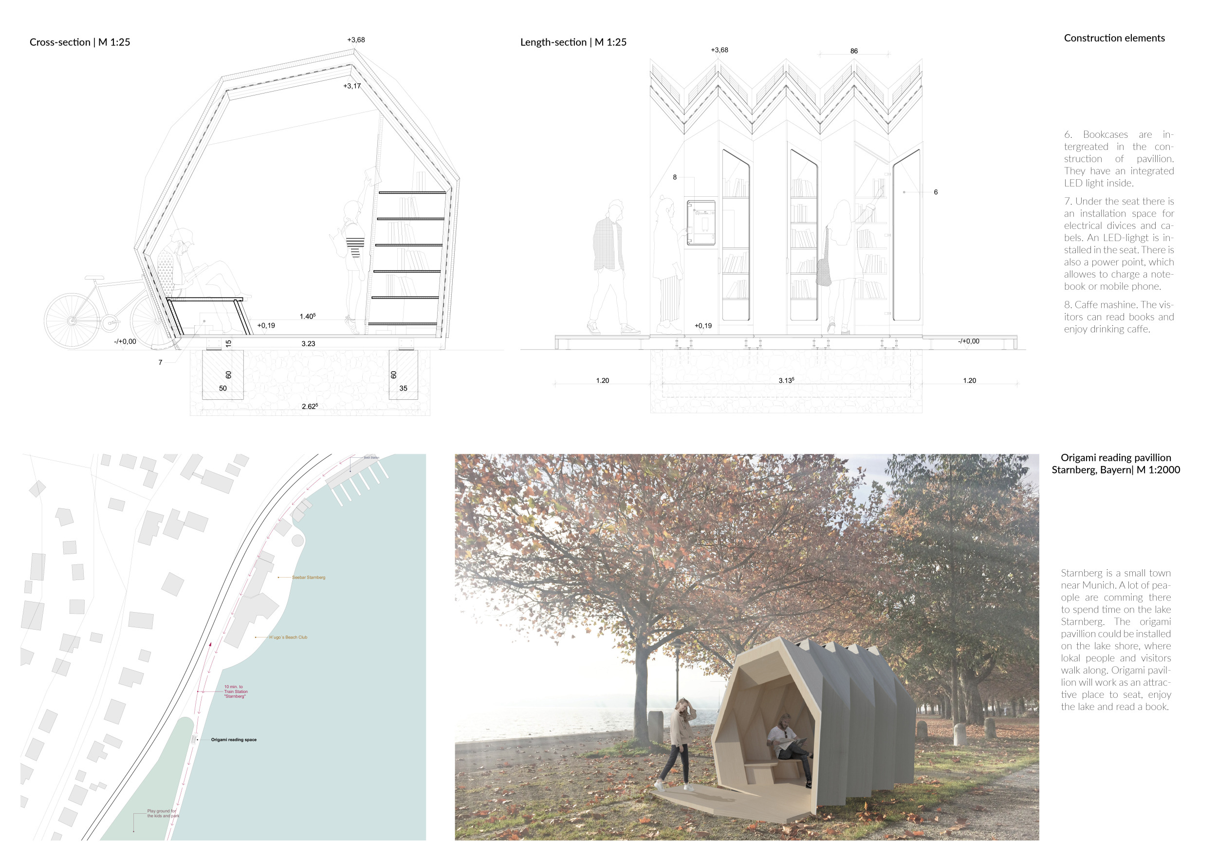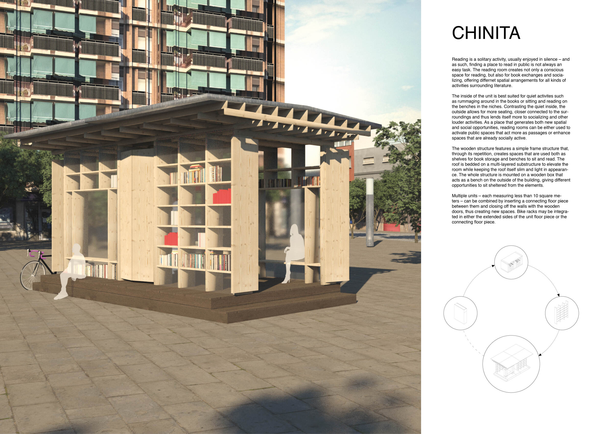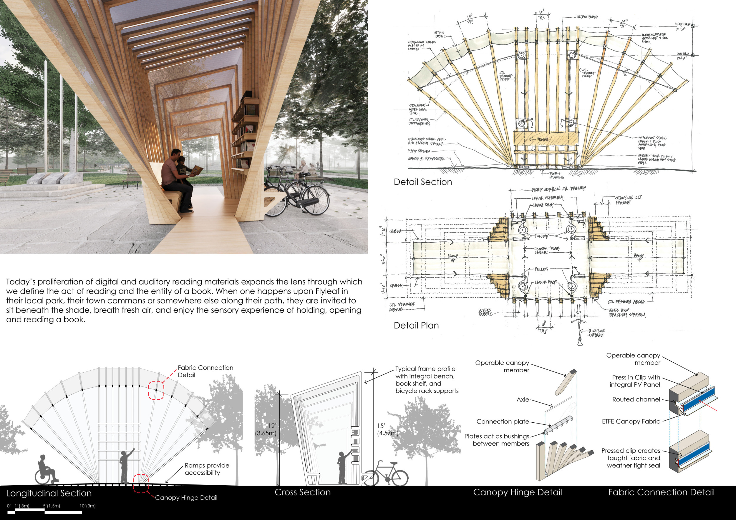 'The Reading Corner' is a modular tent-like structure comprised of 5 wooden panels threaded and held together with a series of light steel tension cables, and topped by a translucent fabric for protection from the elements. The construction offers an intimate reading space. It is also a place to quietly share thoughts or quotations - mobile block letters on tiny shelves can be rearranged by users on a wall embedded with small shelves that hold the text. Read more The jury questions the form and displacement of the book-sharing station from the main structure. However, the project seems easy to fabricate with simple materials, and one can easily imagine this as a popular destination within a park or city plaza.