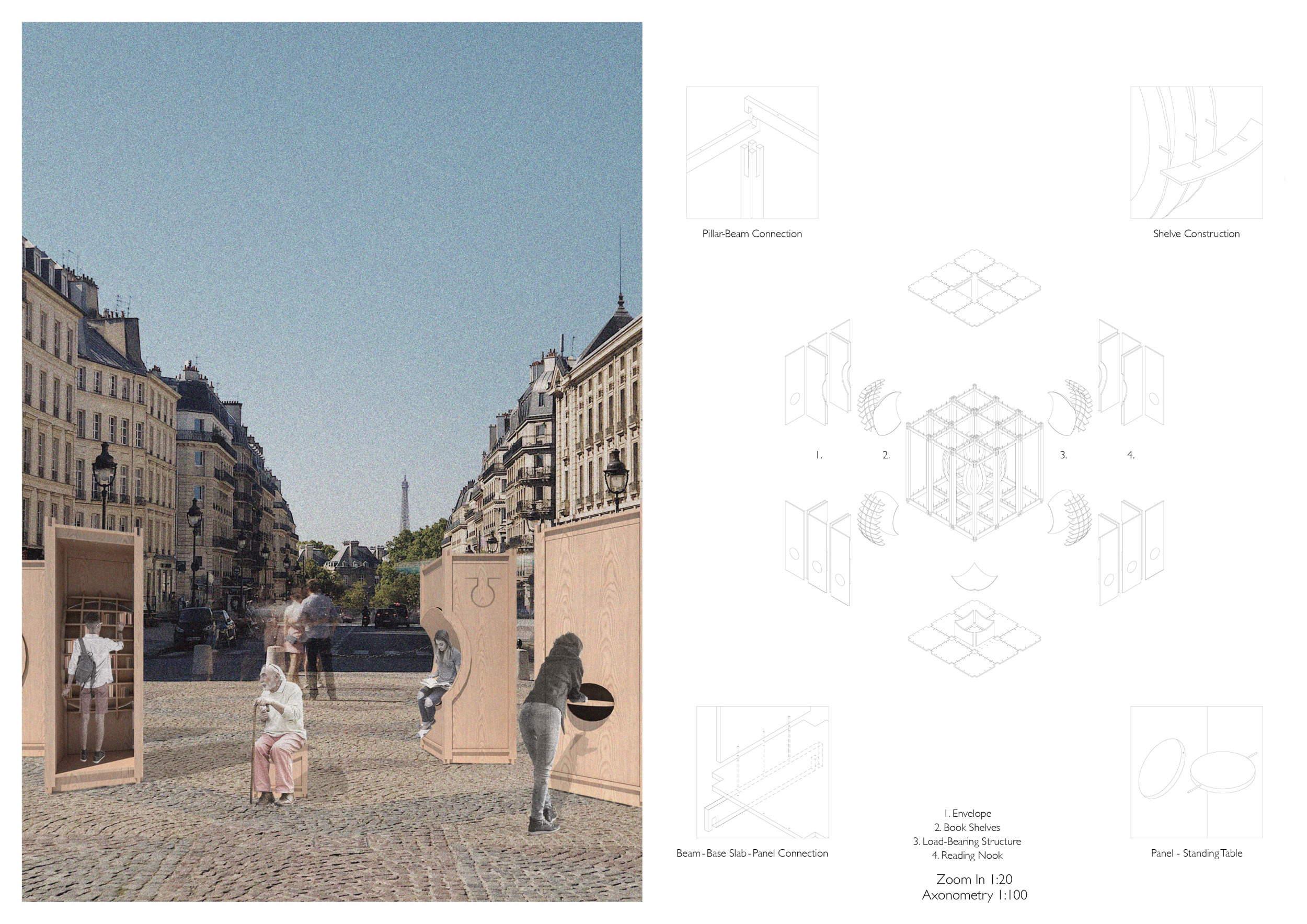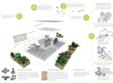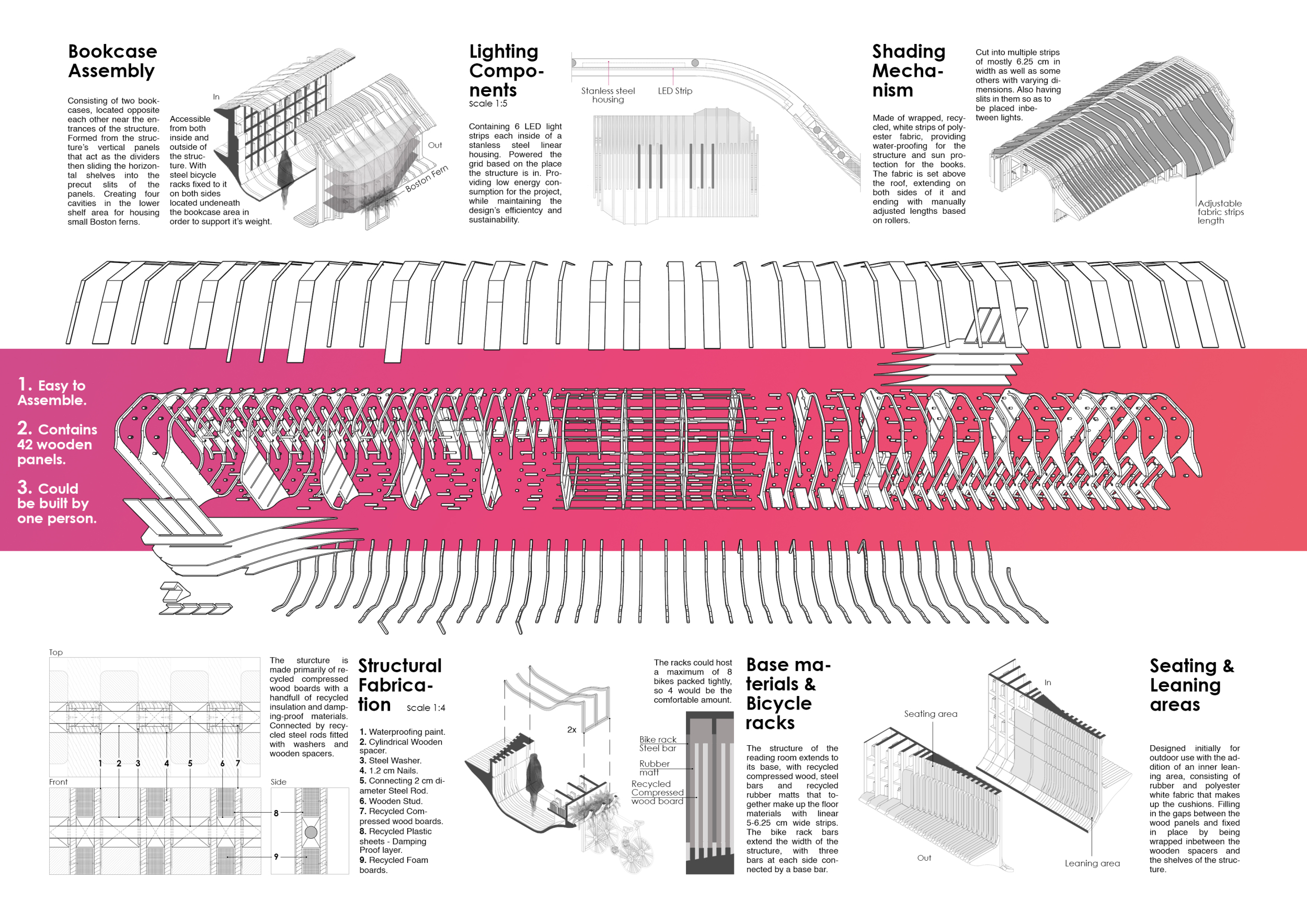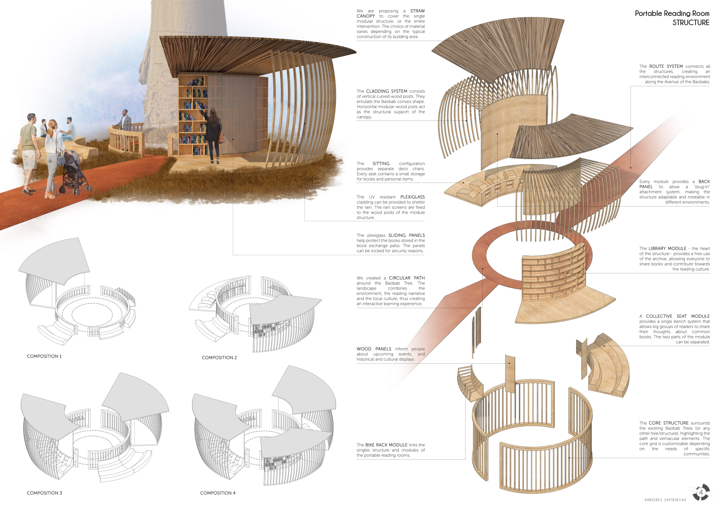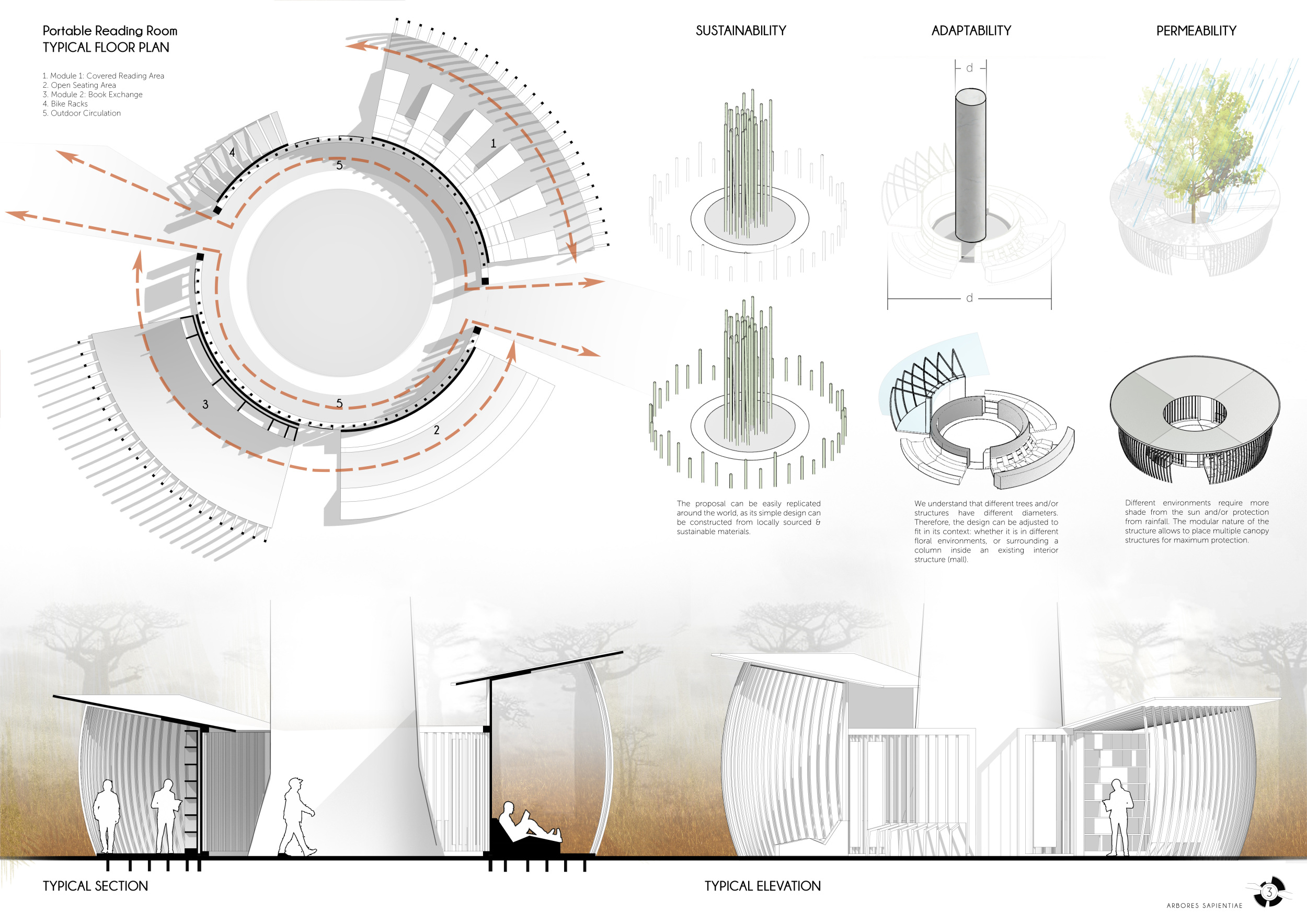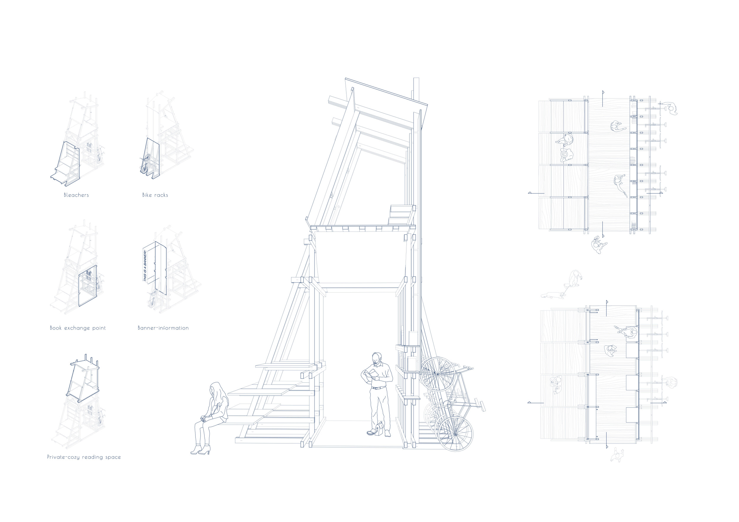 'The Reading Corner' is a modular tent-like structure comprised of 5 wooden panels threaded and held together with a series of light steel tension cables, and topped by a translucent fabric for protection from the elements. The construction offers an intimate reading space. It is also a place to quietly share thoughts or quotations - mobile block letters on tiny shelves can be rearranged by users on a wall embedded with small shelves that hold the text. Read more The jury questions the form and displacement of the book-sharing station from the main structure. However, the project seems easy to fabricate with simple materials, and one can easily imagine this as a popular destination within a park or city plaza.