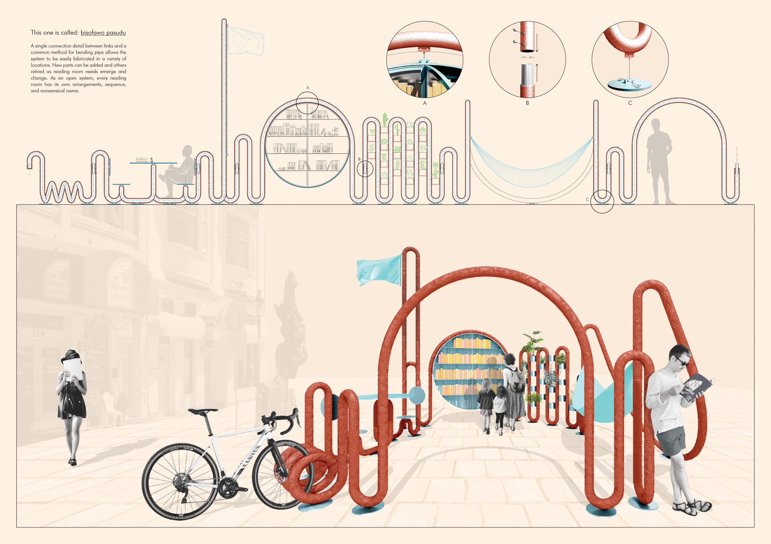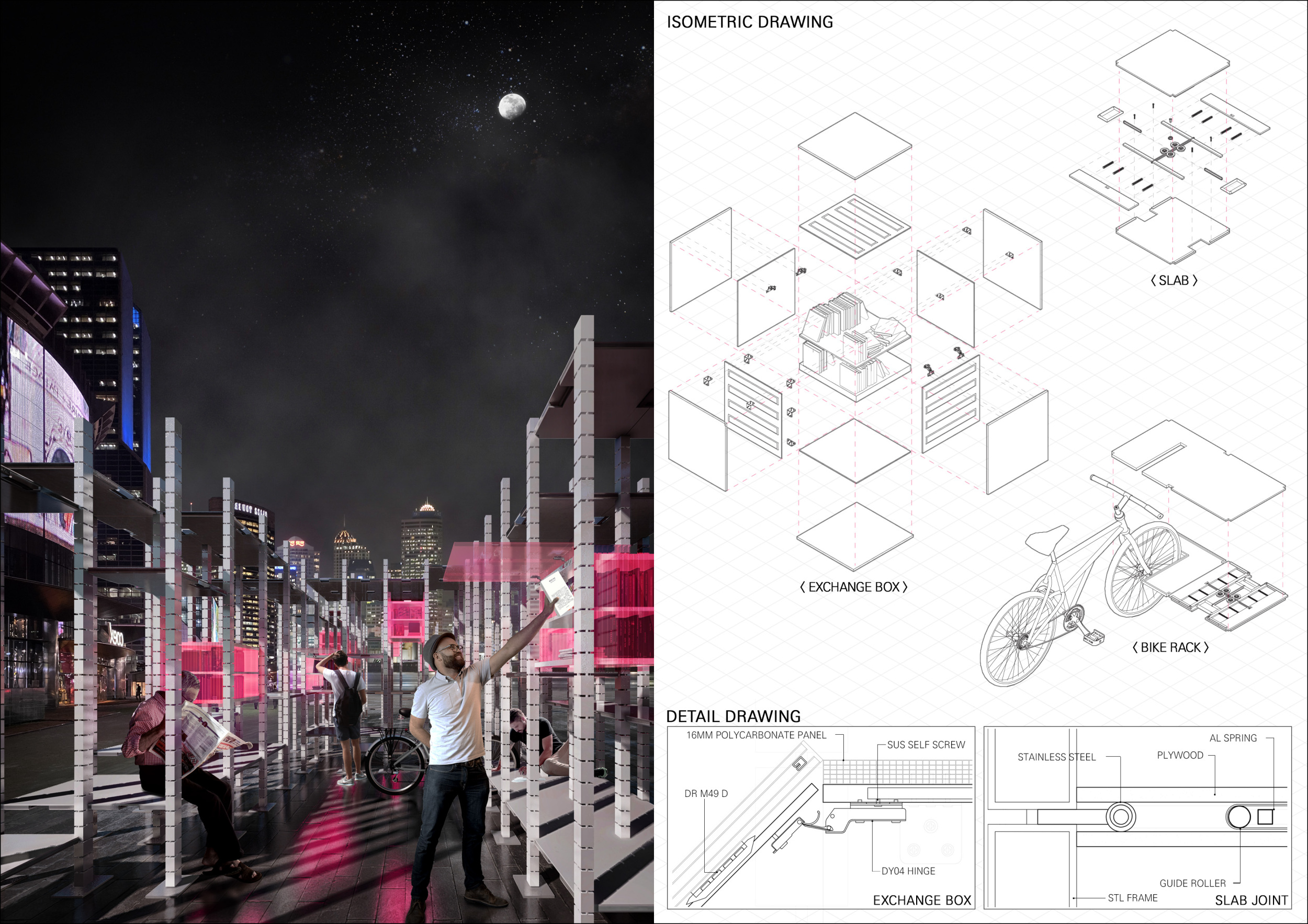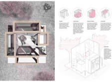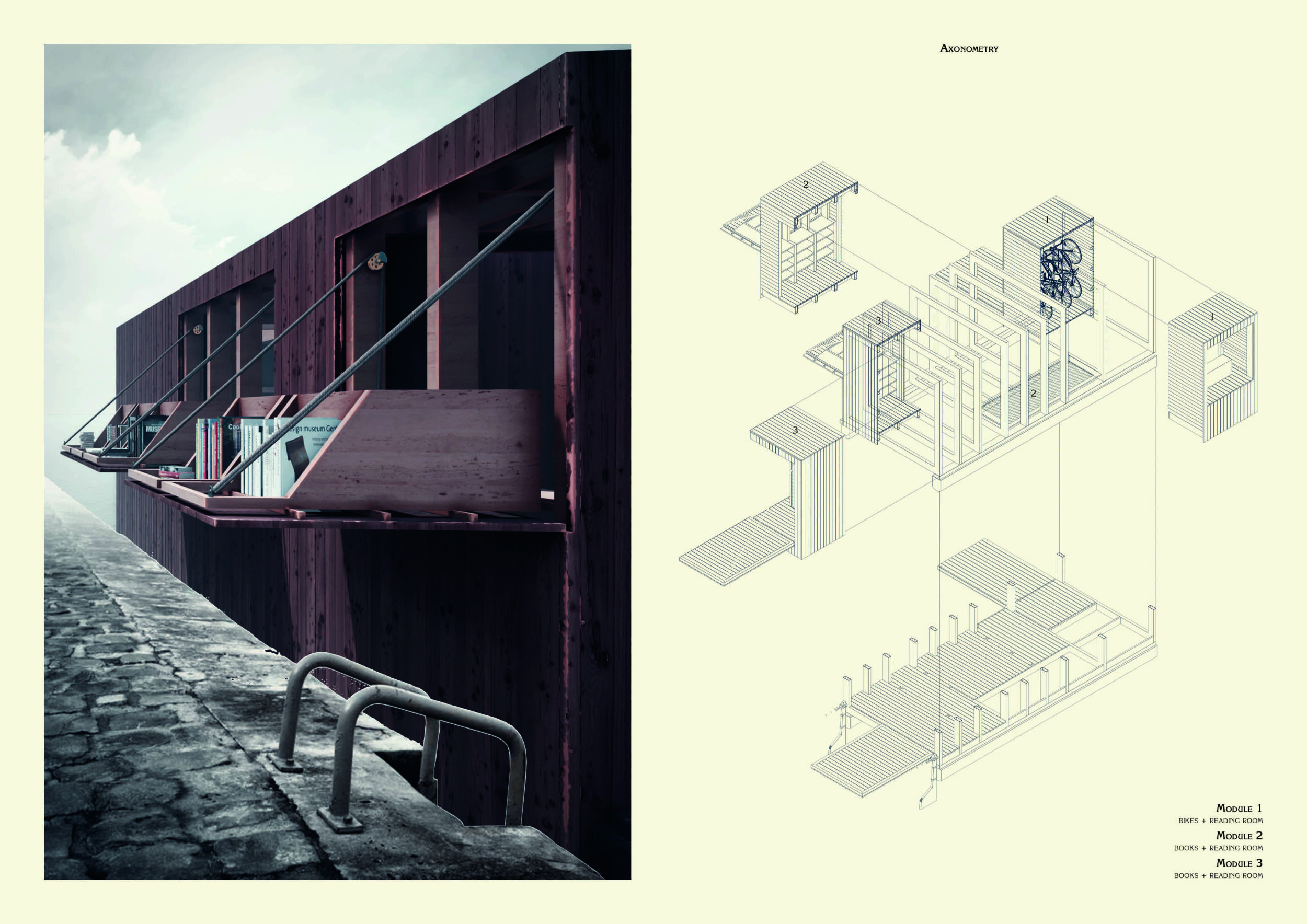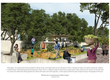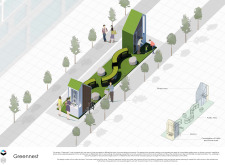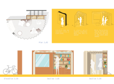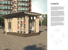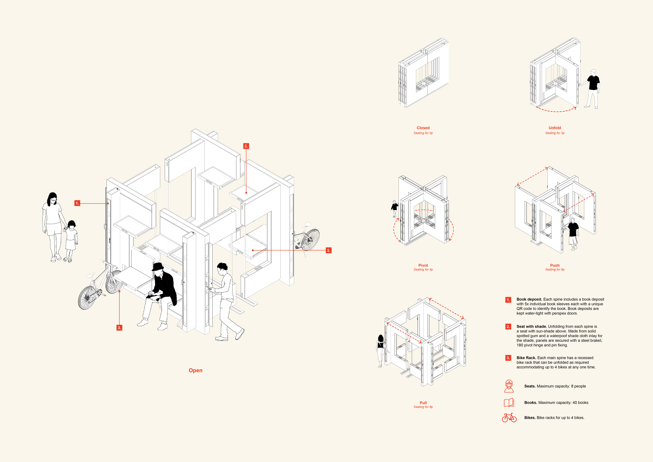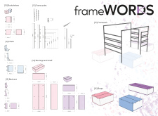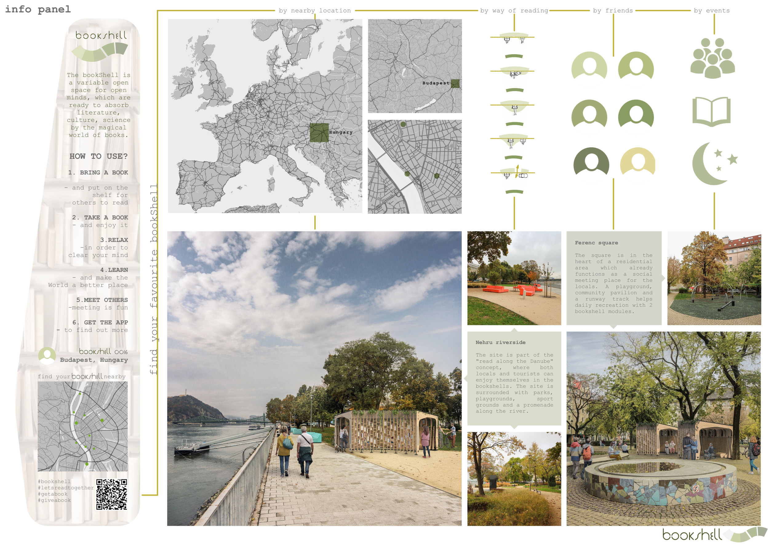 'The Reading Corner' is a modular tent-like structure comprised of 5 wooden panels threaded and held together with a series of light steel tension cables, and topped by a translucent fabric for protection from the elements. The construction offers an intimate reading space. It is also a place to quietly share thoughts or quotations - mobile block letters on tiny shelves can be rearranged by users on a wall embedded with small shelves that hold the text. Read more The jury questions the form and displacement of the book-sharing station from the main structure. However, the project seems easy to fabricate with simple materials, and one can easily imagine this as a popular destination within a park or city plaza.