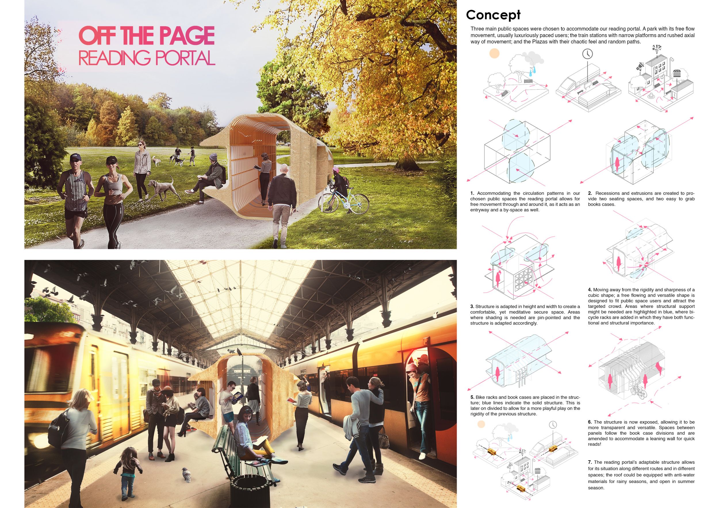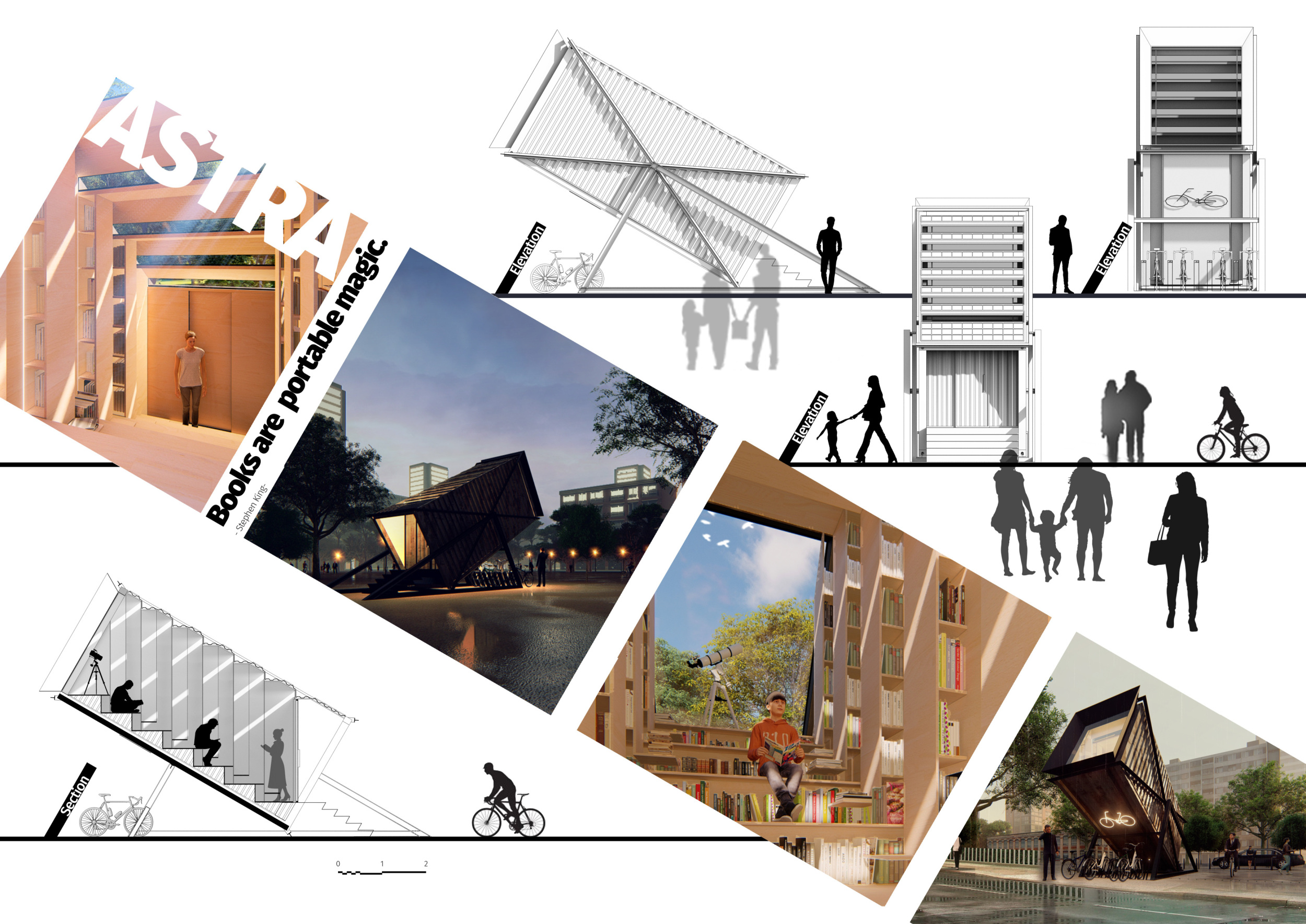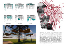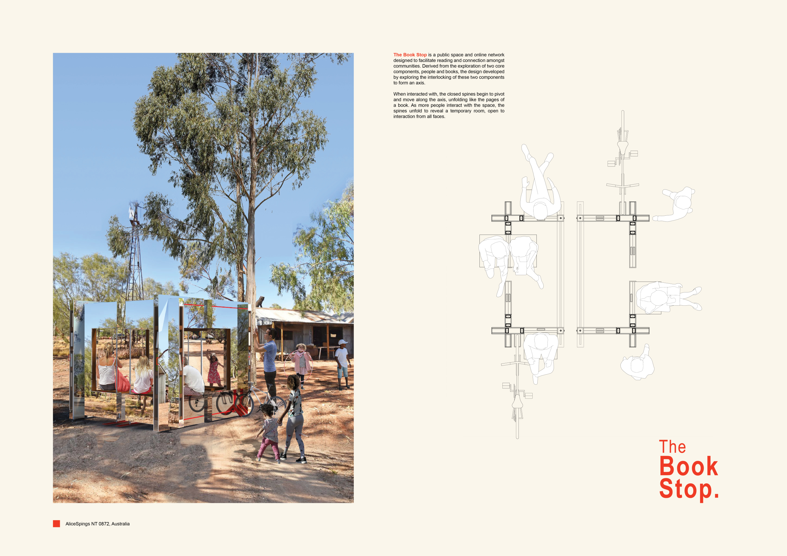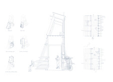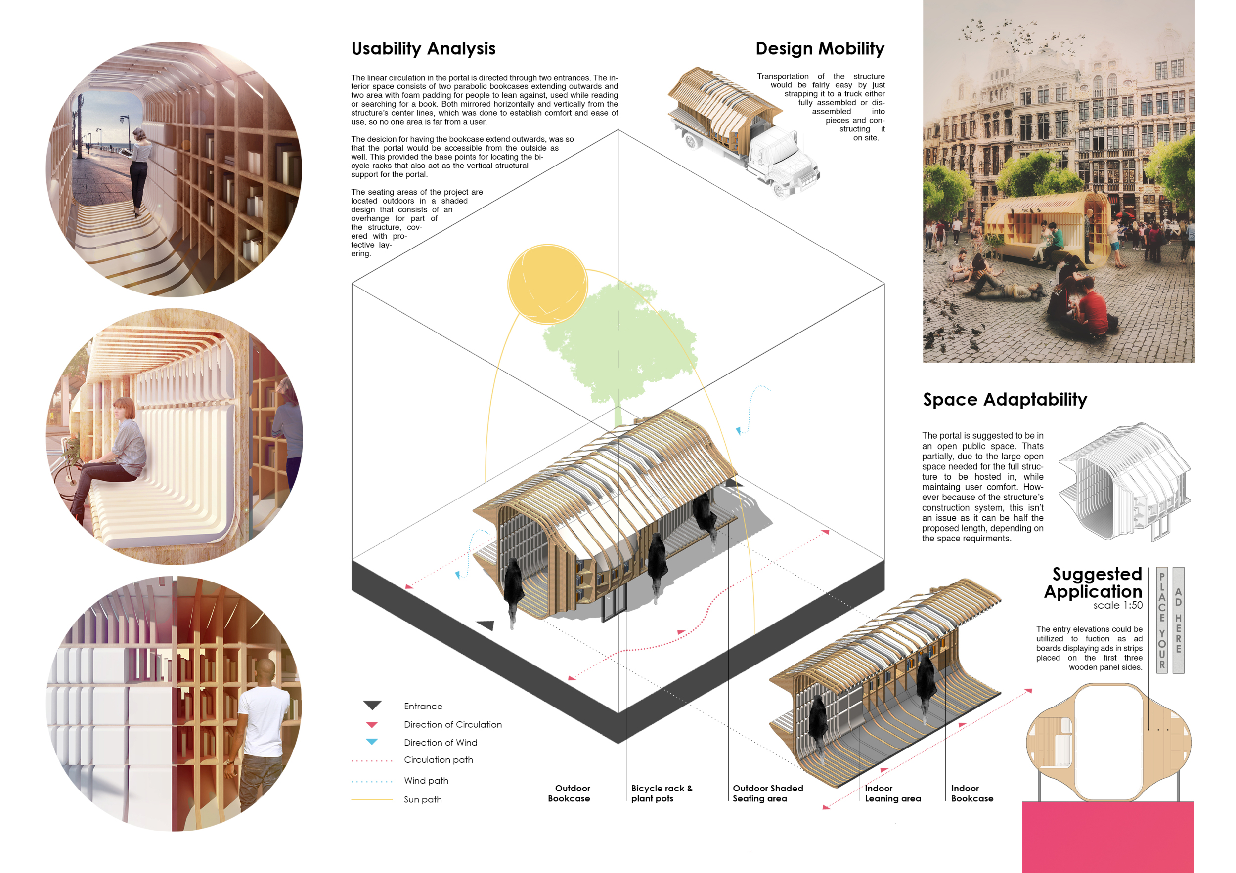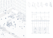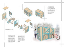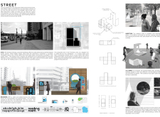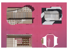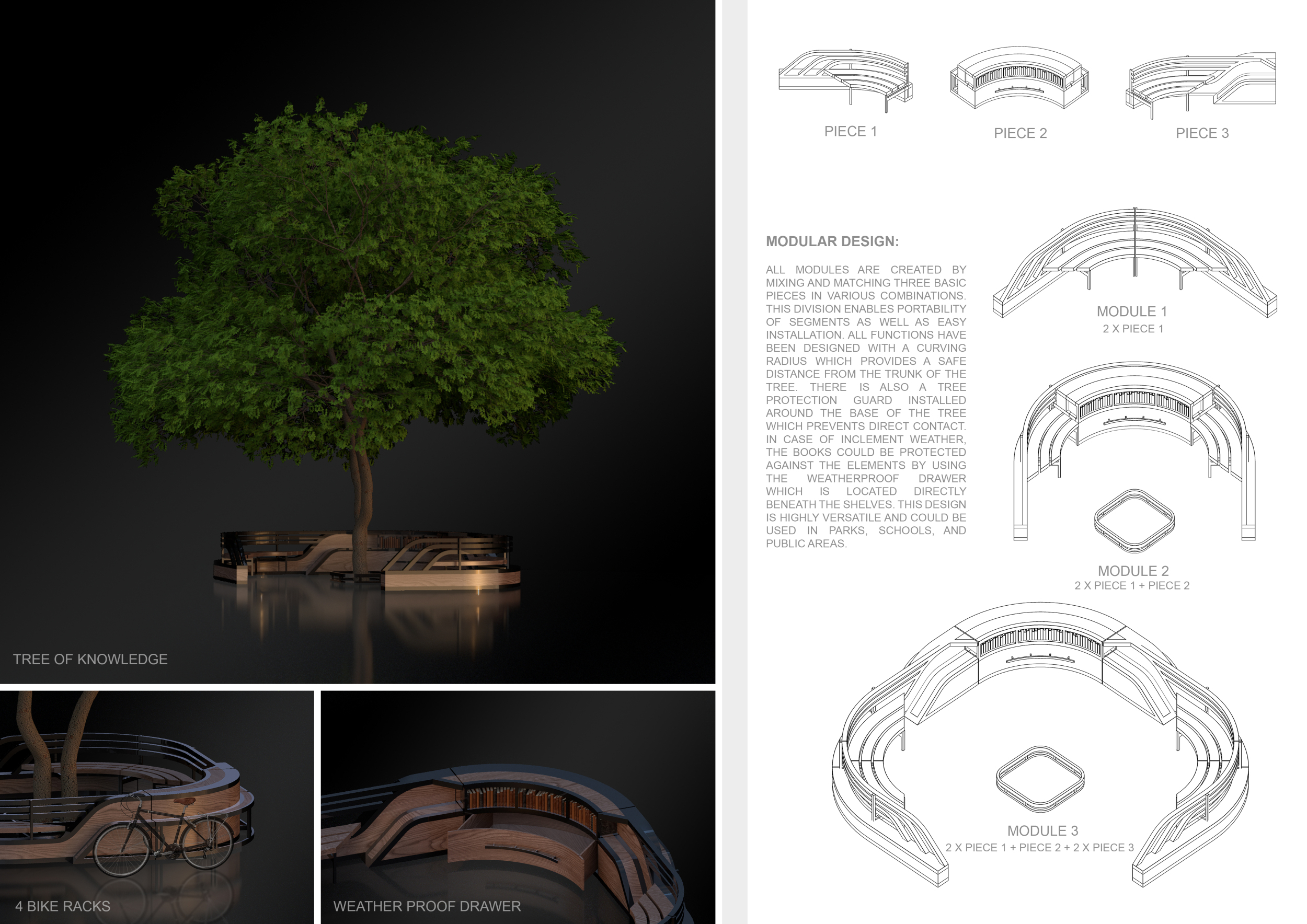 'The Reading Corner' is a modular tent-like structure comprised of 5 wooden panels threaded and held together with a series of light steel tension cables, and topped by a translucent fabric for protection from the elements. The construction offers an intimate reading space. It is also a place to quietly share thoughts or quotations - mobile block letters on tiny shelves can be rearranged by users on a wall embedded with small shelves that hold the text. Read more The jury questions the form and displacement of the book-sharing station from the main structure. However, the project seems easy to fabricate with simple materials, and one can easily imagine this as a popular destination within a park or city plaza.
