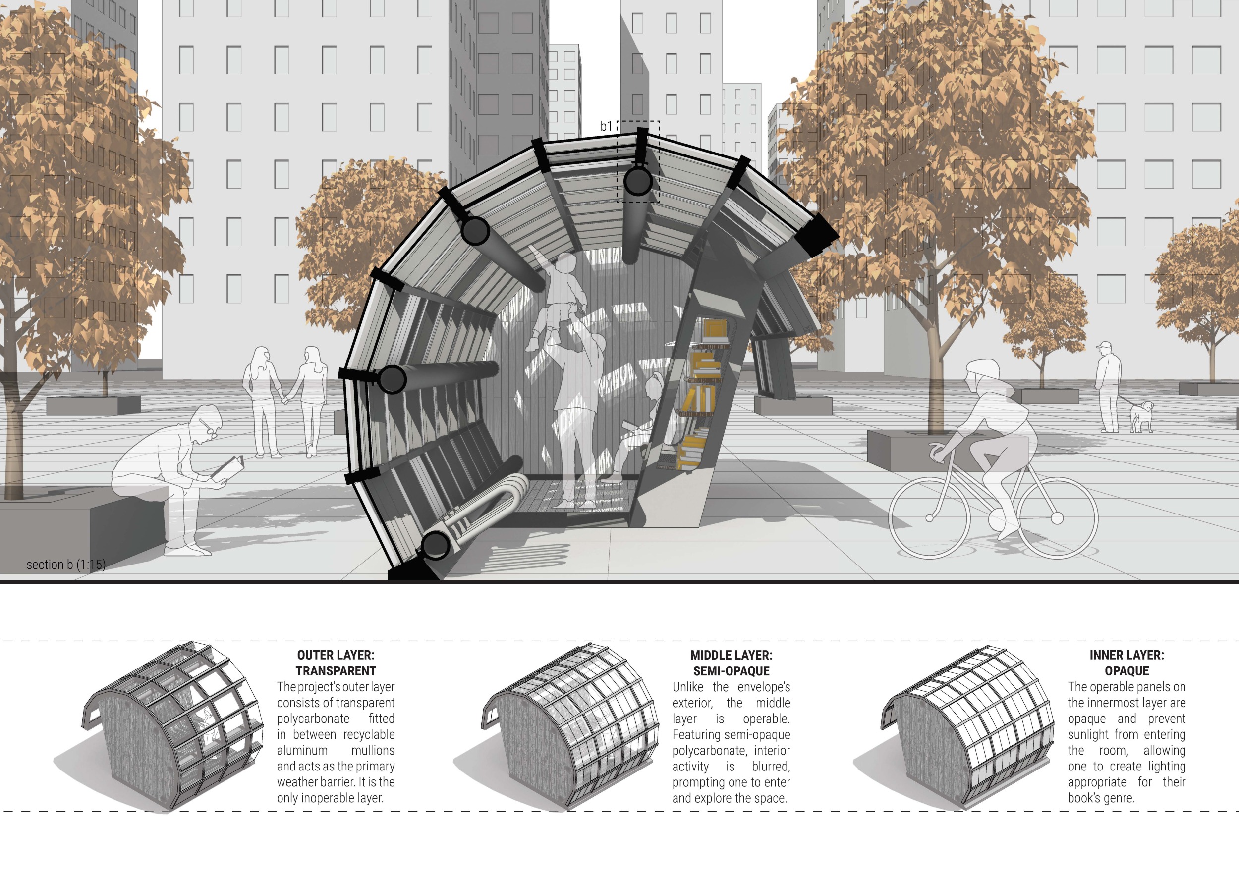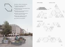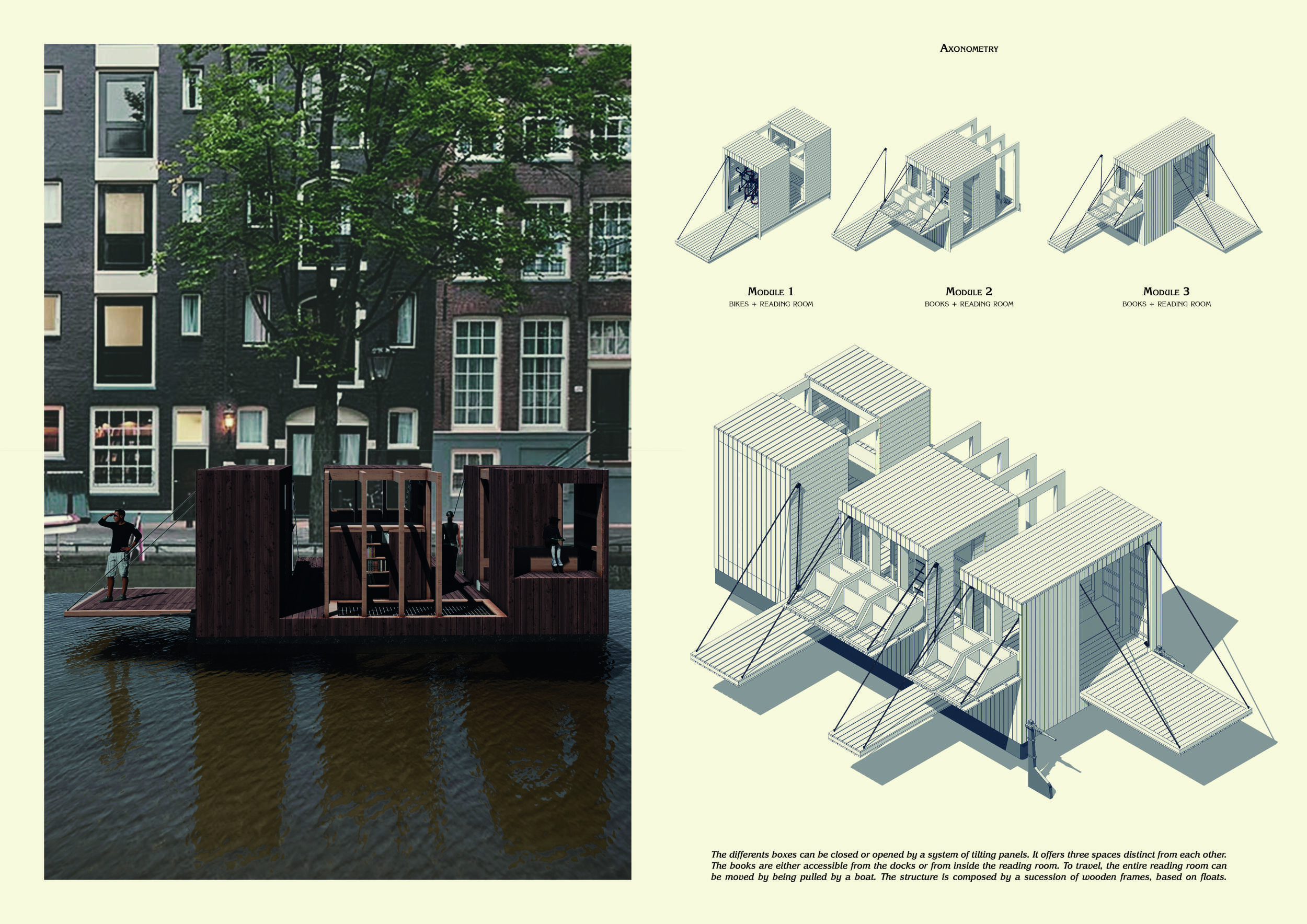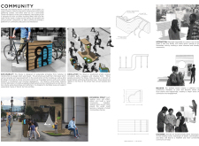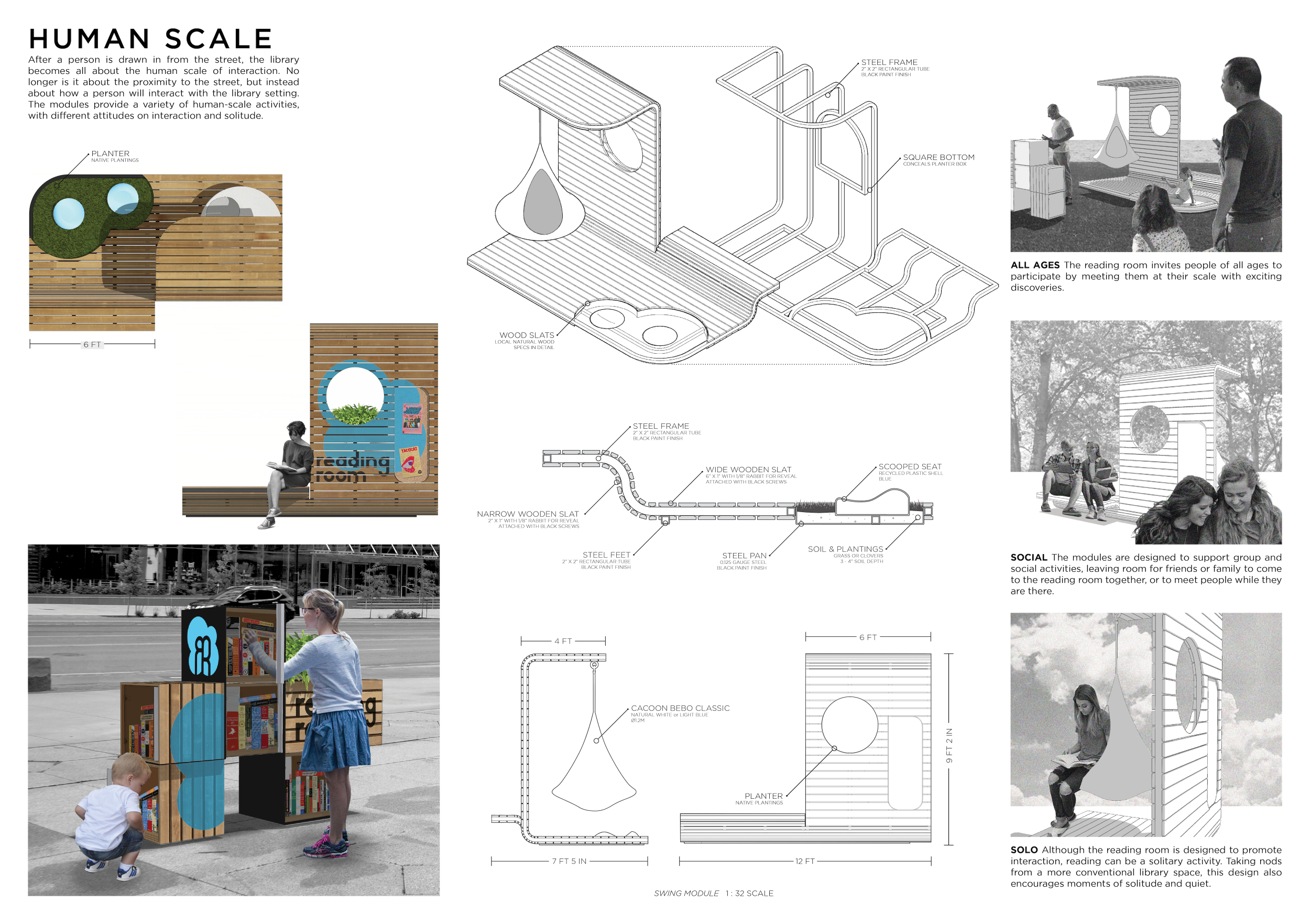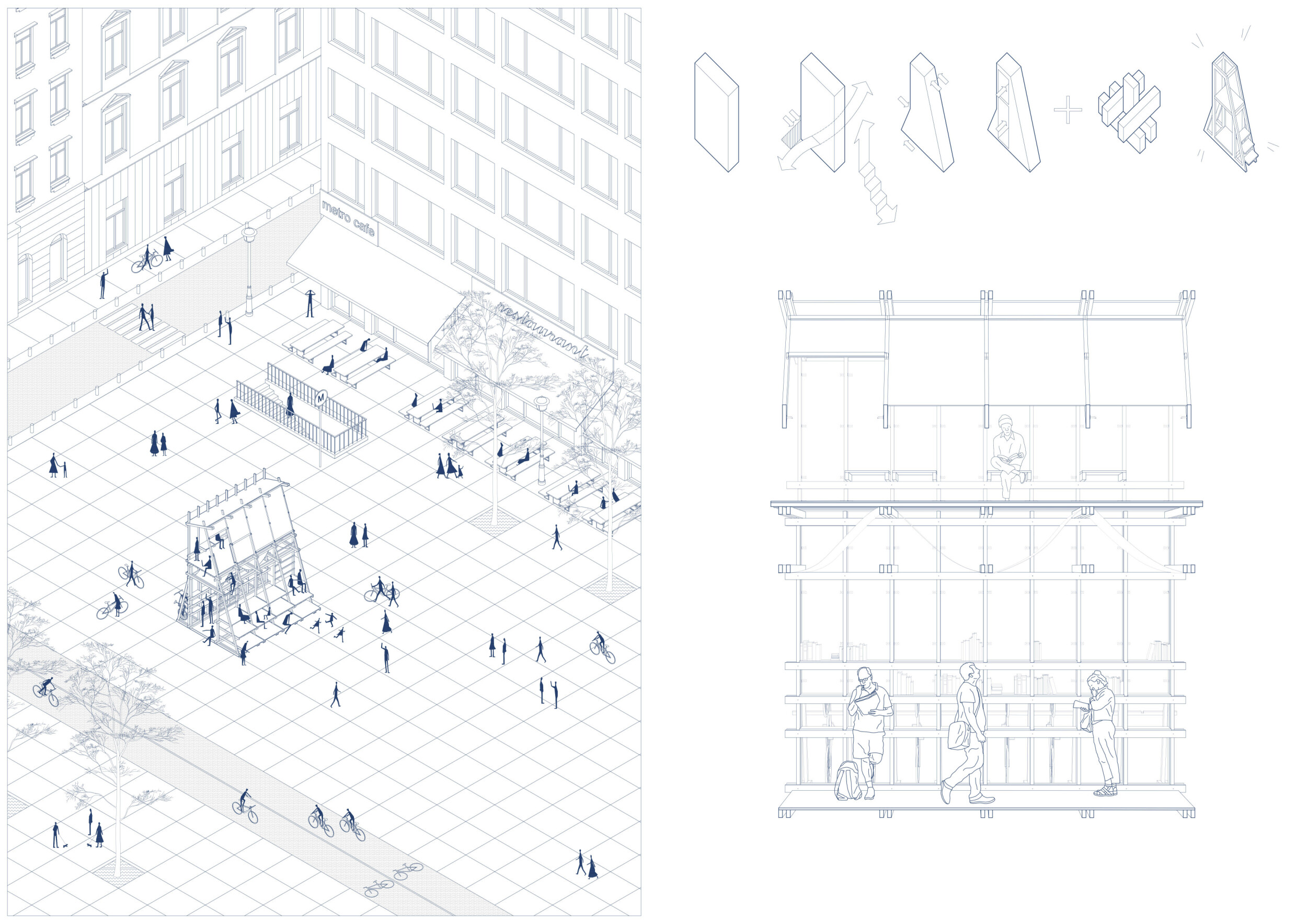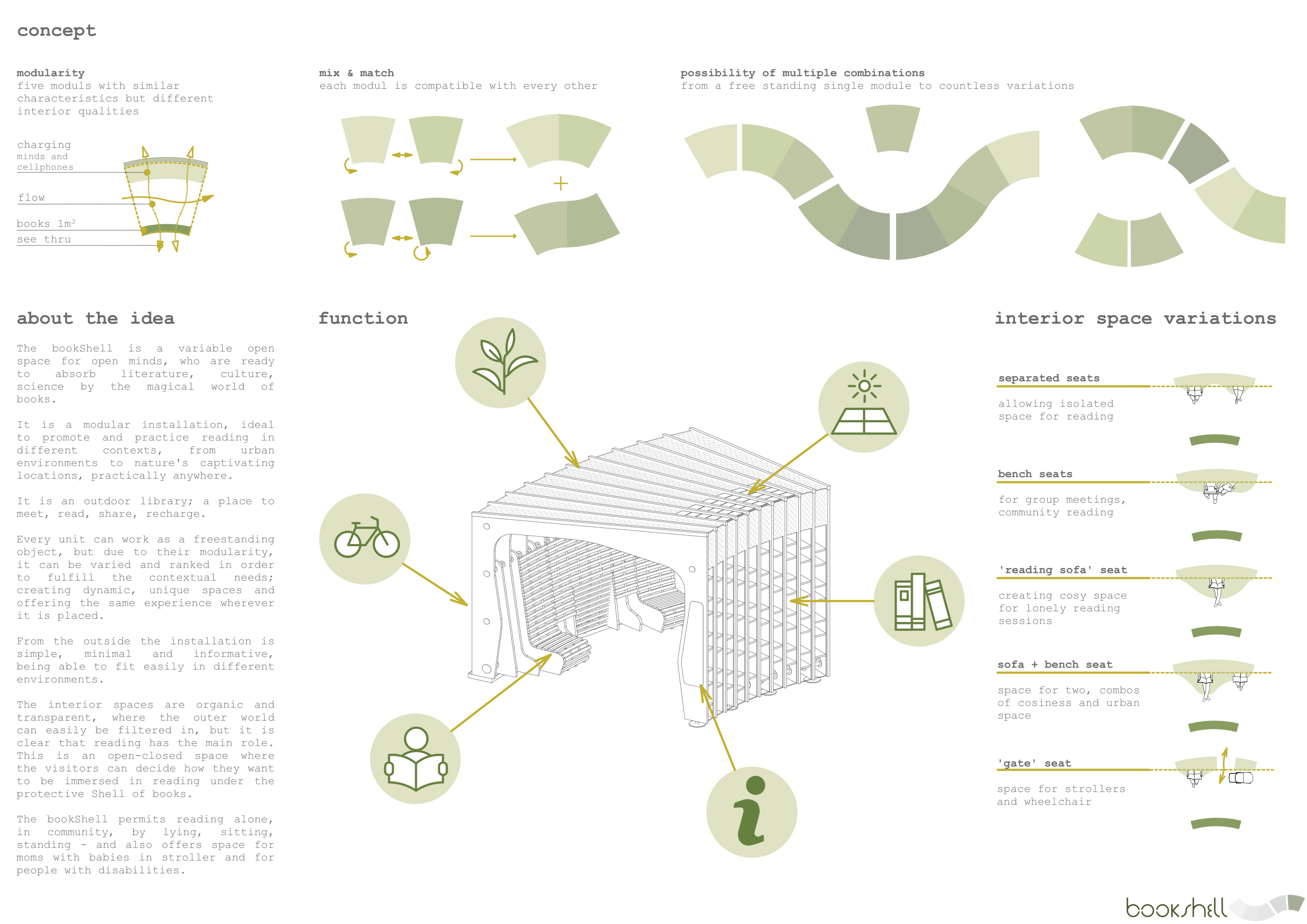 'The Reading Corner' is a modular tent-like structure comprised of 5 wooden panels threaded and held together with a series of light steel tension cables, and topped by a translucent fabric for protection from the elements. The construction offers an intimate reading space. It is also a place to quietly share thoughts or quotations - mobile block letters on tiny shelves can be rearranged by users on a wall embedded with small shelves that hold the text. Read more The jury questions the form and displacement of the book-sharing station from the main structure. However, the project seems easy to fabricate with simple materials, and one can easily imagine this as a popular destination within a park or city plaza.