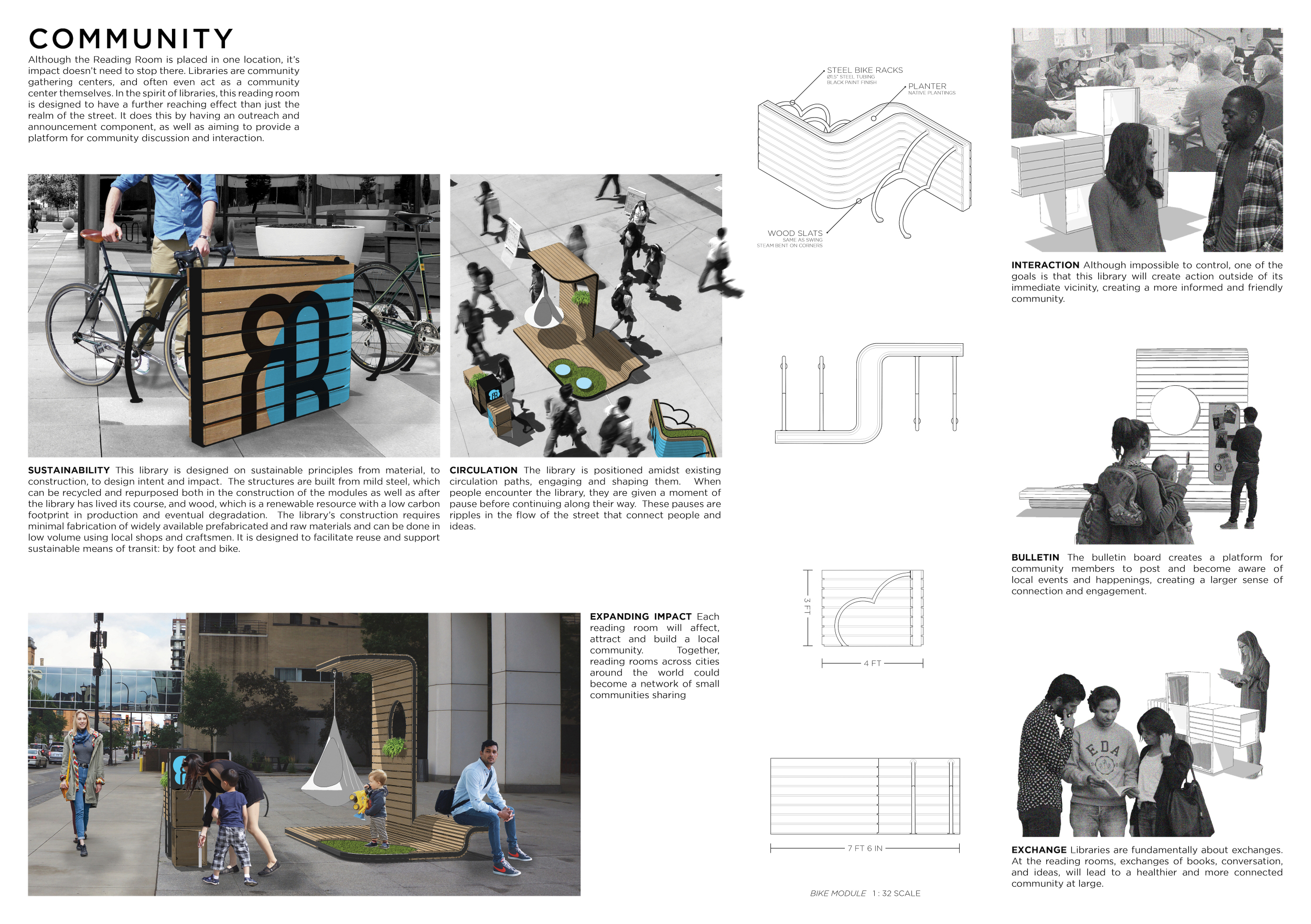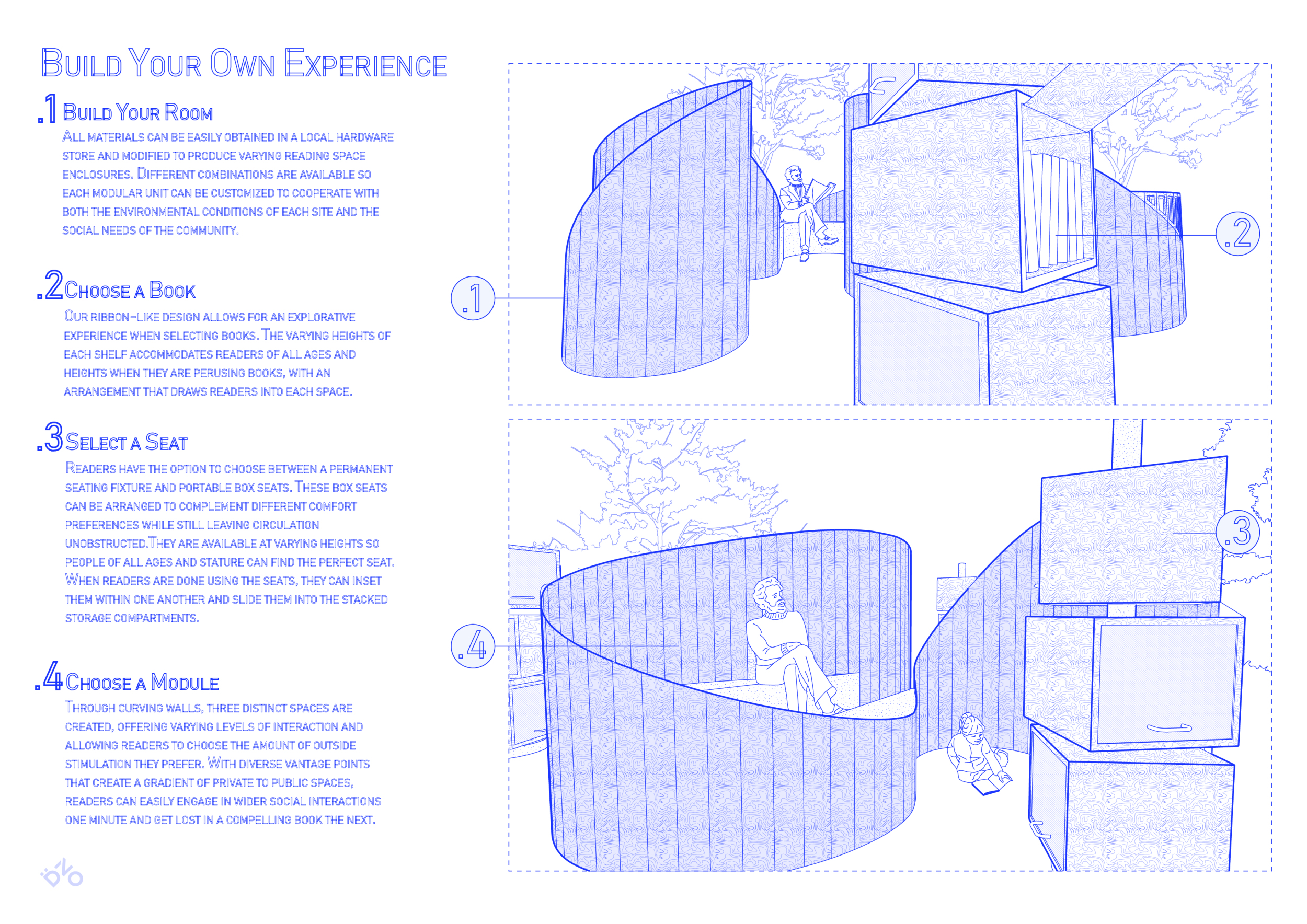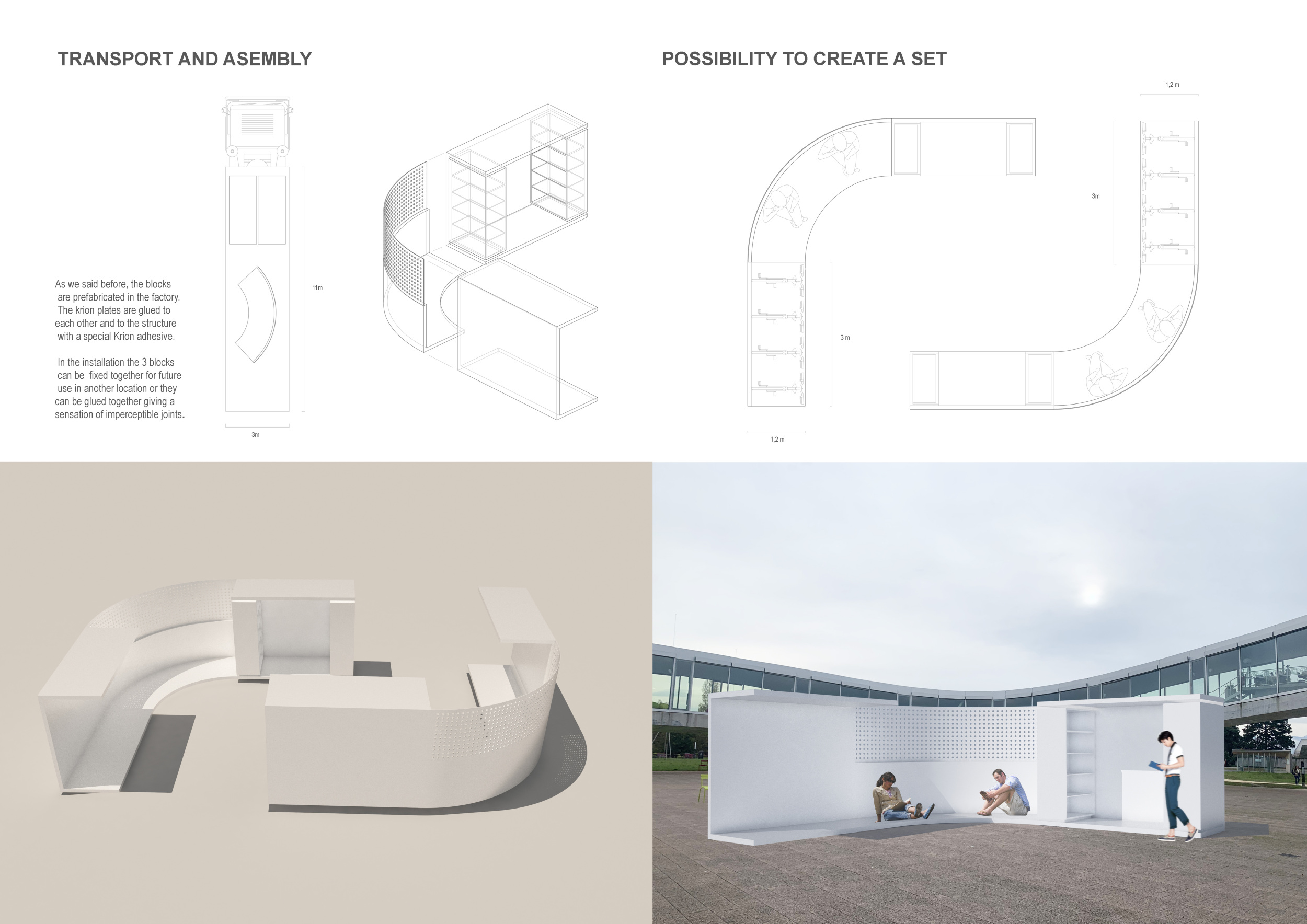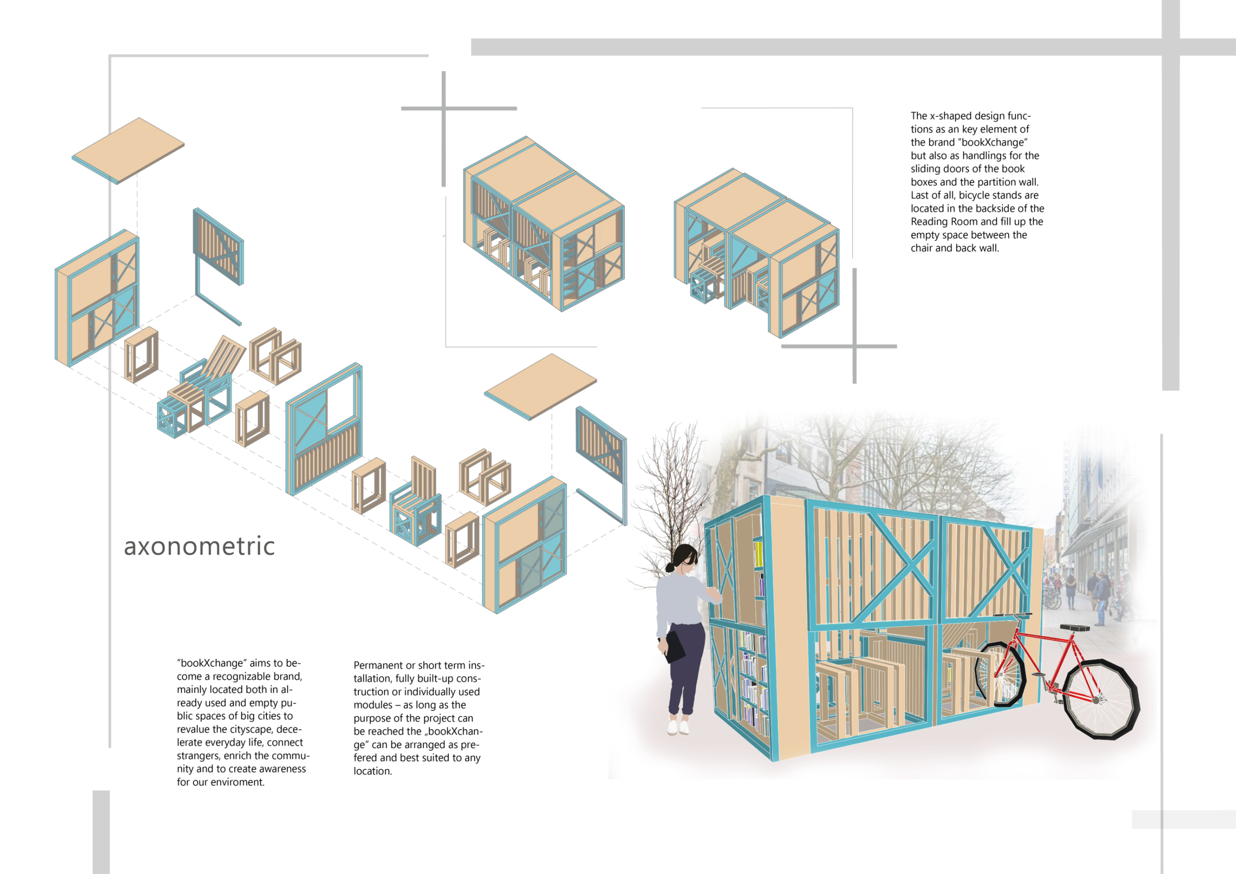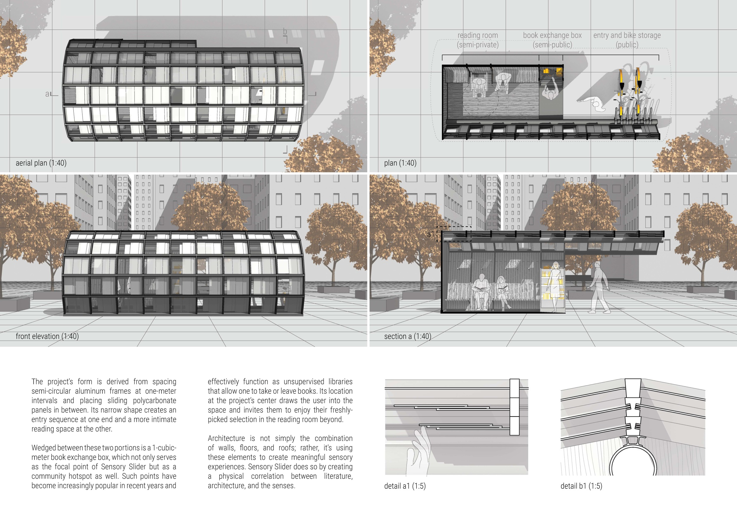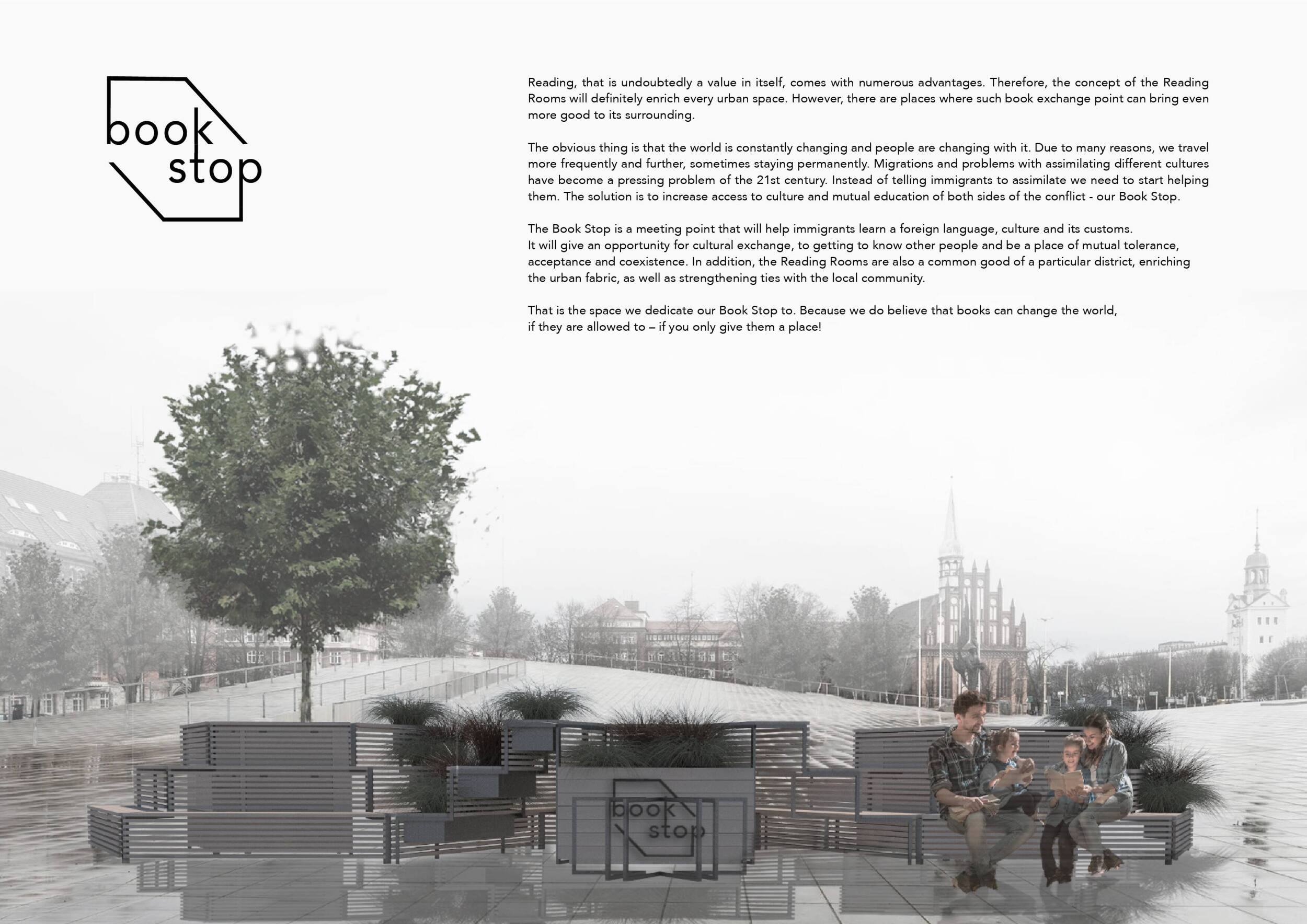 'The Reading Corner' is a modular tent-like structure comprised of 5 wooden panels threaded and held together with a series of light steel tension cables, and topped by a translucent fabric for protection from the elements. The construction offers an intimate reading space. It is also a place to quietly share thoughts or quotations - mobile block letters on tiny shelves can be rearranged by users on a wall embedded with small shelves that hold the text. Read more The jury questions the form and displacement of the book-sharing station from the main structure. However, the project seems easy to fabricate with simple materials, and one can easily imagine this as a popular destination within a park or city plaza.