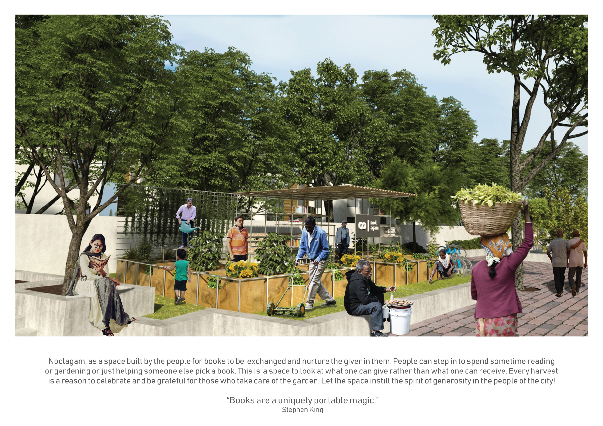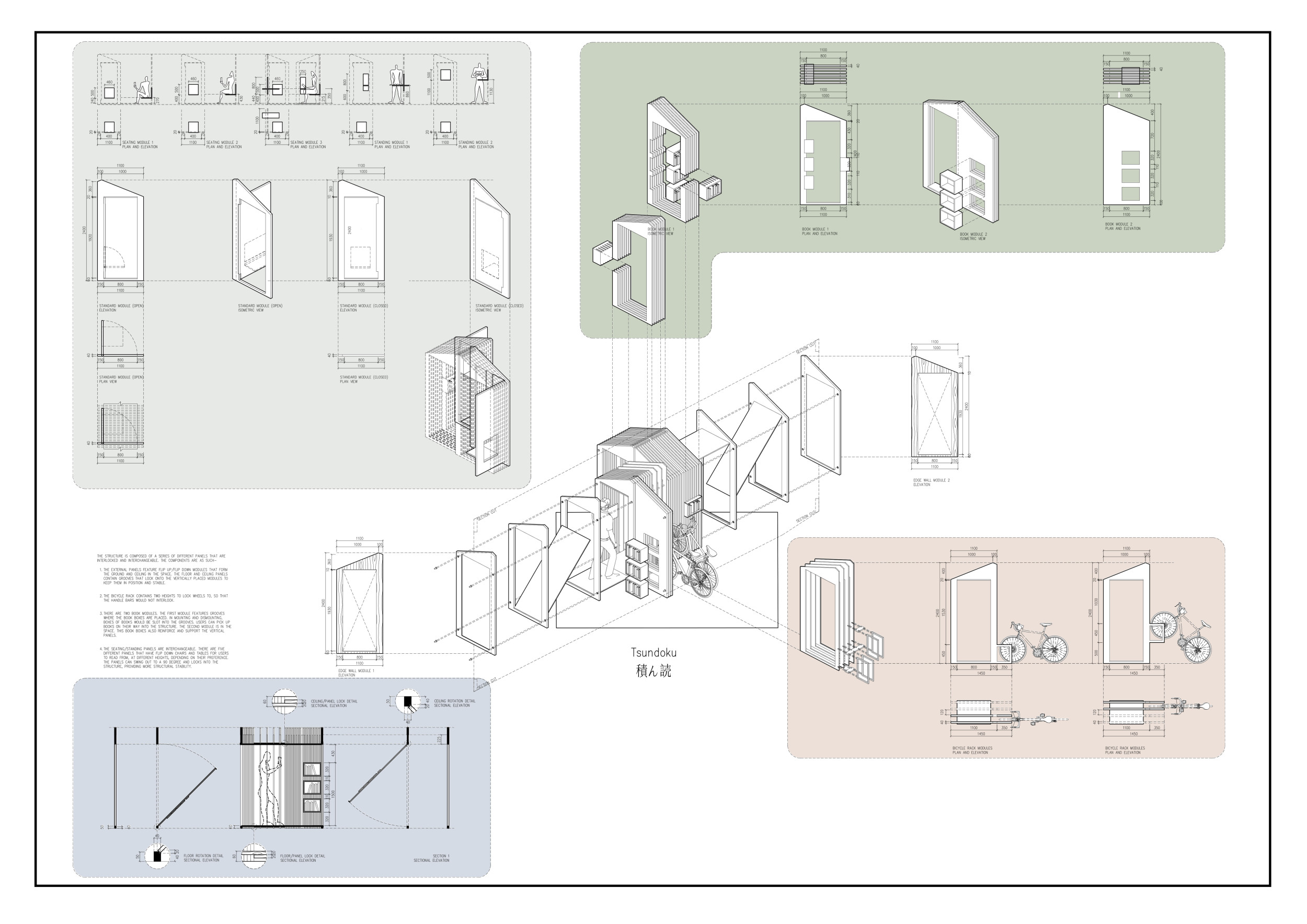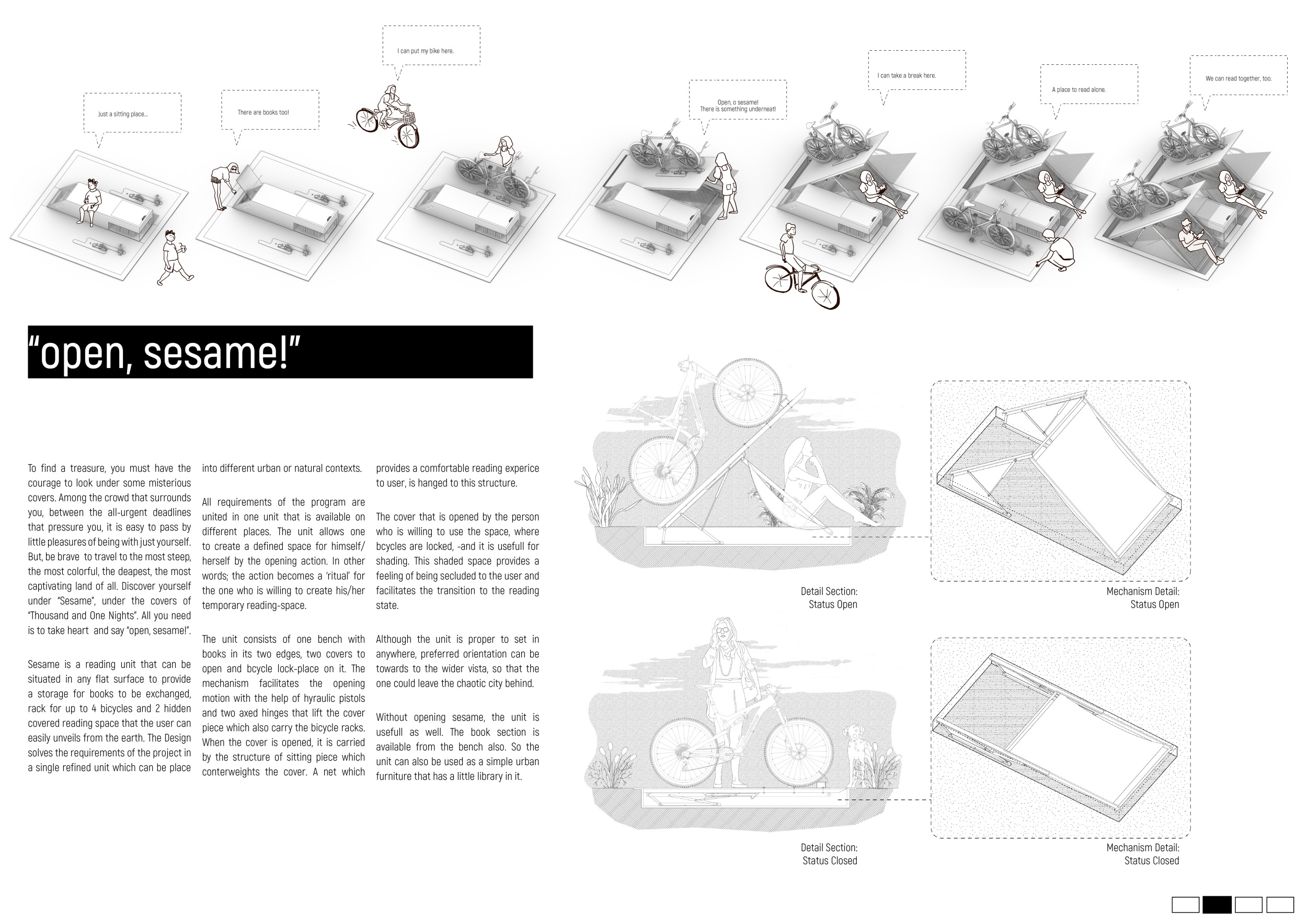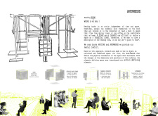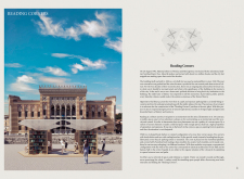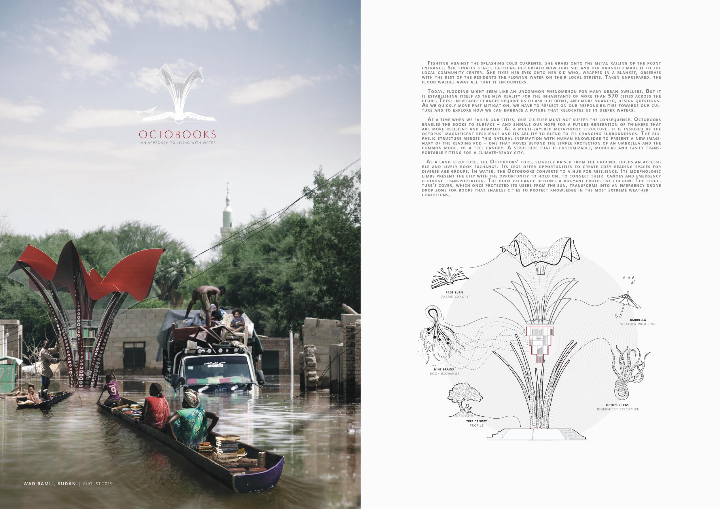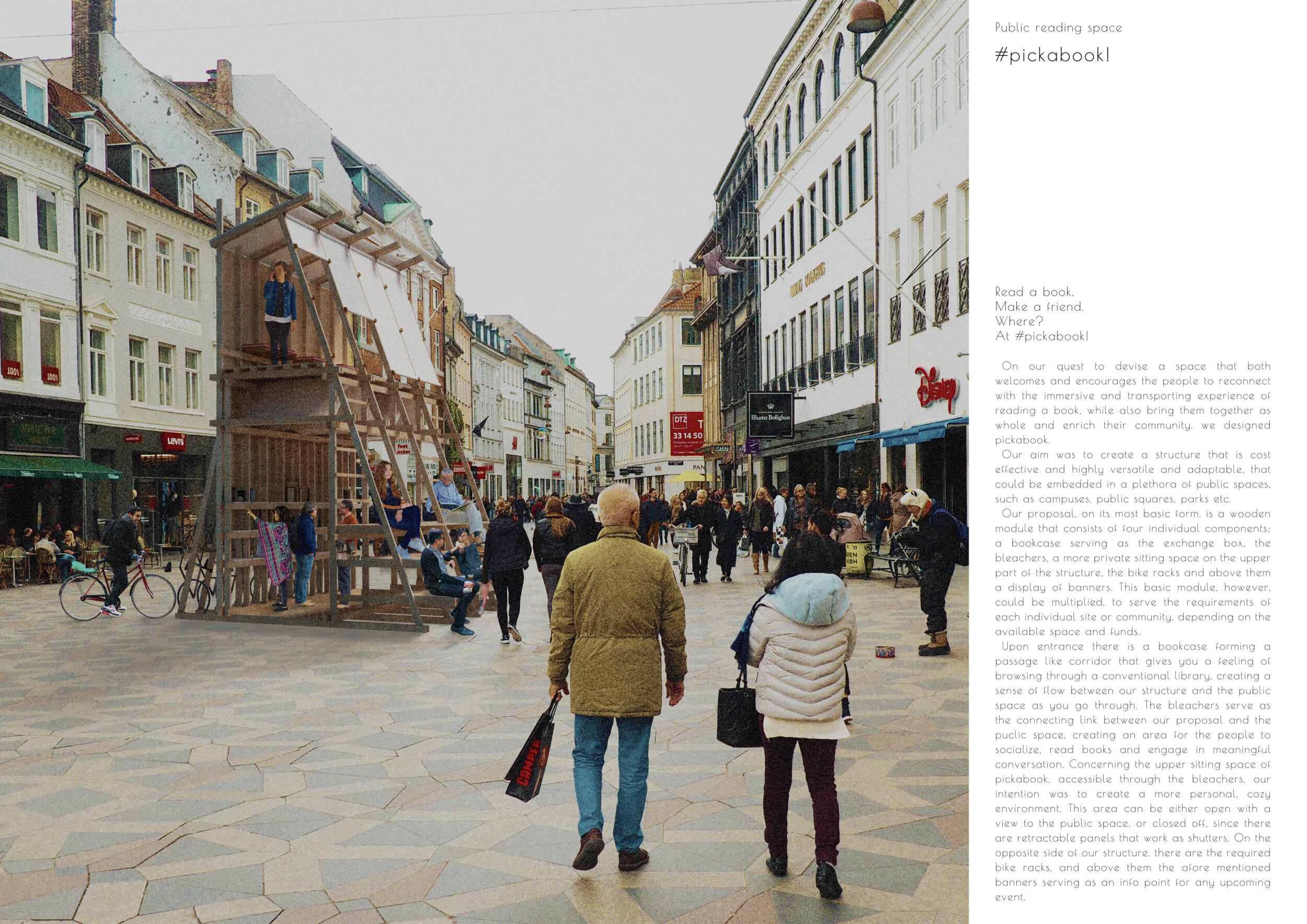 'The Reading Corner' is a modular tent-like structure comprised of 5 wooden panels threaded and held together with a series of light steel tension cables, and topped by a translucent fabric for protection from the elements. The construction offers an intimate reading space. It is also a place to quietly share thoughts or quotations - mobile block letters on tiny shelves can be rearranged by users on a wall embedded with small shelves that hold the text. Read more The jury questions the form and displacement of the book-sharing station from the main structure. However, the project seems easy to fabricate with simple materials, and one can easily imagine this as a popular destination within a park or city plaza.