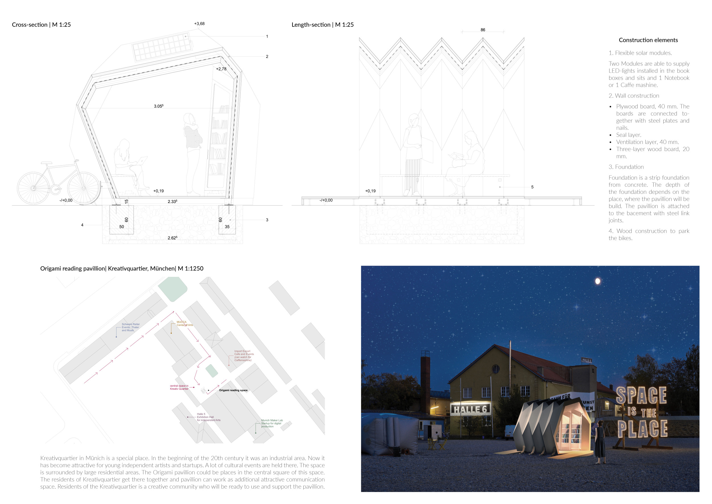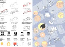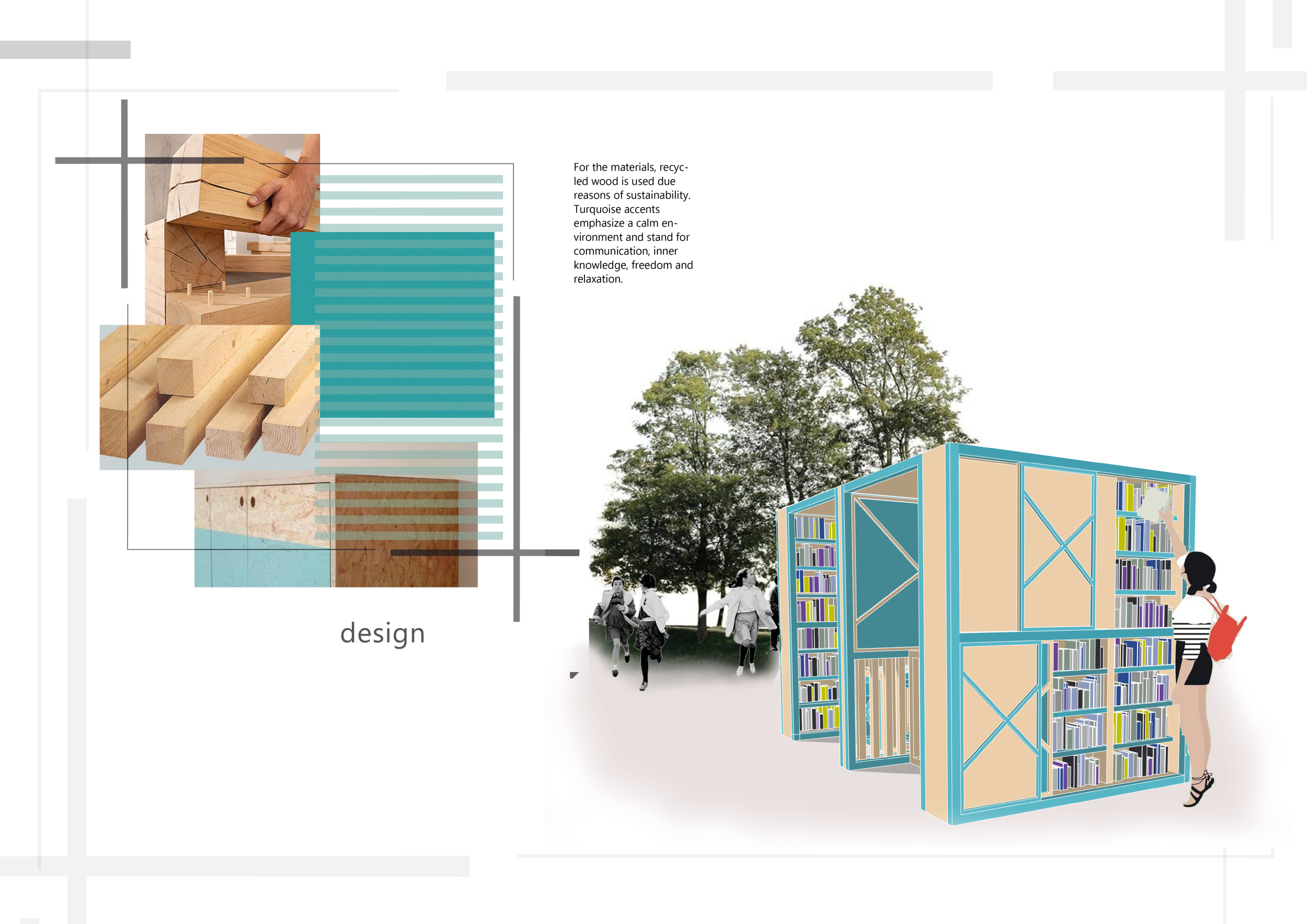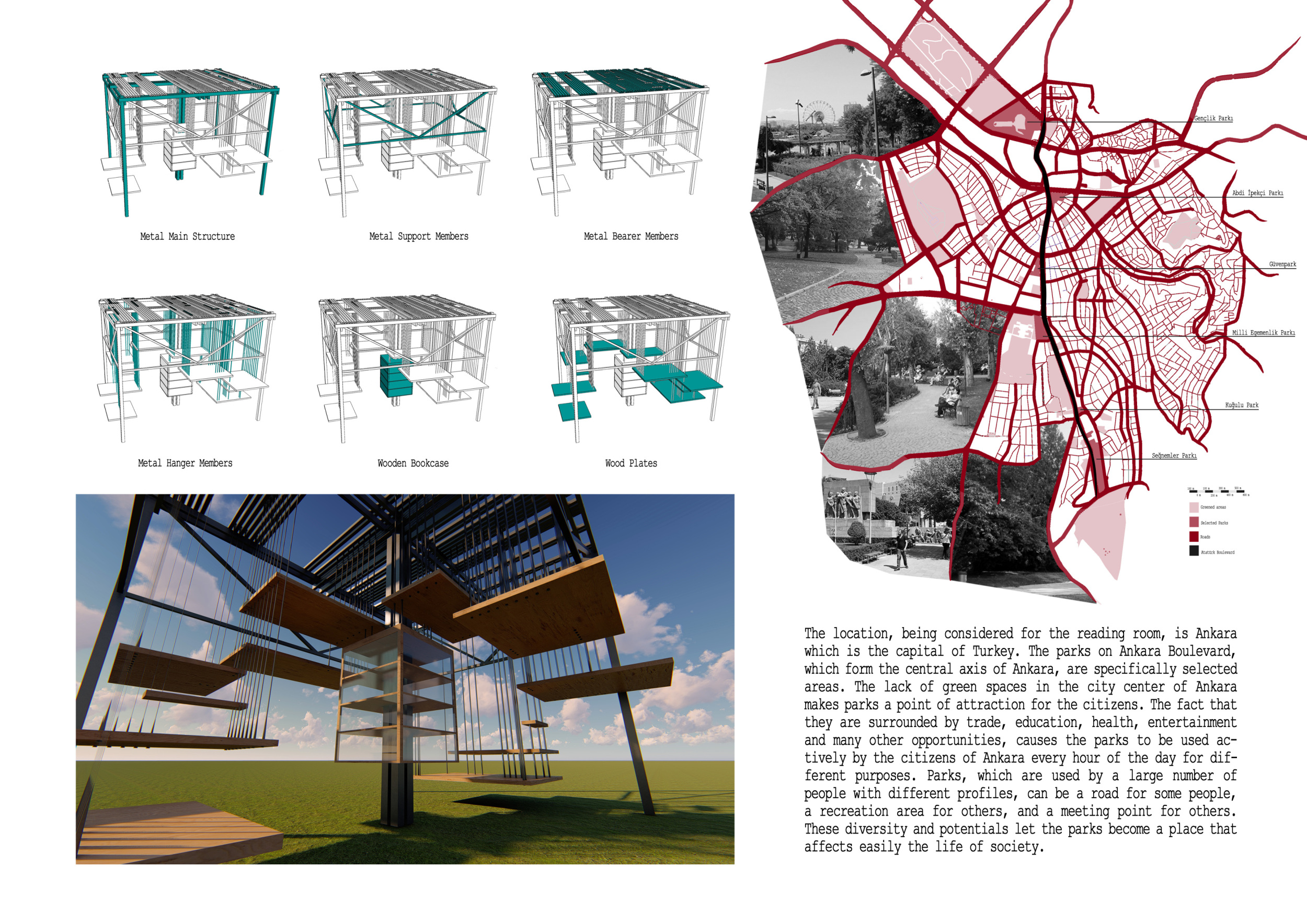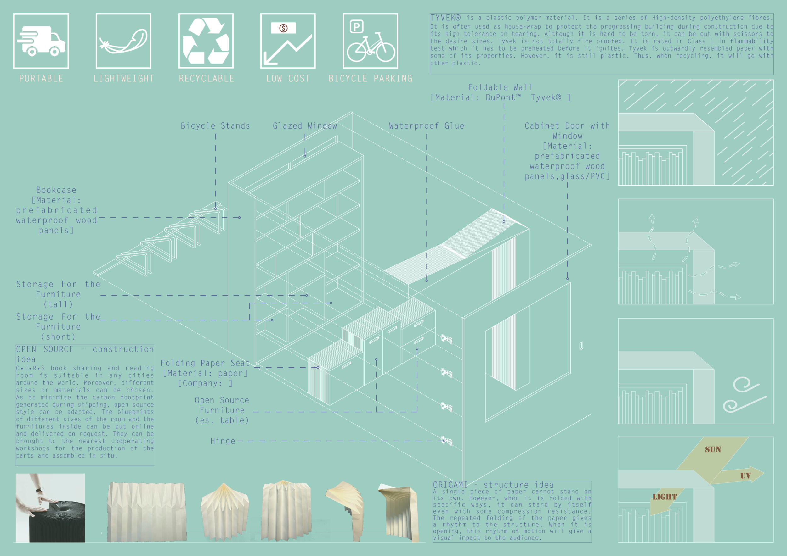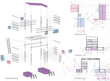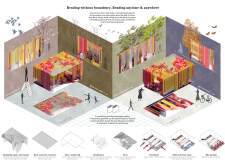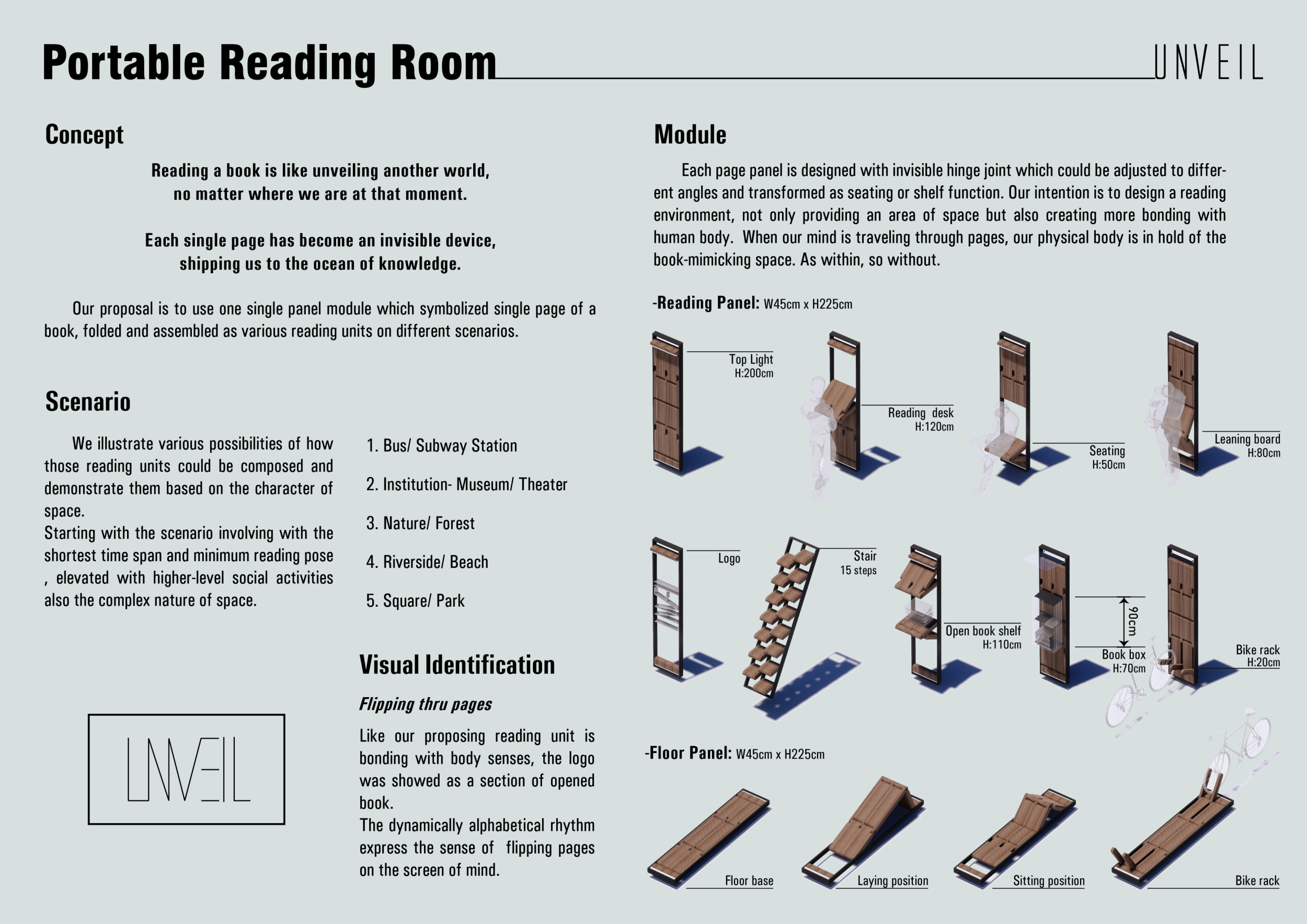 'The Reading Corner' is a modular tent-like structure comprised of 5 wooden panels threaded and held together with a series of light steel tension cables, and topped by a translucent fabric for protection from the elements. The construction offers an intimate reading space. It is also a place to quietly share thoughts or quotations - mobile block letters on tiny shelves can be rearranged by users on a wall embedded with small shelves that hold the text. Read more The jury questions the form and displacement of the book-sharing station from the main structure. However, the project seems easy to fabricate with simple materials, and one can easily imagine this as a popular destination within a park or city plaza.