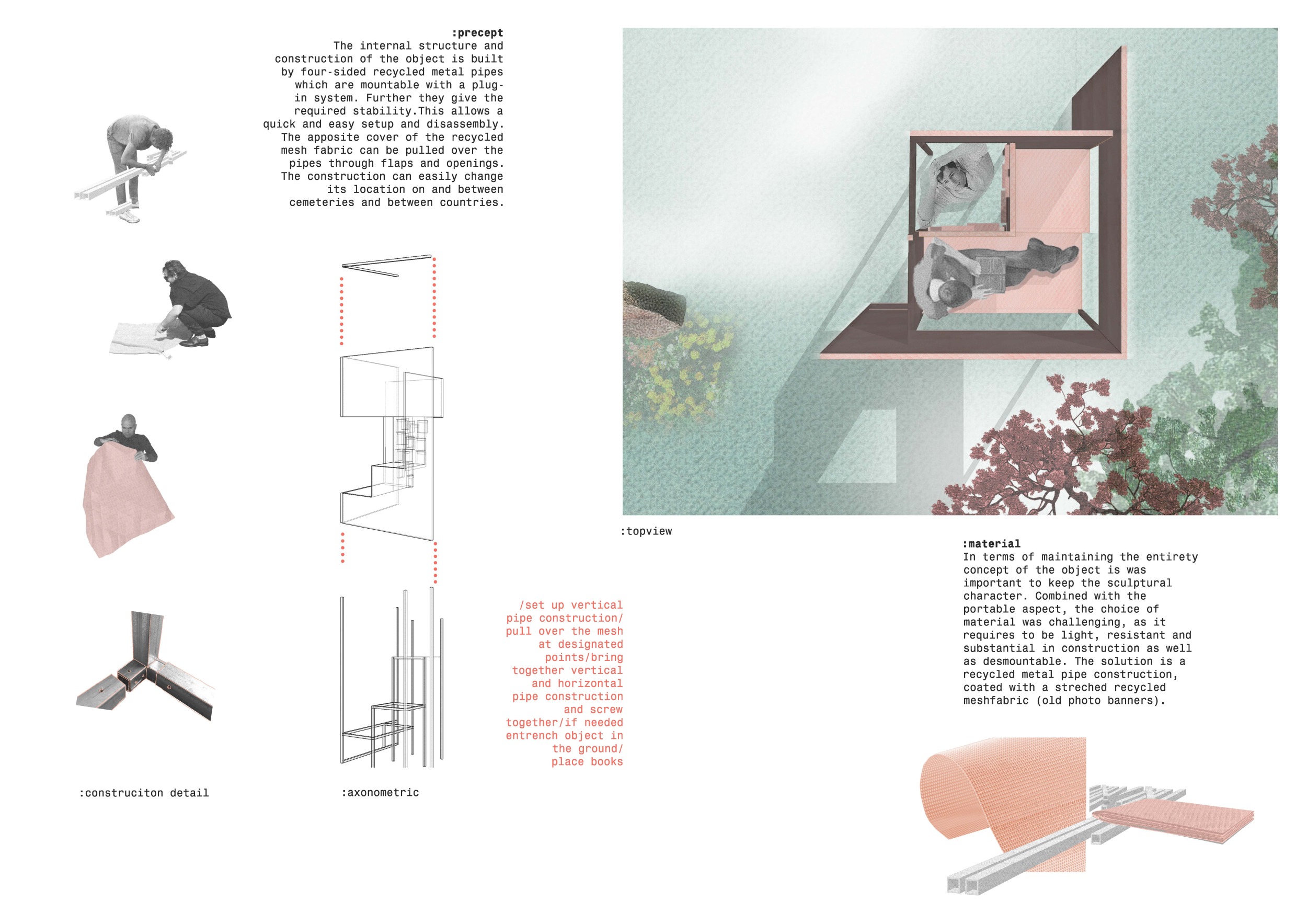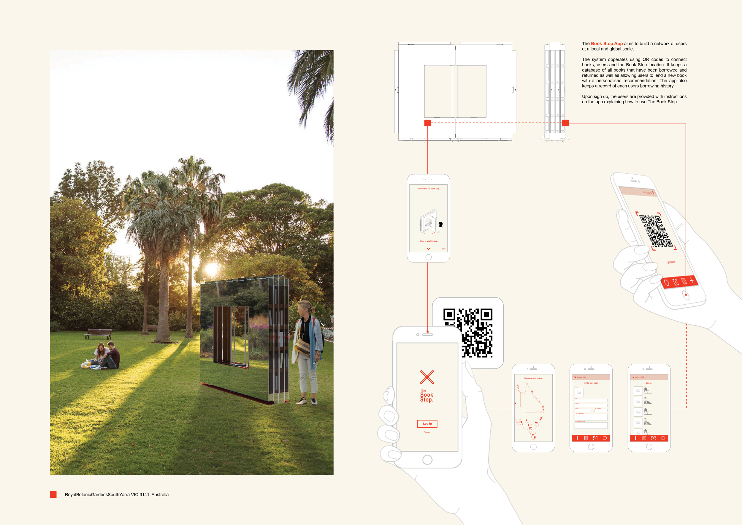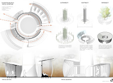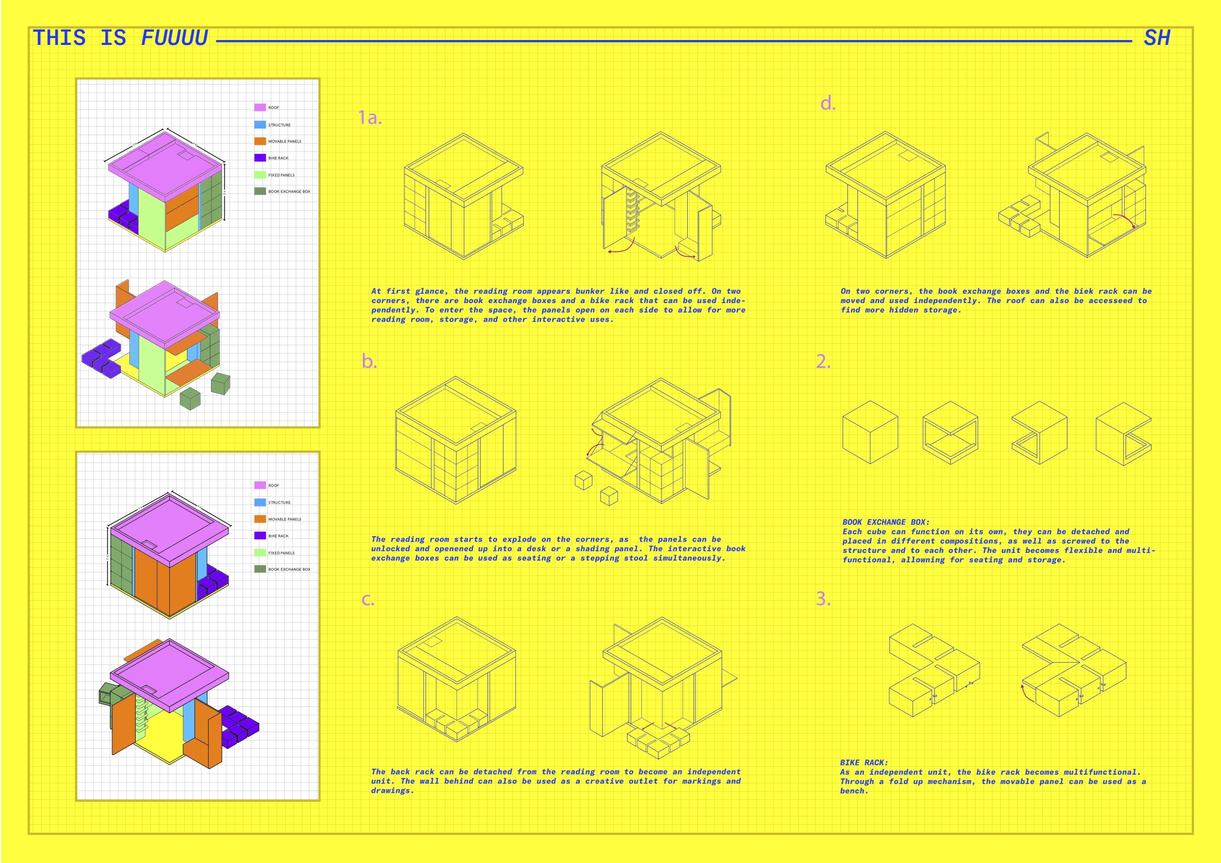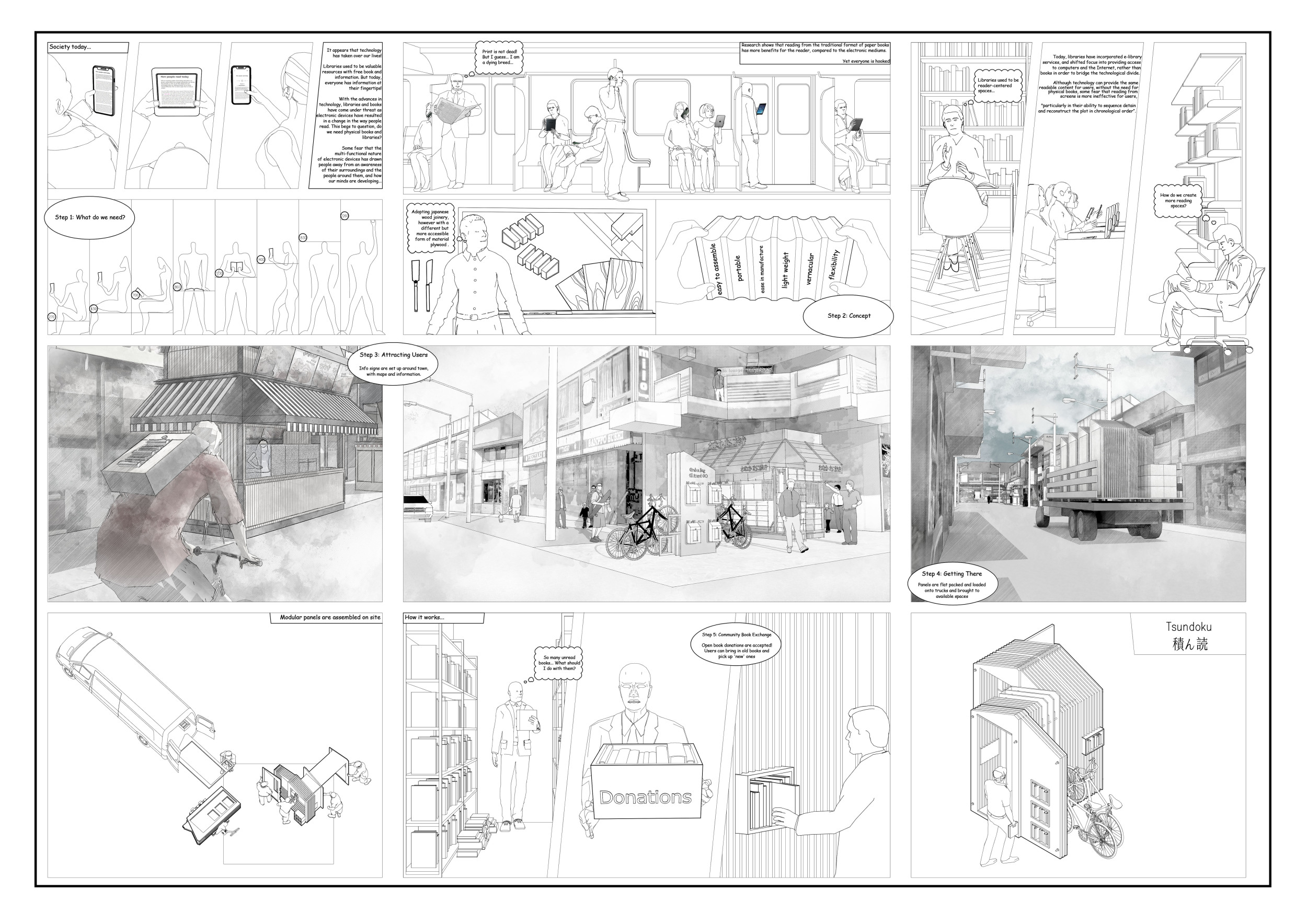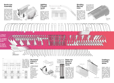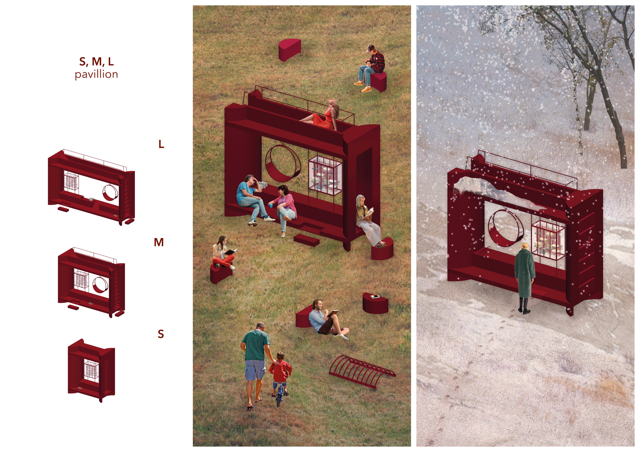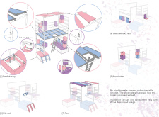 'The Reading Corner' is a modular tent-like structure comprised of 5 wooden panels threaded and held together with a series of light steel tension cables, and topped by a translucent fabric for protection from the elements. The construction offers an intimate reading space. It is also a place to quietly share thoughts or quotations - mobile block letters on tiny shelves can be rearranged by users on a wall embedded with small shelves that hold the text. Read more The jury questions the form and displacement of the book-sharing station from the main structure. However, the project seems easy to fabricate with simple materials, and one can easily imagine this as a popular destination within a park or city plaza.