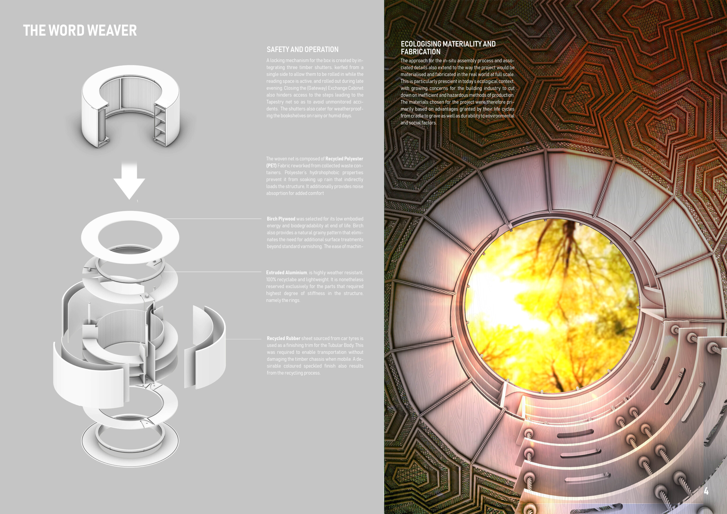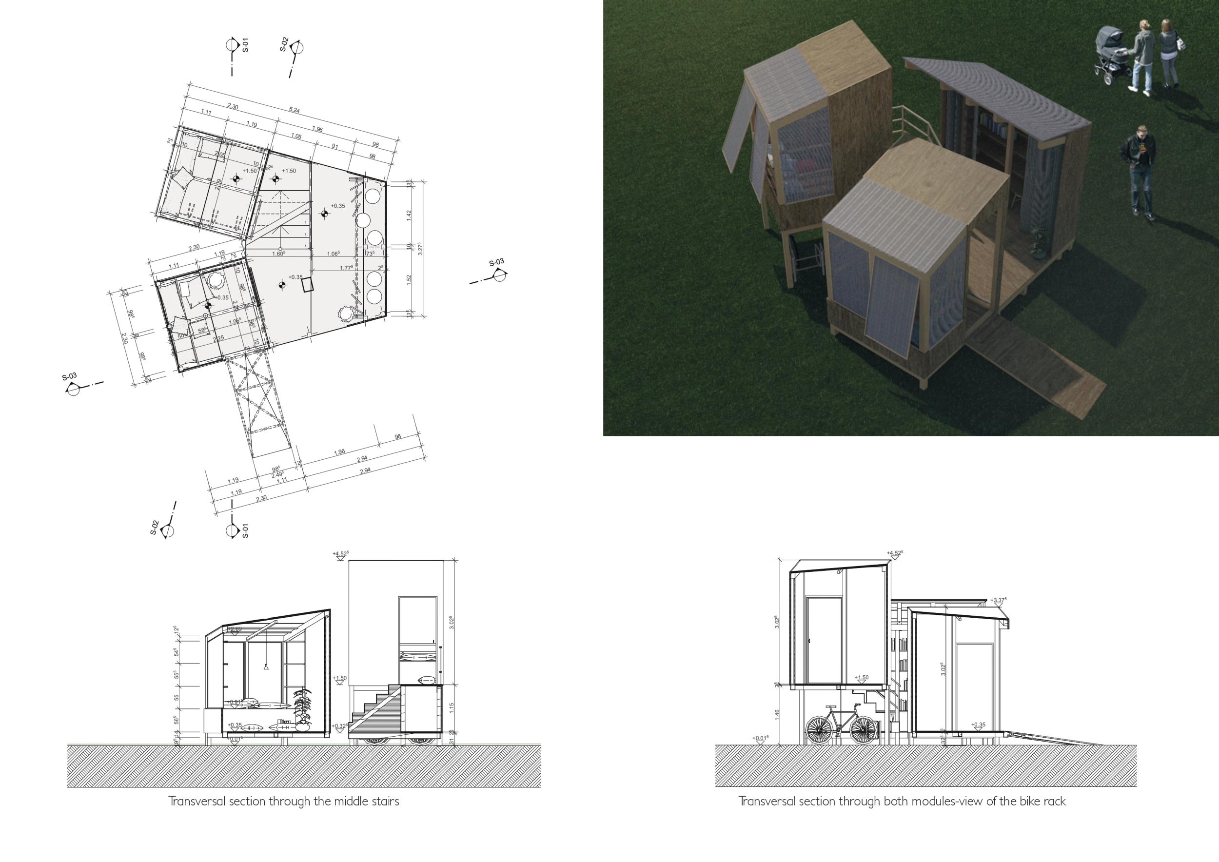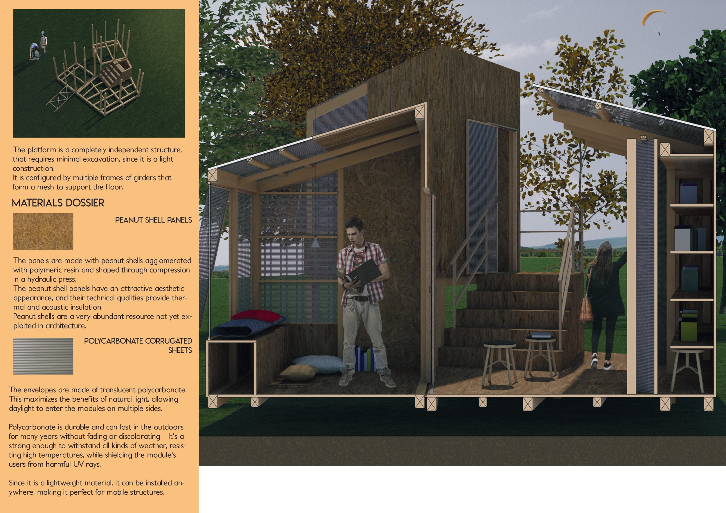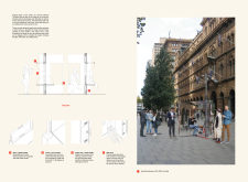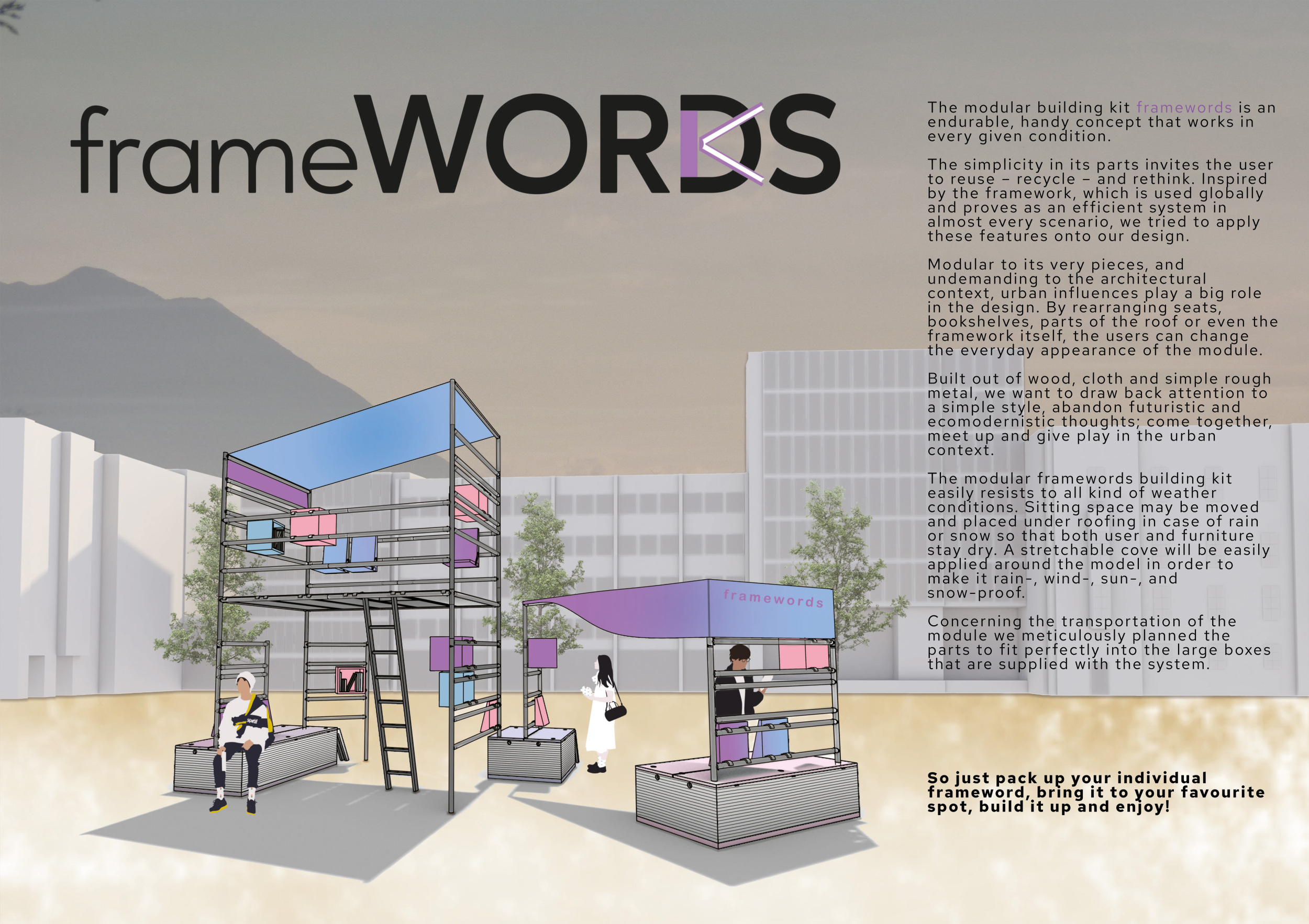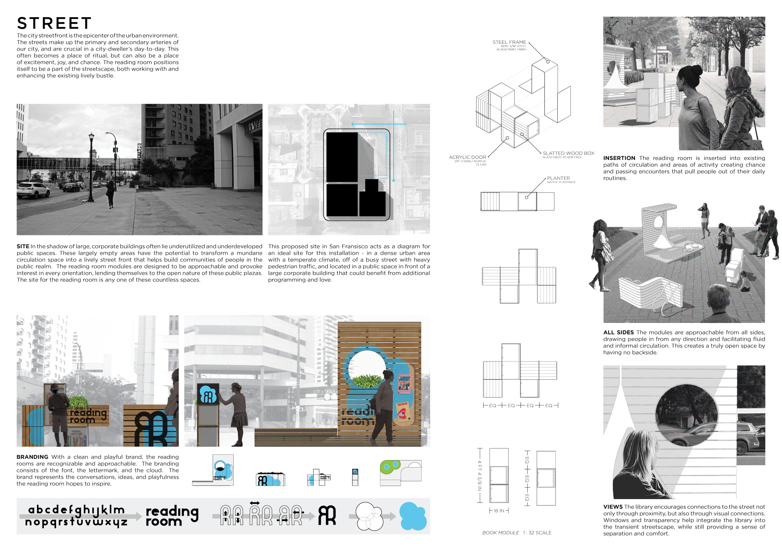 'The Reading Corner' is a modular tent-like structure comprised of 5 wooden panels threaded and held together with a series of light steel tension cables, and topped by a translucent fabric for protection from the elements. The construction offers an intimate reading space. It is also a place to quietly share thoughts or quotations - mobile block letters on tiny shelves can be rearranged by users on a wall embedded with small shelves that hold the text. Read more The jury questions the form and displacement of the book-sharing station from the main structure. However, the project seems easy to fabricate with simple materials, and one can easily imagine this as a popular destination within a park or city plaza.