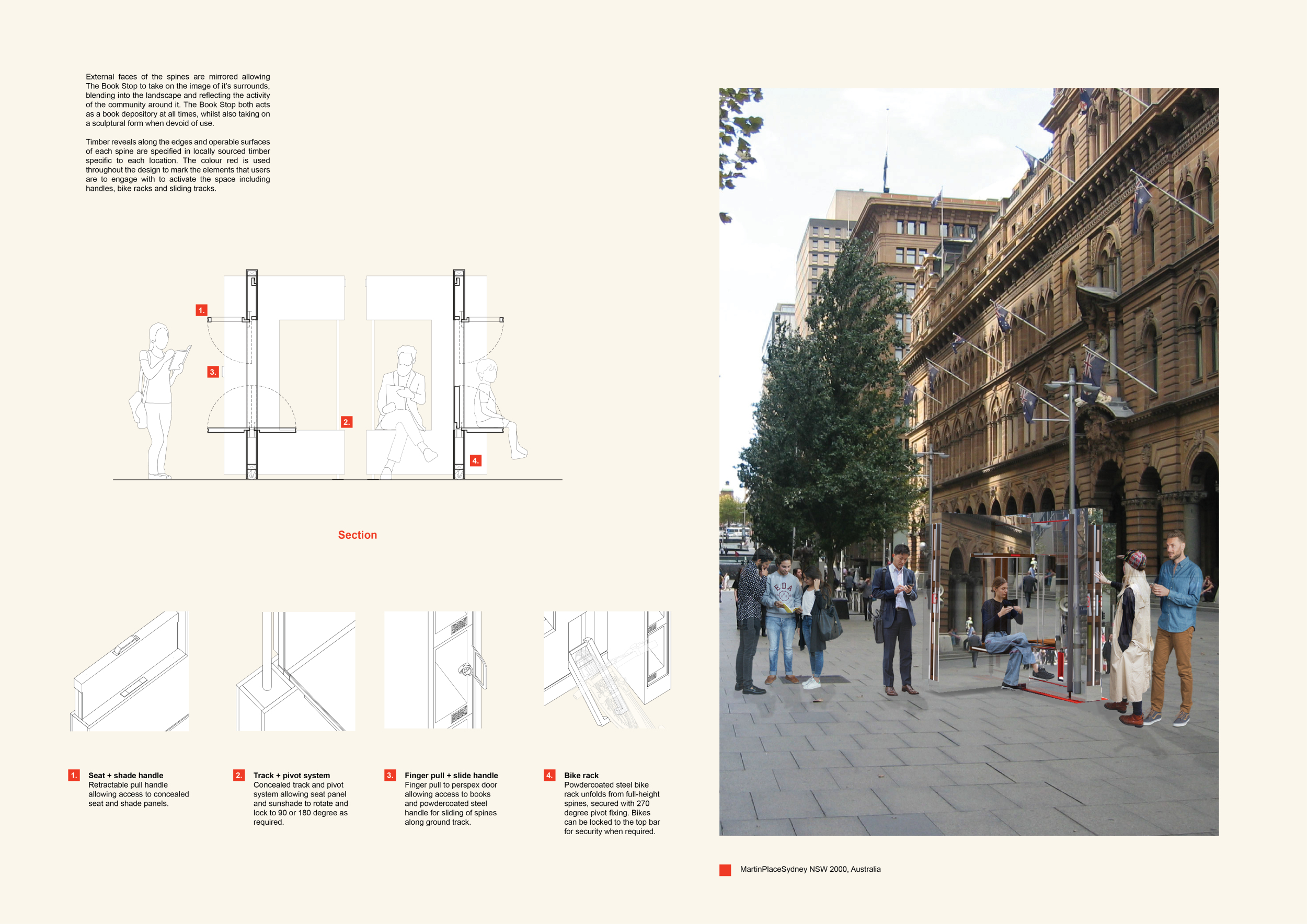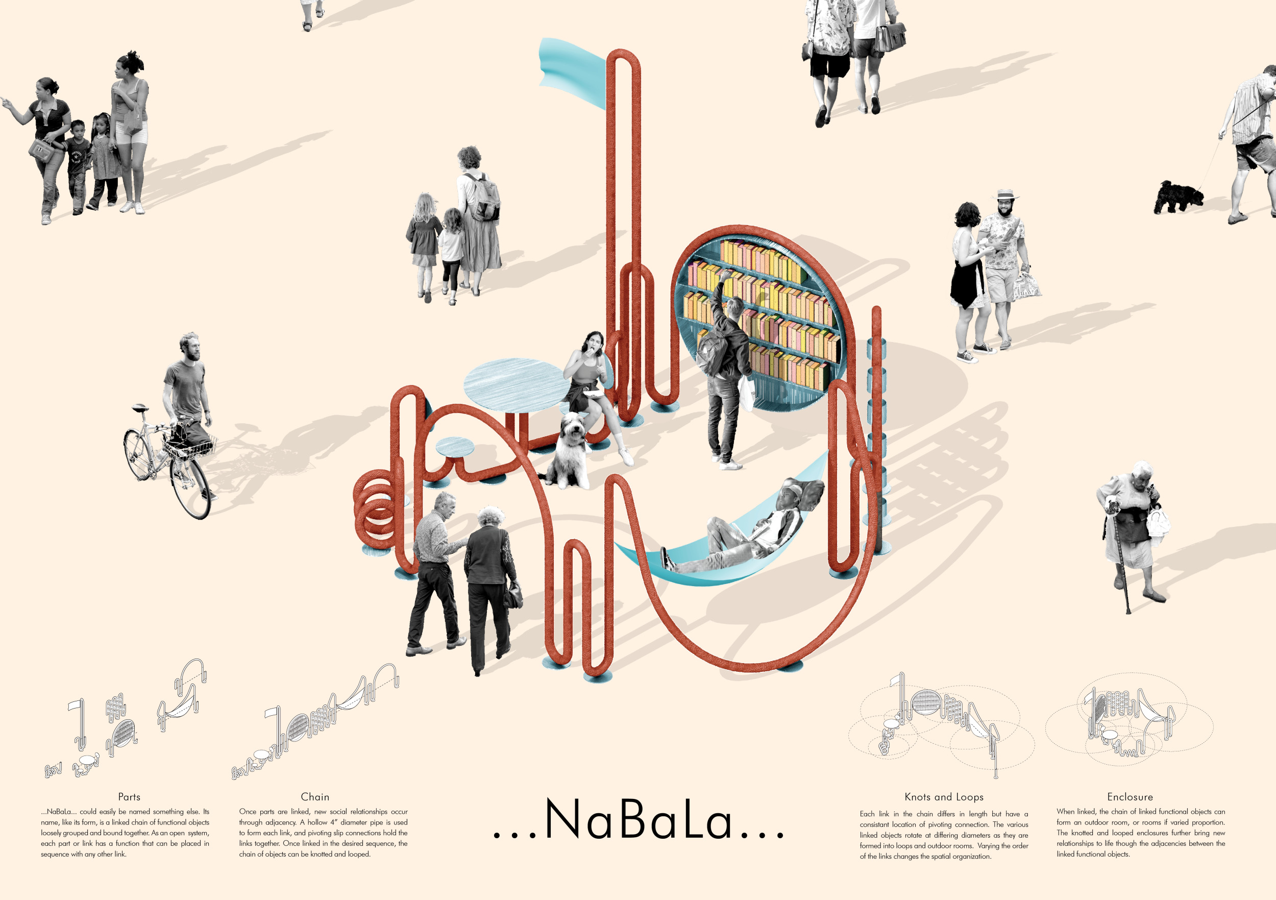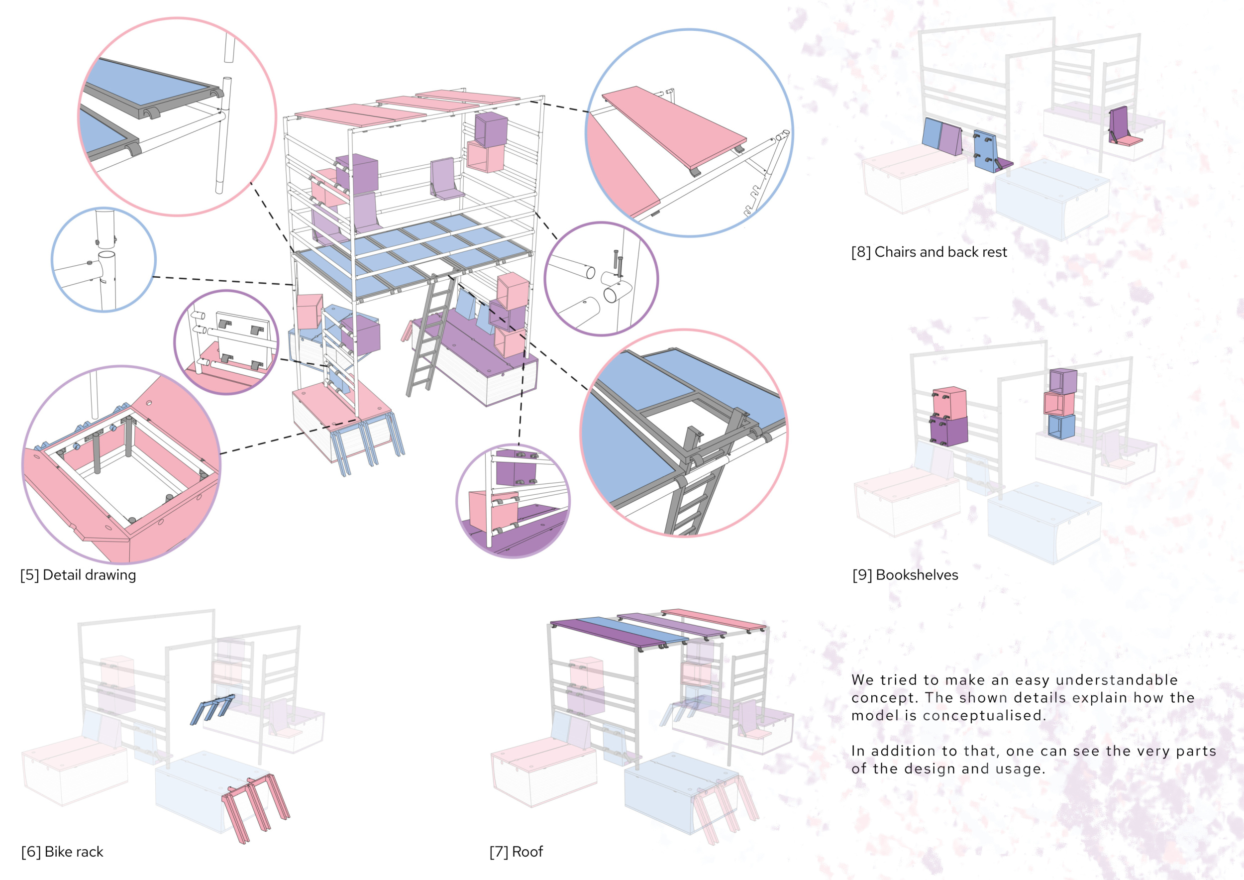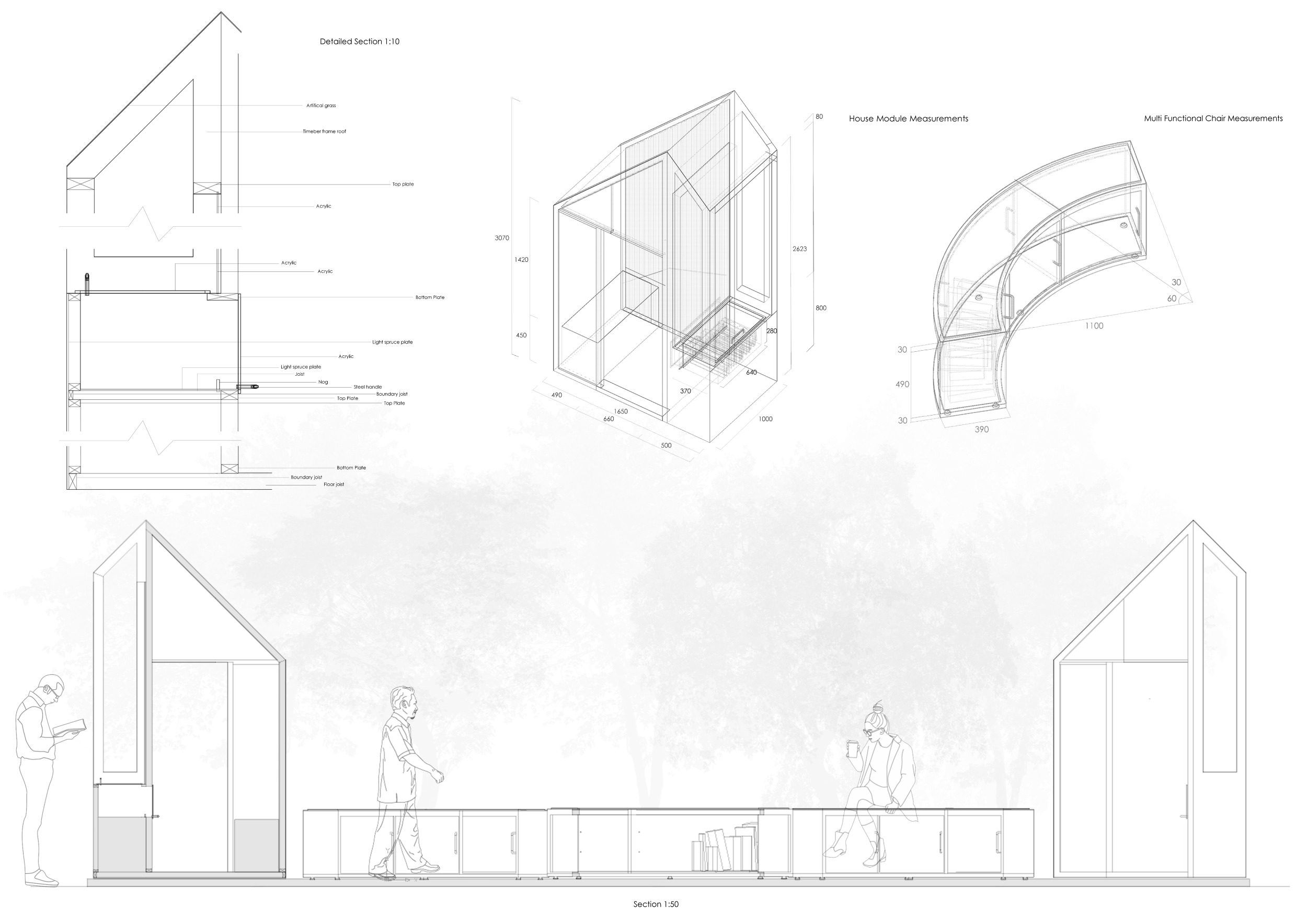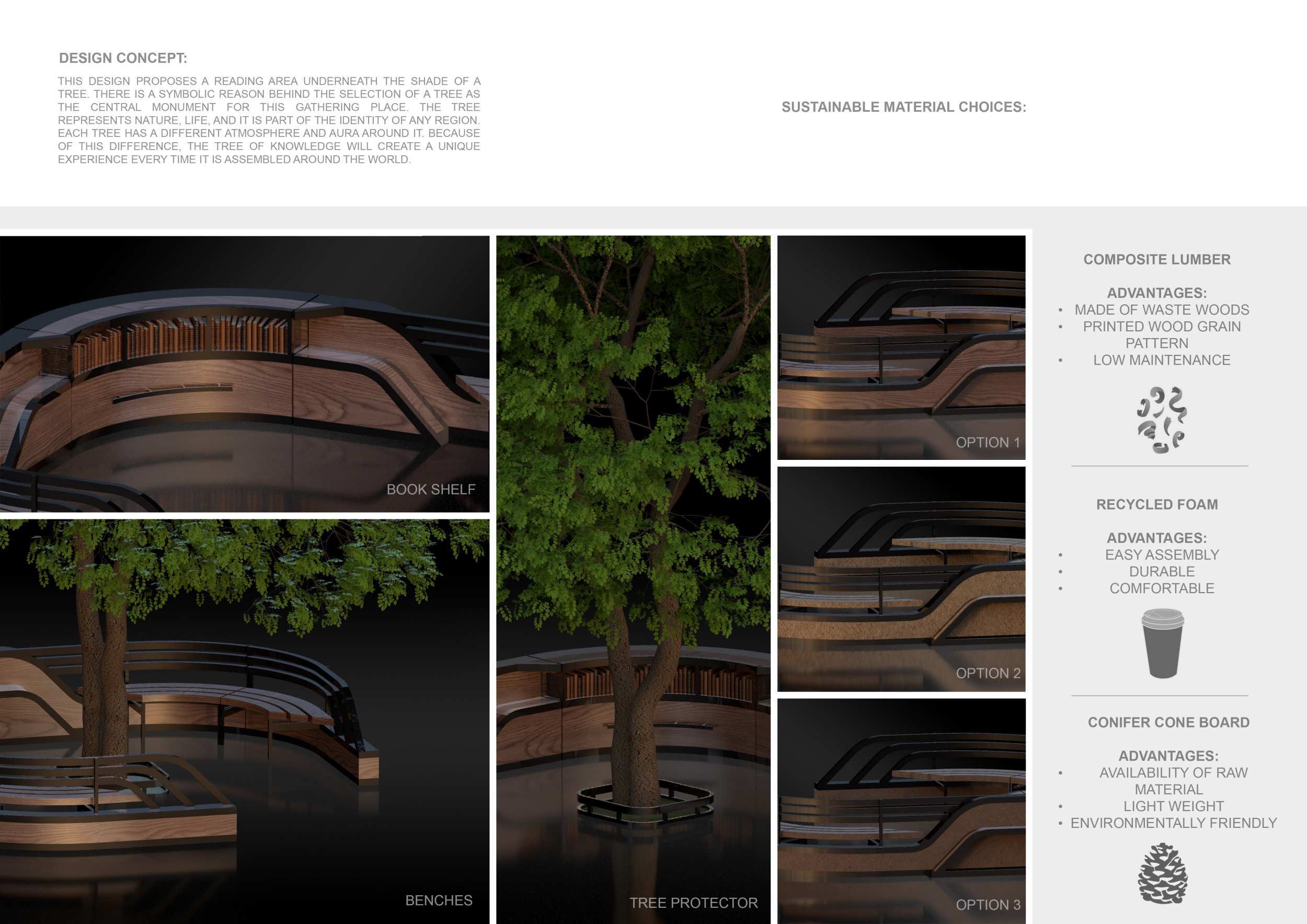 'The Reading Corner' is a modular tent-like structure comprised of 5 wooden panels threaded and held together with a series of light steel tension cables, and topped by a translucent fabric for protection from the elements. The construction offers an intimate reading space. It is also a place to quietly share thoughts or quotations - mobile block letters on tiny shelves can be rearranged by users on a wall embedded with small shelves that hold the text. Read more The jury questions the form and displacement of the book-sharing station from the main structure. However, the project seems easy to fabricate with simple materials, and one can easily imagine this as a popular destination within a park or city plaza.