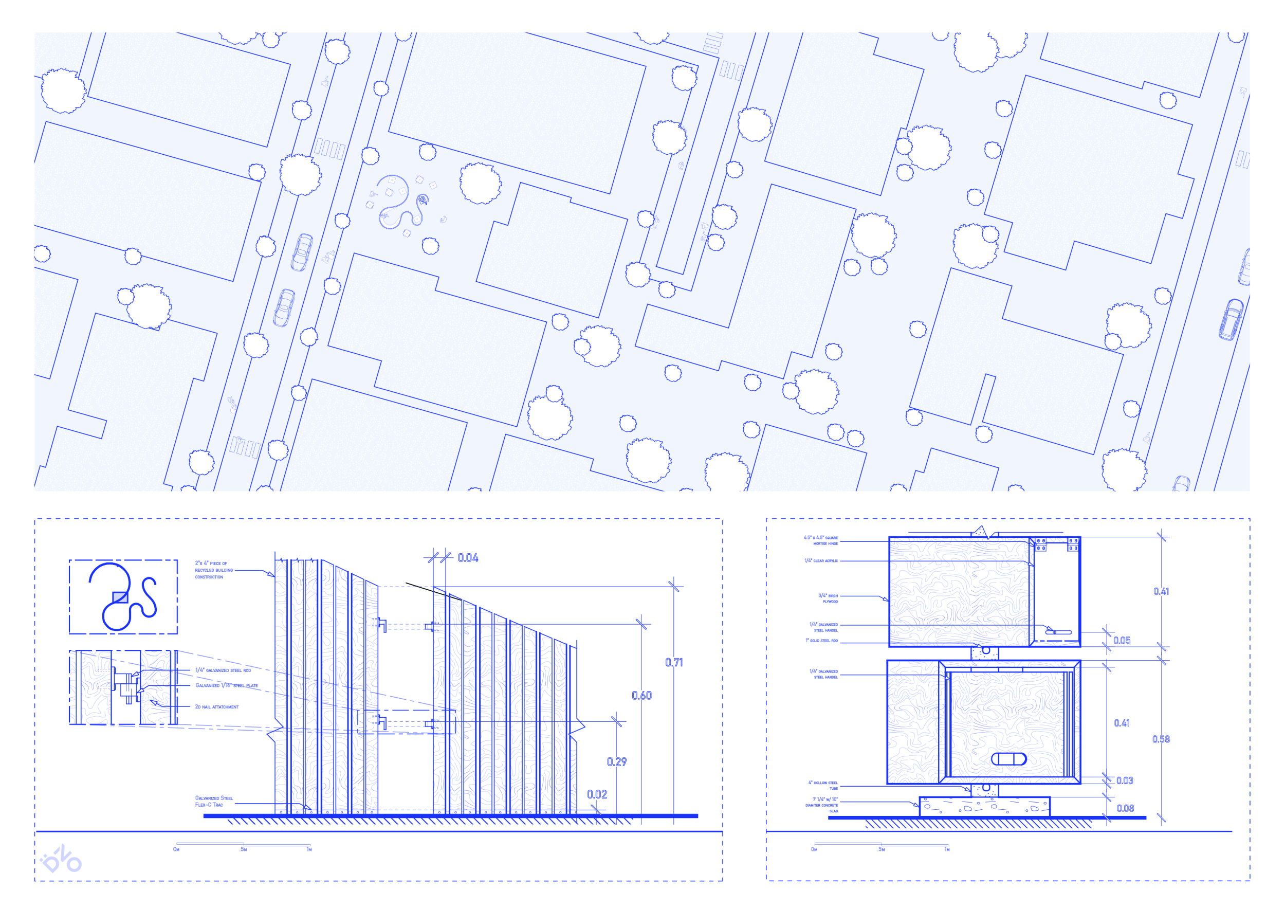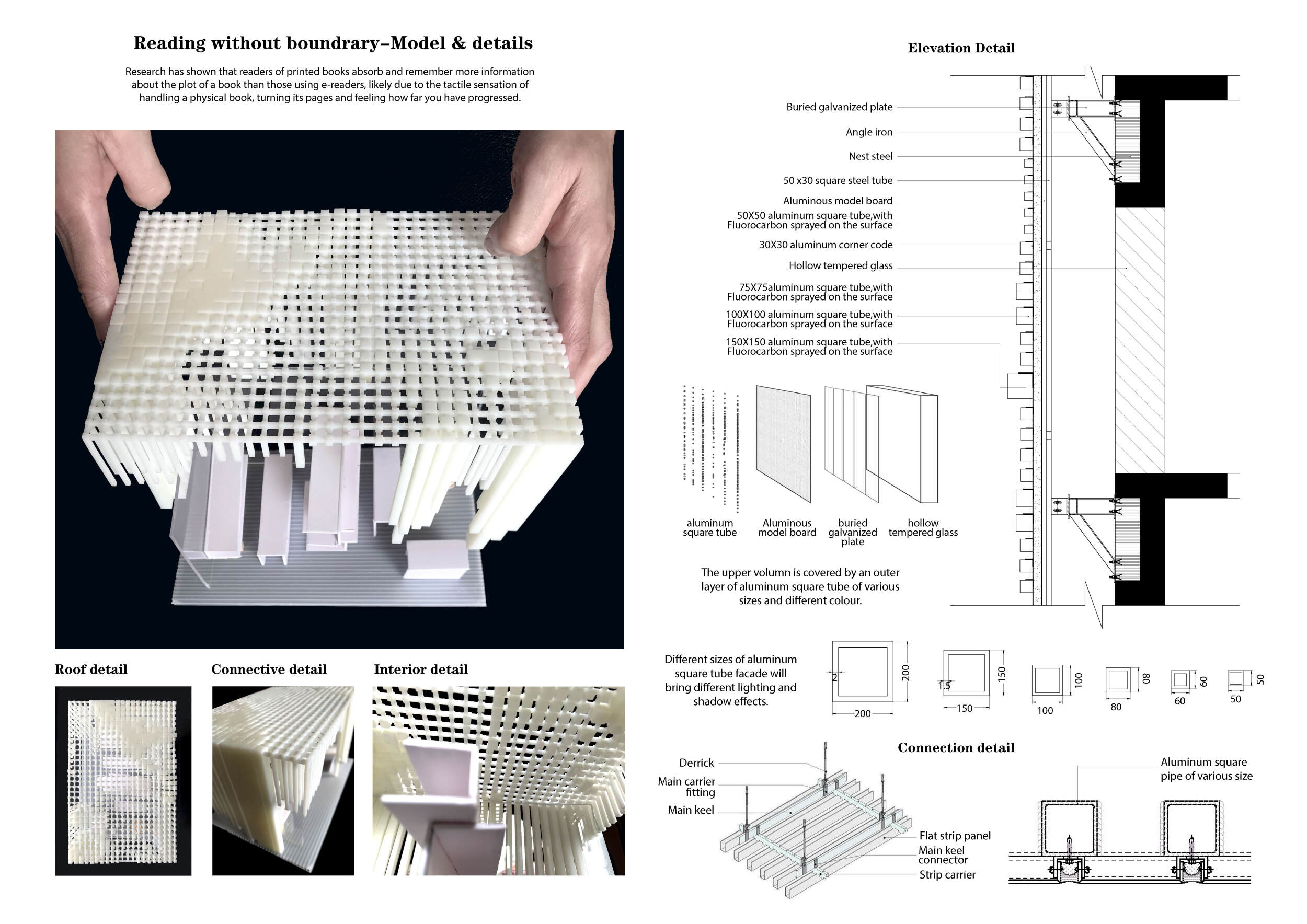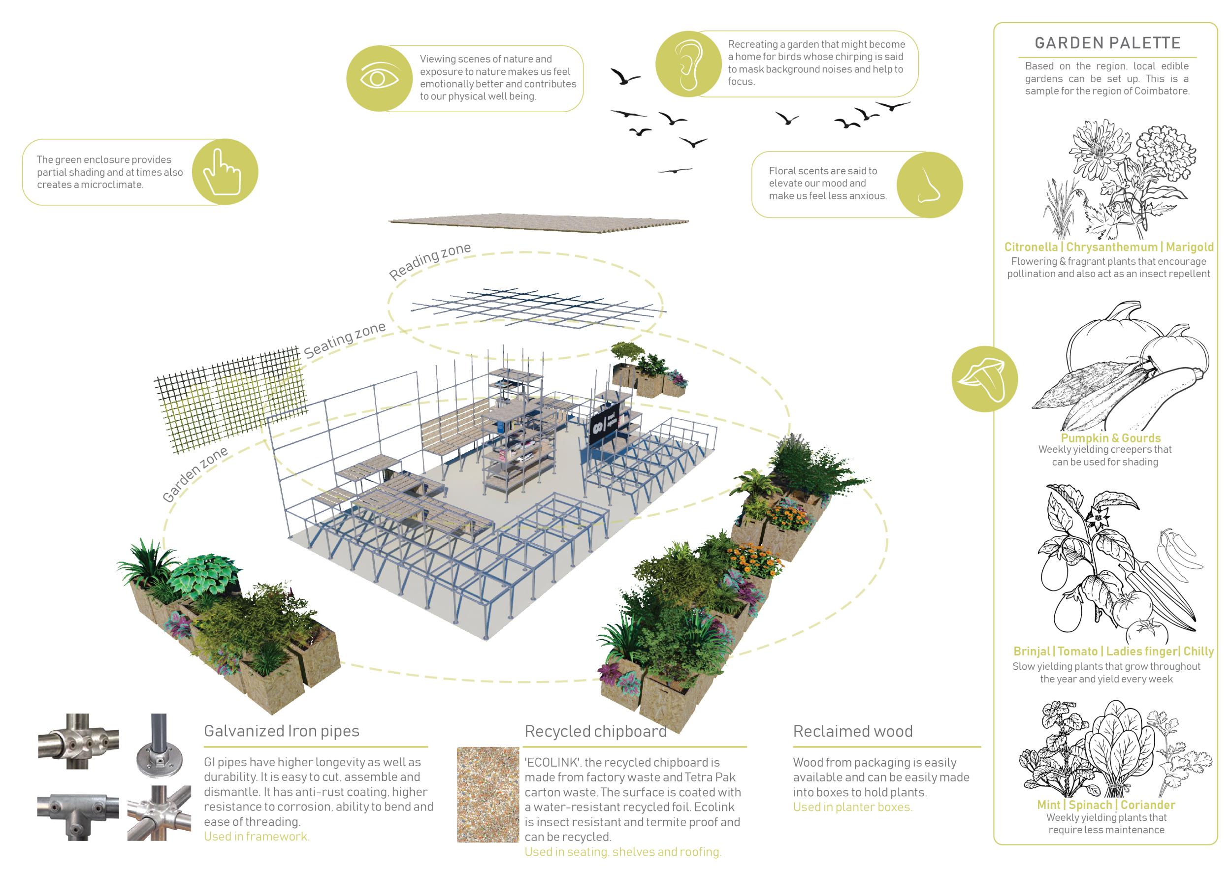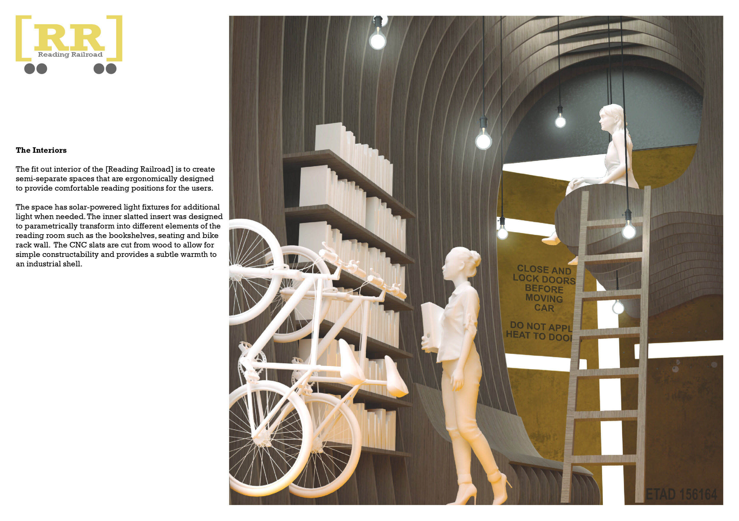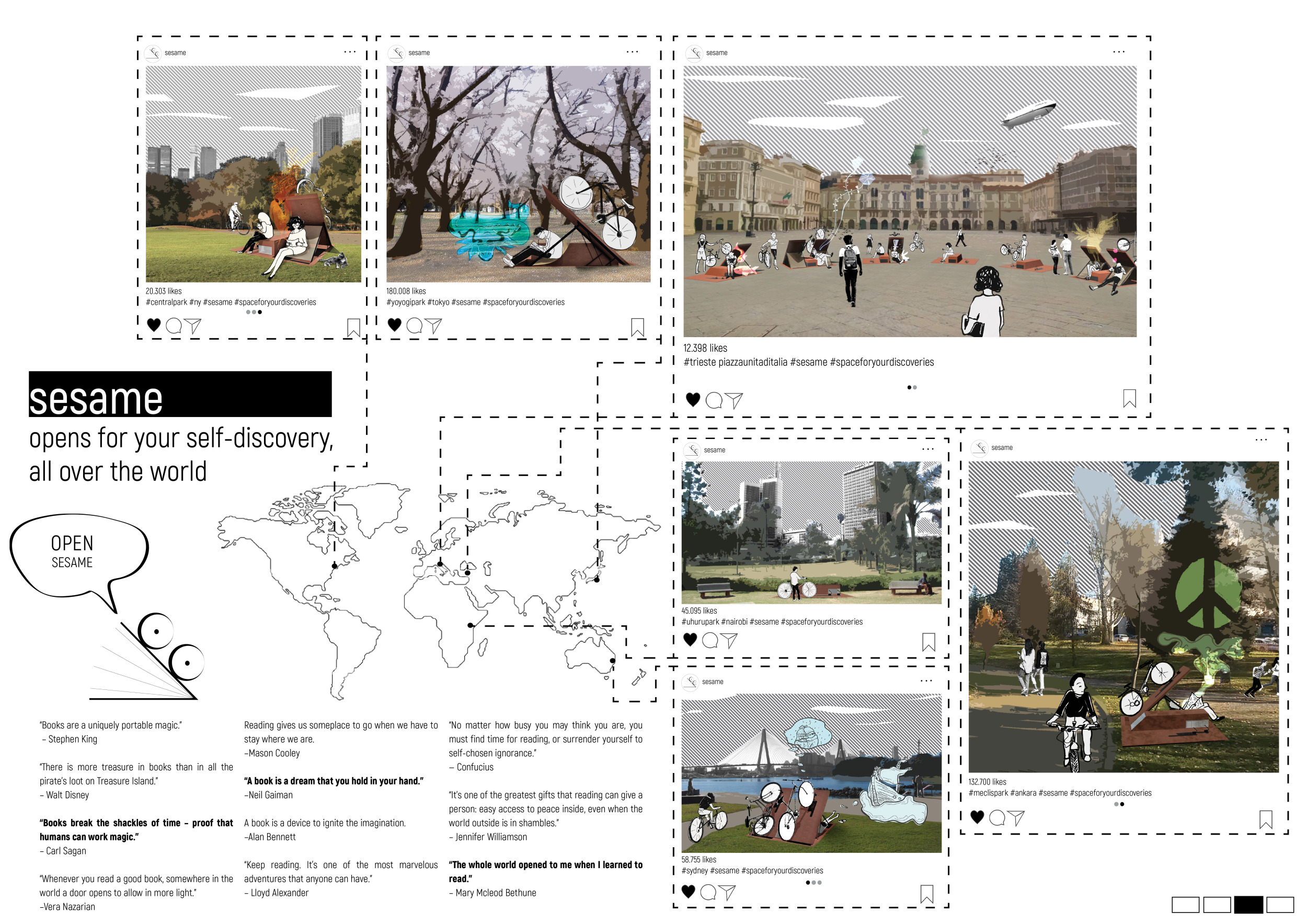 'The Reading Corner' is a modular tent-like structure comprised of 5 wooden panels threaded and held together with a series of light steel tension cables, and topped by a translucent fabric for protection from the elements. The construction offers an intimate reading space. It is also a place to quietly share thoughts or quotations - mobile block letters on tiny shelves can be rearranged by users on a wall embedded with small shelves that hold the text. Read more The jury questions the form and displacement of the book-sharing station from the main structure. However, the project seems easy to fabricate with simple materials, and one can easily imagine this as a popular destination within a park or city plaza.