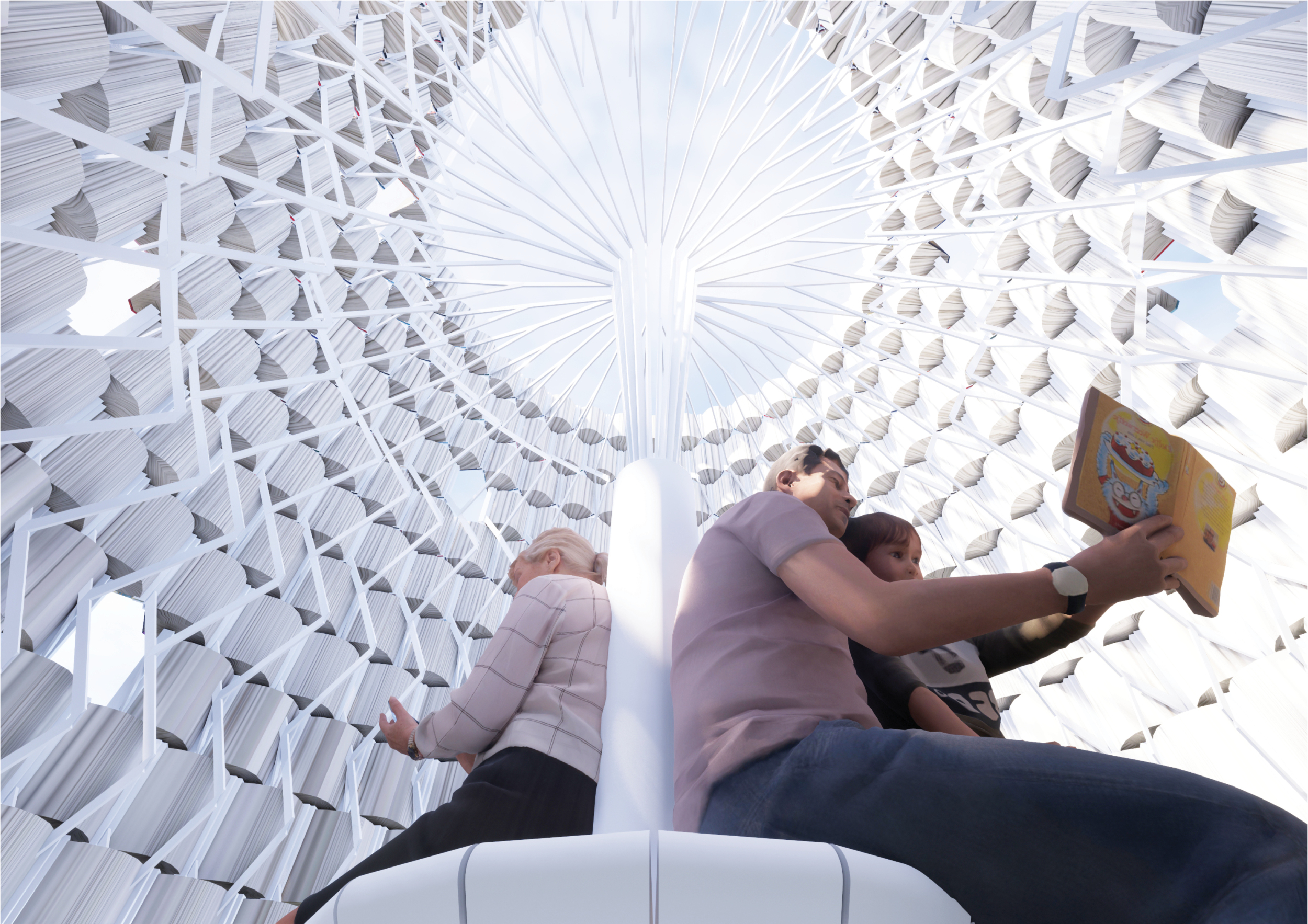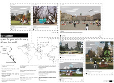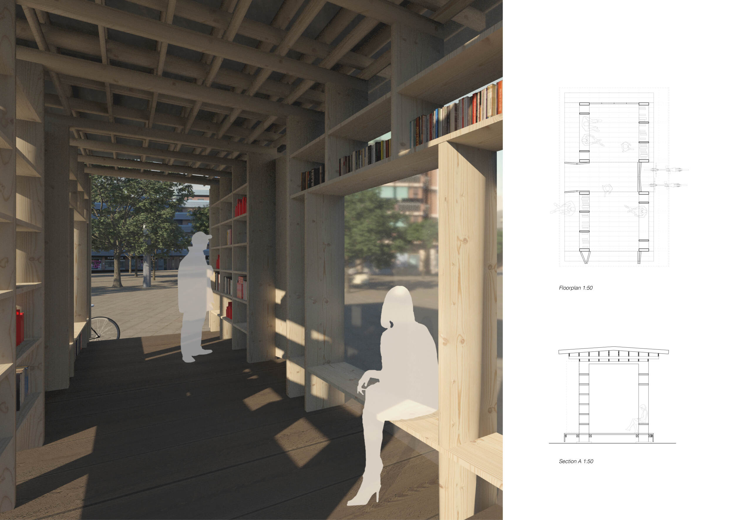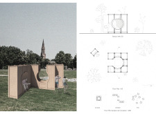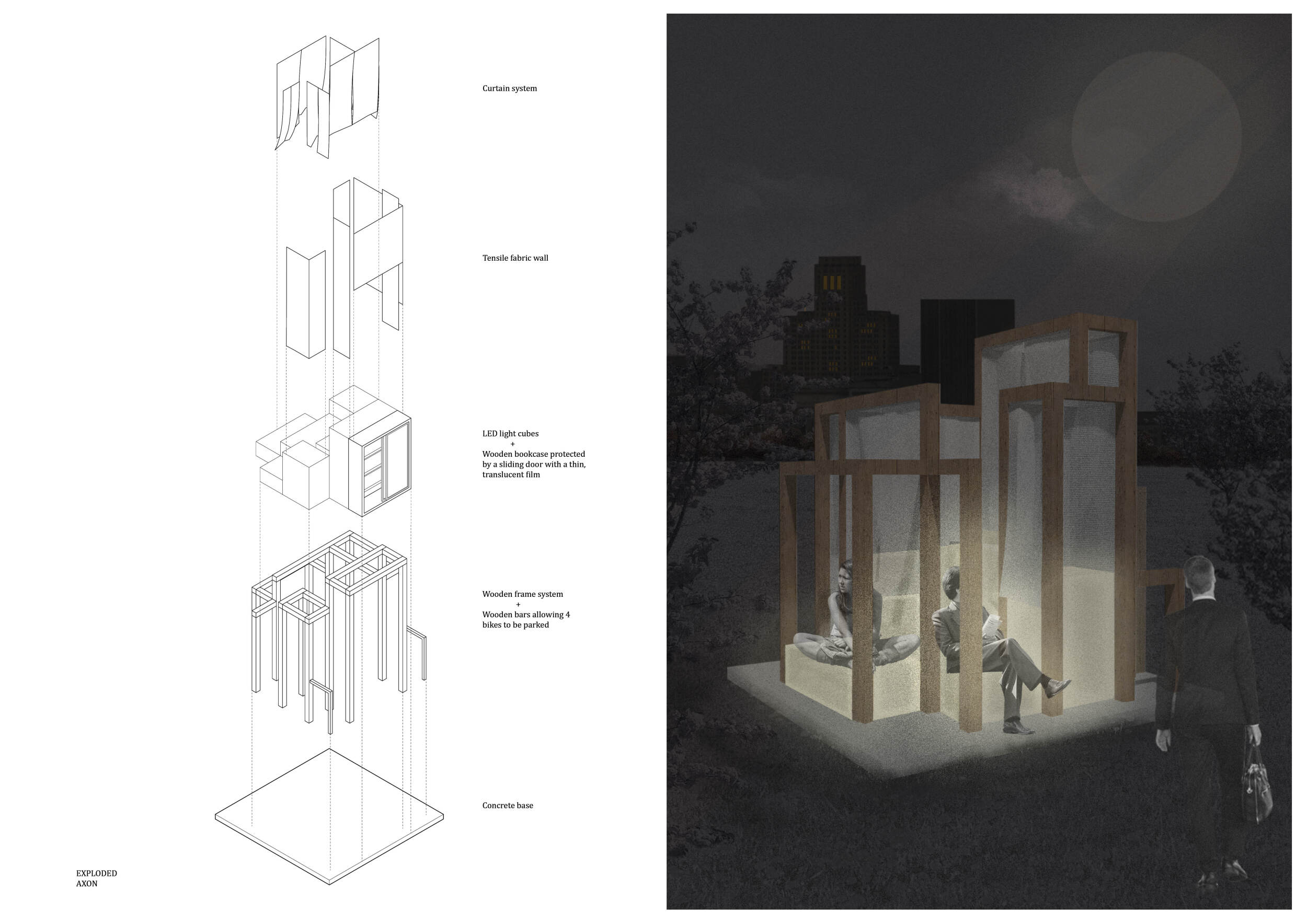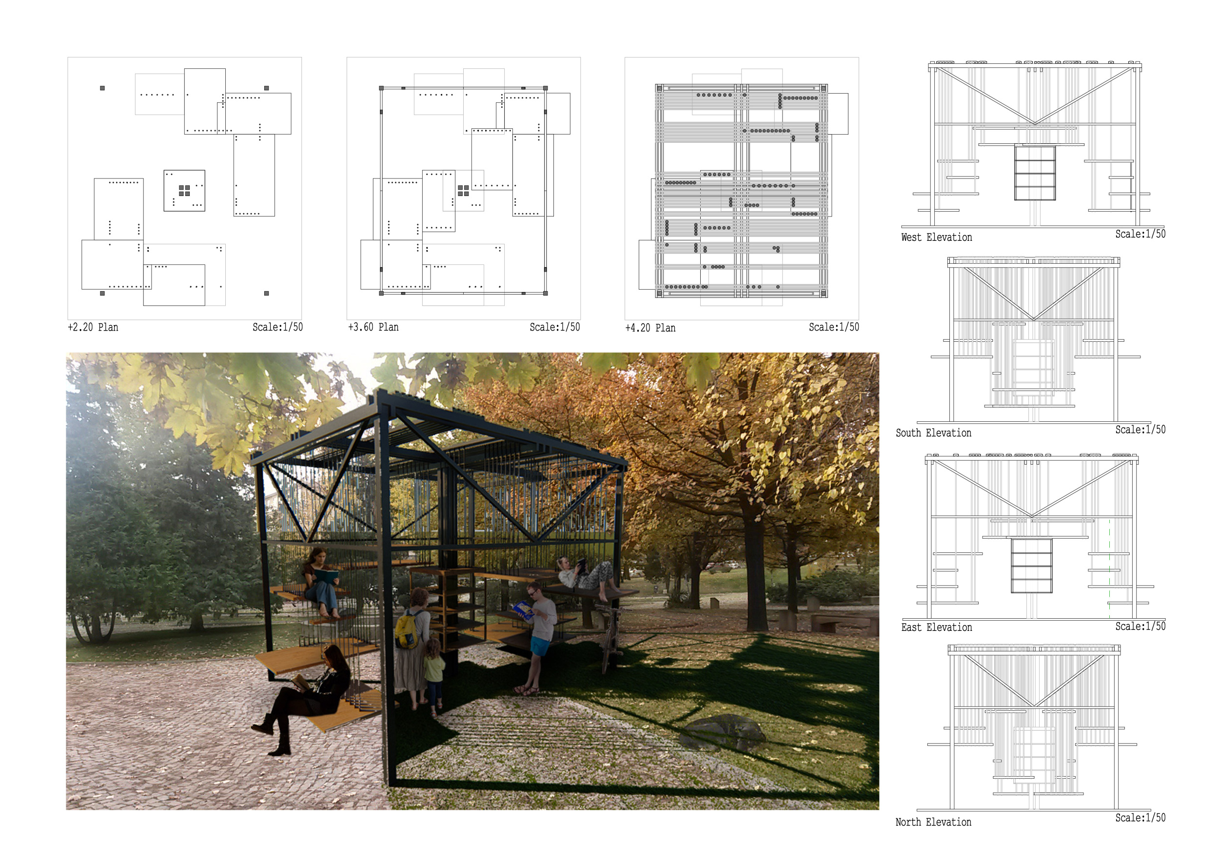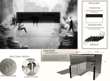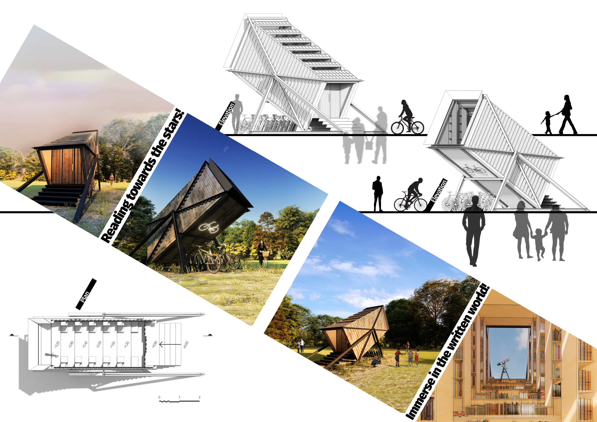 The proposal consists of a 9m² wooden open-air platform topped by an enclosure of iridescent foil. Entitled 'Nameless Sky', it contains two interior seats and bookshelves accessible from the perimeter. It is a symbolic project. It forces users to bend down to pick up books or to sit within the structure, emphasizing reading as an act requiring concentration and work. The synthetic sky above is an allusion to one's imagination. Read more The jury was impressed by project's simple representation, yet complex ideas.