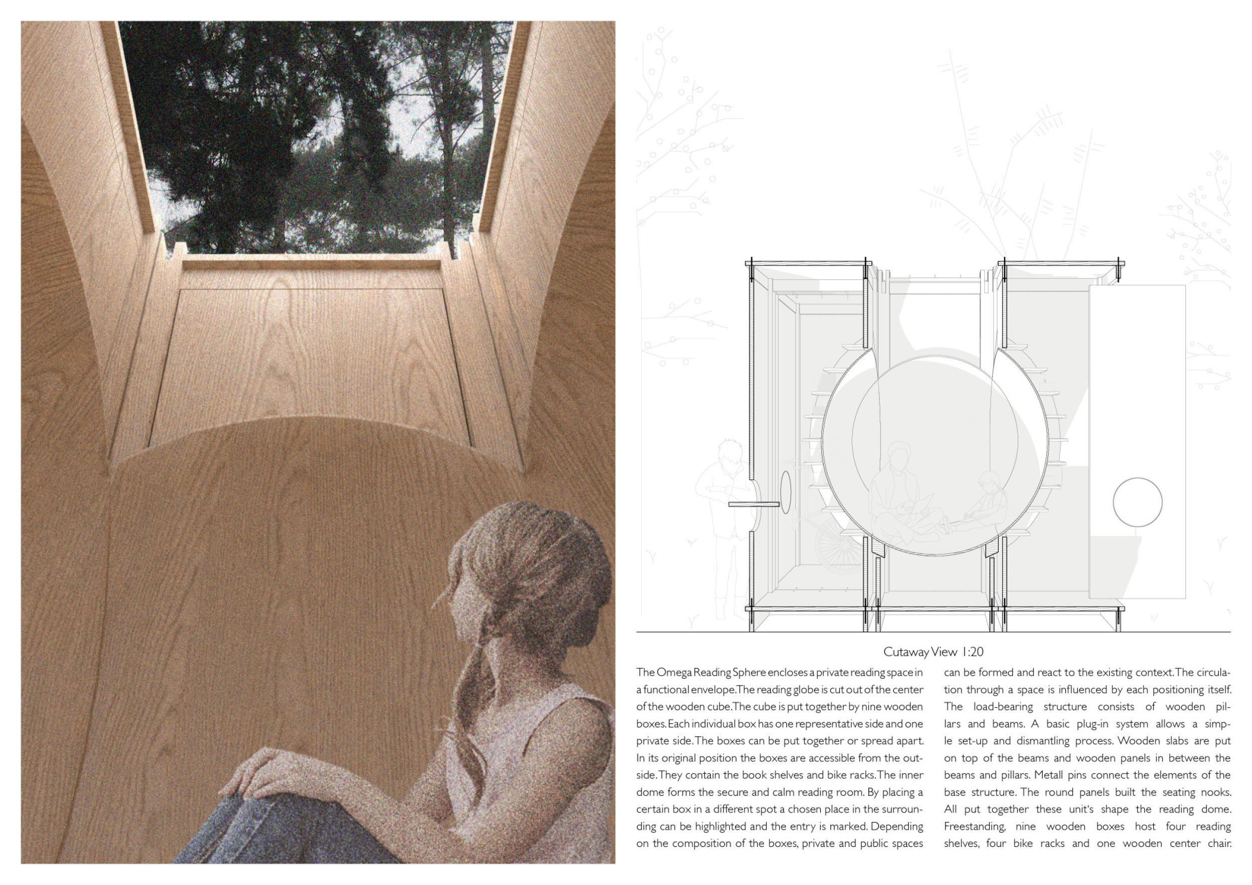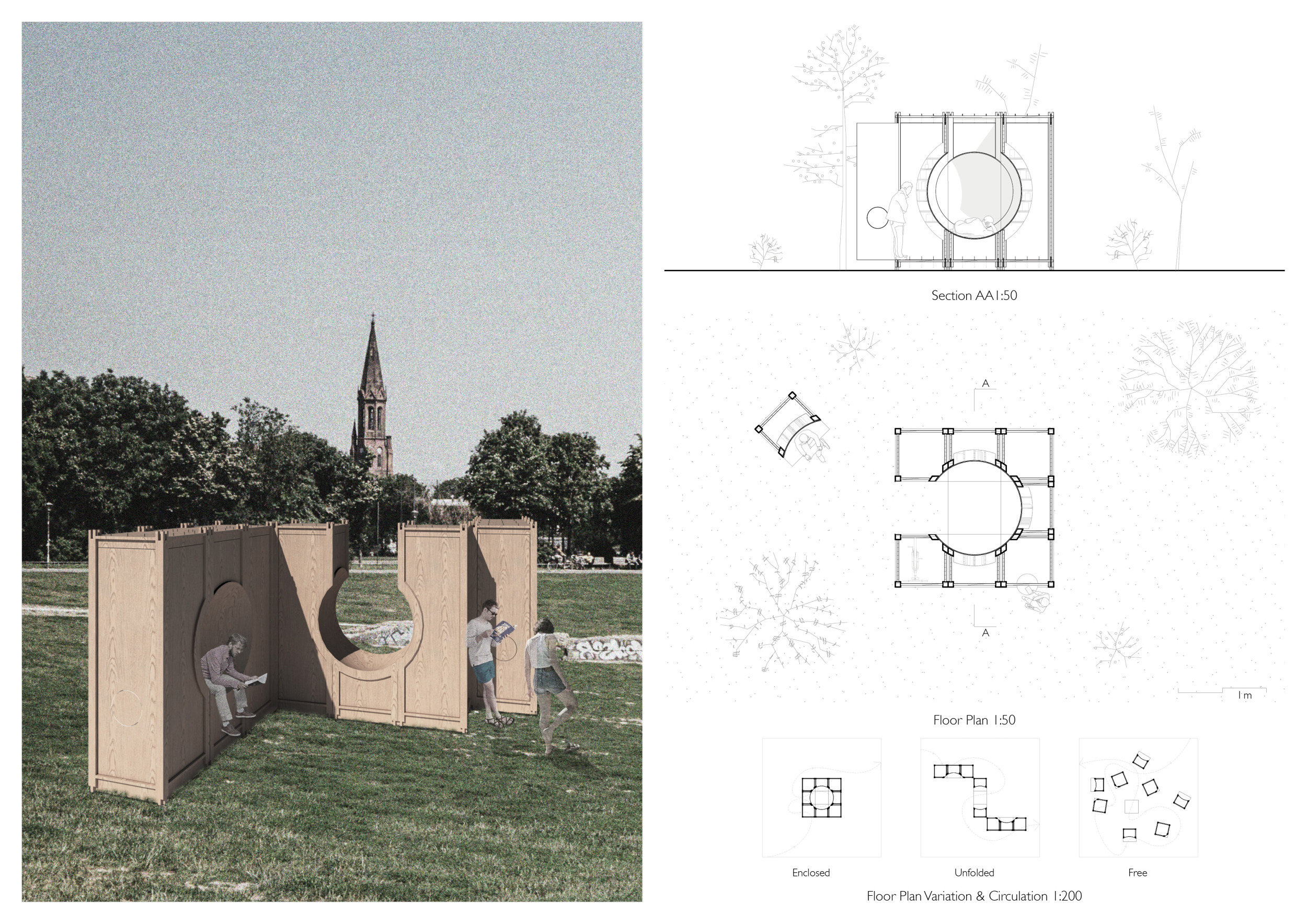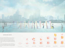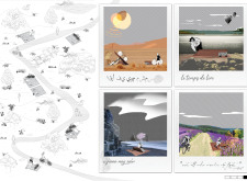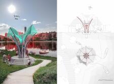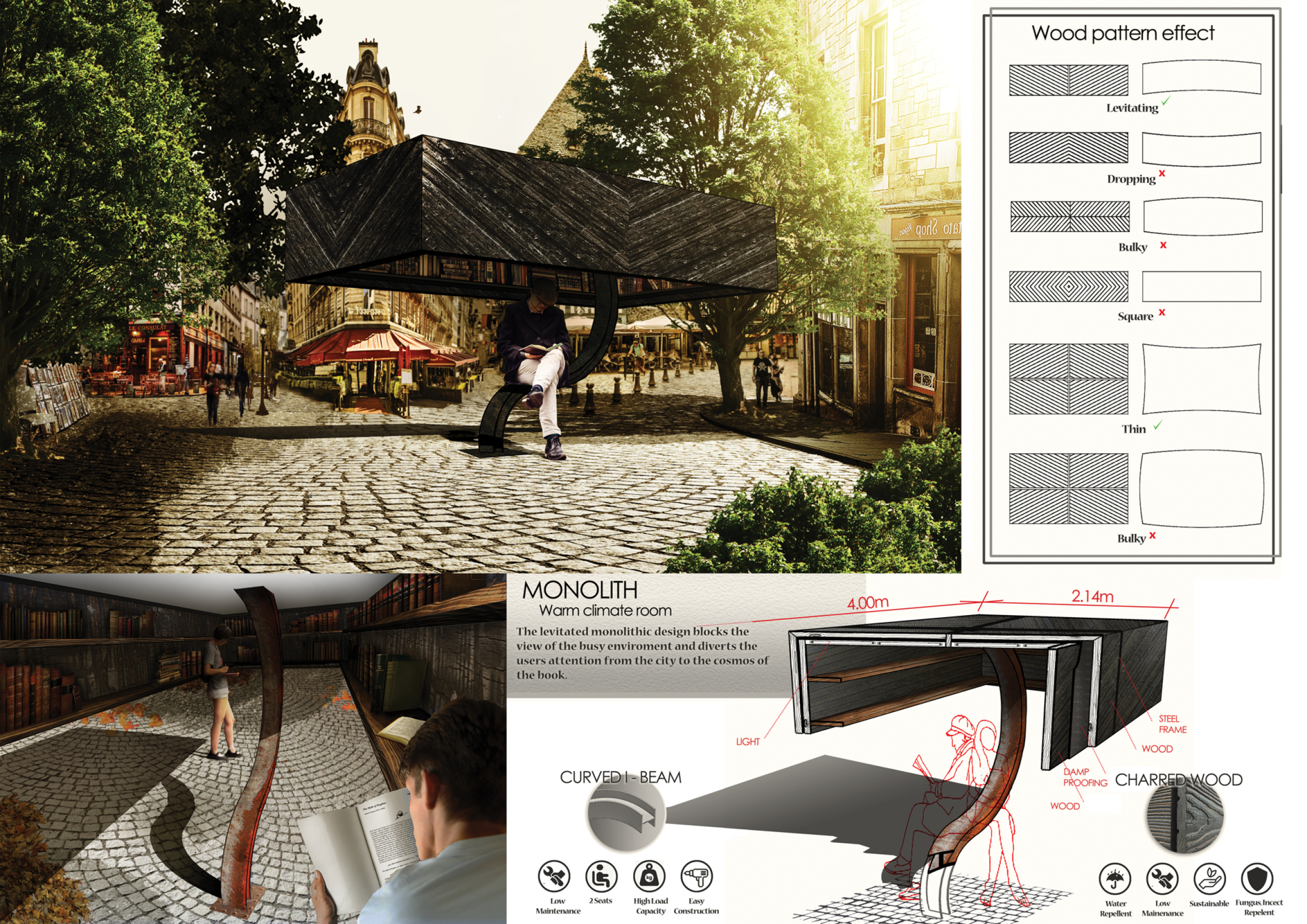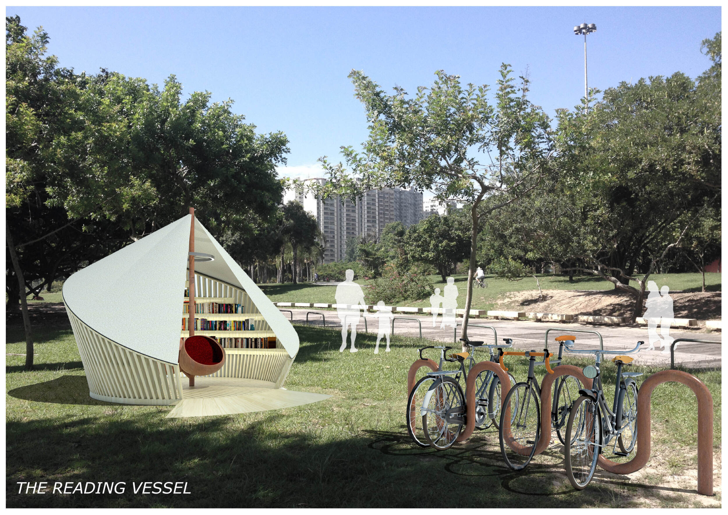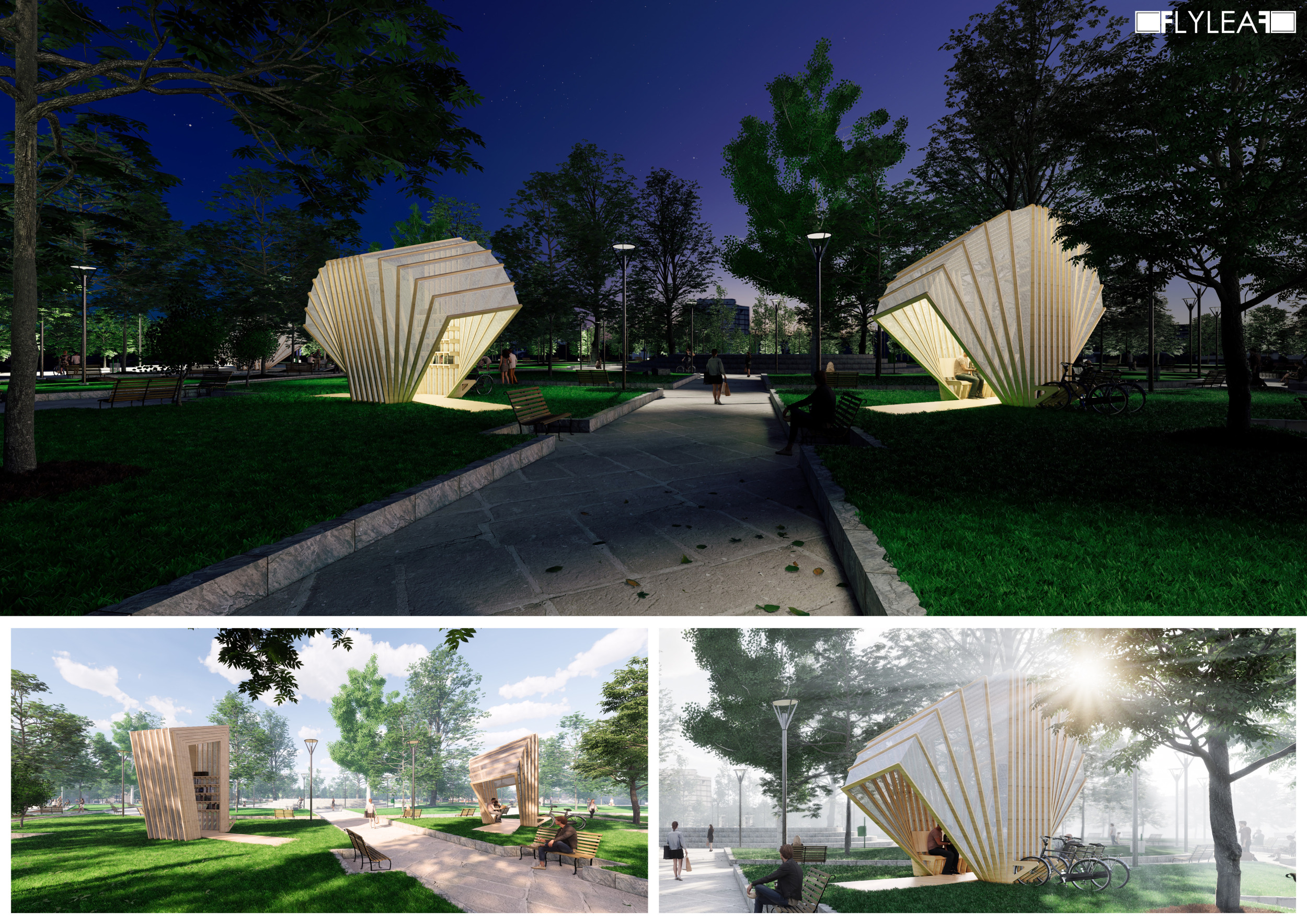 The proposal consists of a 9m² wooden open-air platform topped by an enclosure of iridescent foil. Entitled 'Nameless Sky', it contains two interior seats and bookshelves accessible from the perimeter. It is a symbolic project. It forces users to bend down to pick up books or to sit within the structure, emphasizing reading as an act requiring concentration and work. The synthetic sky above is an allusion to one's imagination. Read more The jury was impressed by project's simple representation, yet complex ideas.