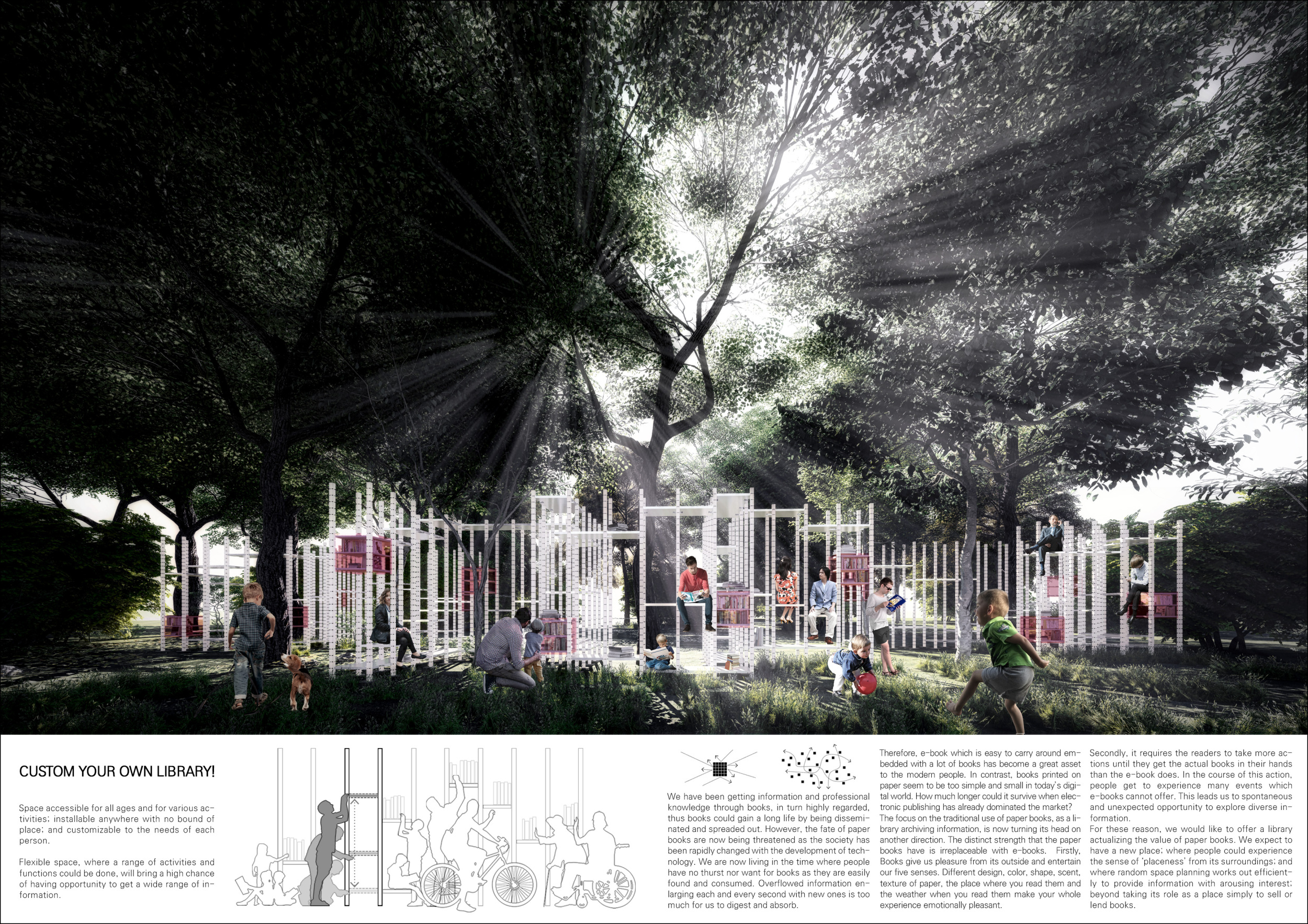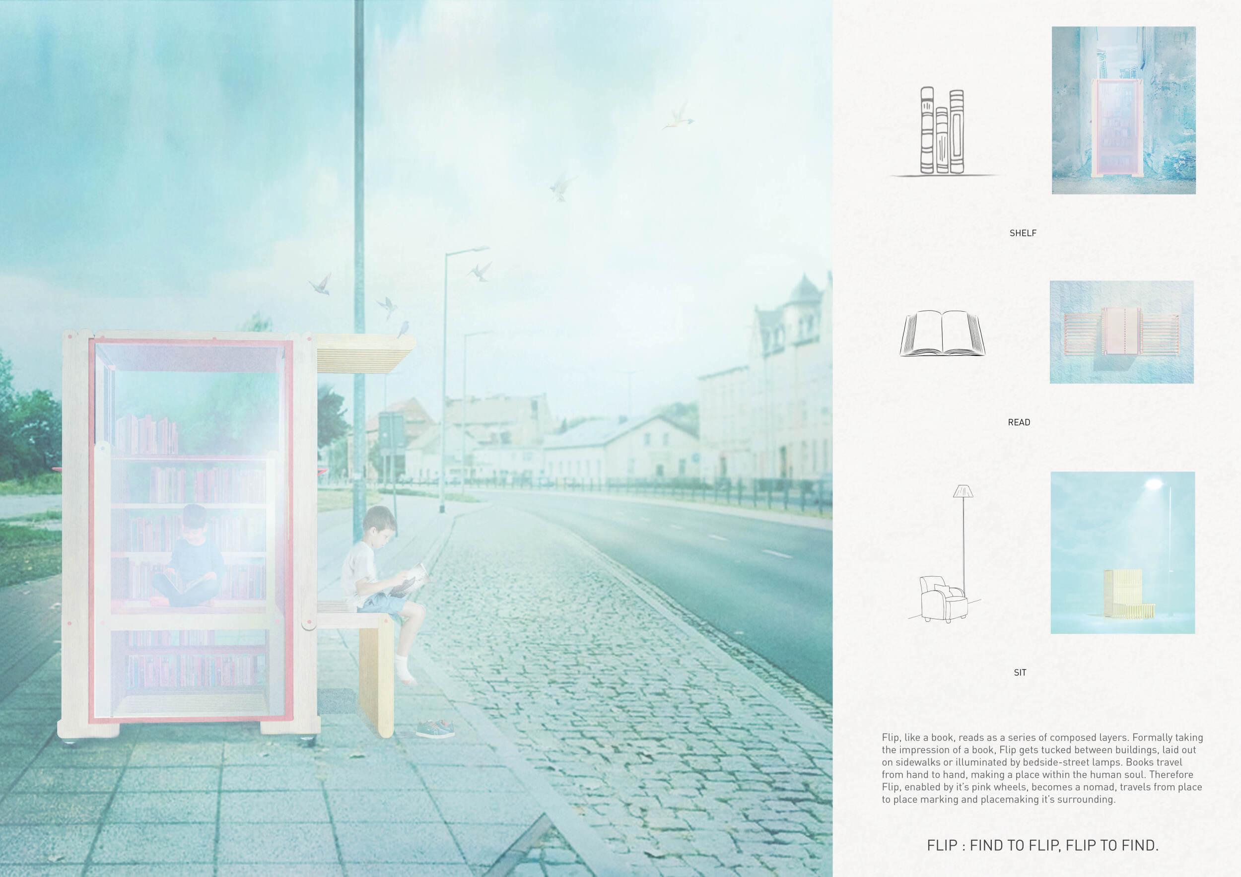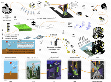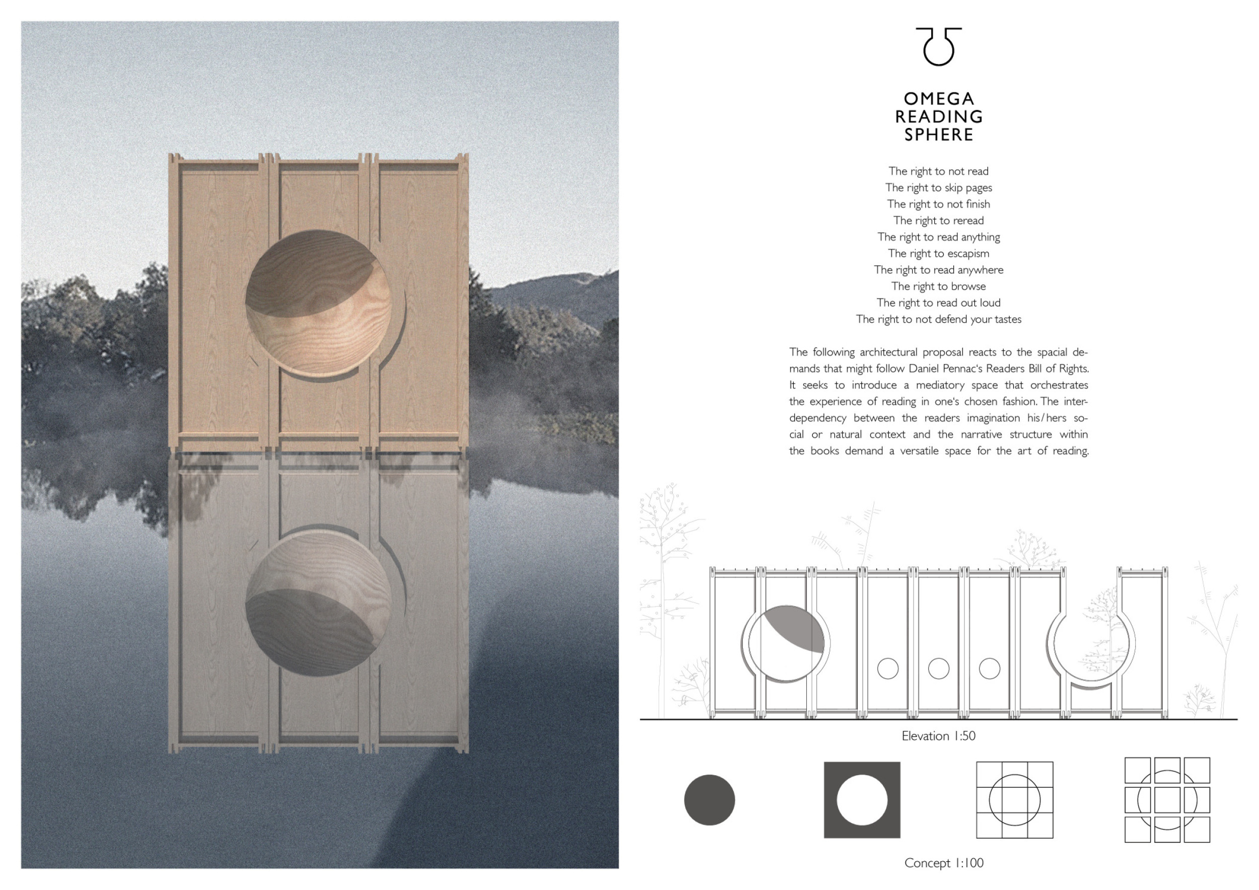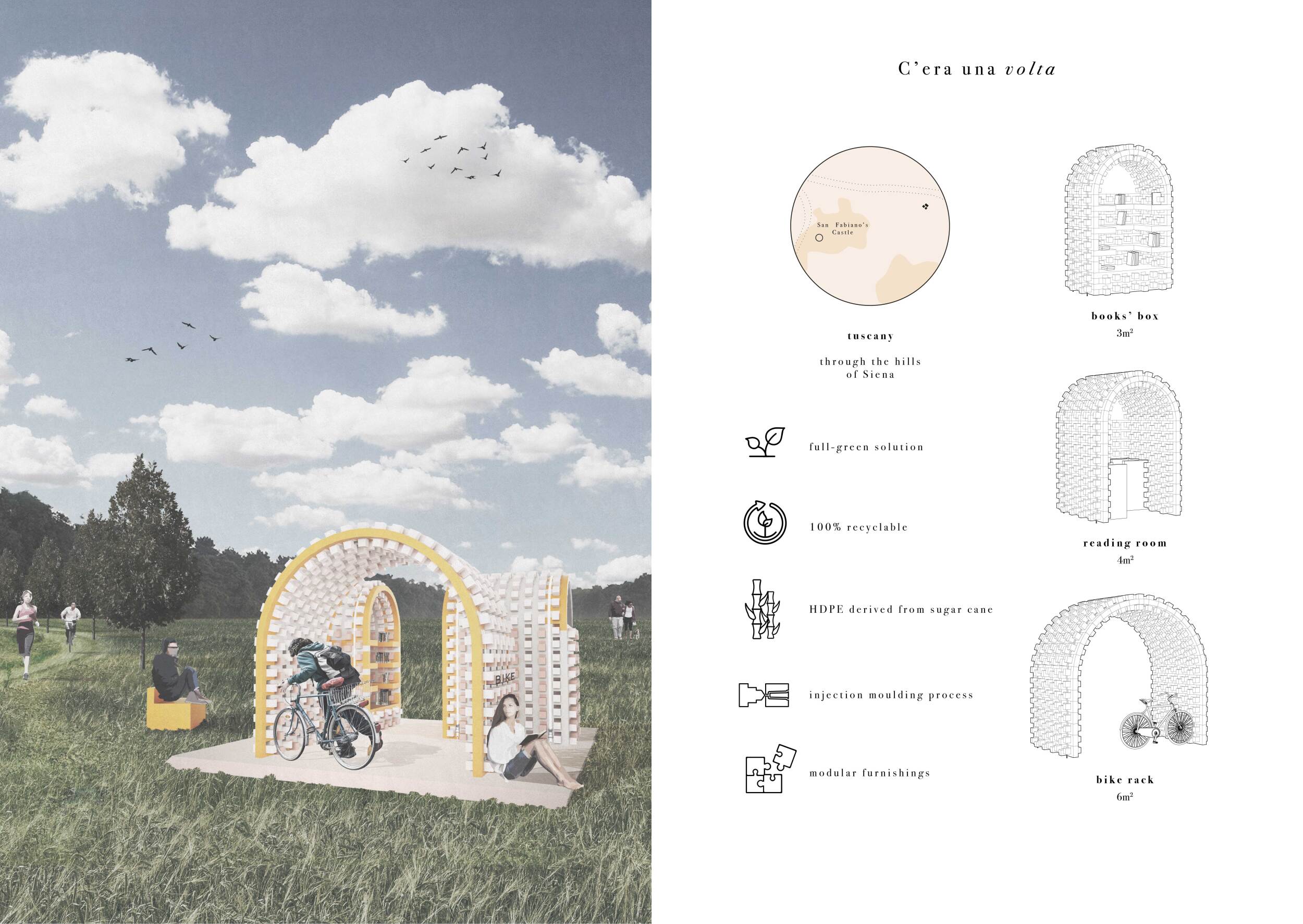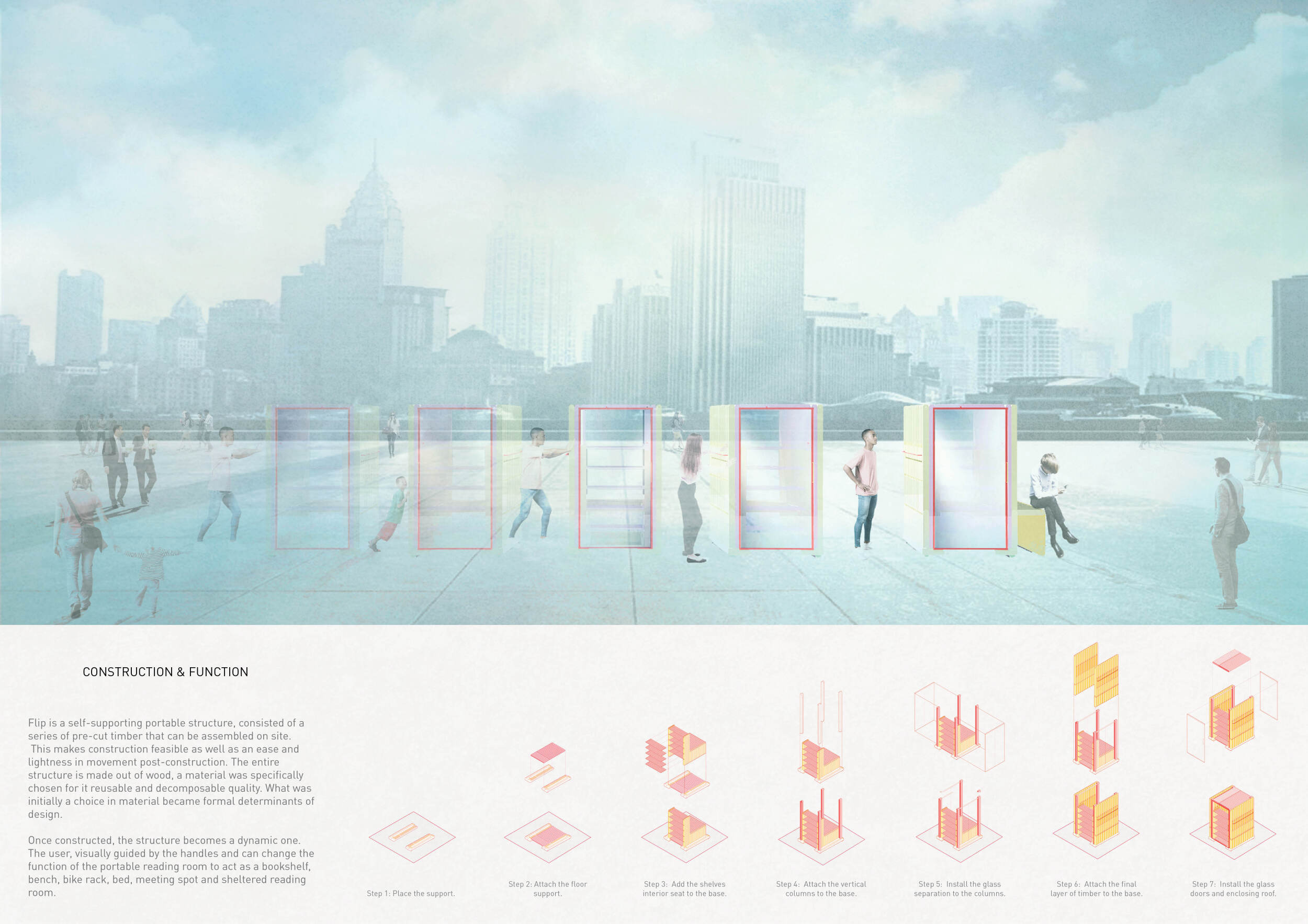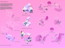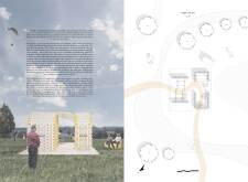 The proposal consists of a 9m² wooden open-air platform topped by an enclosure of iridescent foil. Entitled 'Nameless Sky', it contains two interior seats and bookshelves accessible from the perimeter. It is a symbolic project. It forces users to bend down to pick up books or to sit within the structure, emphasizing reading as an act requiring concentration and work. The synthetic sky above is an allusion to one's imagination. Read more The jury was impressed by project's simple representation, yet complex ideas.