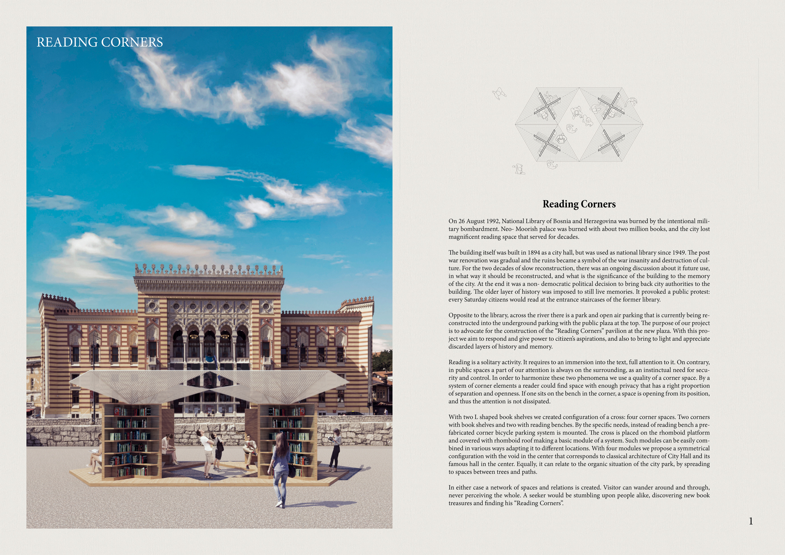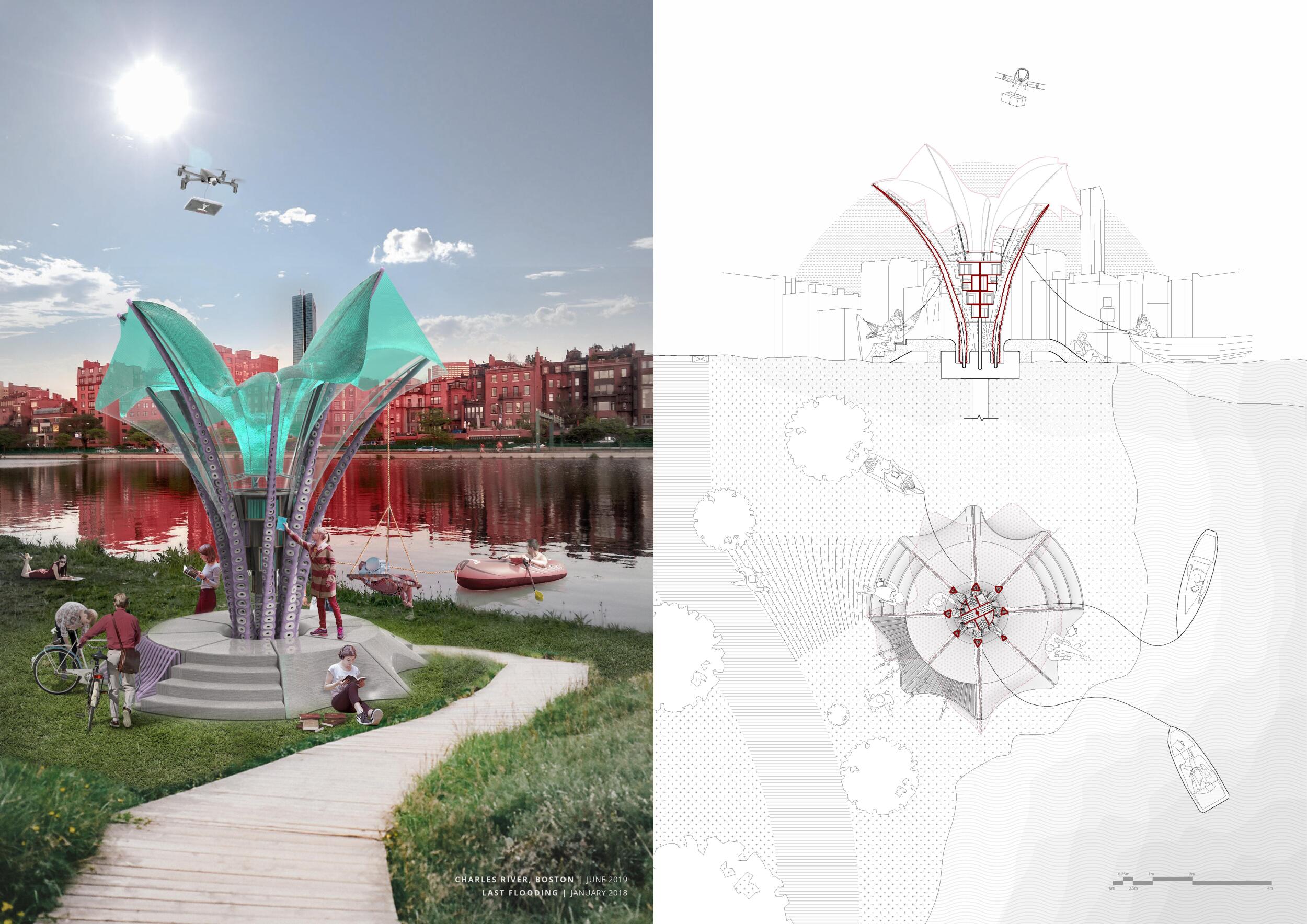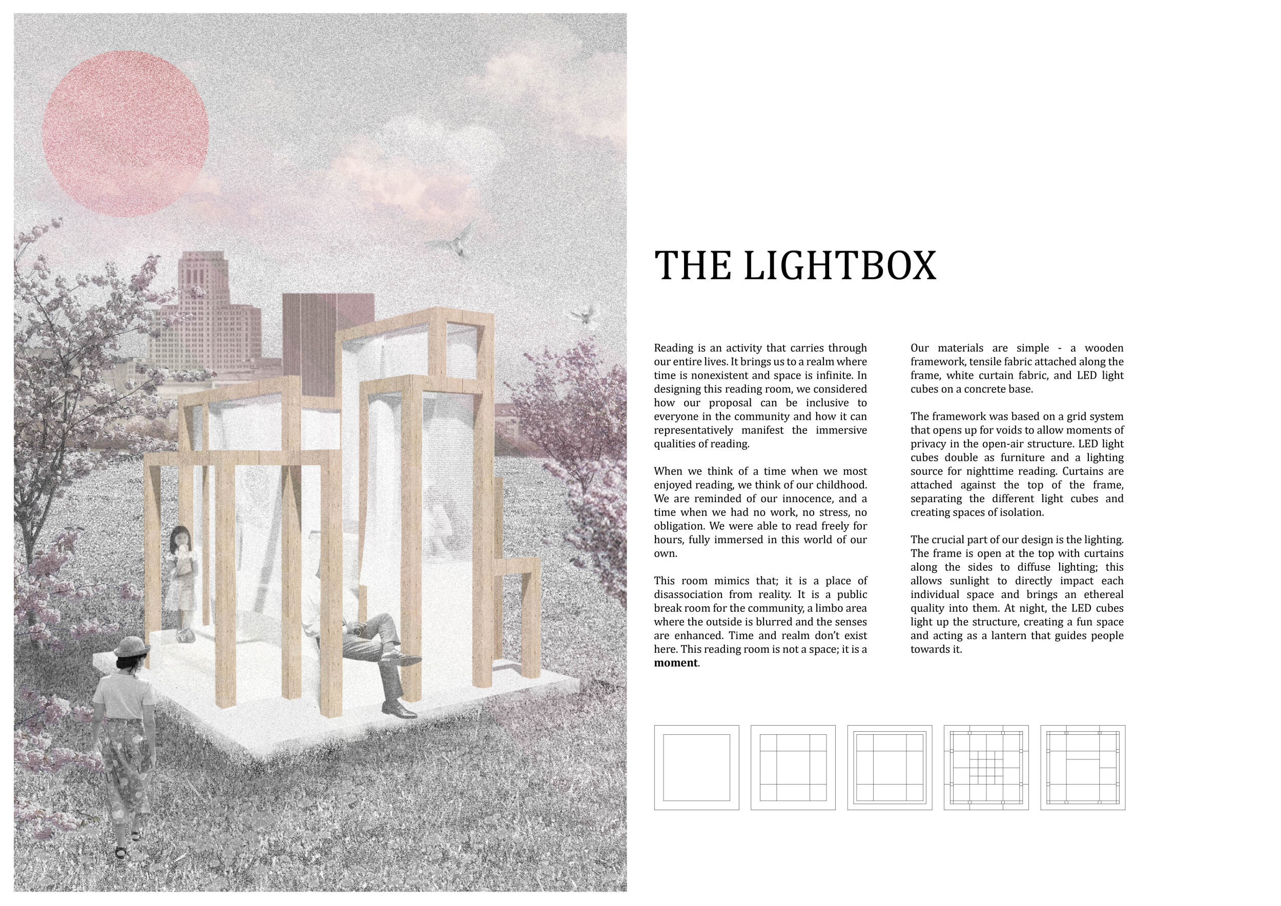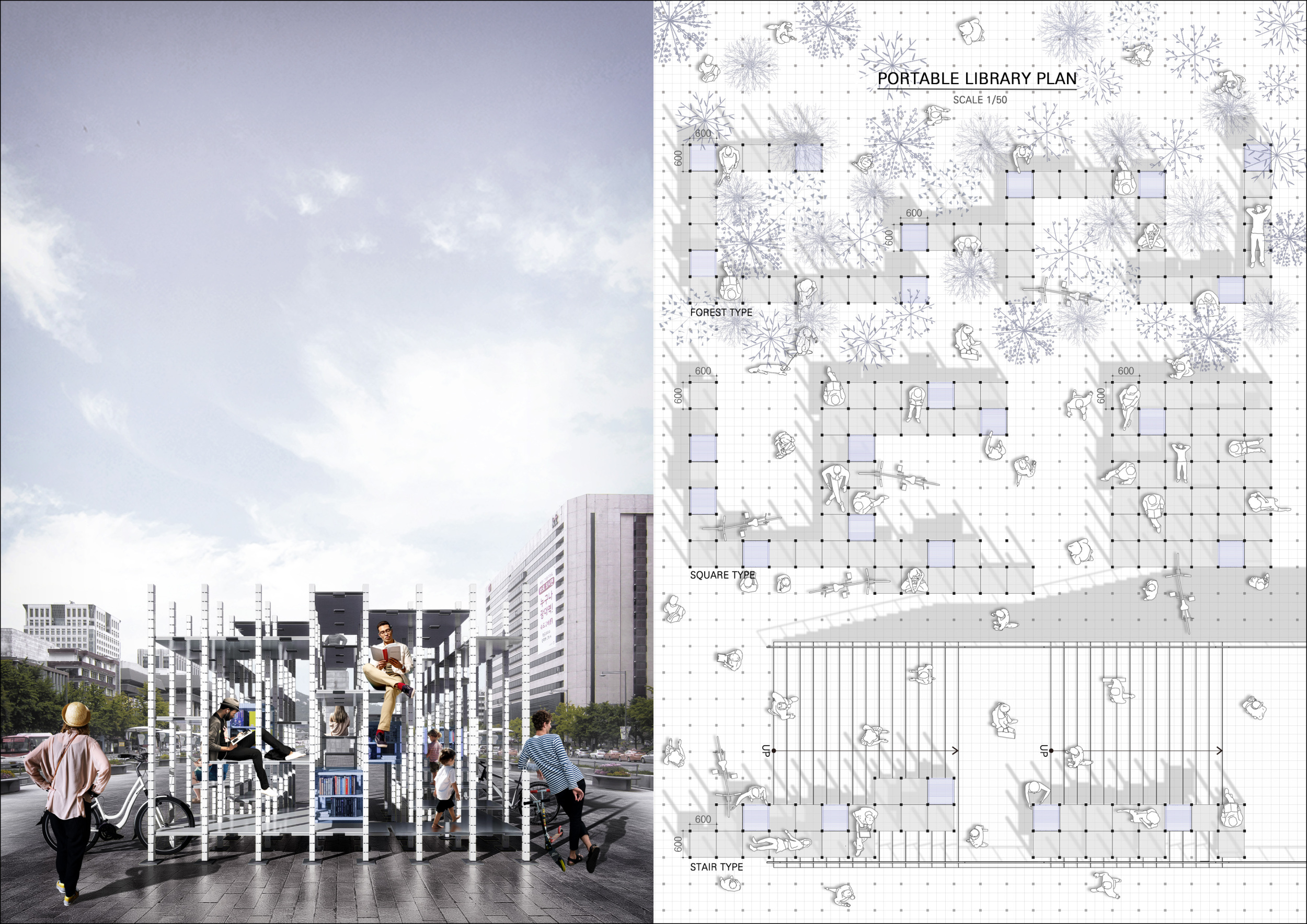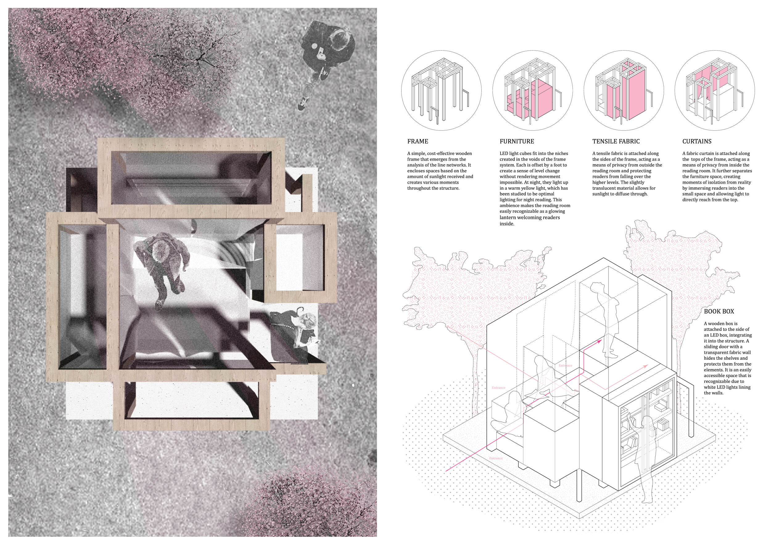 The proposal consists of a 9m² wooden open-air platform topped by an enclosure of iridescent foil. Entitled 'Nameless Sky', it contains two interior seats and bookshelves accessible from the perimeter. It is a symbolic project. It forces users to bend down to pick up books or to sit within the structure, emphasizing reading as an act requiring concentration and work. The synthetic sky above is an allusion to one's imagination. Read more The jury was impressed by project's simple representation, yet complex ideas.