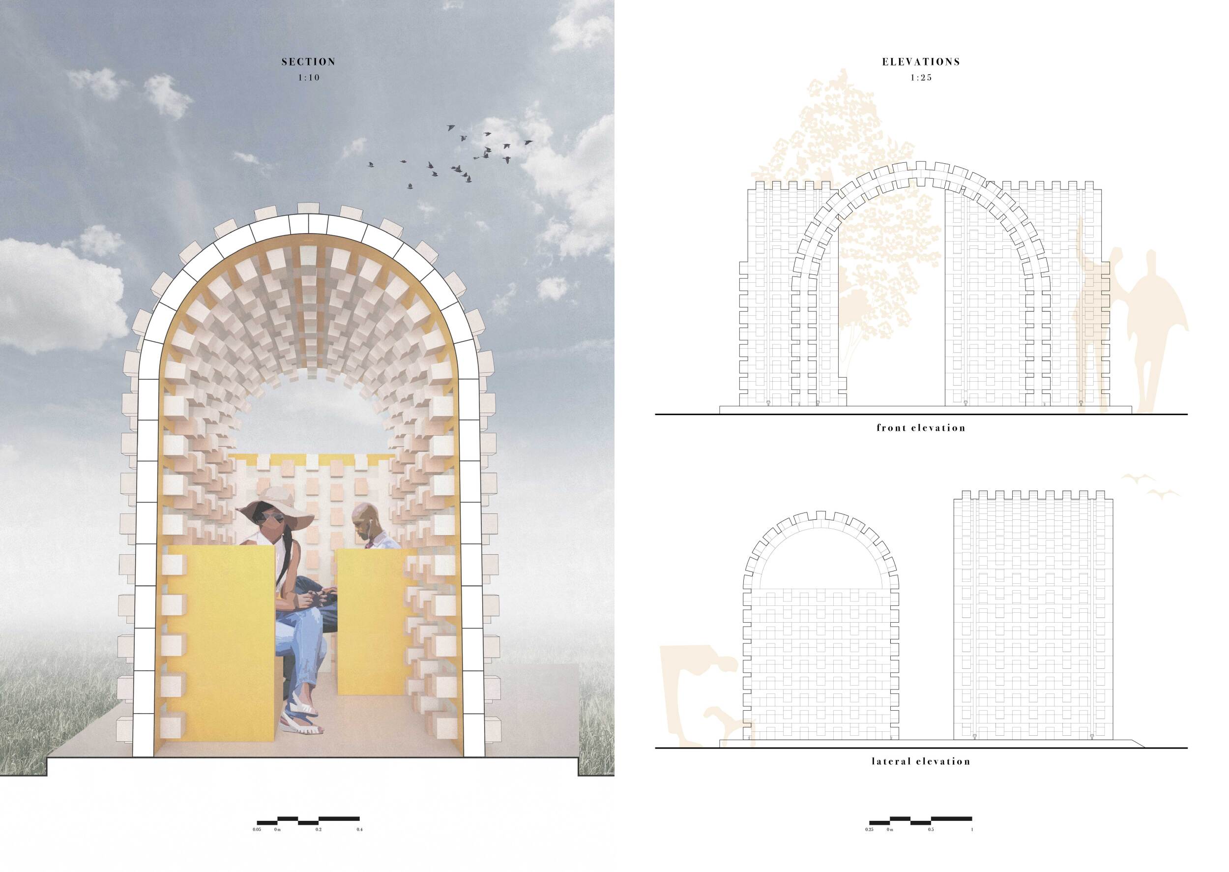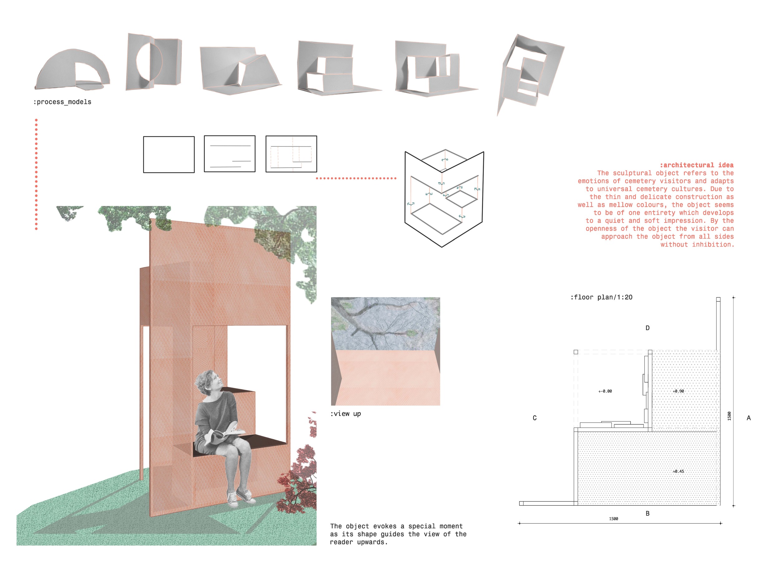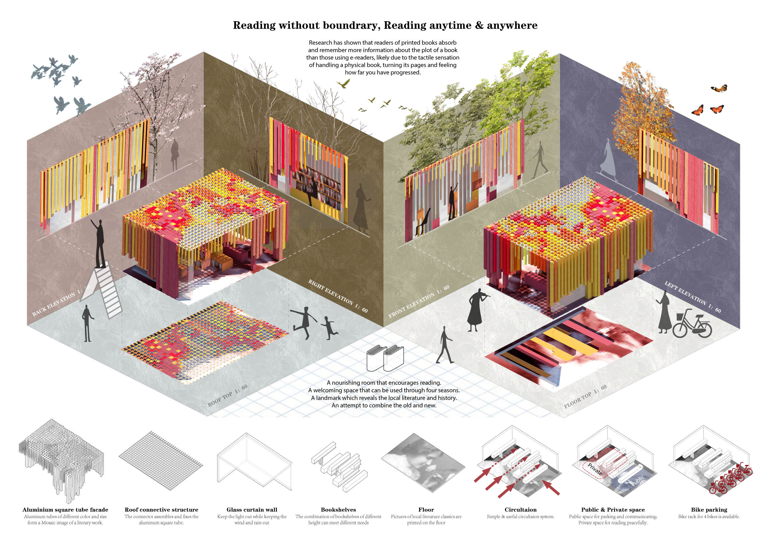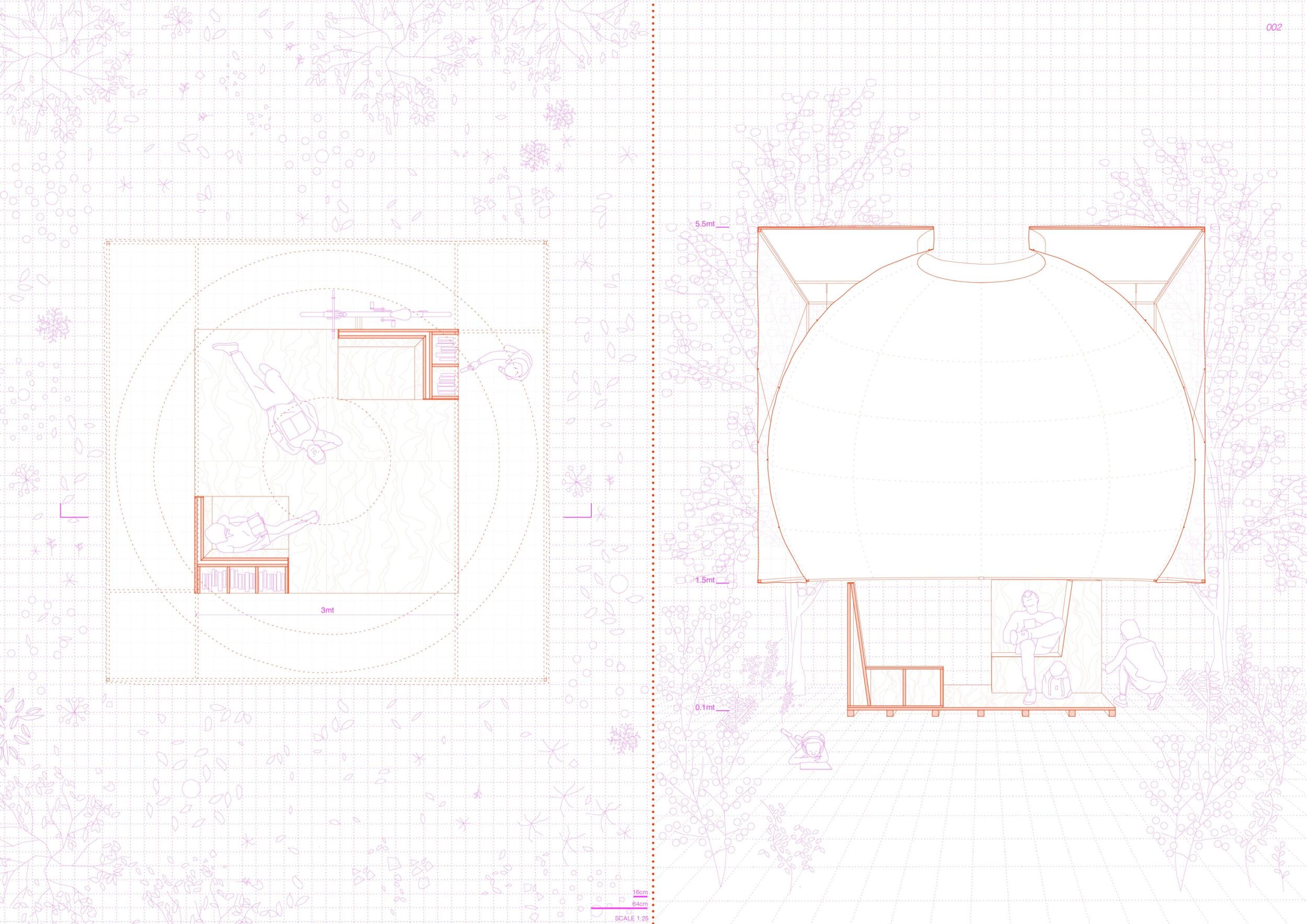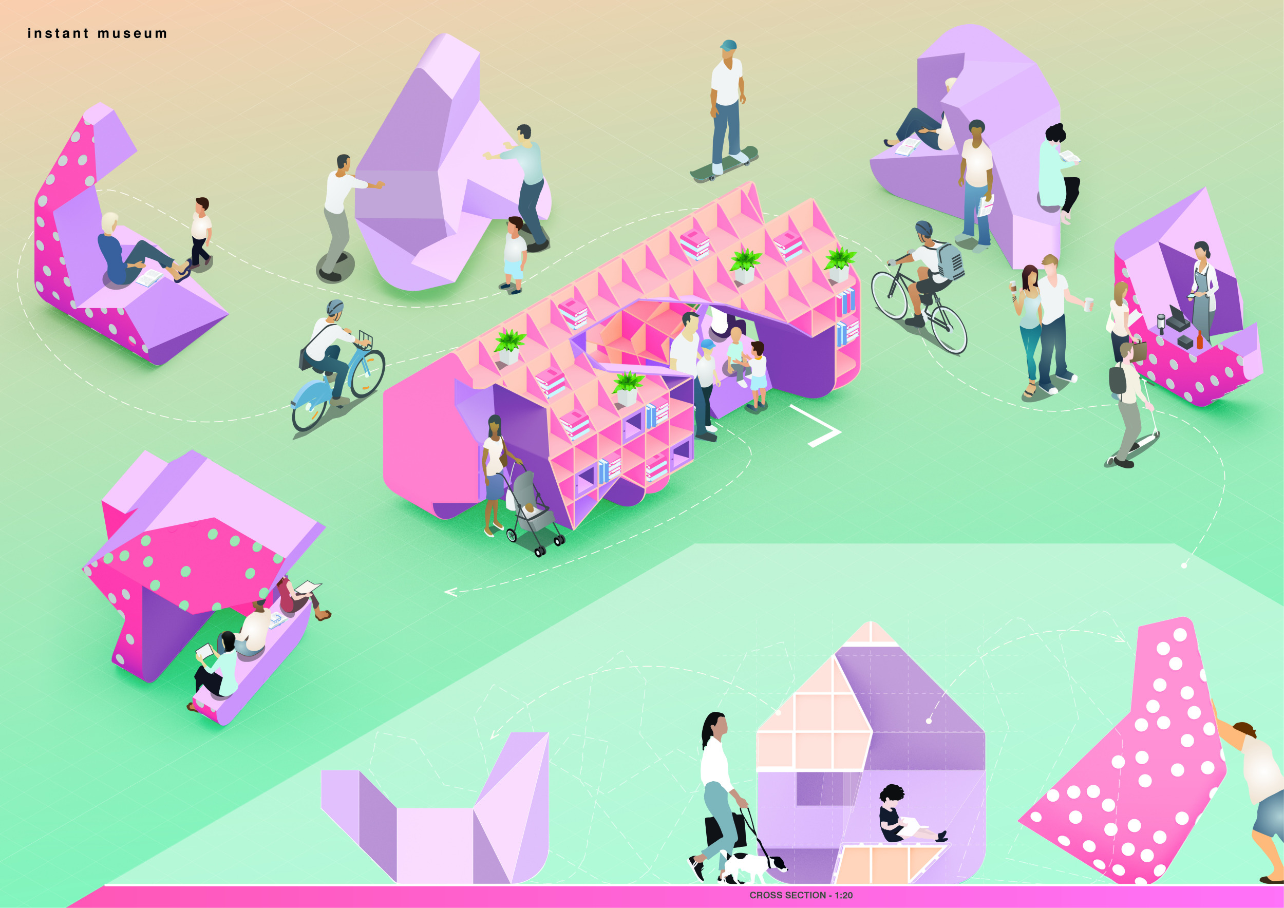 The proposal consists of a 9m² wooden open-air platform topped by an enclosure of iridescent foil. Entitled 'Nameless Sky', it contains two interior seats and bookshelves accessible from the perimeter. It is a symbolic project. It forces users to bend down to pick up books or to sit within the structure, emphasizing reading as an act requiring concentration and work. The synthetic sky above is an allusion to one's imagination. Read more The jury was impressed by project's simple representation, yet complex ideas.
