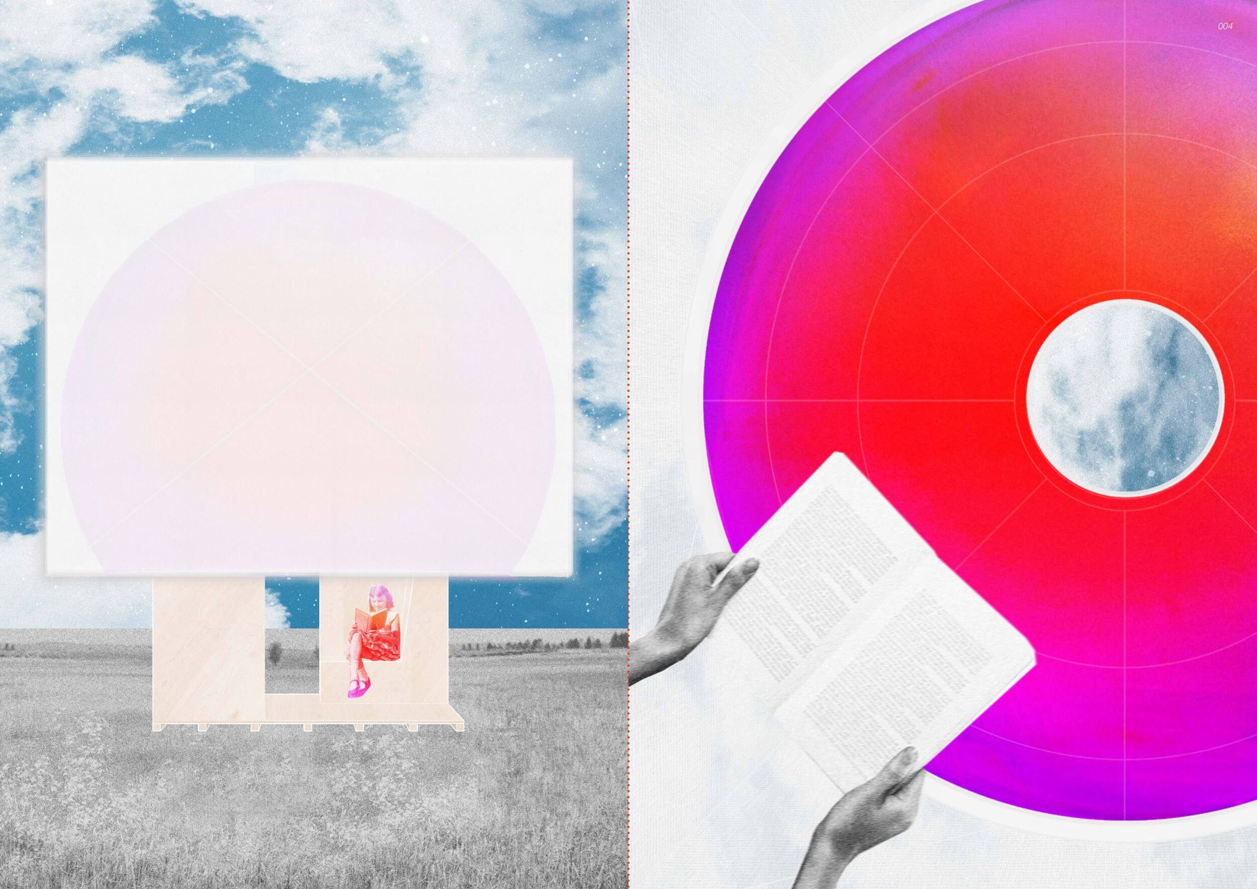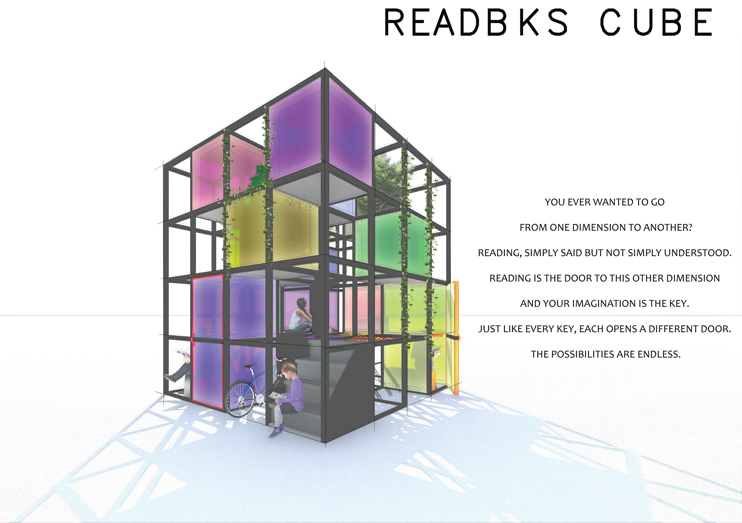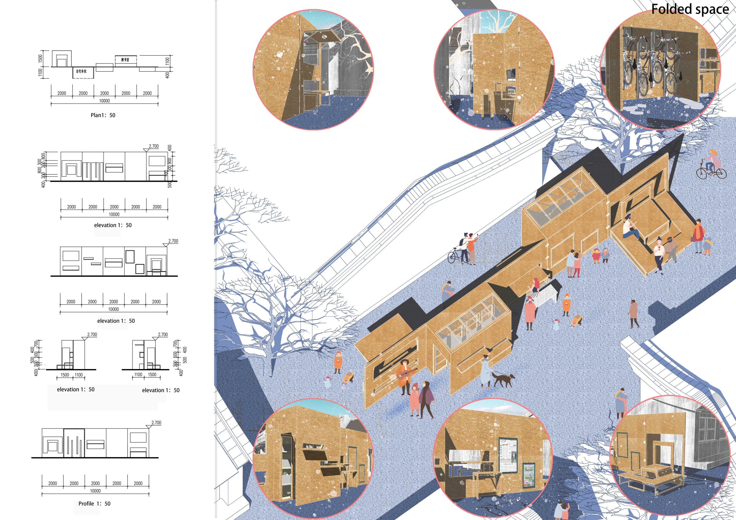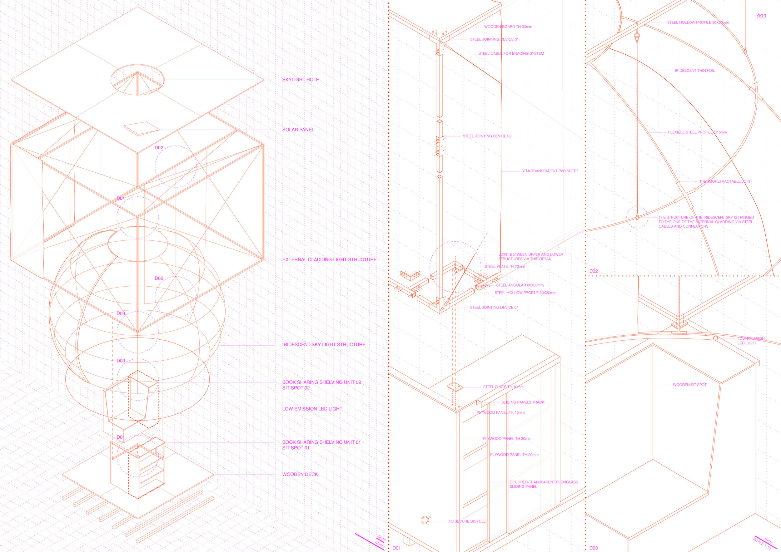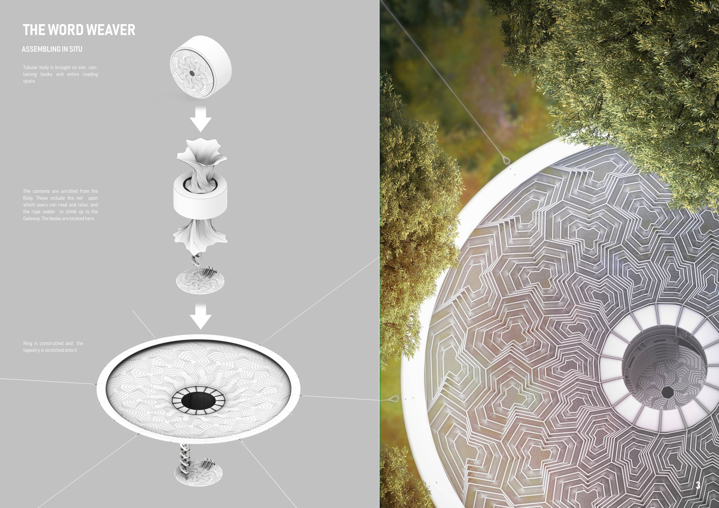 The proposal consists of a 9m² wooden open-air platform topped by an enclosure of iridescent foil. Entitled 'Nameless Sky', it contains two interior seats and bookshelves accessible from the perimeter. It is a symbolic project. It forces users to bend down to pick up books or to sit within the structure, emphasizing reading as an act requiring concentration and work. The synthetic sky above is an allusion to one's imagination. Read more The jury was impressed by project's simple representation, yet complex ideas.