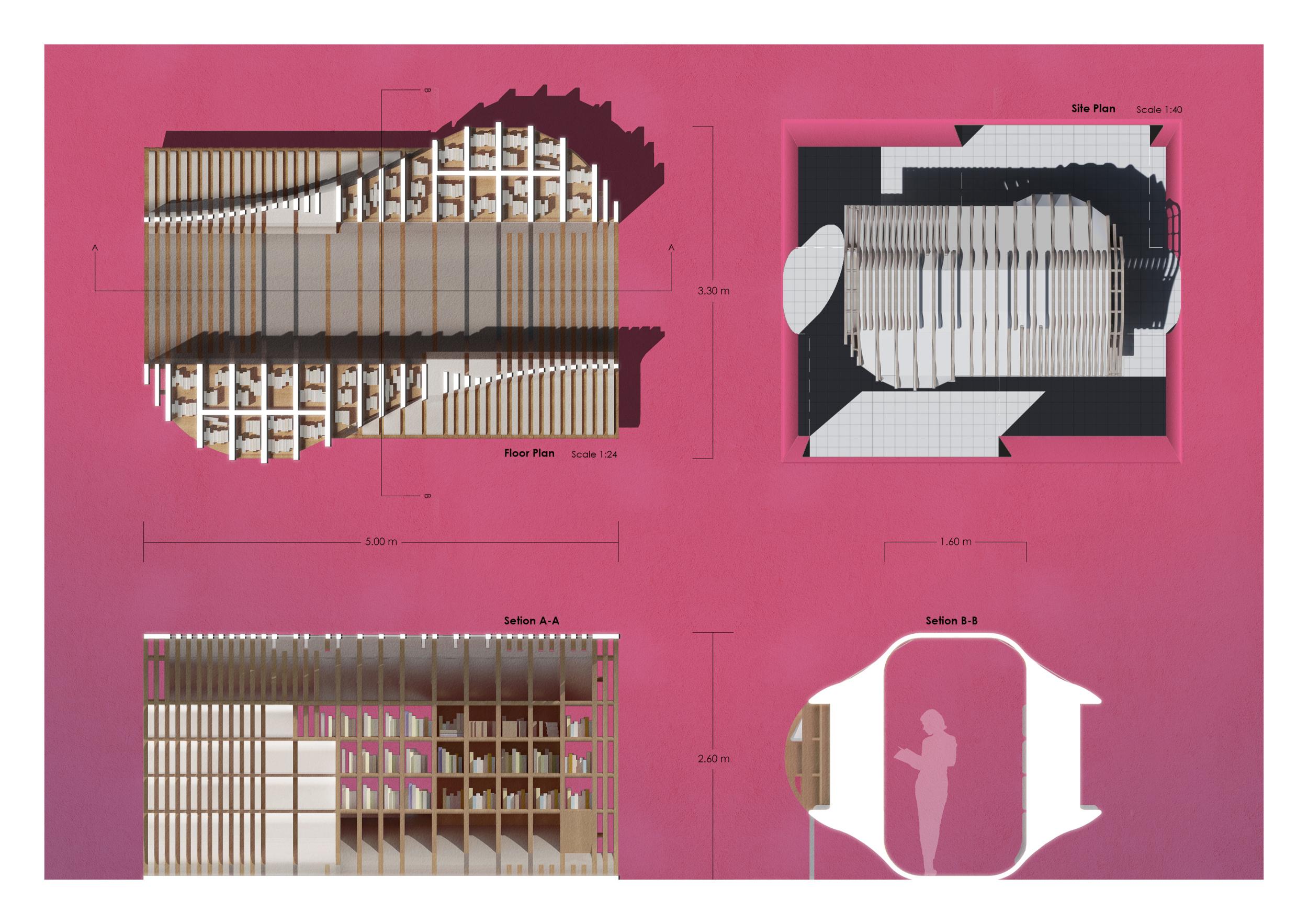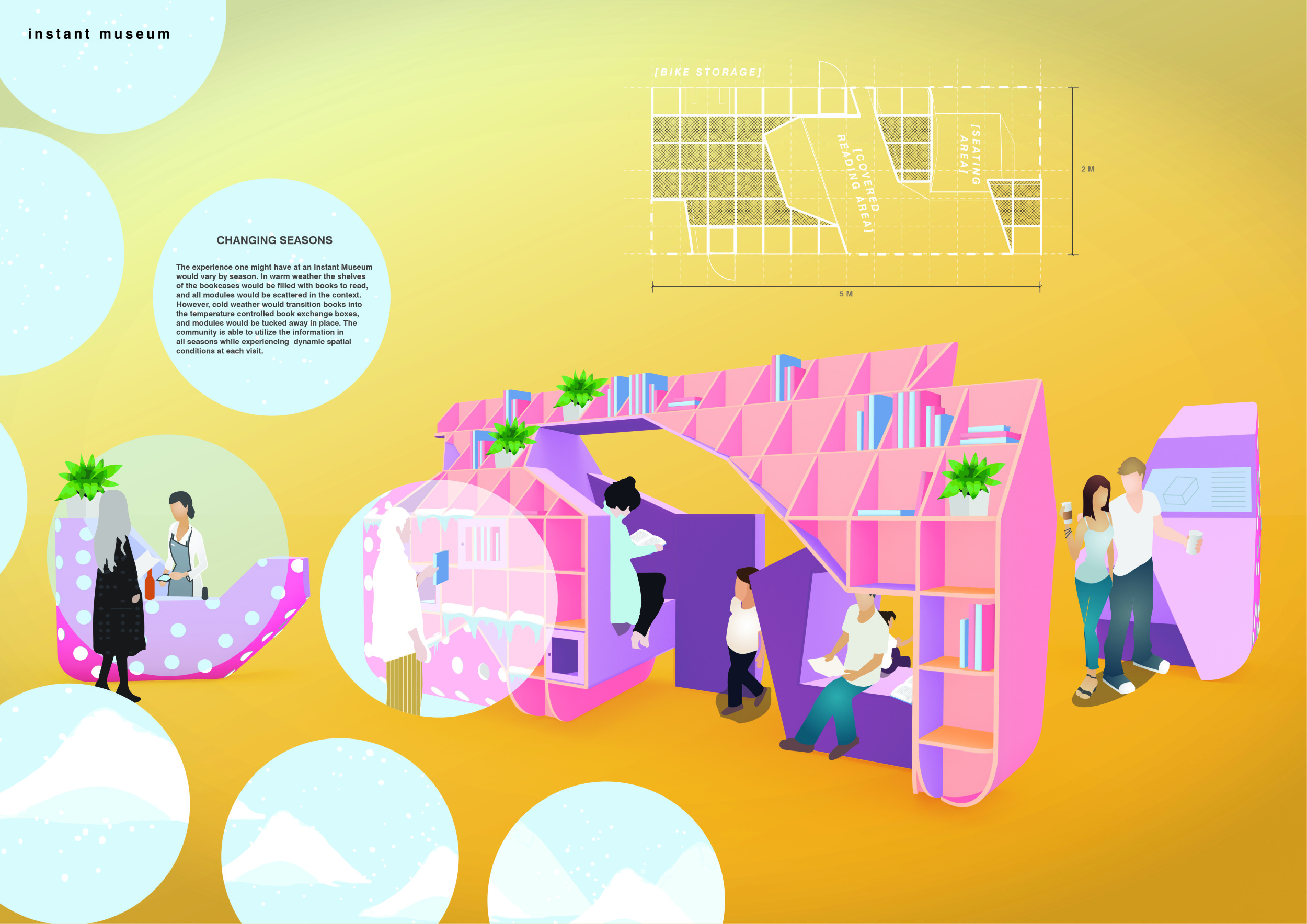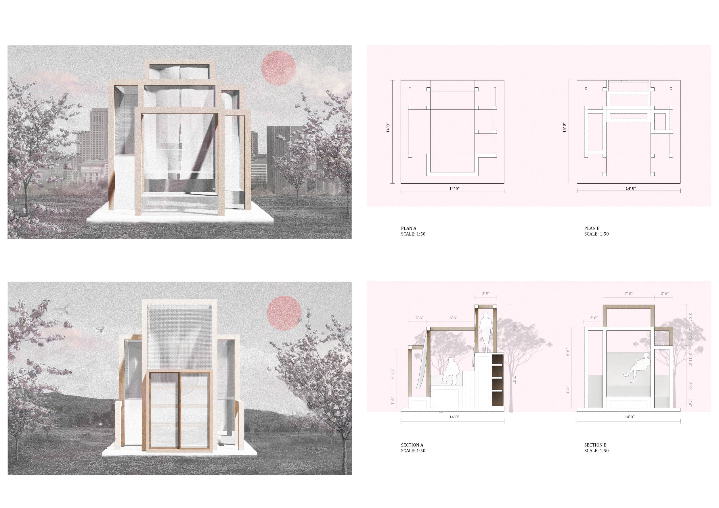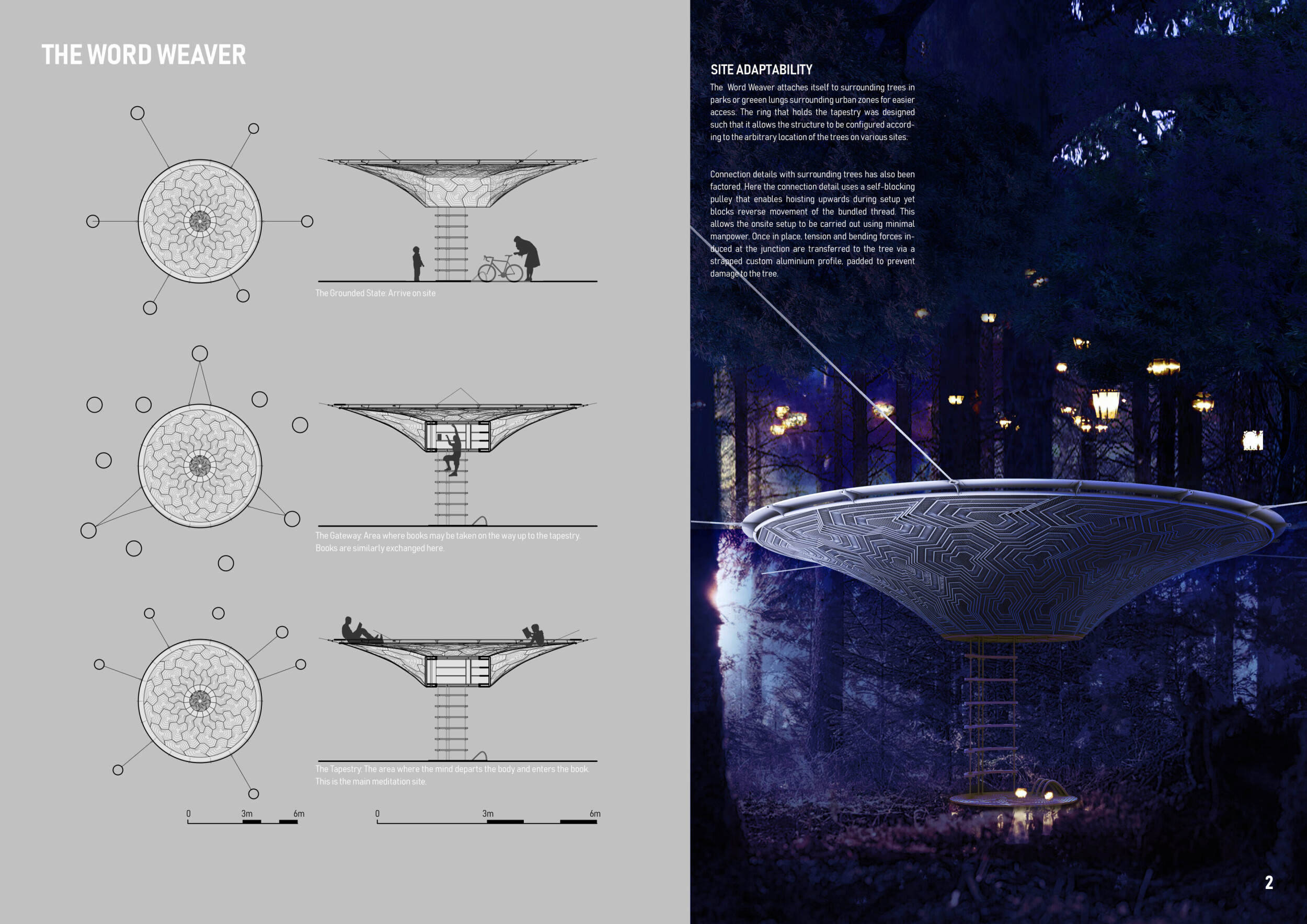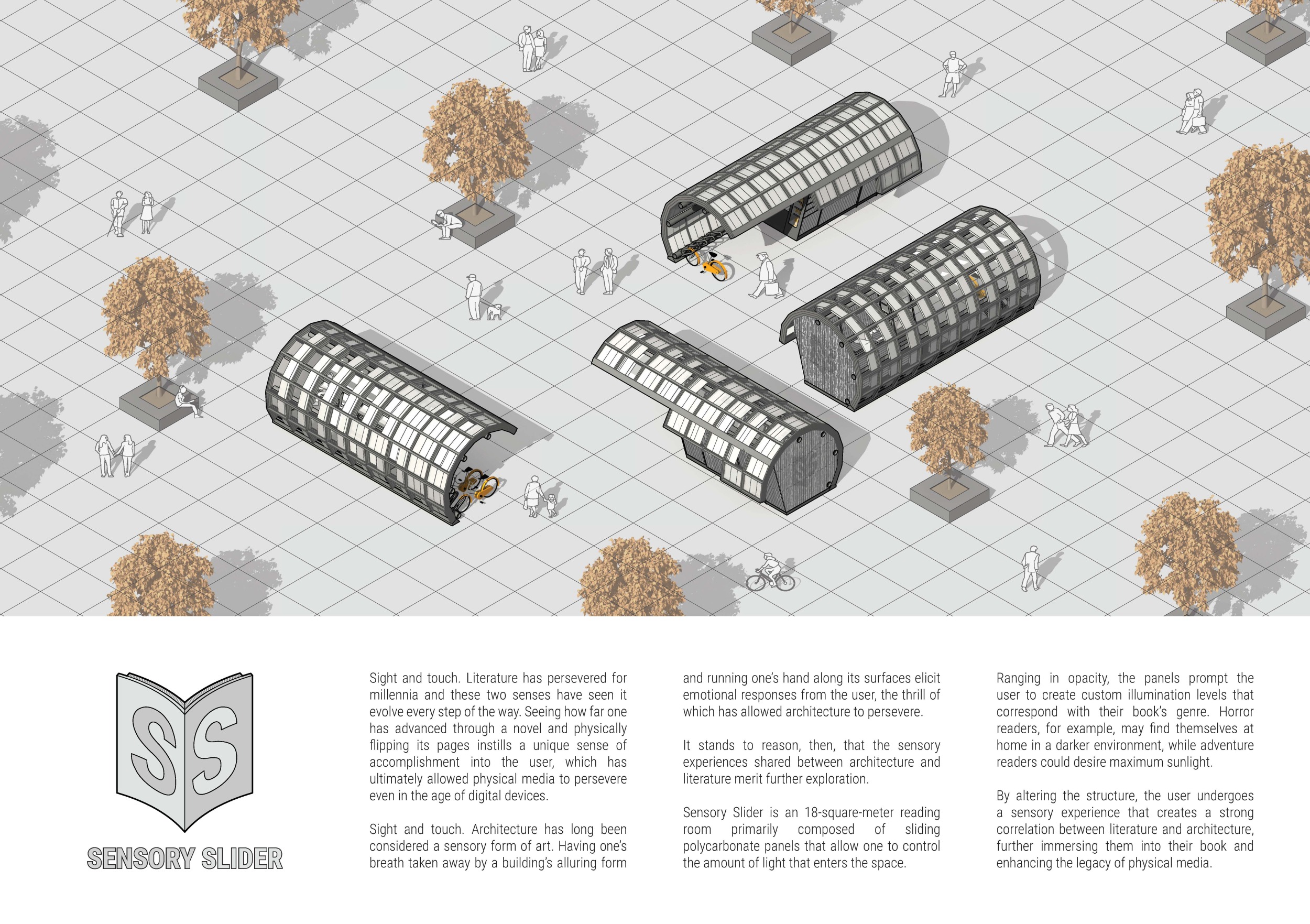 The proposal consists of a 9m² wooden open-air platform topped by an enclosure of iridescent foil. Entitled 'Nameless Sky', it contains two interior seats and bookshelves accessible from the perimeter. It is a symbolic project. It forces users to bend down to pick up books or to sit within the structure, emphasizing reading as an act requiring concentration and work. The synthetic sky above is an allusion to one's imagination. Read more The jury was impressed by project's simple representation, yet complex ideas.