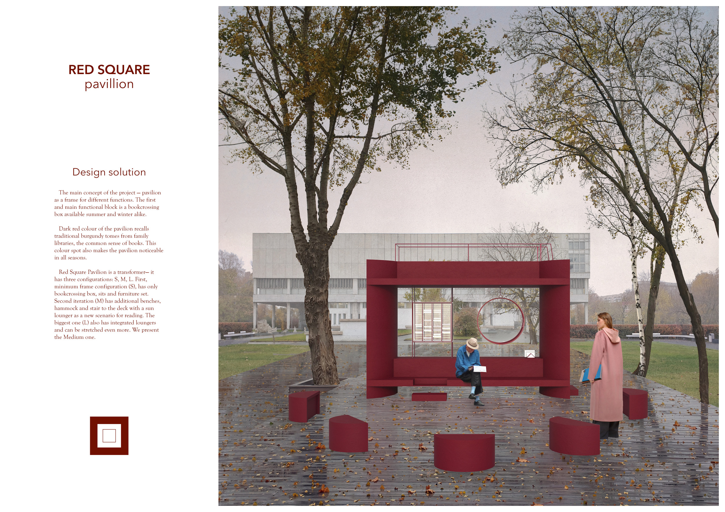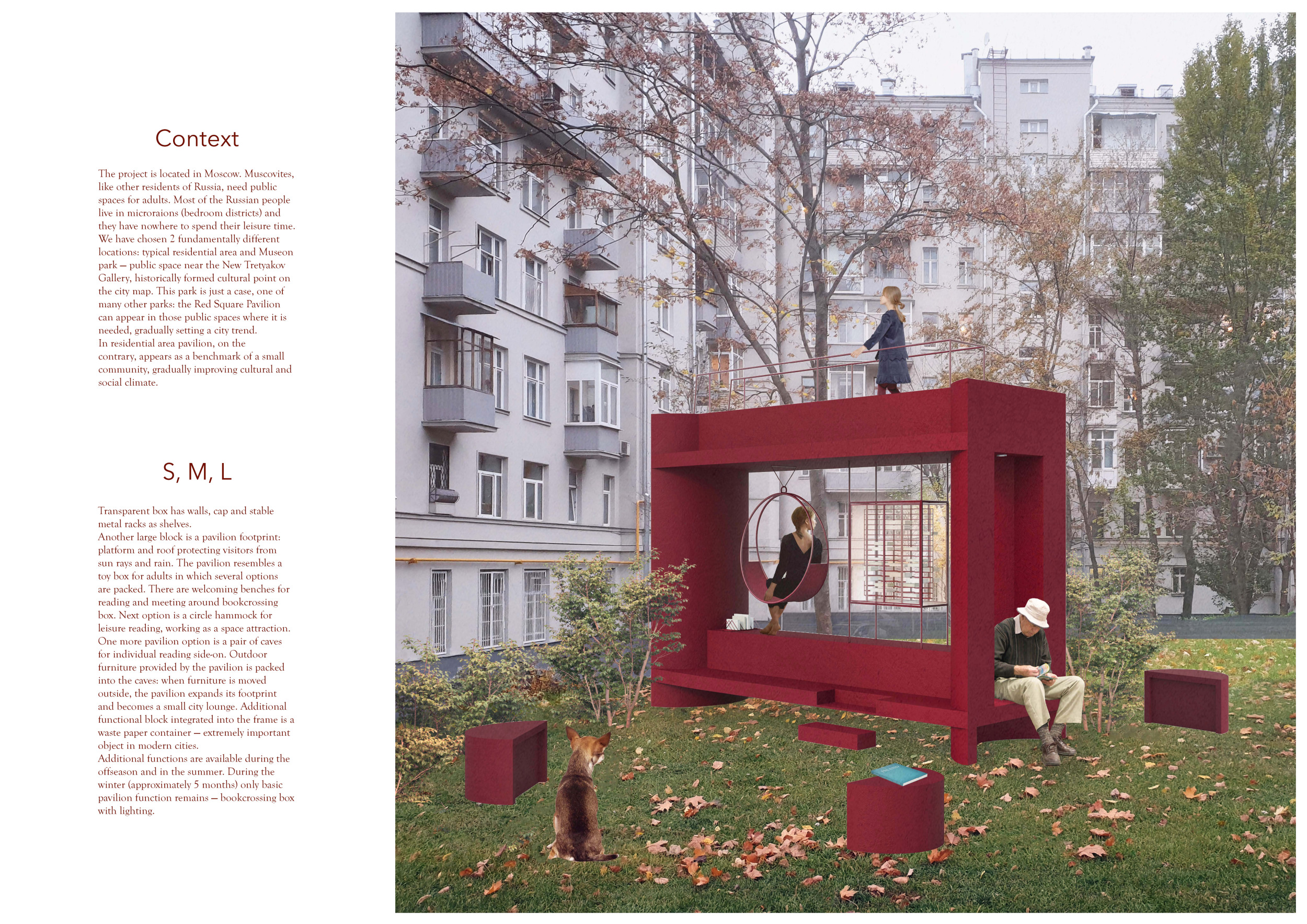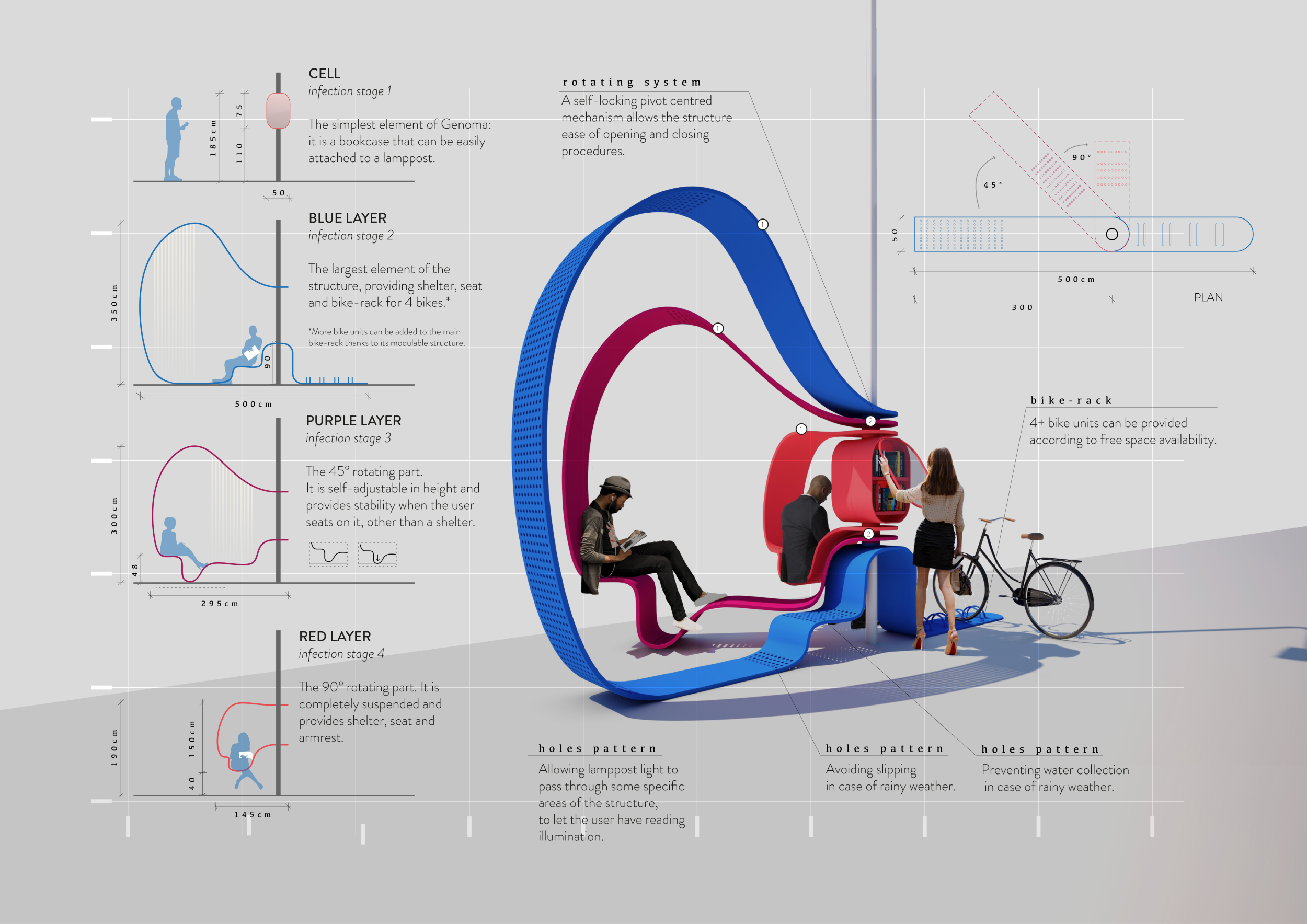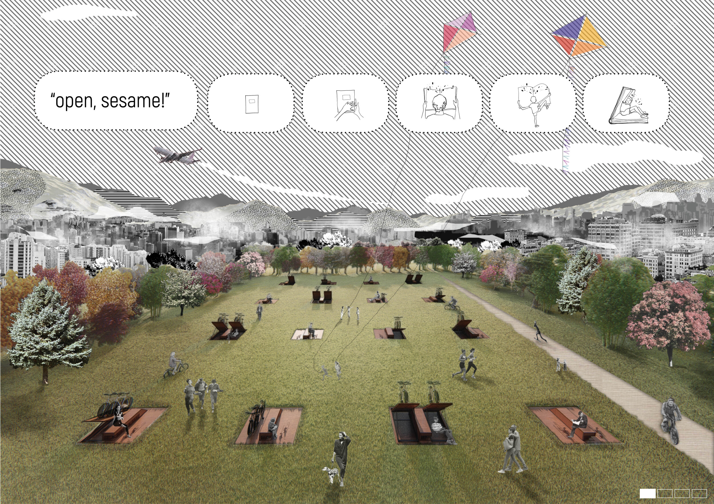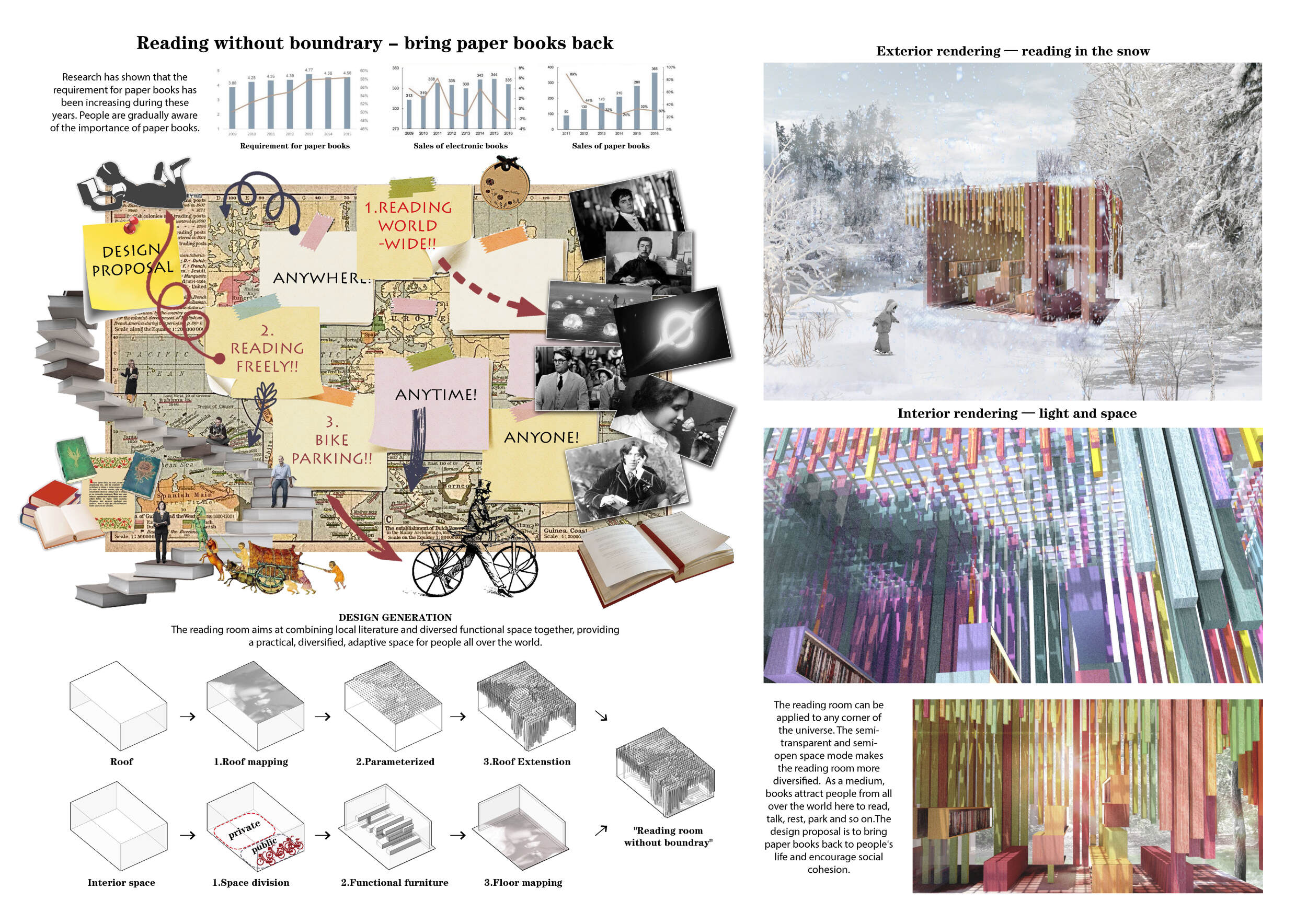 The proposal consists of a 9m² wooden open-air platform topped by an enclosure of iridescent foil. Entitled 'Nameless Sky', it contains two interior seats and bookshelves accessible from the perimeter. It is a symbolic project. It forces users to bend down to pick up books or to sit within the structure, emphasizing reading as an act requiring concentration and work. The synthetic sky above is an allusion to one's imagination. Read more The jury was impressed by project's simple representation, yet complex ideas.
