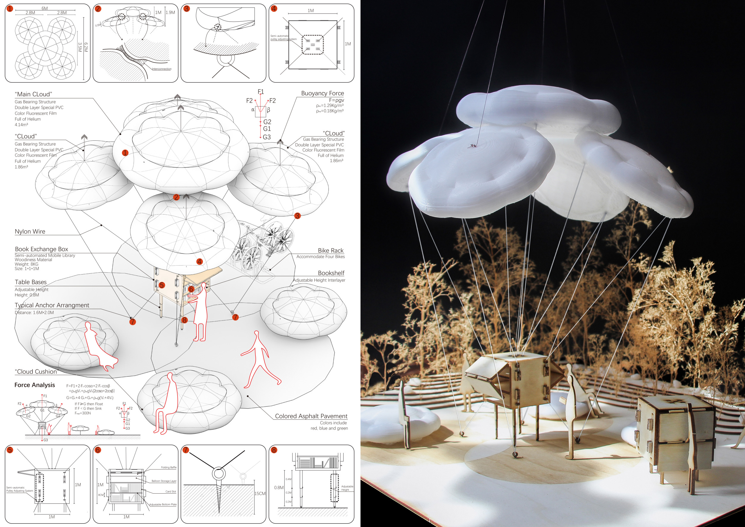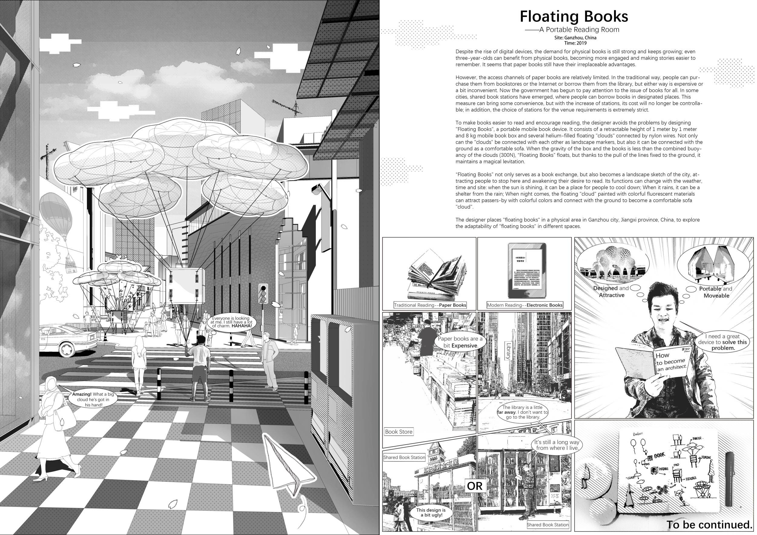 'Floating Books' makes use of gas-filled balloons to generate a new type of urban landmark that can be easily transported through a city. The structure demands attention - it is other-wordly and ephemeral, and the designer is clearly attempting to attract people to this urban element as a means to generate interest in the books it carries. The intention of the project is admirable, though the jury questions its ability to be implemented in a sustainable way.