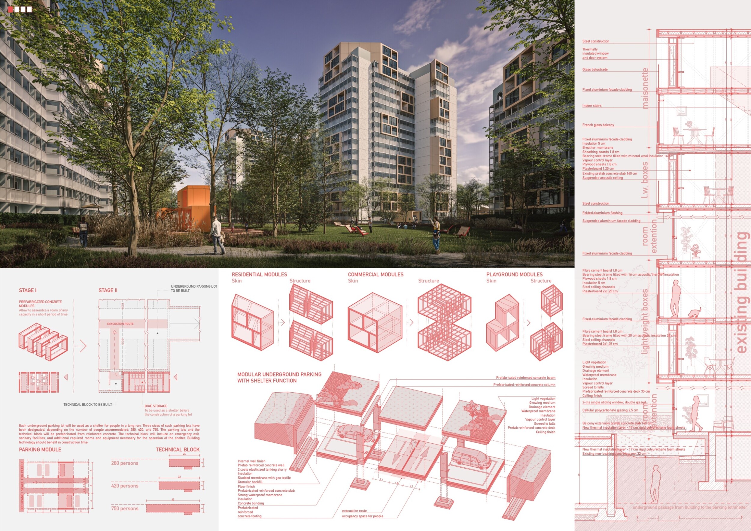 This project proposes a modular system for underground shelters using high-strength concrete panels, allowing flexible use for public events in peacetime and shelter during conflict. In public areas, partially preserved existing structures and modular additions will support social and commercial interaction, particularly near roadways or public transport. Read more A multilayer insulation system will enhance the energy efficiency of residential facades, and damaged building sections will be replaced with standardized factory-made blocks for continued habitation or conversion into public spaces. The approach balances restoration with adaptability while addressing both residential and community needs.