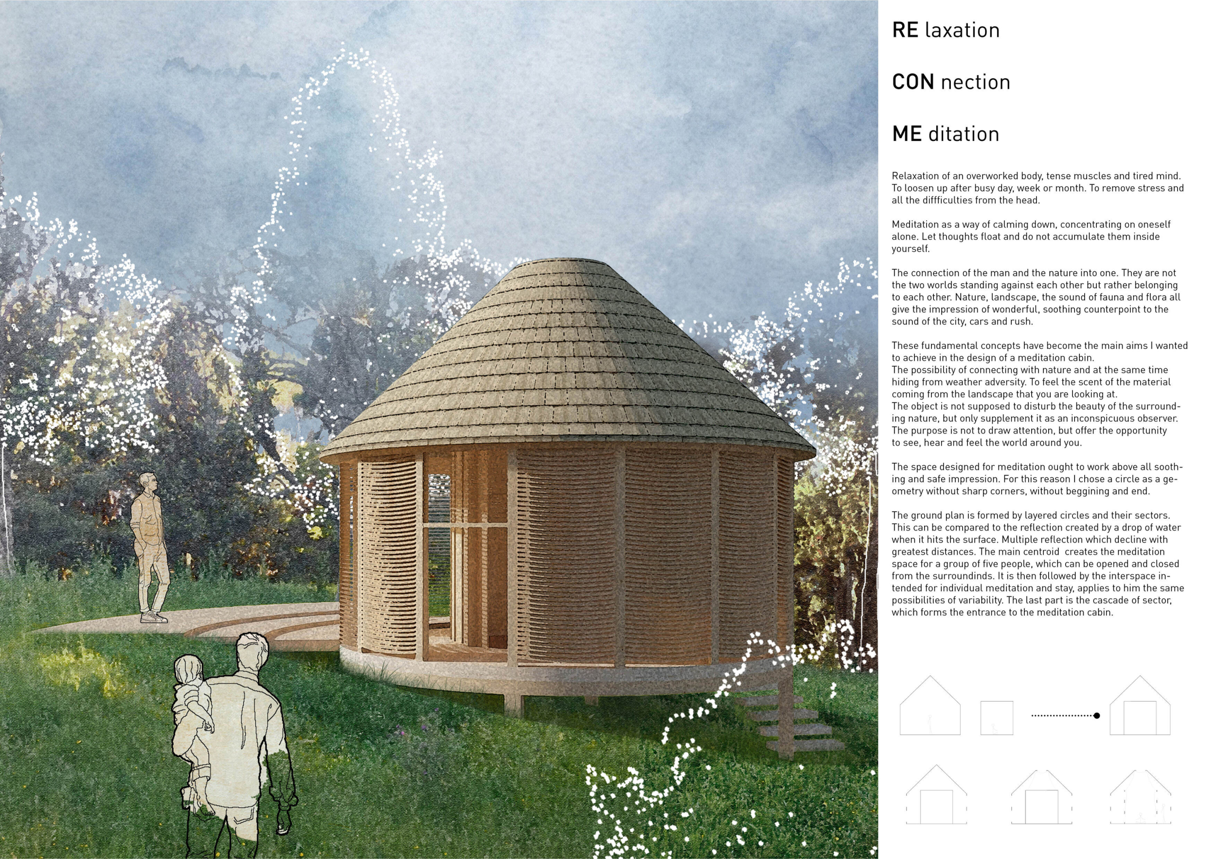 The ‘Meditation House’ is a small-footprint volume clad in frosted glass panels to bring in sunlight yet blur visibility, casting shadows in both directions. The design is centred on a fireplace and alters for the drying and storage of flowers which yield a range of essences. The jury writes, “A beautiful, ambitious proposal with incredible visualisations. The physical model is very successful in conveying an idea of materiality, light, scale, and proportions.