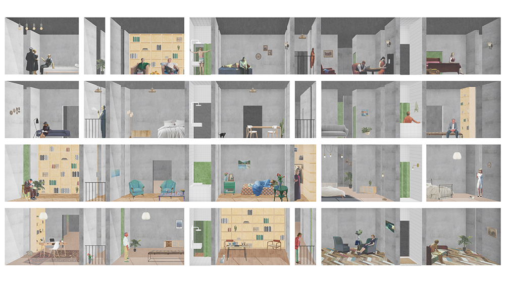 Second prize was awarded to Melody Chu and Deedee Chung from the Southern California Institute of Architecture (SCI-Arc), USA. They proposed an alternative design to the traditional London terrace house with their ‘Two-up Two-Down’ project. The proposal is a roadmap for mixing single-family, multi-family, and co-living units, above a common ground-floor plinth infused with commercial space. Third prize was awarded to Jierong Lyu, also from the Berlin University of the Arts, for their ‘Above the Grid’ project which focused on reprogramming London Council Housing by means of a modular and combinatory grid for various user types.