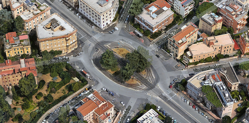The site chosen for the Rome Concrete Poetry Hall is the Piazza Galeno - or Galen Square - located on Regina Margherita Avenue, which is a prime location within Rome. The piazza is encircled by tram lines, which also pass directly through the site itself.