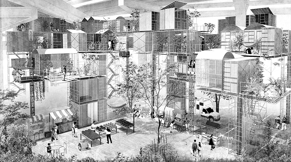 Second prize was awarded to Arseny Pekurovsky, Chon Fai Kuok and Megan Gahlman from the University of Minnesota, USA. Their project ‘Living Room, The Policy of Living Space in San Francisco’ challenged anti-development culture by creating a “living room” – a common space supporting a range of connected living arrangements. Third prize was awarded to Monica Lamela Blazquez and Sofia Betancur from Spain, whose ‘Home Sweet Home’ project identified the interstate highways as precious, underused spaces within the city.